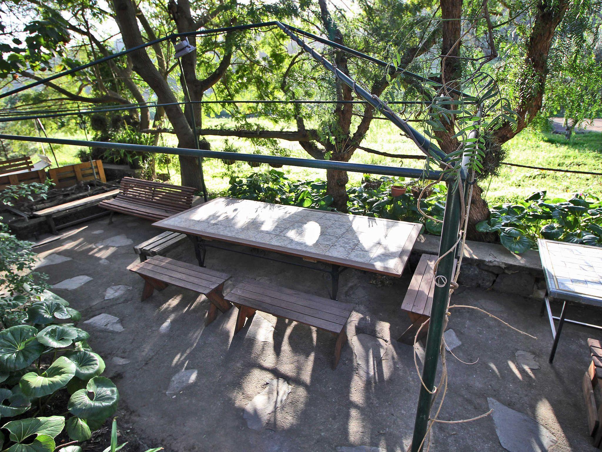 Geht man am Vorplatz mit dem Springbrunnen, den Zitrusbäumen und dem Baumhaus vorbei, kommt man an einer Weggabelung zum Schuppen, der als Ausstattungslager und für Gartengeräte benutzt wird (er ist den Gästen nicht zugänglich). Hier kann man nun entweder rechts zum Mirador, zum Aussichtspunkt auf der steilen Anhöhe, weiter gehen oder man folgt dem linken Weg zum Pajero, wo sich der Grill, der überdachte Essplatz (mit Duschbad), das Outdoor-Sofa, der kleine parkartige Bereich sowie der Basketballplatz (separat, zementiert, hoher Zaun zur Strasse) befinden und der Weg zur Era, dem alten Dreschplatz, wo man auch am Solarium auf der Dachterrasse, des sich dort befindlichen Gebäudes, vorbei kommt.