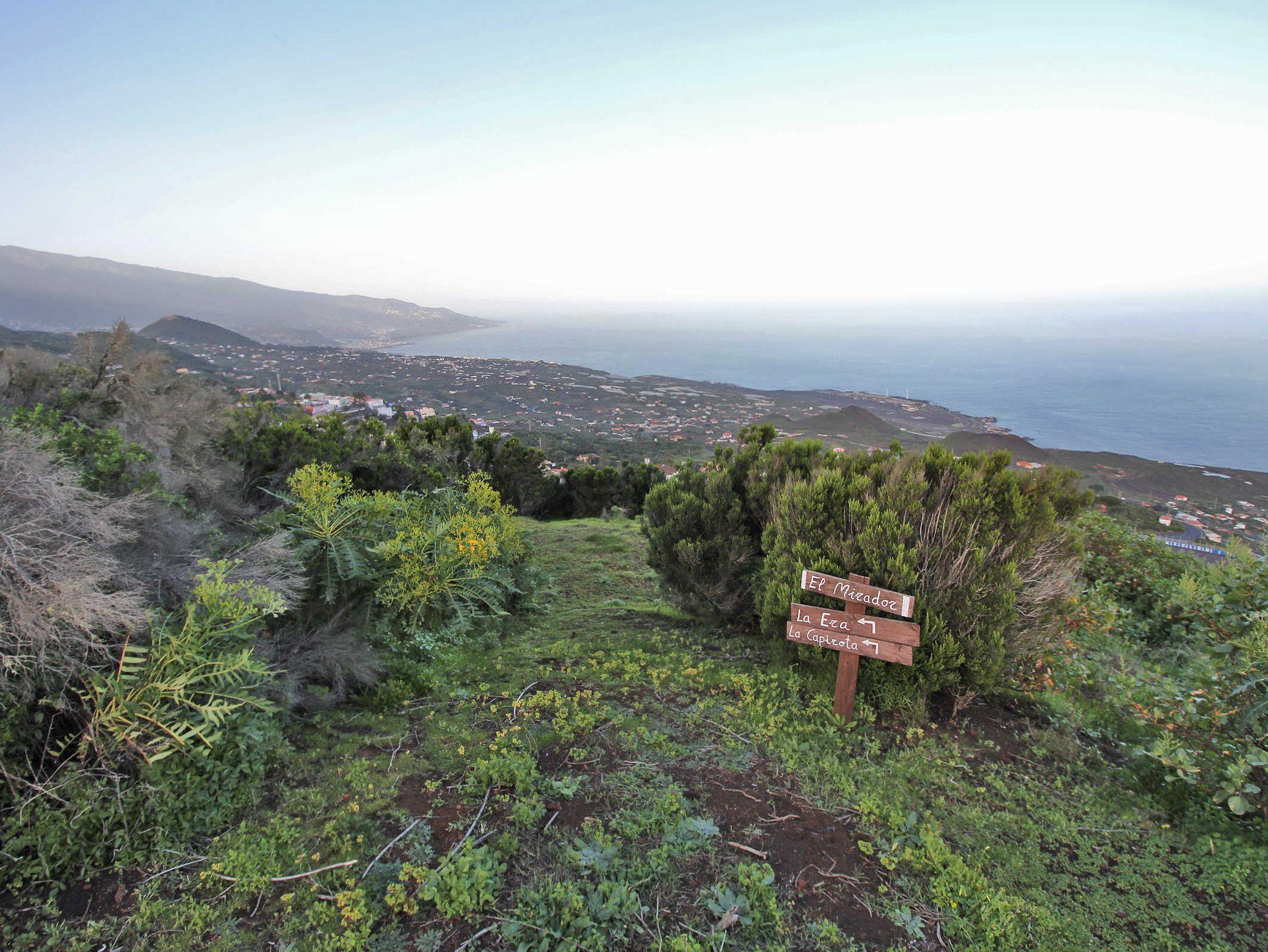 Der private Wanderweg zum Mirador führt steil hinauf zum Gipfel des Hausberges Los Ríos, auf dem sich auch ein Geodaten-Scheitelpunkt des Nationalen Geographischen Instituts befindet.
