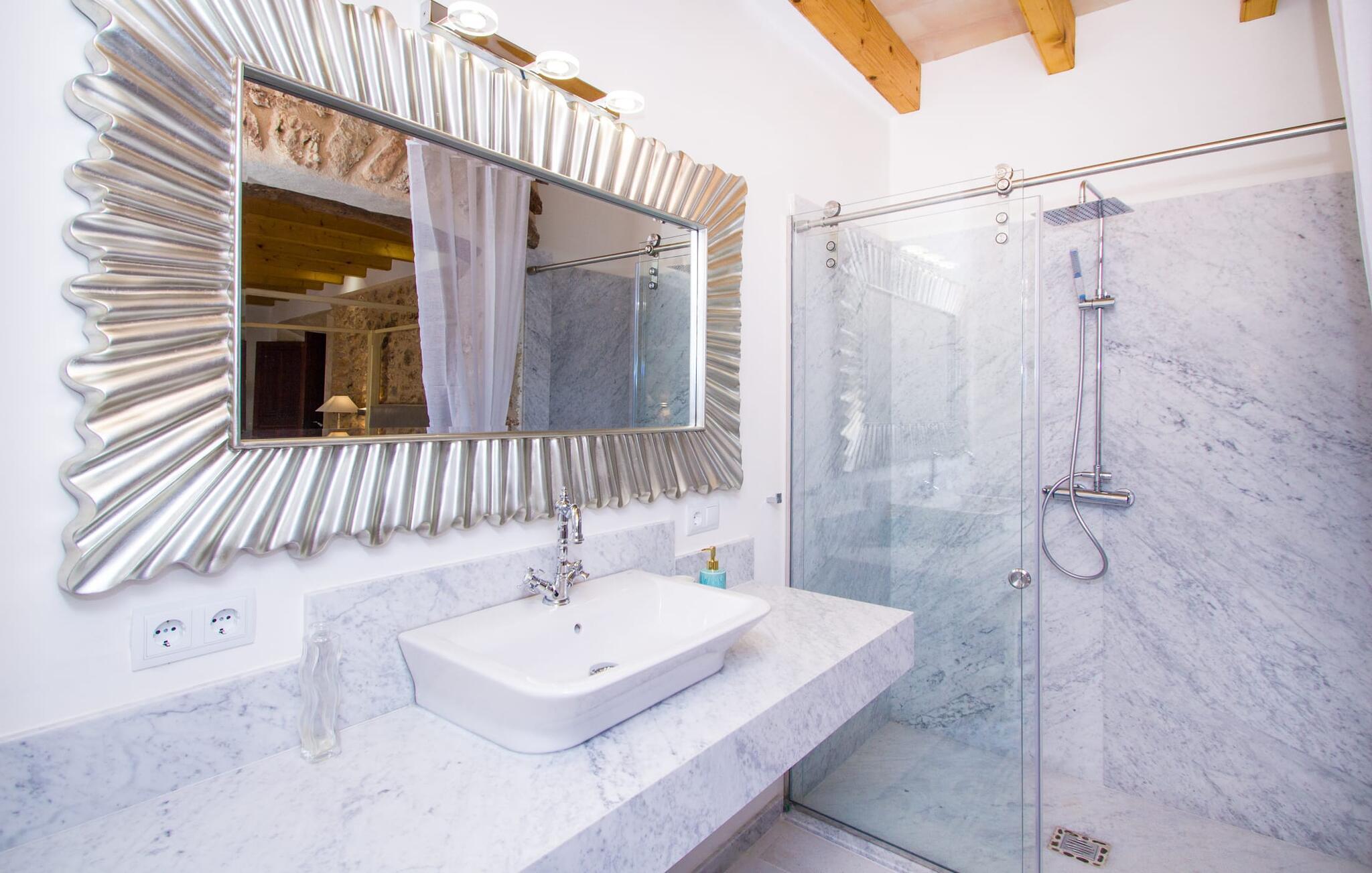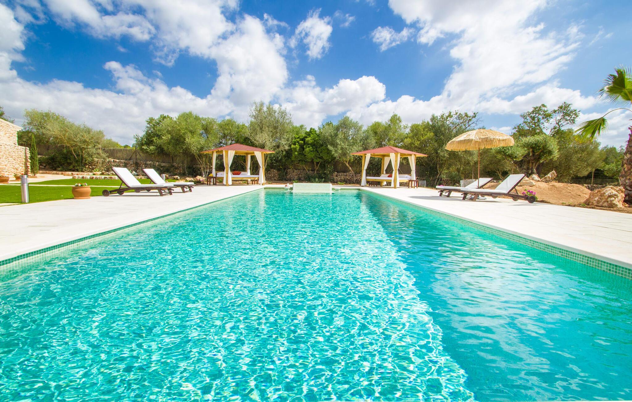 Storvildtjægere i feriehusjunglen på Mallorca har ramt jackpotten med villaen "Mediterrani" i afrikansk stil. Det virker, som om en ekstravagant Løvemand har skabt et kongerige, hvor hans gæster kan nyde livet, kærligheden og ferier fuldt ud. Med tiden vil haven stadig blomstre til sin fulde pragt. Det er ren fornøjelse at svømme lange strækninger i en drømmepool som denne eller at bade blidt i stenvandsengen - en helt speciel ekstra - og nyde forfriskende vand med en kølig, let eller Blue Lagoon cocktail på siden. Der er også komfortable liggestole, der venter på dig ved kanten af poolen, men de har næppe en chance mod de to balinesiske senge: luk blot gardinerne og gå i siesta- eller puttetilstand. Og hvis du ikke har lyst til at slentre ud om aftenen, så gør dig godt tilpas i det overdækkede loungehjørne, åbn minibaren og smid det du har fanget i løbet af dagen på grillen. God fornøjelse og vær i godt humør! Ferie midt i ingenting! De to rummelige og originalt designede soveværelser med lodge-karakter og altomfattende følelse inviterer til vildt romantisk stævnemøde. Bruser, dobbelt håndvask og et stort spejl, der hver morgen skinner i det rette lys, er elegant placeret i en niche og kun adskilt af stof. Men bare rolig, toiletterne er udstyret med døre, så det ikke bliver for intimt. Begge værelser har direkte adgang til det dejligt lyse, åbne køkken og opholdsstue, som nemt kan udvides til at omfatte udendørs terrasse og udsigt til haven. Du kan næsten ikke opleve mere sommerfølelse end i "Mediterrani", og luftige bomuldsskjorter og -kjoler er et must-have og passer perfekt til villaens rammer. Detaljeret tilbehør i guld- og sølvtoner giver interiøret kronen på værket - et ideelt sted for elskere, bryllupsrejser eller par, der ønsker at være meget tæt på hinanden igen eller altid... God vin, søde frugter og et populært ugentligt marked: rolige Porreres, som mange mennesker passerer på vejen til Campos og Santanyí, repræsenterer absolut nydelse! Den lille landevej, der fører fra Llucmajor til landsbyen, afslører maleriske landskaber. Besøg Santuarie de Mont-Sion, 4 km væk, imponerende med en vidunderlig udsigt over Es Plá-sletten, eller det lille Museu i Fons Artistic de Porreres, hvor du blandt andet kan se to originale malerier af Dalí. Gourmeter kan anbefale L'Escrivania (restaurant, café og butik i ét), som fortryller ganen med lokale abrikoser i tilbehør, saucer og fyld. De populære råchokoladepraliner er bestemt en dessert, du ikke må gå glip af under din ferie i villaen... Denne middelhavsferiedrøm blev lanceret i 2016 og er beliggende i centrum af den landlige trekant, med sin lange pool under palmetræer i sun Porreres (6 km), Llucmajor (14 km) og Campos (9 km) tilbyder fred og fuldstændig privatliv. Drømmestrande som Es Trenc og Platja des Caragol helt sydpå er bestemt den lidt længere køretur værd. Ma-19 eller Ma-15 tager dig hurtigt til centrum af Palma, hvor du kan nyde svømning, shopping, akvariebesøg, kultur og natteliv på en enkelt dag. Dette er et Fincallorca feriehus.