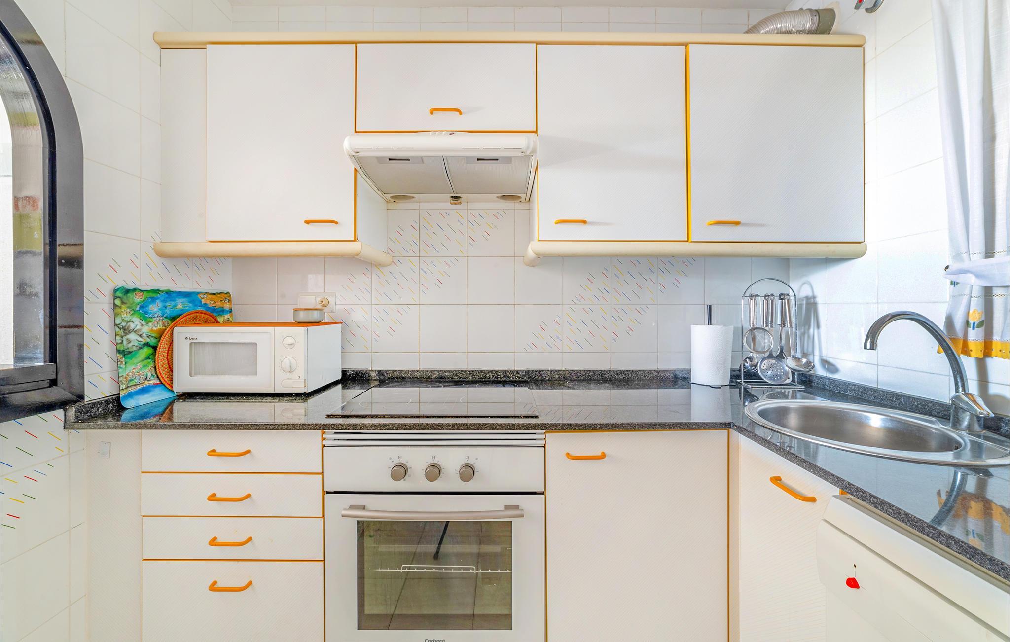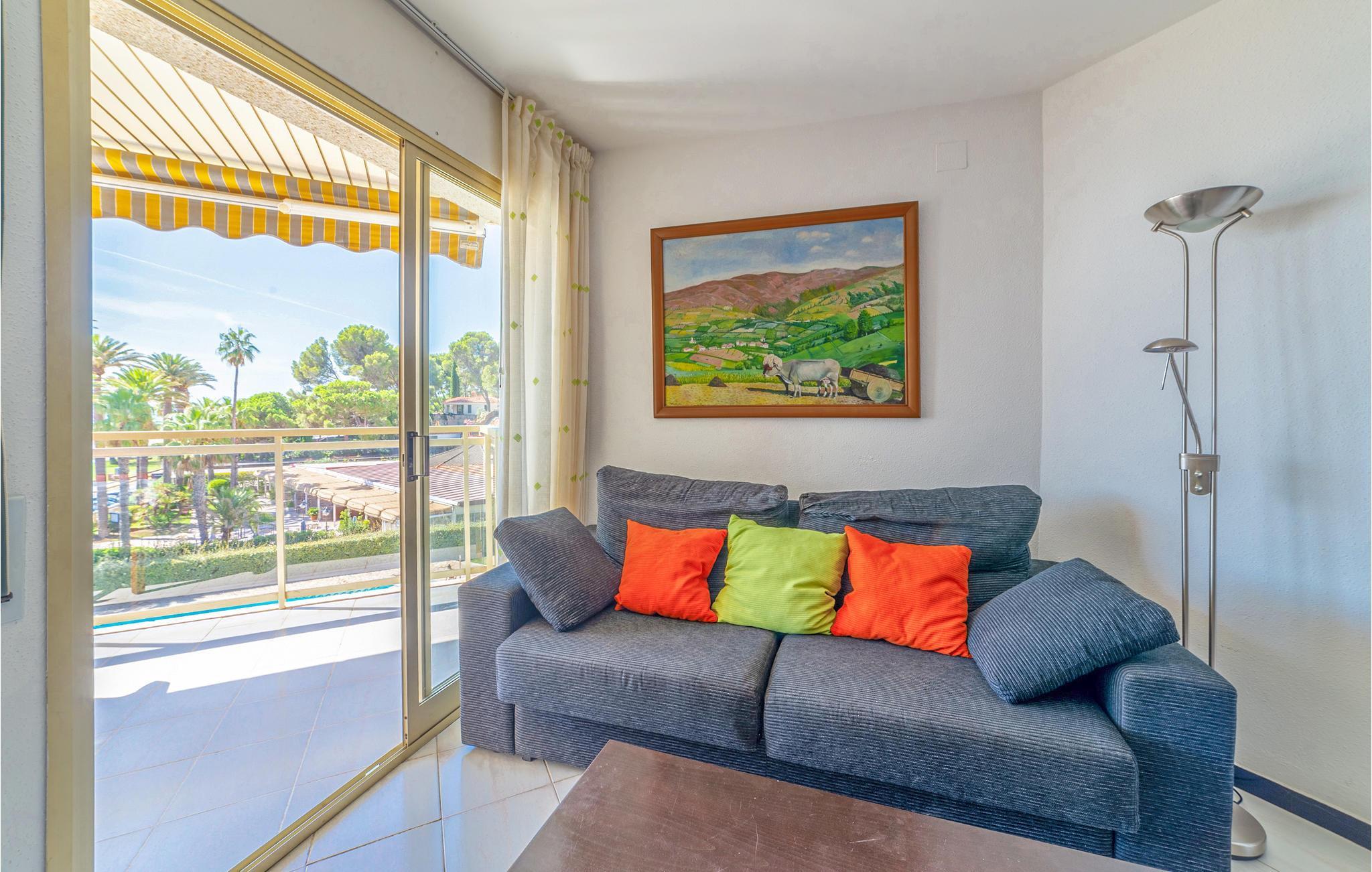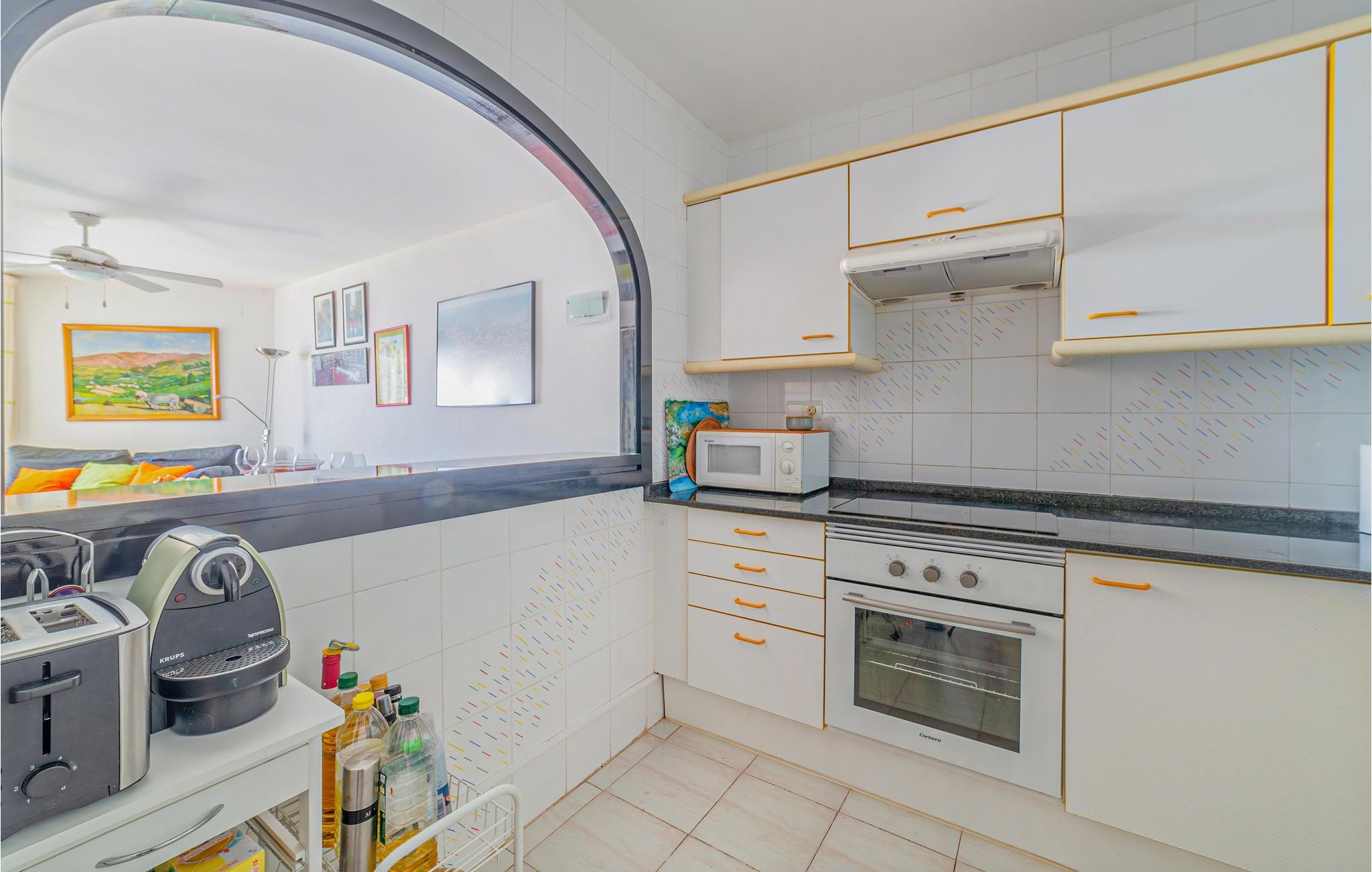 På 4. etage i et lejlighedskompleks ligger denne komfortable ferielejlighed med havudsigt. Den smukke lejlighed tilbyder jer og jeres familie alt, hvad I har brug for til en ubekymret ferie. Nyd morgenmaden med udsigt over poolen, stranden og havet, og overvej sammen aktiviteter og udflugter for den kommende dag.