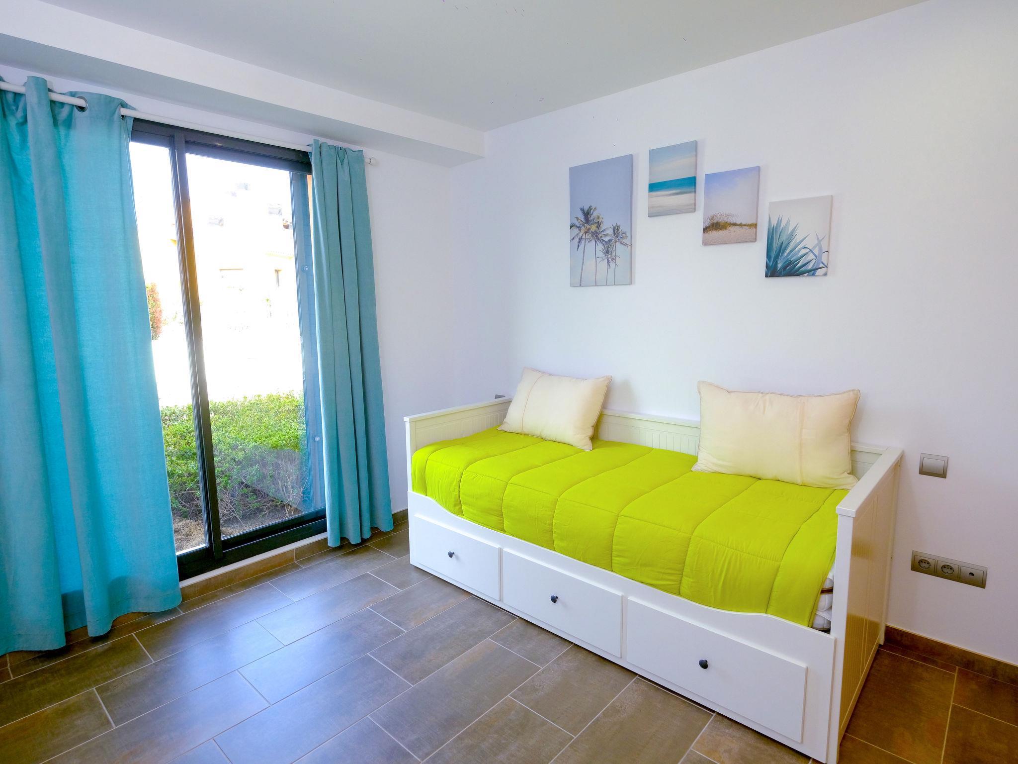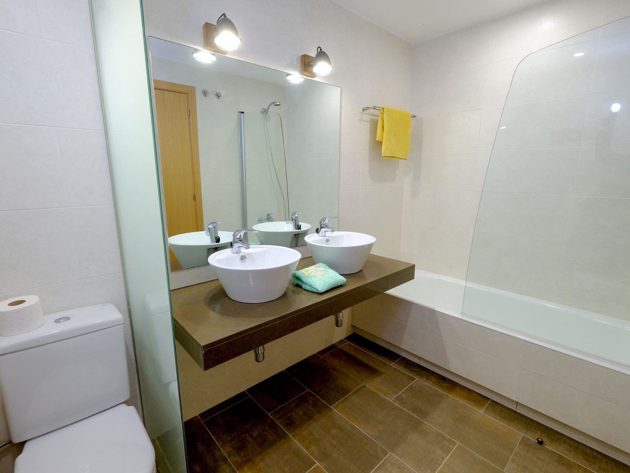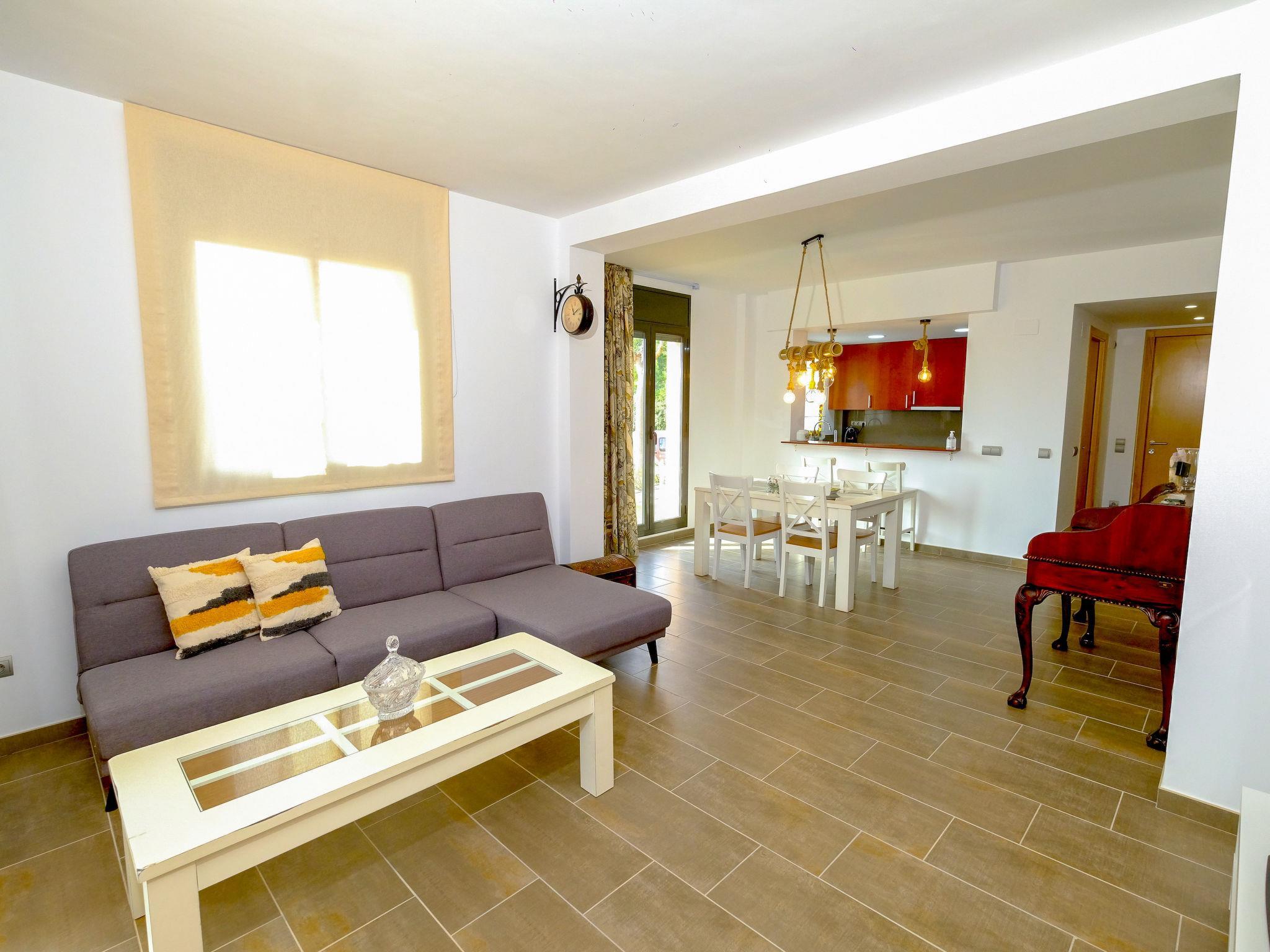 3-room apartment 131 m2, on the ground floor. Practical and comfortable furnishings: living/dining room 25 m2 with sliding door curtain with dining table, satellite TV, air conditioning and forced-air heating. Exit to the patio. 1 room with sliding door with 1 french bed (150 cm, length 190 cm). Exit to the garden. 1 room with 1 pull-out bed (2 pers. 2 x 90 cm, length 190 cm). Exit to the garden. Open kitchen (oven, 3 ceramic glass hob hotplates, toaster, kettle, microwave, electric coffee machine) with bar. Bath/bidet/WC, shower/bidet/WC. Patio. Terrace furniture. Beautiful view of the swimming pool, the garden and golf course. Facilities: washing machine, iron, children's high chair, baby cot for up to 2 year olds, hair dryer. Internet (WiFi, free). Parking (1 car) at the house. Please note: no lift. HUTT061956 // Reg. Nr.: ESFCTU00004303200016910900000000000000HUTT-061956-499