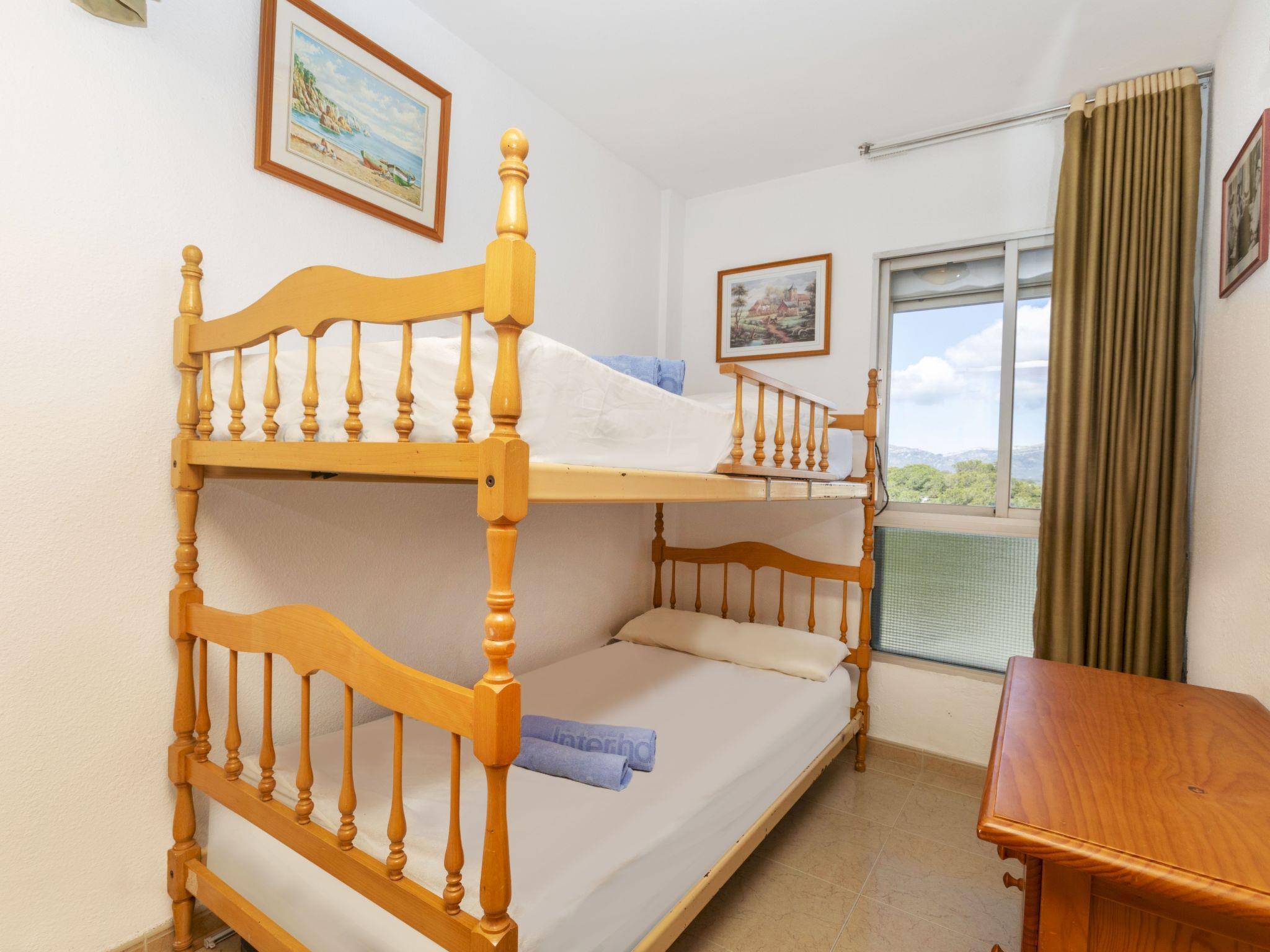 "Vaixell", 4-room apartment 65 m2. Practical and comfortable furnishings: living/dining room with dining table, digital TV and air conditioning. Exit to the balcony. 1 room with 1 french bed (160 cm). 1 room with 1 x 2 bunk beds (90 cm). 1 room with 1 french bed (140 cm). Kitchen (oven, 4 ceramic glass hob hotplates, toaster, kettle, microwave, electric coffee machine). Bath/bidet/WC, shower/WC. No heating option. Balcony. Facilities: washing machine, iron, hair dryer. HUTT-044361
