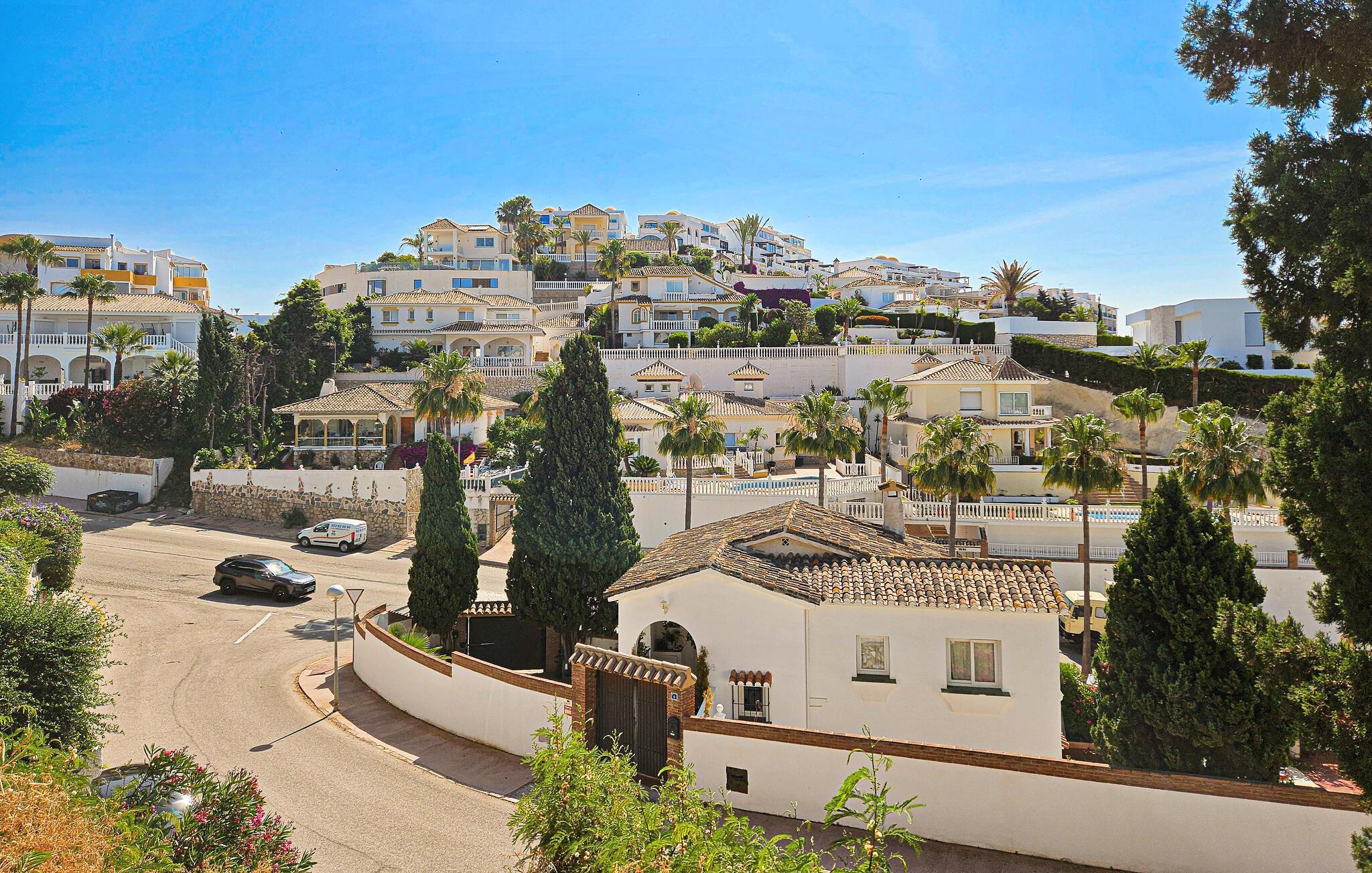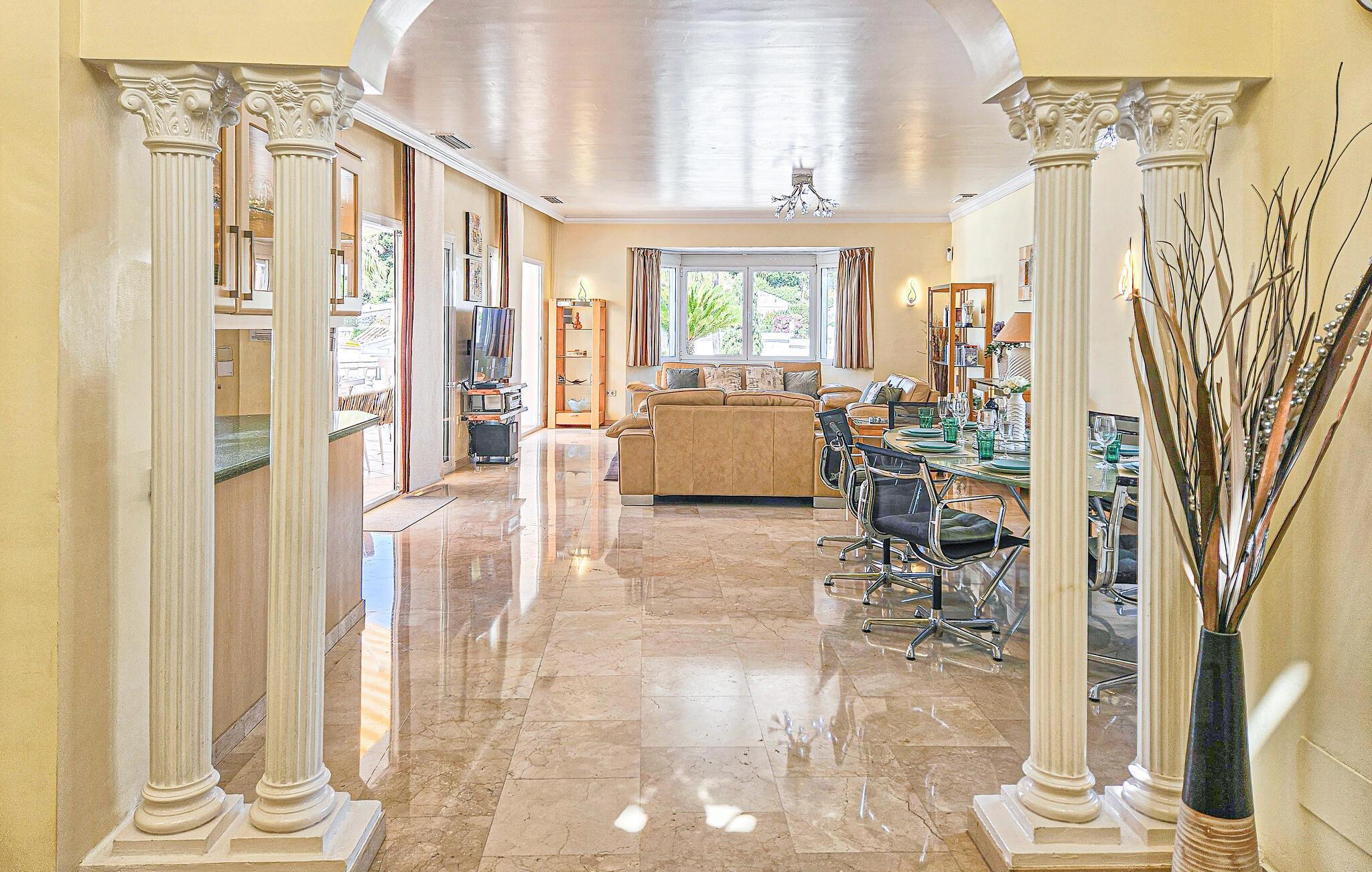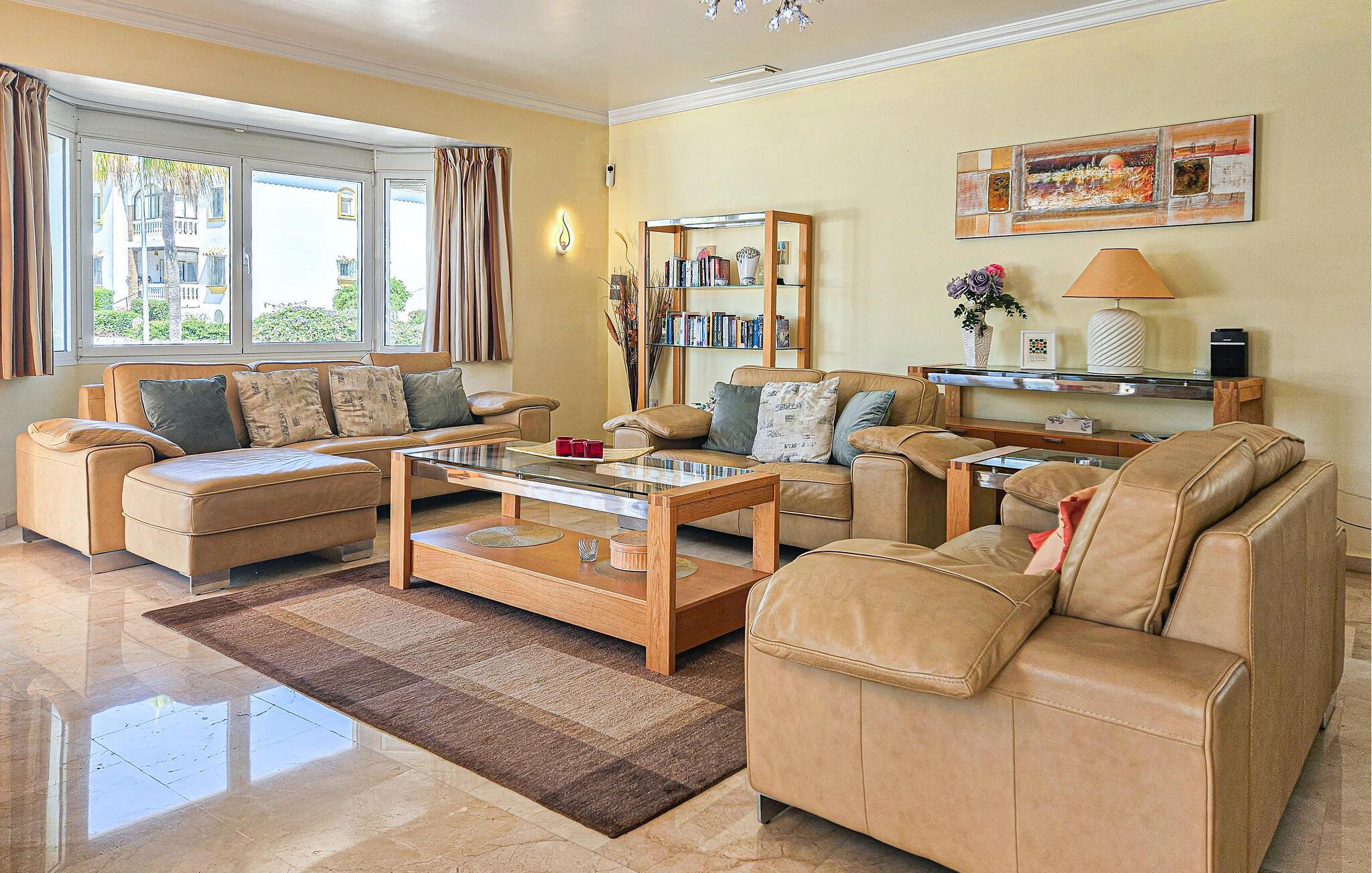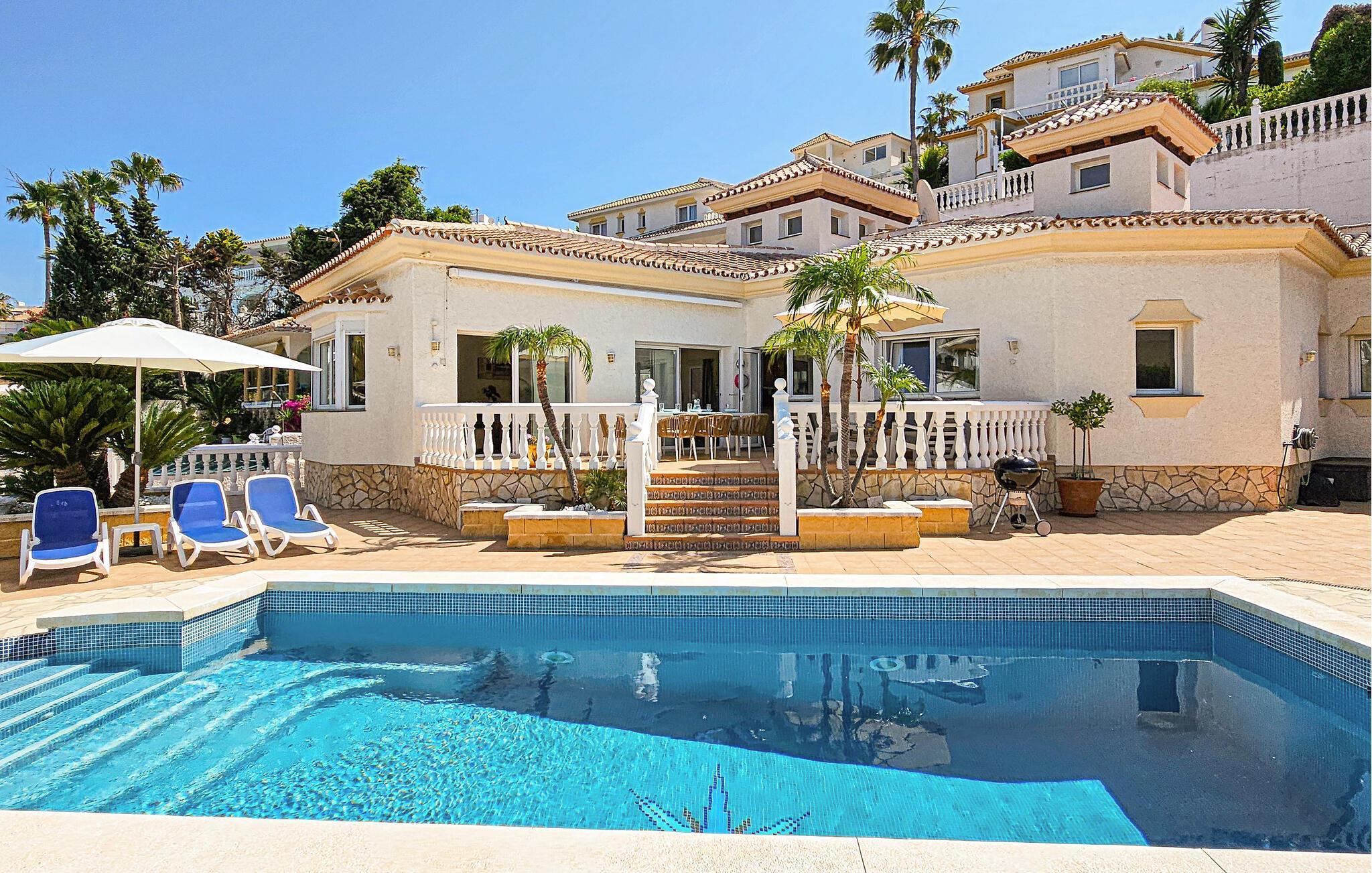 Denne sensationelle ferievilla ligger i nærheden af golfbanen Miraflor og 300 m fra golf-øvelsesbanen. Nyd at bade daglig i den private pool eller et solbad på en af de store terrasser. Også det indre har et luksuriøst miljø med komplet udstyret køkken og moderne, stilfuld indretning. Fra den enorme stue med spisebord, lædersofaer, stort tv med hjemmebiograf kan I træde ud på terrassen. Alle soveværelser har badeværelse en suite. Hovedsoveværelser har et stort smart-tv og der er karbad og bruser i badeværelset. Særskilt vaskerum med vaskemaskine, tørretumbler og garderobe. To barnesenge til rådighed ved forespørgsel. Huset råder over omfattende sikkerhedsforanstaltninger med ekstra gitre på terrassen, så børn ikke kan komme hen til poolen uden opsyn. Bebyggelsen Riviera del Sol har supermarkeder, barer, restauranter og en tennisklub med minigolf, motionsrum og bar/restaurant. Opdag Marbellas seværdigheder i jeres ferie. Kunst, arkitektur og historie venter jer her ligesom lange strande og imponerende havne fulde af yachts, der giver jer indblik i byens luksuøse liv. Byen Fuengirola med mange butikker og lange strande har en station, hvorfra der kører tog til hovedstaden Málaga hver time. Soveværelse 3 byder på et 3d-tv med mere end 1000 radio- og tv-kanaler.