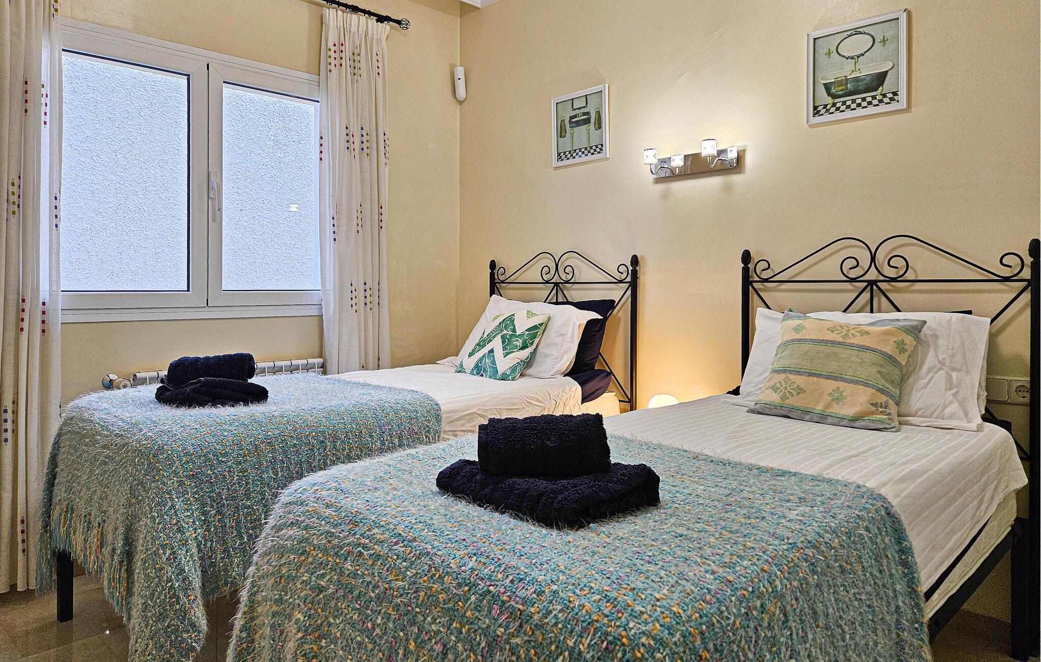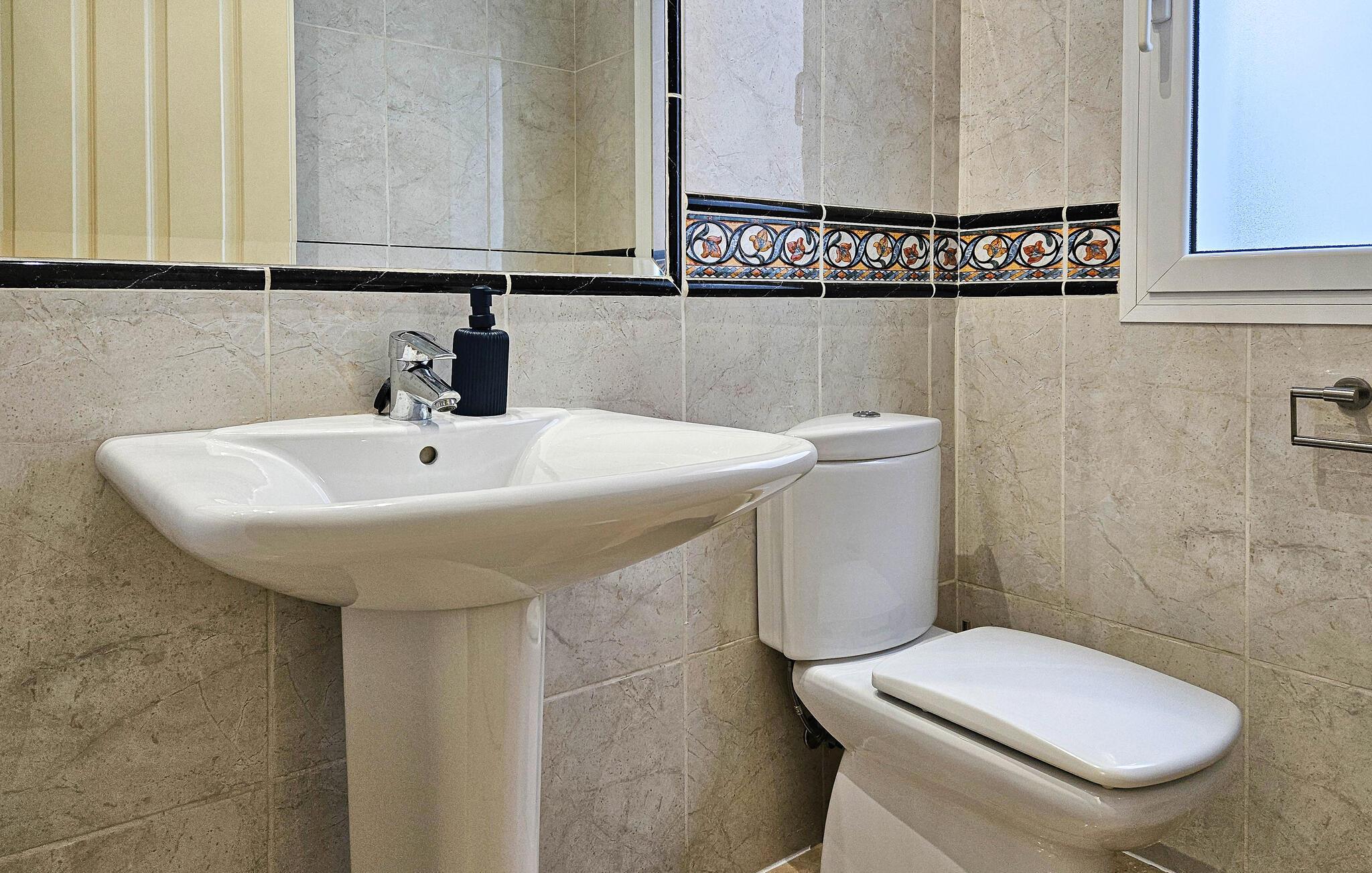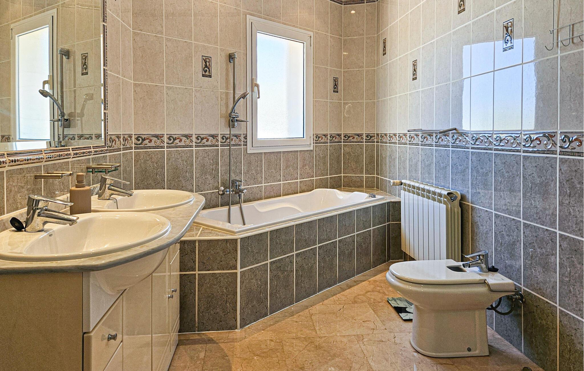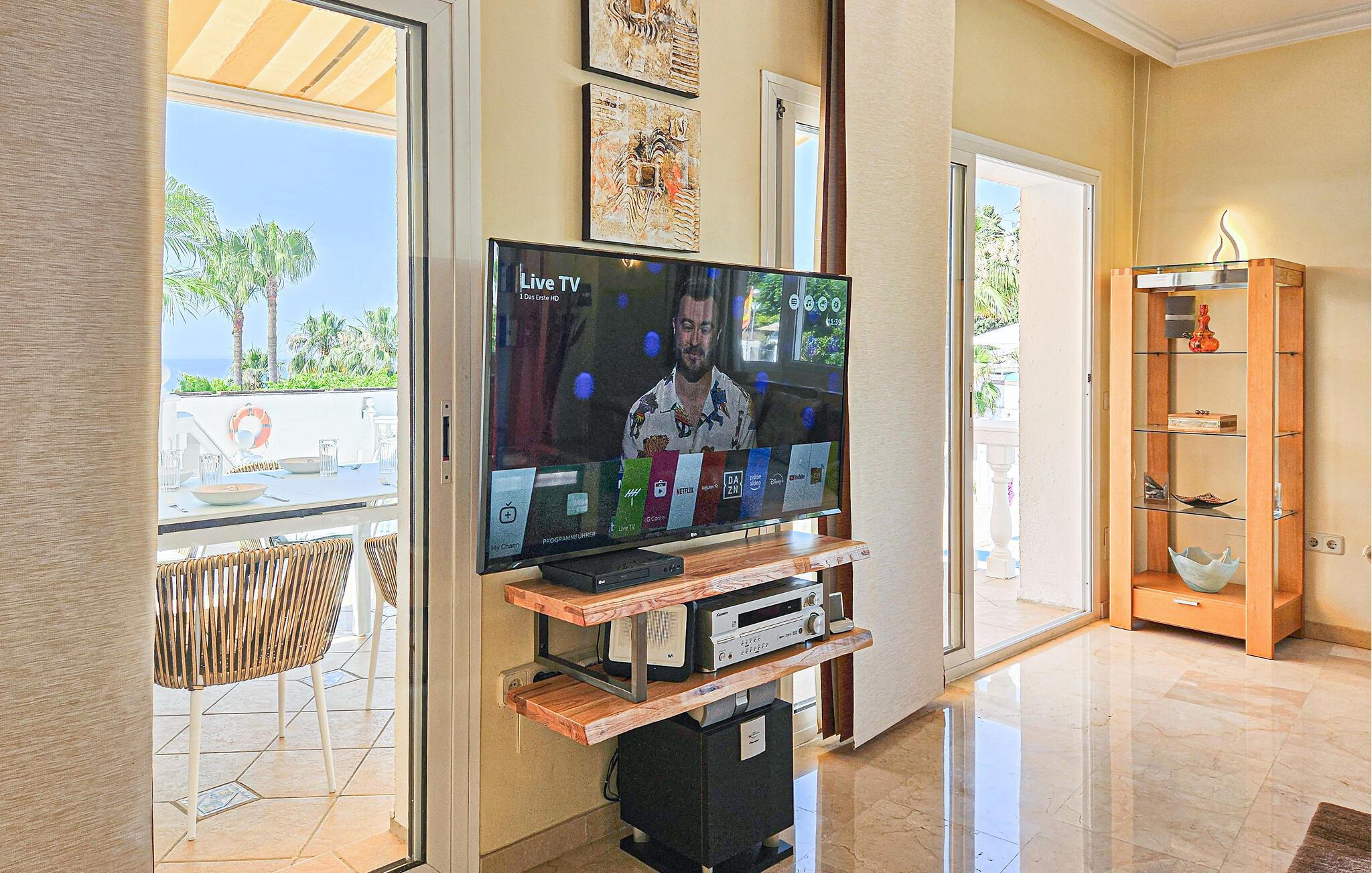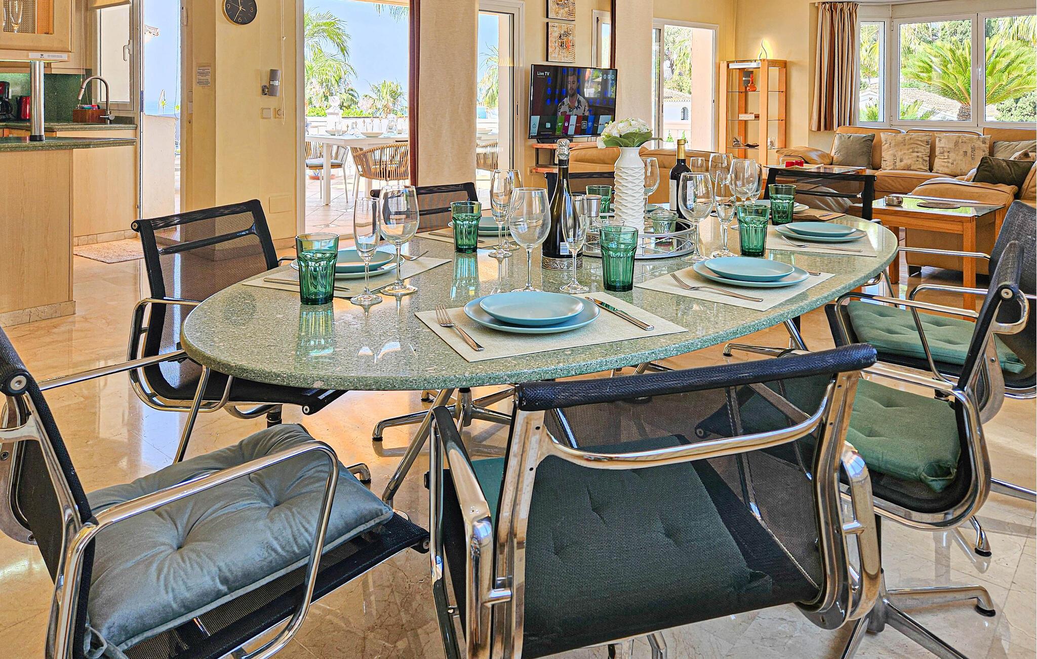 Denne sensationelle ferievilla ligger i nærheden af golfbanen Miraflor og 300 m fra golf-øvelsesbanen. Nyd at bade daglig i den private pool eller et solbad på en af de store terrasser. Også det indre har et luksuriøst miljø med komplet udstyret køkken og moderne, stilfuld indretning. Fra den enorme stue med spisebord, lædersofaer, stort tv med hjemmebiograf kan I træde ud på terrassen. Alle soveværelser har badeværelse en suite. Hovedsoveværelser har et stort smart-tv og der er karbad og bruser i badeværelset. Særskilt vaskerum med vaskemaskine, tørretumbler og garderobe. To barnesenge til rådighed ved forespørgsel. Huset råder over omfattende sikkerhedsforanstaltninger med ekstra gitre på terrassen, så børn ikke kan komme hen til poolen uden opsyn. Bebyggelsen Riviera del Sol har supermarkeder, barer, restauranter og en tennisklub med minigolf, motionsrum og bar/restaurant. Opdag Marbellas seværdigheder i jeres ferie. Kunst, arkitektur og historie venter jer her ligesom lange strande og imponerende havne fulde af yachts, der giver jer indblik i byens luksuøse liv. Byen Fuengirola med mange butikker og lange strande har en station, hvorfra der kører tog til hovedstaden Málaga hver time. Soveværelse 3 byder på et 3d-tv med mere end 1000 radio- og tv-kanaler.