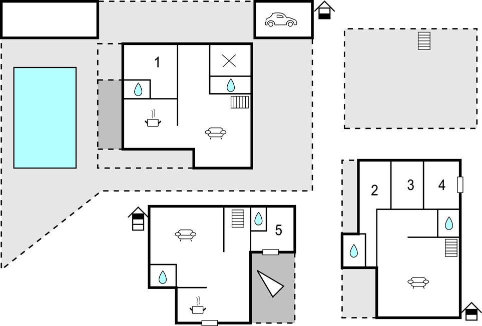 Adgang til feriehuset sker via gangen, ad hvilken I når stuen med TV og pejs, en åben køkken/spisestue, et gæstetoilet og et af de 5 soveværelser med dobbeltsenge. Fra dette er der adgang til terrassen og eget badeværelse.