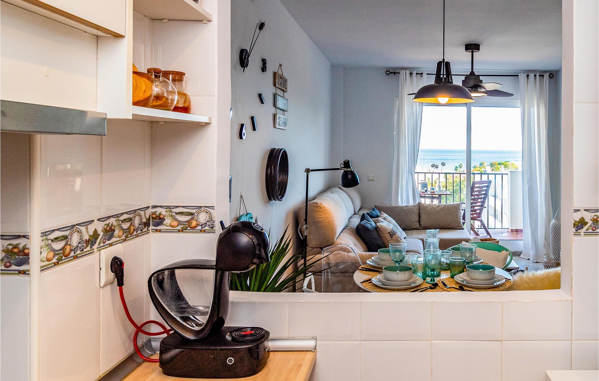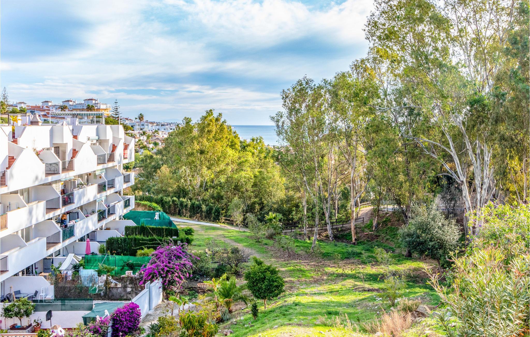 Denne smukke lejlighed i La Cala de Mijas har en overdækket terrasse med udsigt over poolområdet og havet.