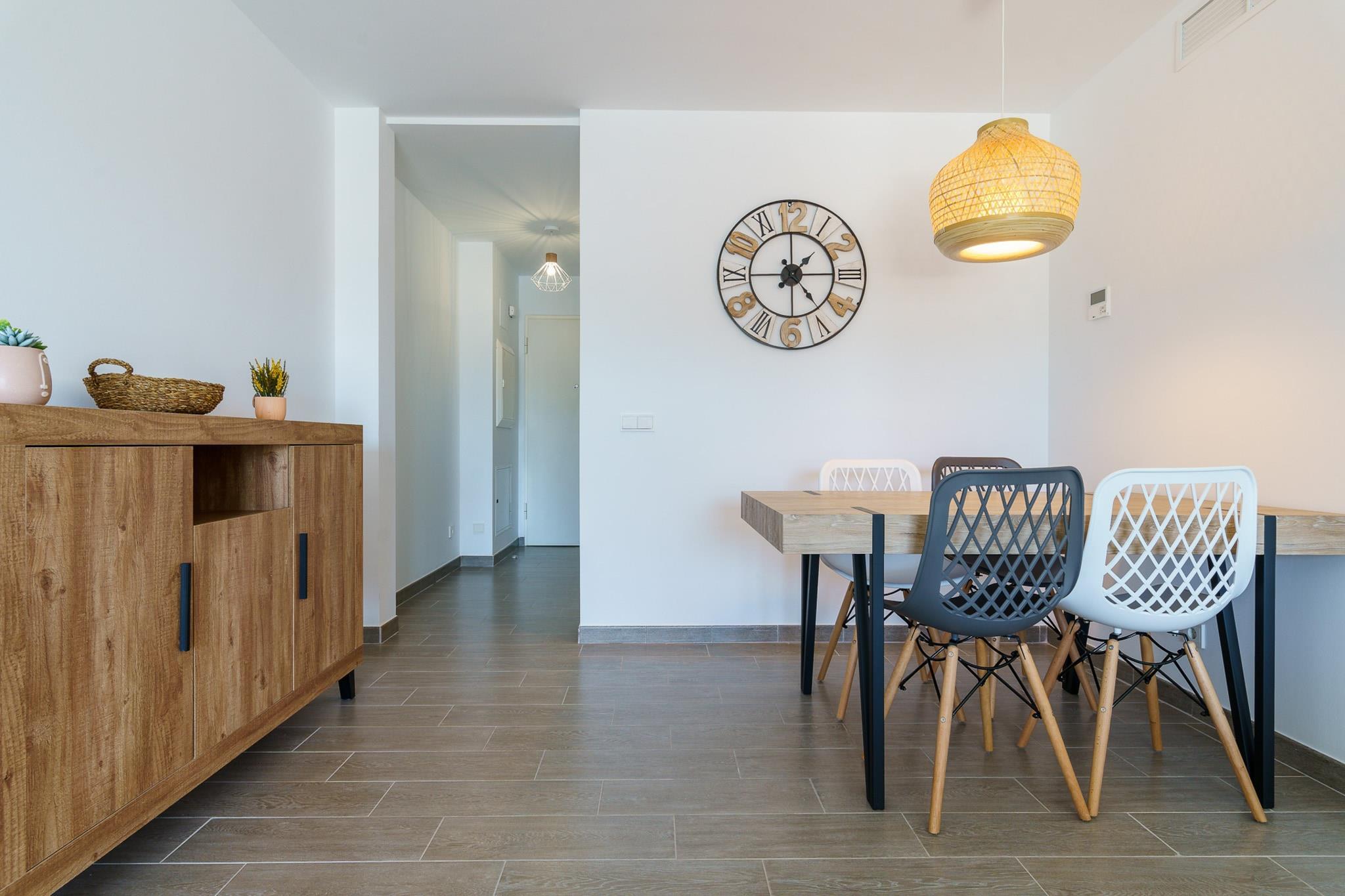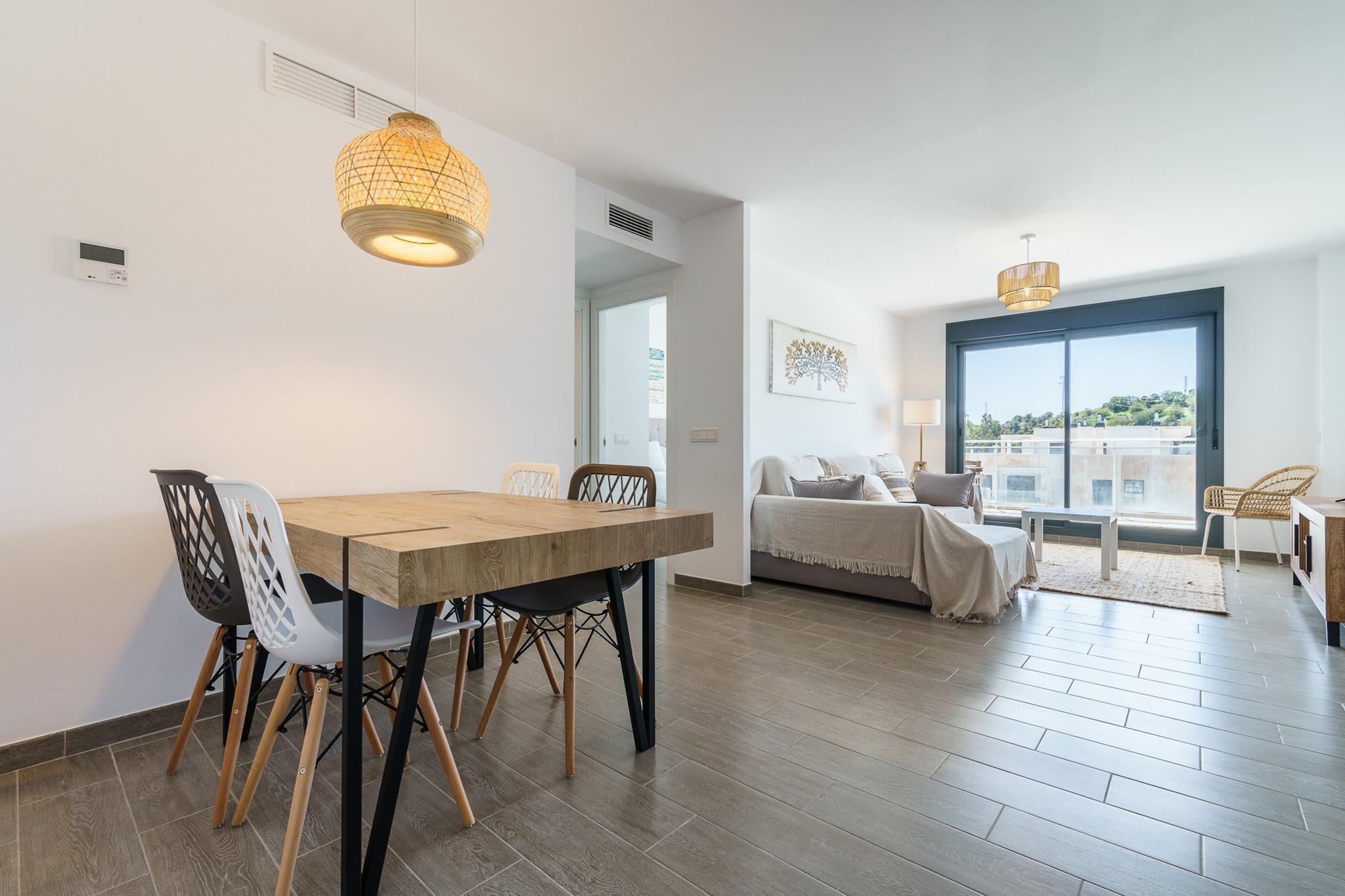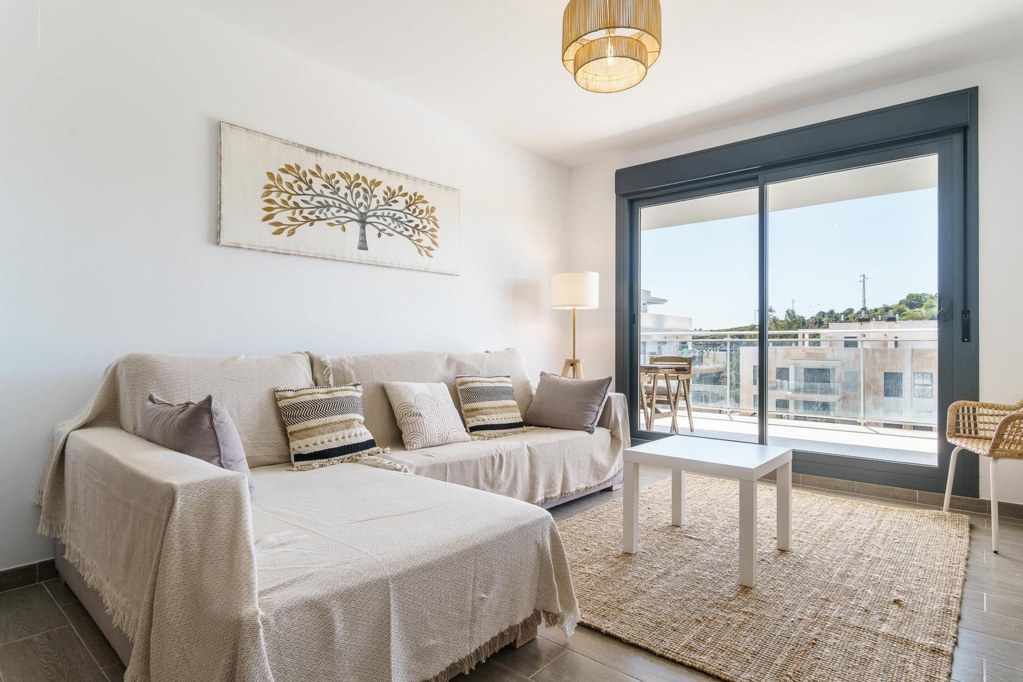 Træd ind i en helt ny, meget stilfuld lejlighed i et blomstrende område af La Cala de Mijas. Denne helt nye ejendom er designet med upåklagelig smag og tilbyder en frisk og livlig tilflugtssted for par eller golfentusiaster, der søger moderne komfort på den solrige Costa del Sol. Oplev moderne livsstil kun få øjeblikke fra alt, hvad du behøver, pakket ind i en atmosfære af raffineret elegance. Denne omhyggeligt udformede lejlighed har to indbydende soveværelser, hver med komfortable dobbeltsenge, og to pæne badeværelser for ultimativ bekvemmelighed. Den rummelige stue-spisestue strækker sig problemfrit til en tilstødende terrasse, perfekt til udendørs spisning eller blot at nyde middelhavssolen. Det elegante, fuldt udstyrede køkken tilbyder alt, hvad du behøver til kulinariske eventyr. I et sikkert, lukket område har du adgang til en funklende fælles pool, smukt anlagte haver og en dedikeret legeplads til børn. Udendørs parkering bidrager til at gøre dit ophold lettere og sikrer en problemfri oplevelse fra ankomst. Ud over dit stilfulde tilflugtssted kan du opdage den pulserende charme i La Cala de Mijas. Du er kun 5 minutter fra uberørte strande, der inviterer dig til at slappe af på det gyldne sand eller dyrke forskellige vandsportsgrene. Golfspillere vil blive begejstrede for lejlighedens nærhed til regionens mest symbolske baner, der tilbyder fairways i verdensklasse for alle niveauer. Udforsk den livlige bymidte med dens udvalg af tjenester, charmerende restauranter og lokale butikker. Costa del Sols utallige attraktioner, fra charmerende hvide landsbyer til travle lystbådehavne, er alle inden for rækkevidde og lover en uforglemmelig ferie fyldt med sol, fritid og opdagelser.