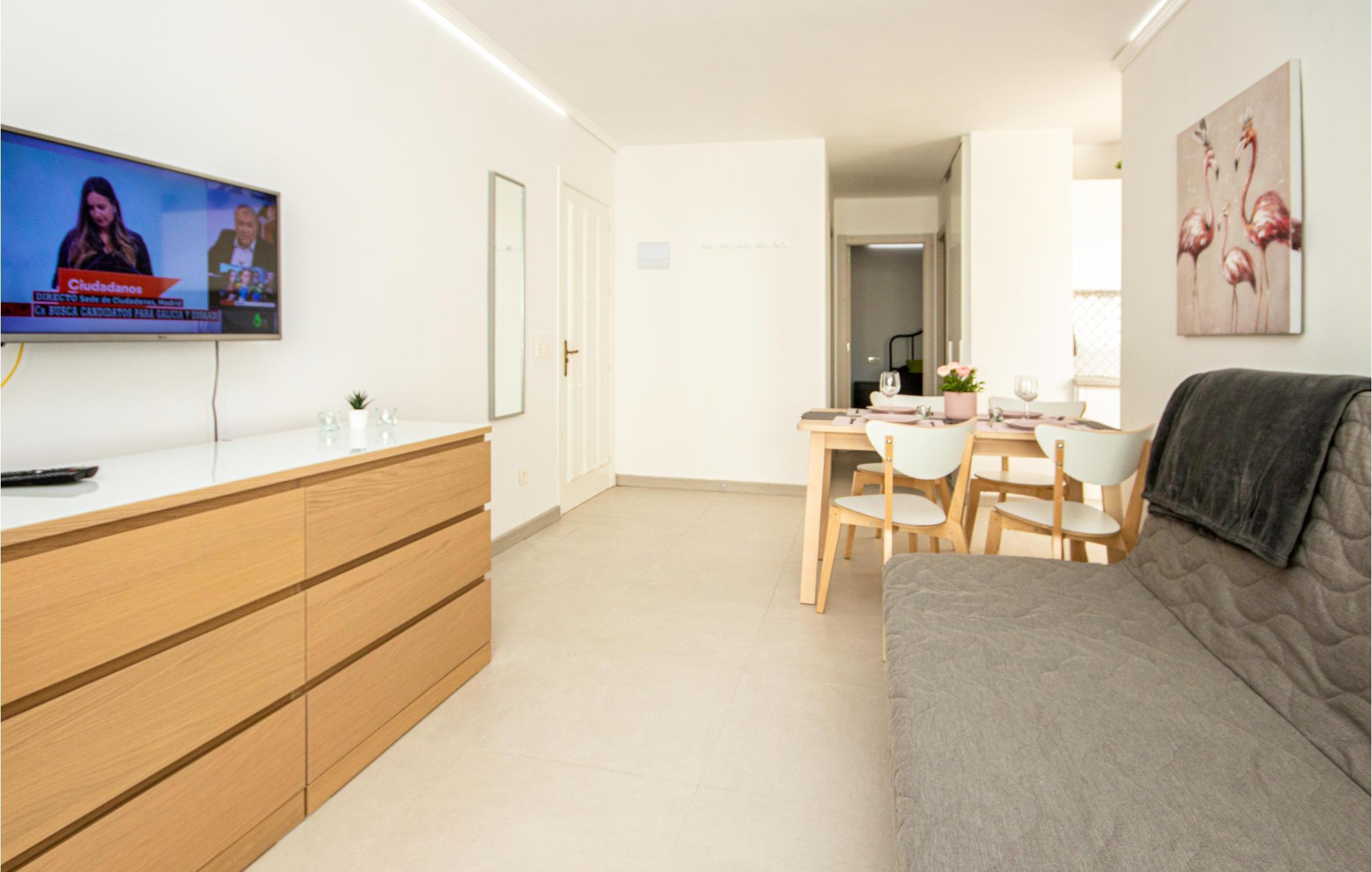 Lejligheden har en opholdsstue og spisestue, indendørs terrasse med glas og et separat køkken, der er veludstyret og har et vindue med udsigt over haven. Den indvendige terrasse er indrettet som en stue med to komfortable lænestole og et bord. Stuen er udstyret med et spisebord med stole og aircondition (varmt / koldt), stort tv og gratis WiFi.