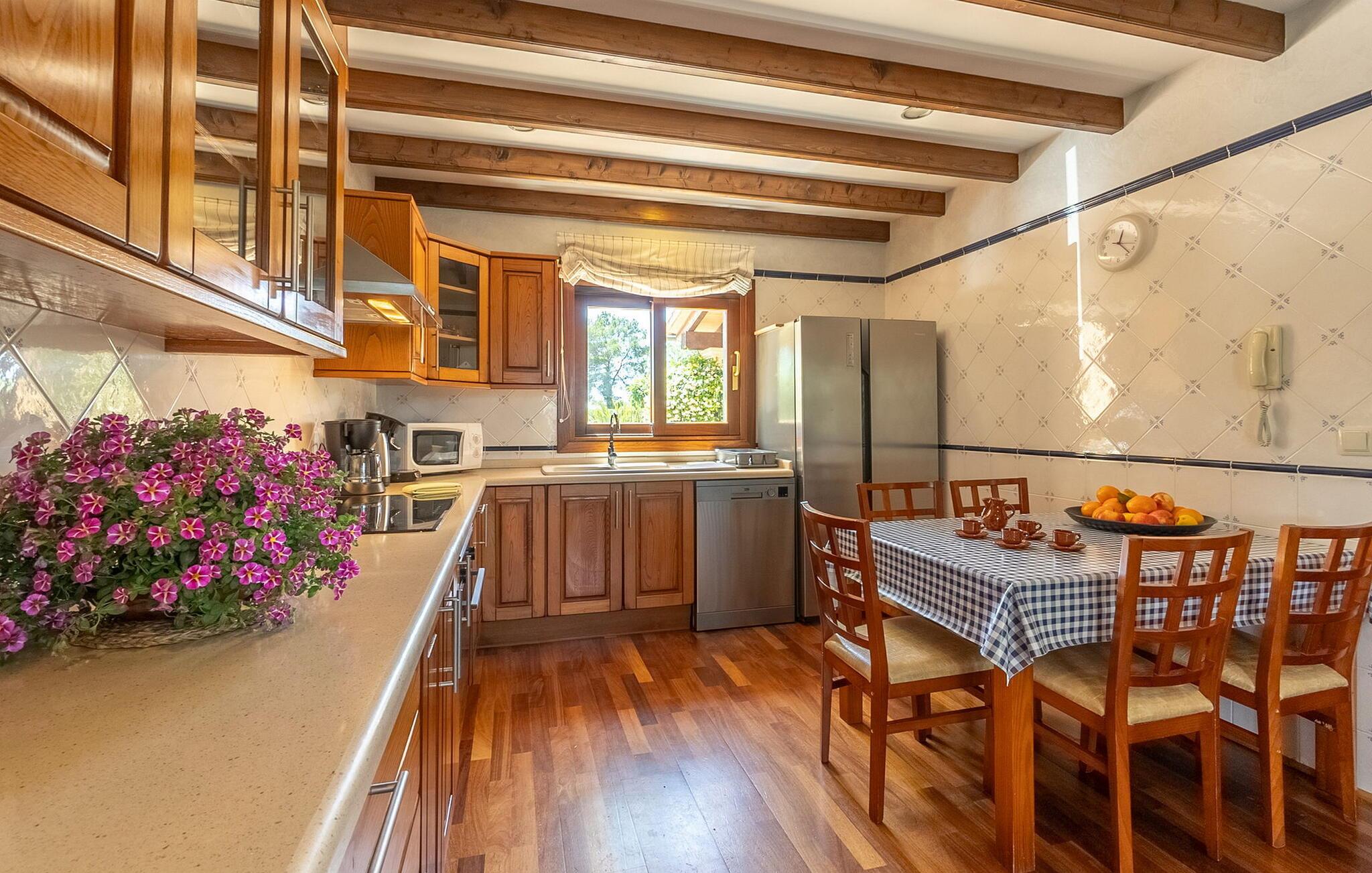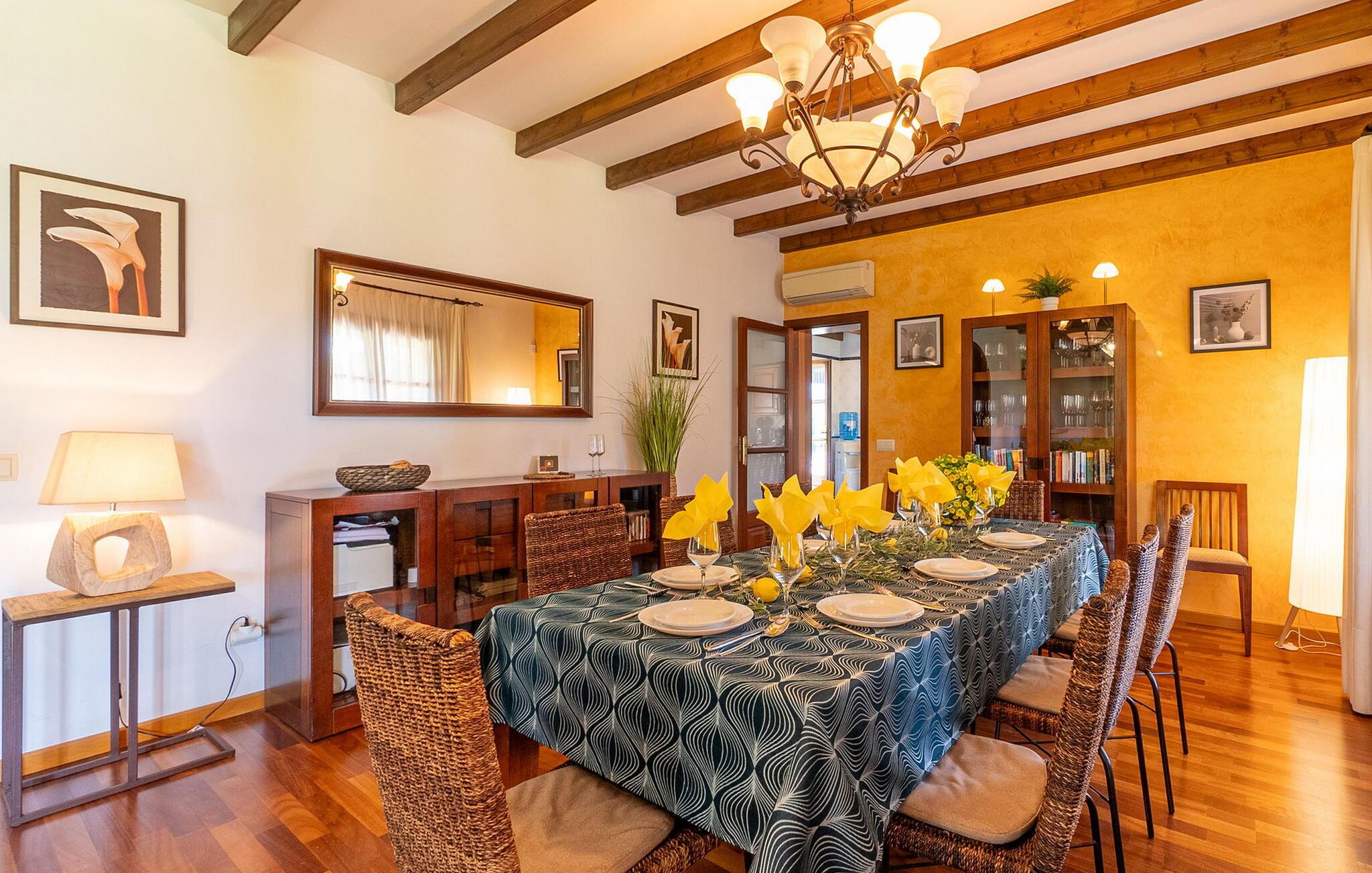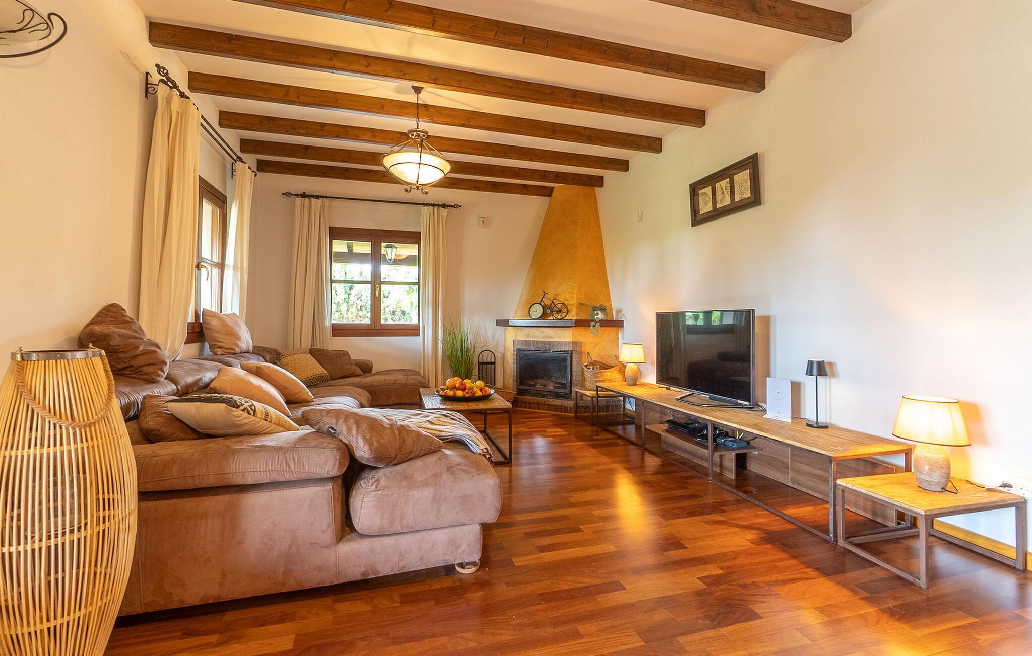 Beliggende i et rummeligt, velholdt havelandskab tilbyder denne rummelige og luksuriøst indrettede finca jer en solrig oase af fred, hvor I kan nyde middelhavsklimaet til fulde med venner eller familie. Det rummelige, velindrettede og højkvalitets interiør kombinerer rustik charme med moderne komfort og lover et behageligt indeklima og en ægte atmosfære året rundt. Glæd jer til hyggelige madlavningsaftener i det veludstyrede køkken i landlig stil og nyd dagens måltider i den indbydende spiseplads. Til hyggelige aftener, hvor I ser tv, kan I føle jer godt tilpas på det komfortable sofaområde. Spil PlayStation eller billard, eller nyd harmoniske aftener ved pejsen i de køligere måneder.