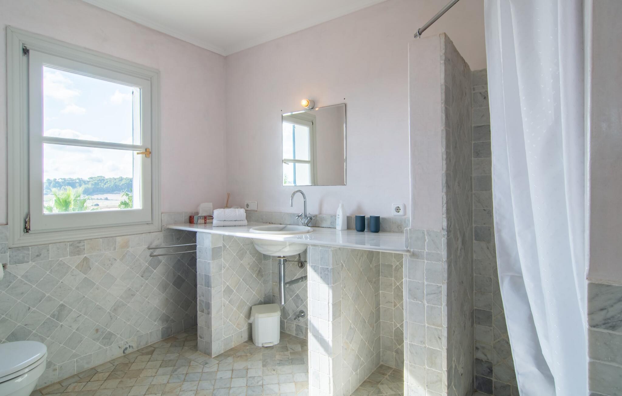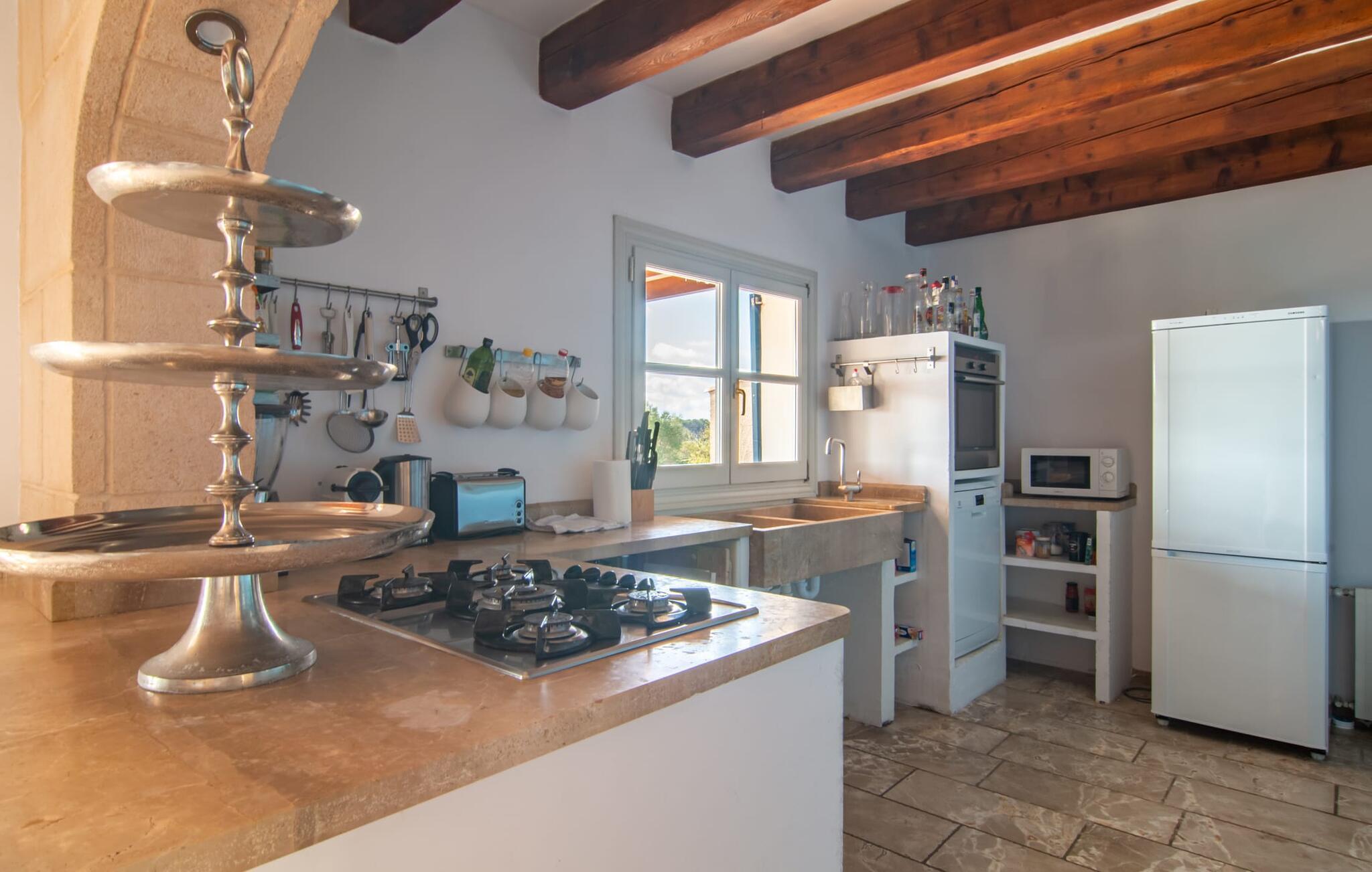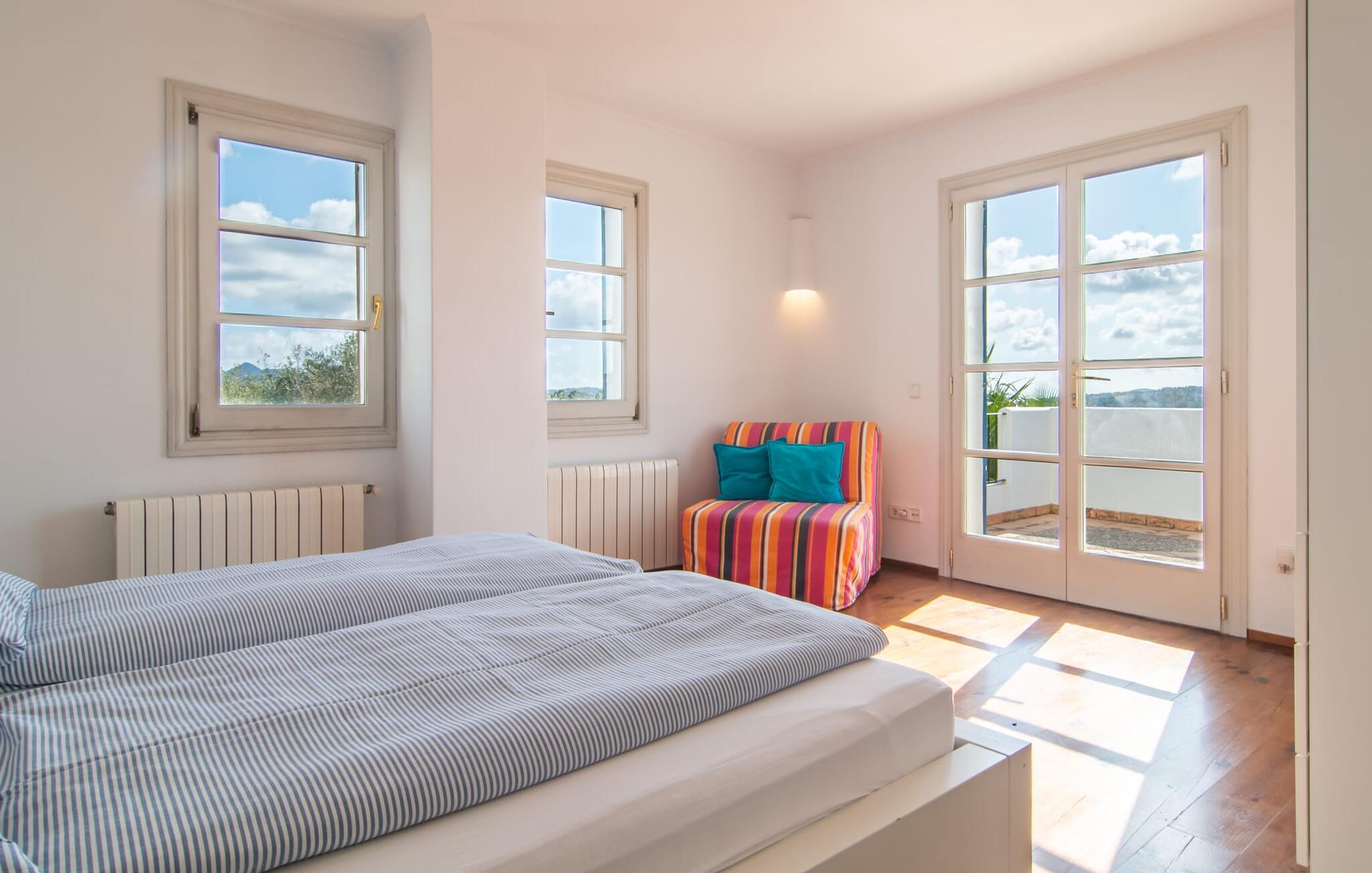 Villaen "Mira al Campo" er en meget fortryllende ejendom, der frem for alt imponerer med sin fantastiske udsigt og sine alsidige anvendelsesmuligheder. Middelhavsbygningen i to etager med de azurblå skodder har et fremragende boligareal og er derfor ideel til en ferie sammen som et par eller en familie med børn. Når I ankommer, vil I blive mødt af en storslået velkomst på den asfalterede indkørsel med rigelig parkering og første mulighed for at spille i form af en basketballkurv i garagen. En af villaens ydervægge er dekoreret med natursten, et typisk mallorcansk valg, og når I ser de smukke palmer i jeres store have, er I sikker på at mærke feriefølelser. Det rummelige udendørsområde med den velholdte græsplæne er indrammet af diskret anlagte grønne buske og træer og byder på en vidunderlig udsigt over det brede opland af Sant Llorenç. Som et centralt område for sjov og afslapning inviterer den 15 meter lange pool jer til at tage nogle sporty omgange eller blot køle ned i det forfriskende vand. Smuk solbadning er mulig med de polstrede træ-liggestole på den omkringliggende stenterrasse. Det "behagelige hyggehjørne" er også et skønt sted for en eftermiddagslur, hvis I foretrækker at dase. Når det er tid til at koncentrere sig om en spændende ferielæsning, er en af de to store parasoller den perfekte hjælp. Alternativt kan I blot trække jer tilbage – uforstyrret – til den skyggefulde sideterrasse. Rejser I med børn, kan de sikkert allerede nu lege på den rummelige græsplæne i haven. I kan også slippe dampen ud på jeres egen beachvolleybane! Den flade sandbane er perfekt til små spil blandt venner, som derefter kan slappe af med en forfriskende drink i det hyggelige loungeområde på den overdækkede udendørs terrasse. I finder også et stilfuldt træinteriør, hvor alle kan finde et sted at spise sammen i det fri. Den stilfulde villa byder velkommen indenfor i den meget rummelige opholds- og spisestue. Her kombineres rustikke elementer, herunder de traditionelle træbjælkelofter, harmonisk med den moderne indretning. Hele stueetagen er udstyret med dekorative marmorfliser, og den lyse indretning skaber en behagelig atmosfære, hvor I kan tilbringe afslappende timer. Et fladskærms-tv og dvd-afspiller sørger for underholdning i det indbydende opholdsområde. Madlavning på et gaskomfur med fem brændere er meget sjovt i det fuldt udstyrede køkken. Det er adskilt fra spisepladsen af en stenbuegang og har sammen med det store køleskab alt hvad I behøver for at tilberede lækre måltider. Opvasken og maden er placeret kun få skridt væk fra det massive mørke træ spisebord over for den indbyggede kogeplade, som komfortabelt kan rumme seks sultne personer. Tre rummelige soveværelser og et lille badeværelse med bruser er placeret på bagsiden af huset i stueetagen. Fra det nederste soveværelse har I direkte udgang til den stille sideterrasse og kan lade morgensolen blidt kærtegne jeres ansigt og vække jer om morgenen. En behagelig trappe fører jer fra opholds- og spiseafdelingen til et lille, lysfyldt galleri, hvorfra I kan nå de to andre soveværelser på øverste etage. jeres nætter i villaen "Mira al Campo" vil altid være behagelige på 1,80 x 2,00 m dobbeltsenge. De øverste soveværelser er også meget rummelige, smagfuldt indrettede og har alle deres eget badeværelse. Der er god plads til alle jeres ting i de lyse badeværelser med vinduer. Der er også hårtørrere, så I behøver ikke at tage dem med. Store franske døre fører jer direkte fra soveværelset til den lange altan, som byder på en fantastisk udsigt over det let bakkede landskab om morgenen. Den charmerende lille by Sant Llorenç er vært for et lille, livligt ugentligt marked hver torsdag på Calle Major. Her kan I købe friske regionale produkter. Der er også andre indkøbsmuligheder samt små barer omkring kirken og selvfølgelig pubber, der tilbyder mallorcanske specialiteter. De to større byer Artà og Manacor er nemme at nå fra villaen og inviterer jer til at tage en kort gåtur gennem byen med muligheder for sightseeing. Måske finder en af de mest populære festivaler, herunder Abrikosfestivalen, sted i Artà, mens I er her? De smukke strande på den nærliggende østkyst inviterer jer til at tage på ture i det vidunderlige solskin og have det sjovt med at svømme i havet. Denne charmerende villa har meget at byde på for både store og små feriegæster, der kan lide at rejse. "Mira al Campo" er let forhøjet og forkæler sine besøgende med en fantastisk udsigt over de grønne omgivelser. Det er i en rolig, afsondret beliggenhed tæt på den charmerende landsby Sant Llorenç des Cardassar, hvor I finder shopping og restauranter. Et populært ugentligt marked finder sted der om torsdagen. Den travle strand S'Illot eller den mere rolige sandstrand Sa Marjal ligger cirka 16 km mod øst.
