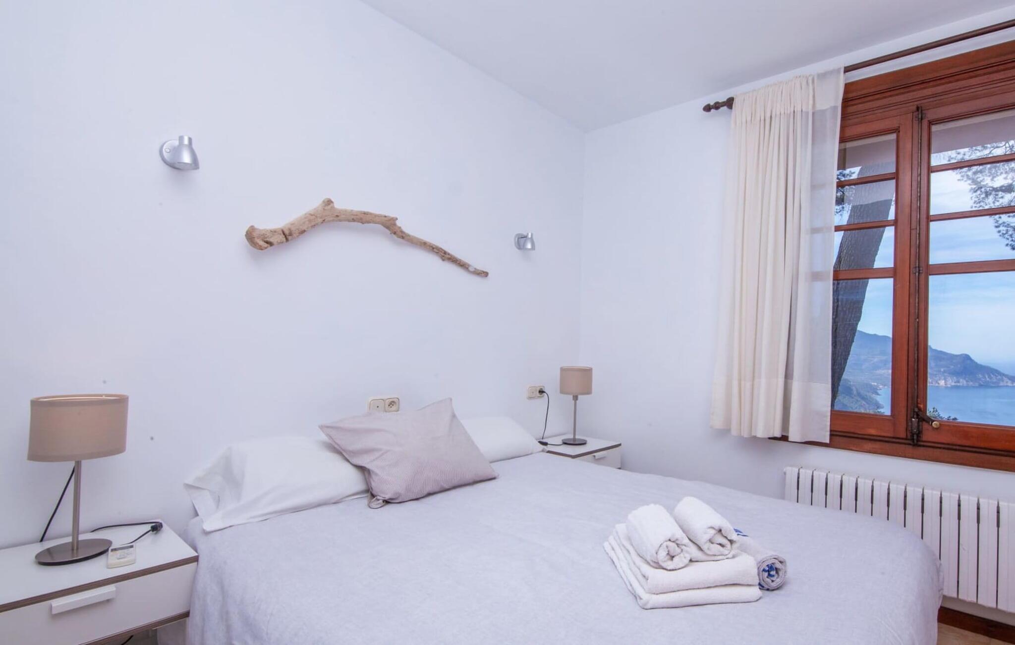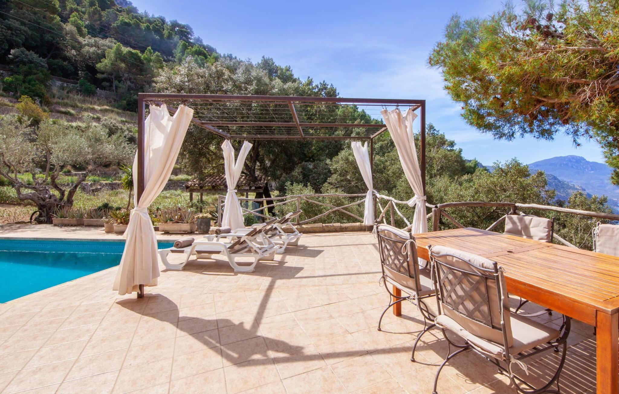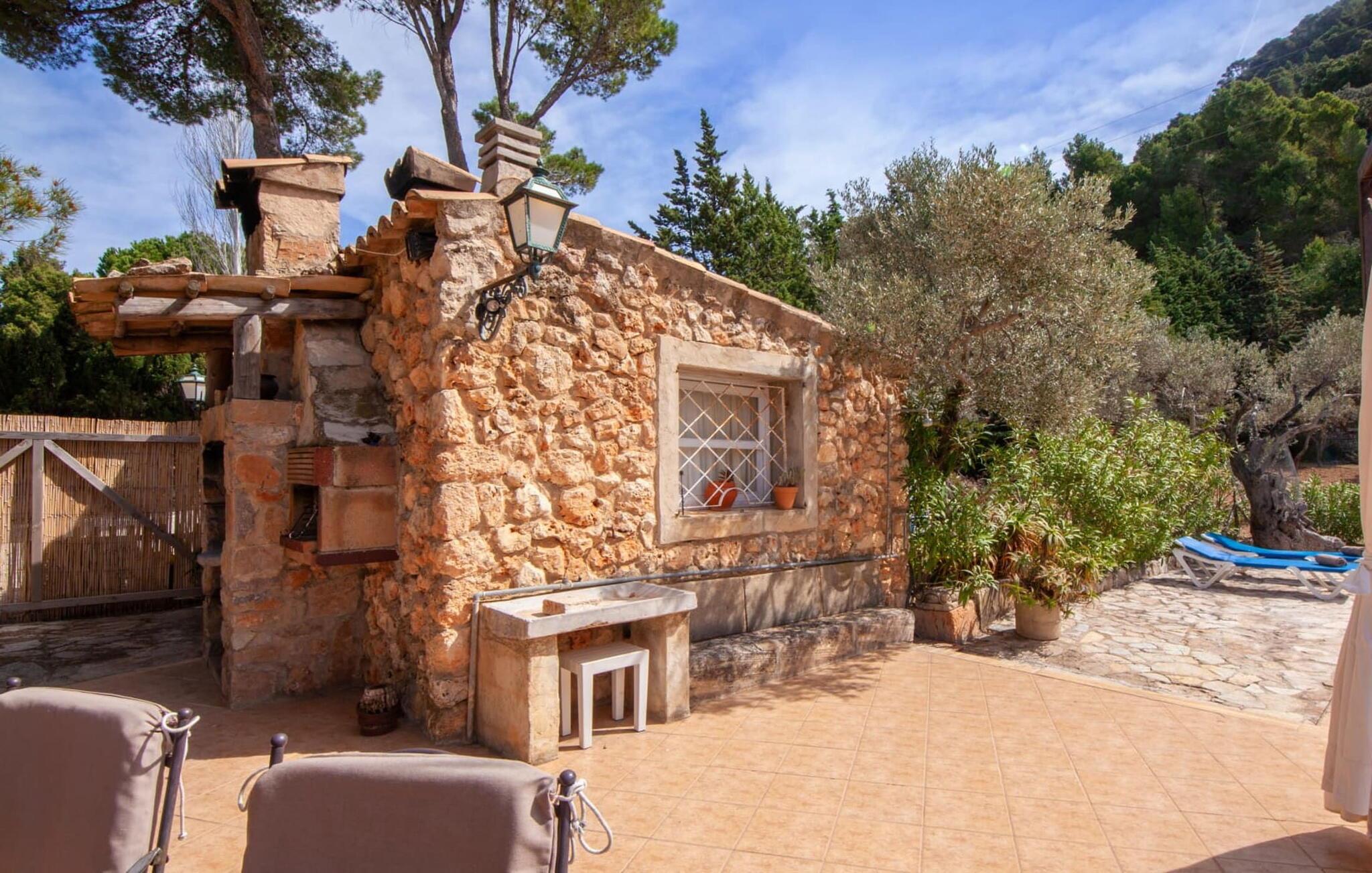 Villaen "Miraet" ligger afsondret på en 4.000 m² stor grund og byder på en betagende udsigt og absolut fred rummelig balkon løber langs fronten, hvor du kan nyde havudsigten og slappe af med en bog eller et glas fin mallorcansk vin. Poolen, som kan nås via trapper, er dekoreret med blå mosaiksten Flisebelagt Når aftenen nærmer sig, vil du helt sikkert have lyst til at fyre op i grillen til en solid middag. Der er en parkeringsplads lige ved siden af huset badeværelse På øverste etage er der en rummelig opholdsstue med køkken og spiseplads. Foran denne tilbygning er der en altan med en vidunderlig udsigt over havet. Villaen er udstyret med varme, pejs og aircondition for at give komfort hele året rundt. Bemærk venligst, at det på grund af dens beliggenhed ved klippen muligvis ikke er egnet til familier med små børn. Villaen "Miraet" ligger på en helt sublim beliggenhed på Mallorcas spektakulære vestkyst og byder på en sensationel udsigt over øens smukkeste kyststrækning ' kørsel - fra de maleriske landsbyer Deìa og Valldemossa, som begge har barer, restauranter og et lille supermarked Den fantastiske bugt Cala Deìa er kun en kort køretur væk.
