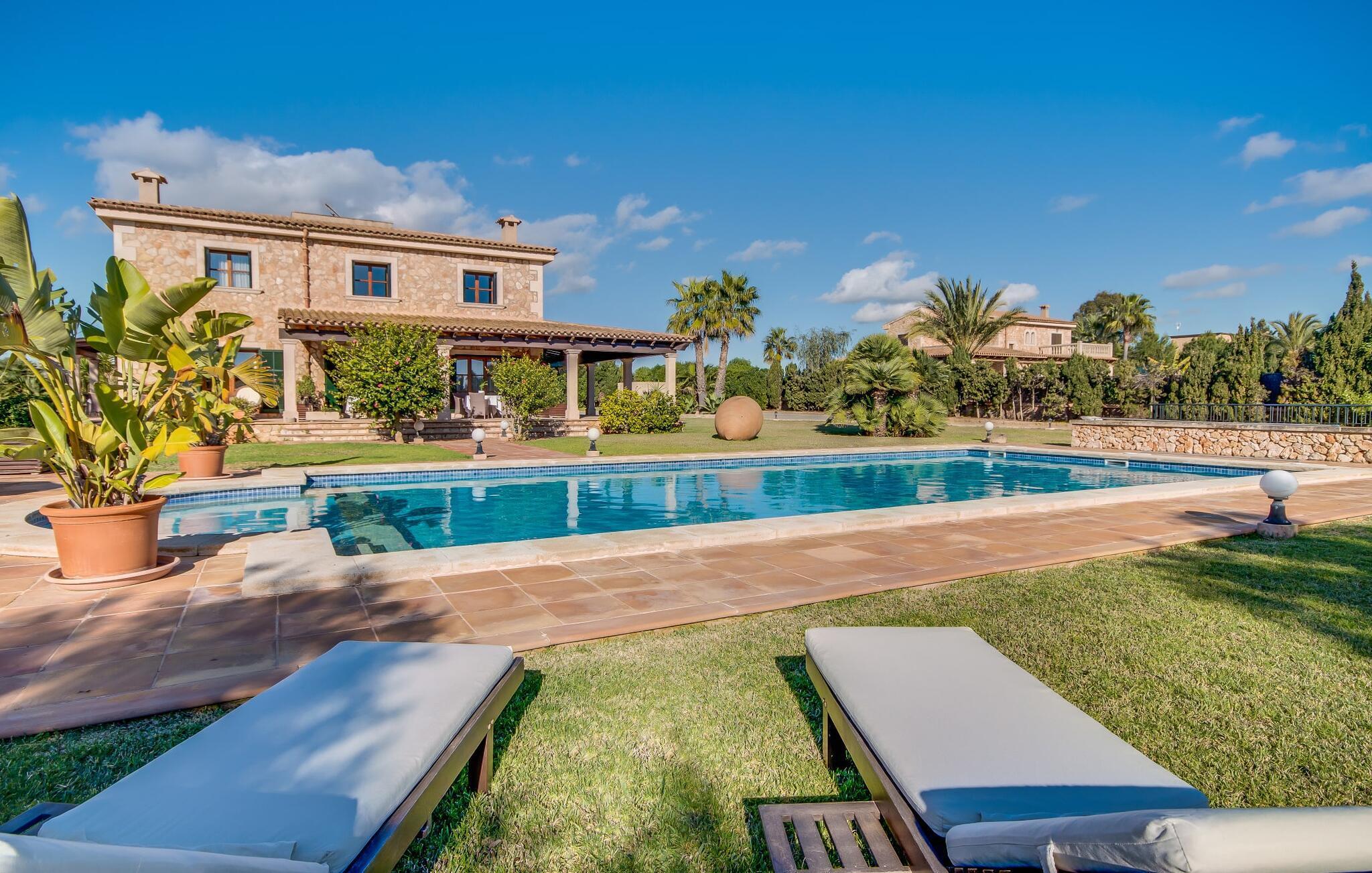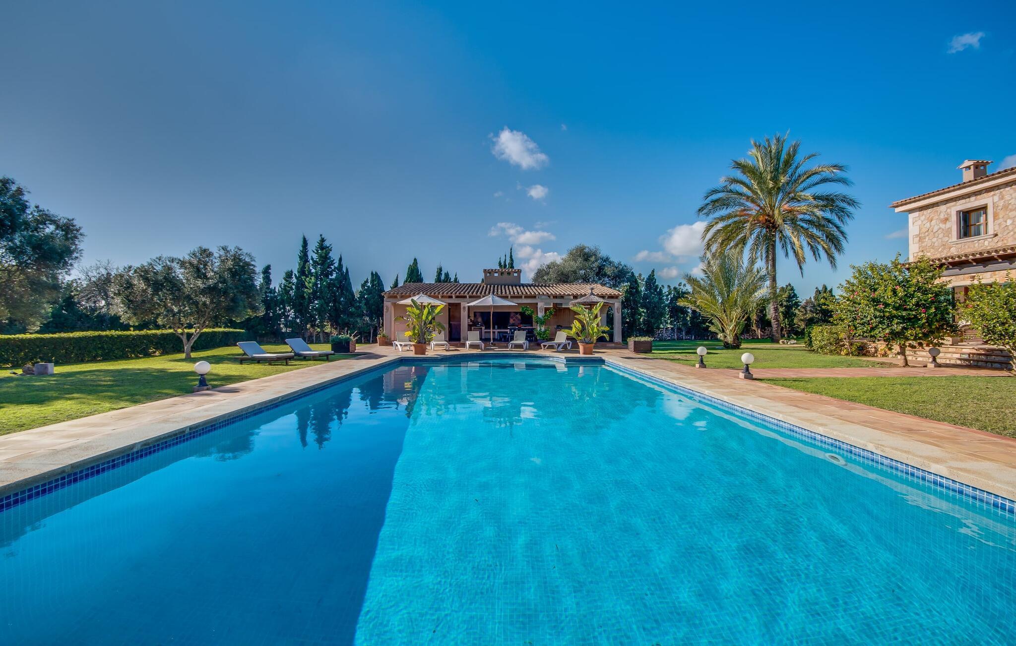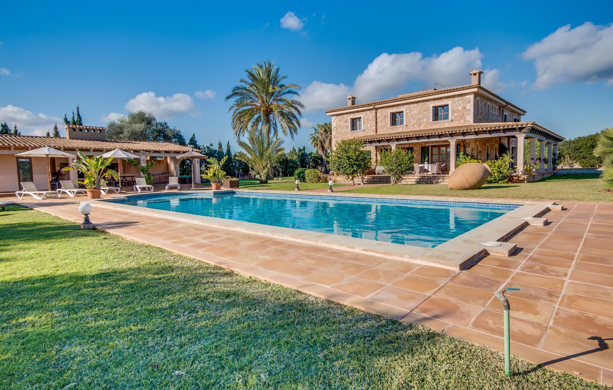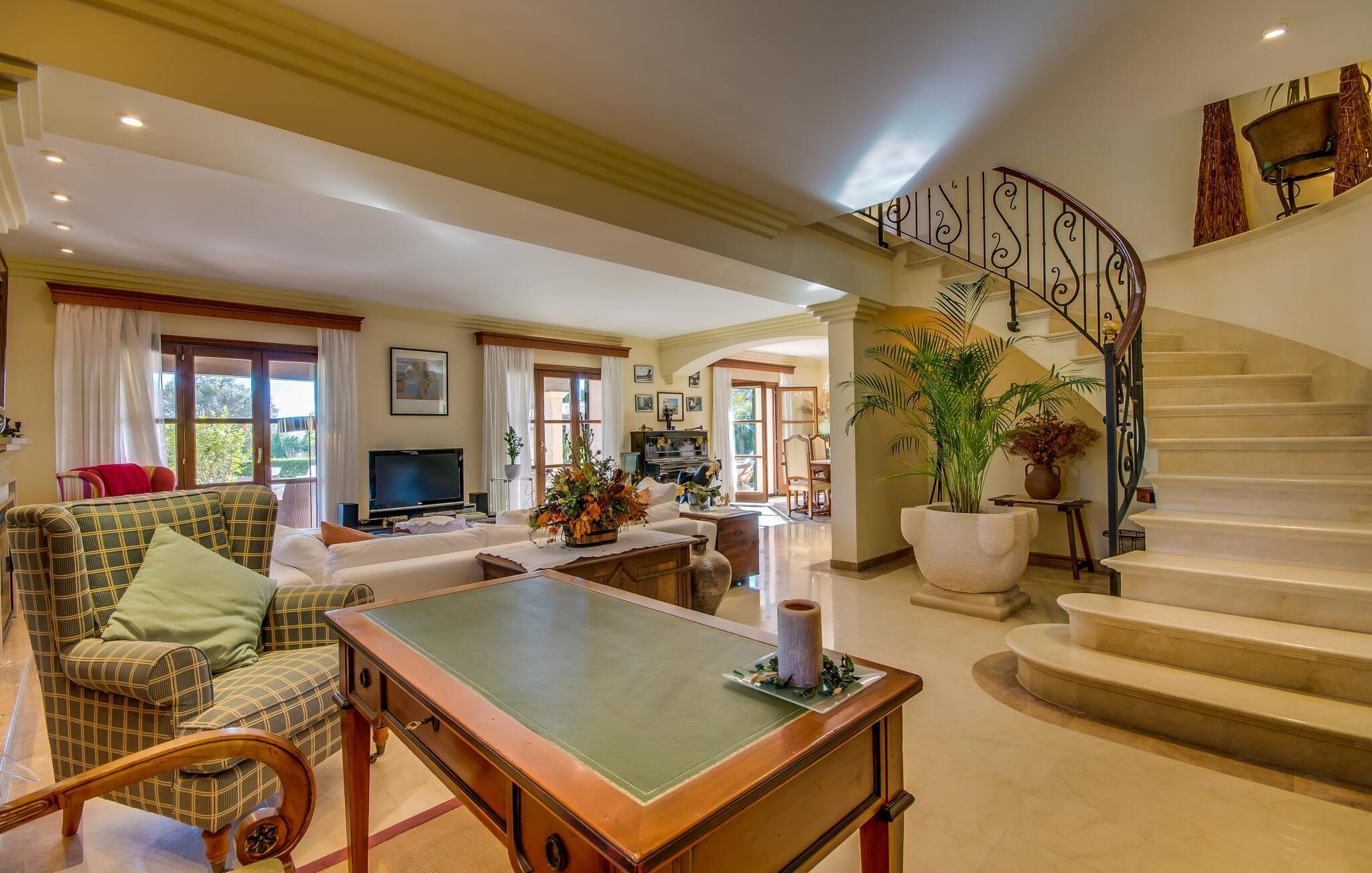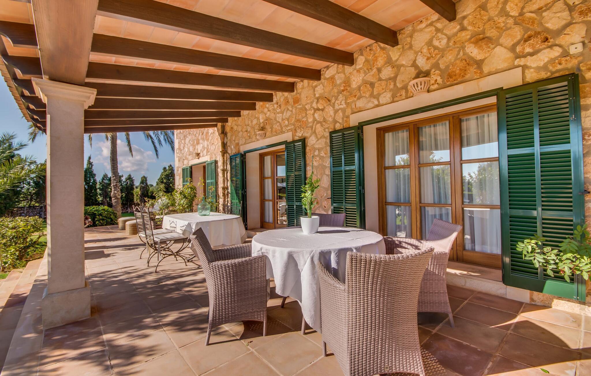 Når man ser på billederne af villaen “Mitjana” kan man ikke få nok: Stort land, palmer og cypresser mod en helårsgrøn baggrund, i det fjerne Middelhavet og midt i det hele ligger det smukke traditionelle stenbrudshus med hvide lister, trævinduer, grønne skodder og de lertagsten, der er typiske for regionen. "Mitjana" er et af de smukke, klassiske stykker af Mallora, som vi alle elsker så højt, og det er tæt på stranden. Proportionerne af komplekset er perfekt realiseret og lige ved siden af den storslåede hovedbygning med dens overdækkede terrasse og plads nok til en udendørs spiseplads er der en swimmingpool på næsten 80 m². Det meget praktiske udendørs badeværelse er integreret i udekøkkenets murstensstruktur lige ved siden af, som har to indbyggede BBQ-grill og en brændeovn. Der er en dejlig rustik atmosfære, hvor du kan afslutte dagen med at slappe af med venner og familie, mens du nyder en lækker BBQ. Du kan købe friske, sprøde produkter på markedet i Felanitx eller Santanyí. Hvis du ikke laver andet, kan du hoppe i swimmingpoolen eller teste dine færdigheder ved bordtennisbordet. Samlet set byder den omfattende have i maritim stil på mange muligheder for børn til at slippe damp og have det sjovt. Det er så enkelt som at lade dem gå. Indretningen af huset gør det ideelt for to familier af venner, der rejser sammen. I alt 350 m² boligareal er fordelt på to etager og er elegant designet og indrettet, som passer godt til husets traditionelle facade. I stueetagen, på den anden side af terrassen, er den udsøgte opholds- og spisestue med en behagelig sofa, hyggelig pejs, TV, bibliotek og klaver. Husets klassiske charme med stukafslutninger, moderne møbler af høj kvalitet, tæpper og lysekroner suppleres af integreret spotbelysning og særligt skinnende blankpolerede gulve. Det store, alsidige køkken i landlig stil med varme træskabe er meget moderne udstyret, herunder en opvaskemaskine og et amerikansk køleskab med ismaskine til kølige drikkevarer, men har også en gammeldags brændeovn. Det har også en ekstra spiseplads foran en gammel pejs. Der er også et toilet på denne etage, som er tilgængeligt for alle gæster. Det er meget rart, at alle soveværelser er på øverste etage. Dette omfatter to store soveværelser, der deler et separat opholdsområde og et tilstødende badeværelse. Yderligere tre badeværelser, hver med to enkeltsenge, deler et badeværelse med badekar - ideel til at bringe alle børn sammen, eller endda til venner eller bedsteforældre, der er med på turen. Alle værelser har aircondition og selvfølgelig opvarmet. Du har sikkert allerede fundet billederne af badeværelset bag det store soveværelse, hvor du finder et boblebad og en bruser med massagedyser. Her venter dig virkelig himmelske oplevelser - og selvfølgelig er der meget mere at udforske og opdage uden for villaen. Du kan opdage mangfoldigheden af de smukkeste Baleariske Øer, især langs den sydøstlige kyst. Udover hyggelige byer med let turisme, livlige promenader med gode restauranter og et par barer, er der også talrige strande, der er perfekte til en ferie ved vandet. Disse omfatter villaens navnebror, Cala Mitjana, men også Cala Sa Nau, Cala Petita, Cala Serena, Cala Ferrera og mange flere. Disse steder har alle imponerende fjordlignende bugter med klart vand. Den nærliggende landevej, som fører enten ind i landet eller til attraktive destinationer langs kysten, er delvist hørbar fra ejendommen, men kun når vinden er lige tilpas. Nærheden af denne motorvej betyder, at du kan nyde en landlig beliggenhed, der stadig giver nem adgang til en række ferieaktiviteter, som endda kan omfatte et besøg på den nærliggende Vall d'Or golfbane. Hvordan du slapper af og tager en pause fra hverdagens stress er op til dig - men vi hos Fincallorca gør vores bedste for at tilbyde dig det perfekte sted at gøre det, og i vores øjne er Villa “Mitjana” lige sagen. Den udsøgte naturstensvilla "Mitjana" med stor anlagt have, poolområde og rustikt udekøkken ligger kun få minutters gang fra badebugten af samme navn nær Cala D'Or. I denne charmerende lille by med sin enkle hvide arkitektur kan du shoppe eller gå en tur langs promenaden. For øens berømte markeder kan du tage til Santantyí eller længere inde i landet til Felanitx. Nyd et mangfoldigt udvalg af brede, fjordlignende badebugter, der nemt kan nås med din lejebil. Dette er et Fincallorca feriehus.