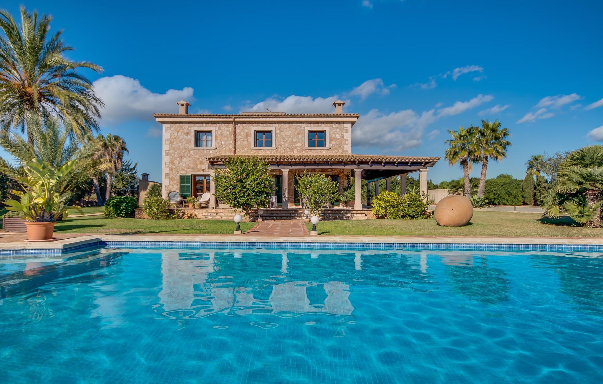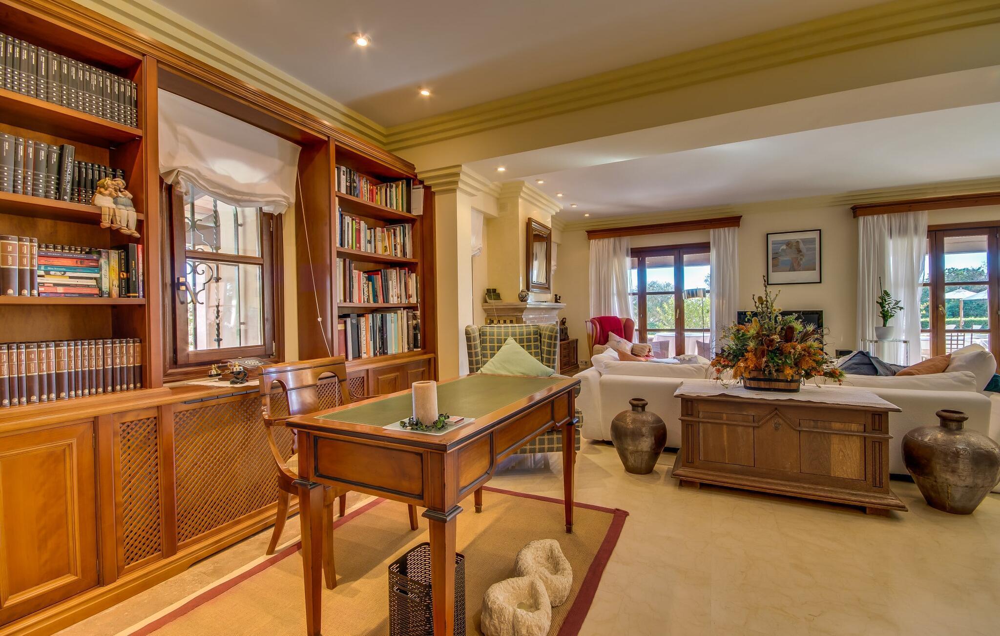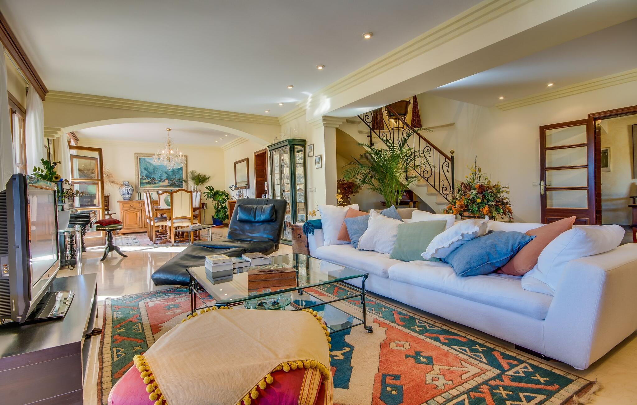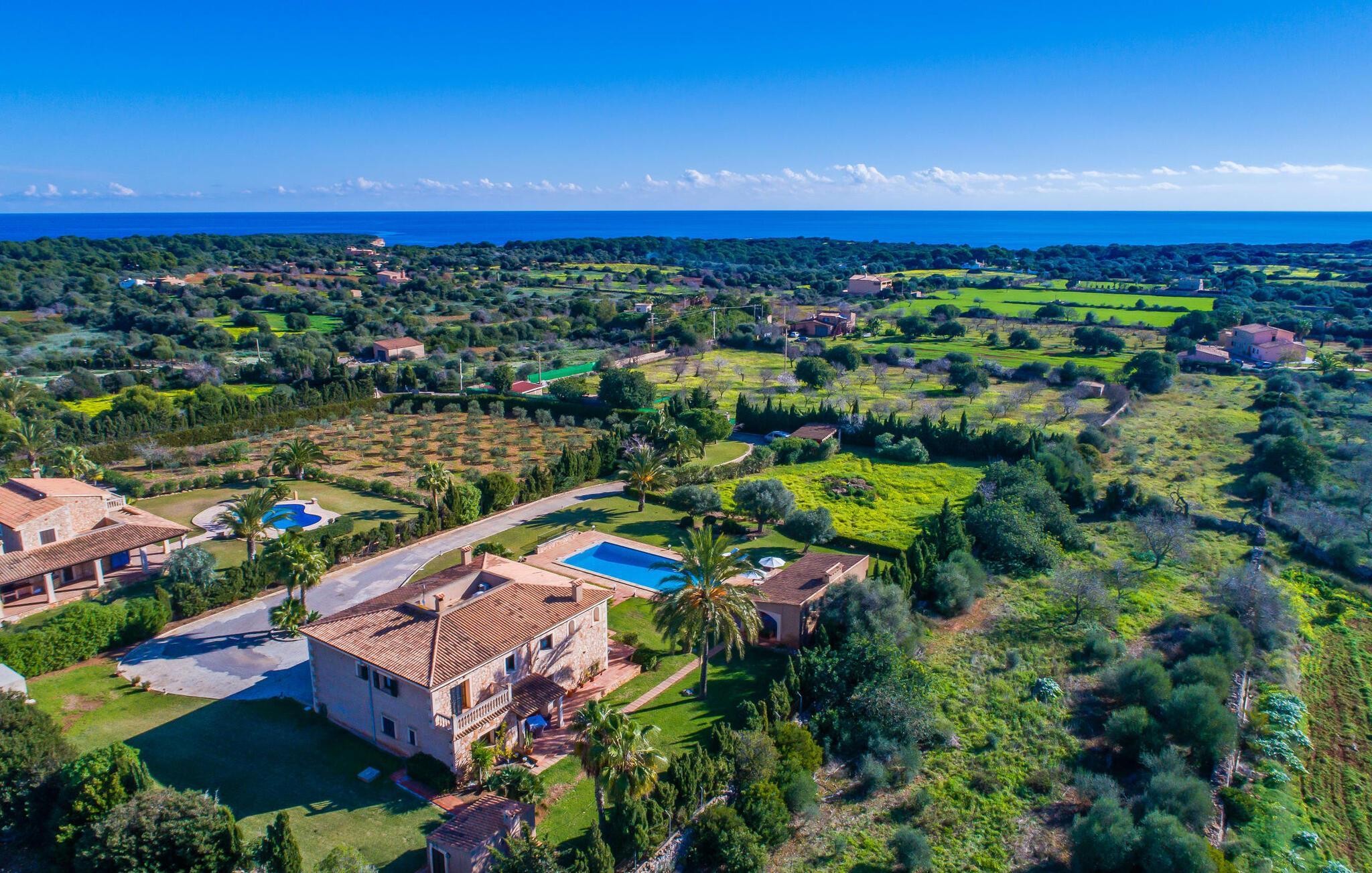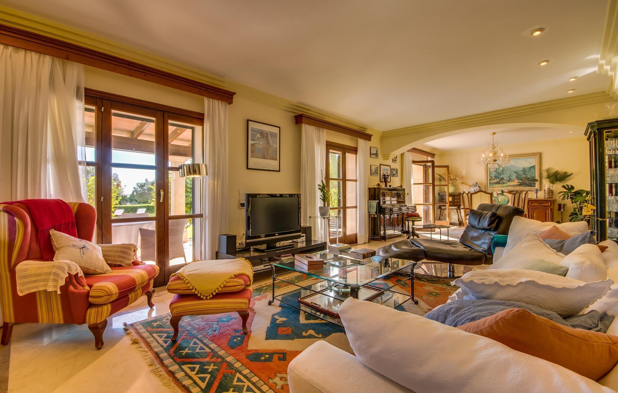 Når man ser på billederne af villaen “Mitjana” kan man ikke få nok: Stort land, palmer og cypresser mod en helårsgrøn baggrund, i det fjerne Middelhavet og midt i det hele ligger det smukke traditionelle stenbrudshus med hvide lister, trævinduer, grønne skodder og de lertagsten, der er typiske for regionen. "Mitjana" er et af de smukke, klassiske stykker af Mallora, som vi alle elsker så højt, og det er tæt på stranden. Proportionerne af komplekset er perfekt realiseret og lige ved siden af den storslåede hovedbygning med dens overdækkede terrasse og plads nok til en udendørs spiseplads er der en swimmingpool på næsten 80 m². Det meget praktiske udendørs badeværelse er integreret i udekøkkenets murstensstruktur lige ved siden af, som har to indbyggede BBQ-grill og en brændeovn. Der er en dejlig rustik atmosfære, hvor du kan afslutte dagen med at slappe af med venner og familie, mens du nyder en lækker BBQ. Du kan købe friske, sprøde produkter på markedet i Felanitx eller Santanyí. Hvis du ikke laver andet, kan du hoppe i swimmingpoolen eller teste dine færdigheder ved bordtennisbordet. Samlet set byder den omfattende have i maritim stil på mange muligheder for børn til at slippe damp og have det sjovt. Det er så enkelt som at lade dem gå. Indretningen af huset gør det ideelt for to familier af venner, der rejser sammen. I alt 350 m² boligareal er fordelt på to etager og er elegant designet og indrettet, som passer godt til husets traditionelle facade. I stueetagen, på den anden side af terrassen, er den udsøgte opholds- og spisestue med en behagelig sofa, hyggelig pejs, TV, bibliotek og klaver. Husets klassiske charme med stukafslutninger, moderne møbler af høj kvalitet, tæpper og lysekroner suppleres af integreret spotbelysning og særligt skinnende blankpolerede gulve. Det store, alsidige køkken i landlig stil med varme træskabe er meget moderne udstyret, herunder en opvaskemaskine og et amerikansk køleskab med ismaskine til kølige drikkevarer, men har også en gammeldags brændeovn. Det har også en ekstra spiseplads foran en gammel pejs. Der er også et toilet på denne etage, som er tilgængeligt for alle gæster. Det er meget rart, at alle soveværelser er på øverste etage. Dette omfatter to store soveværelser, der deler et separat opholdsområde og et tilstødende badeværelse. Yderligere tre badeværelser, hver med to enkeltsenge, deler et badeværelse med badekar - ideel til at bringe alle børn sammen, eller endda til venner eller bedsteforældre, der er med på turen. Alle værelser har aircondition og selvfølgelig opvarmet. Du har sikkert allerede fundet billederne af badeværelset bag det store soveværelse, hvor du finder et boblebad og en bruser med massagedyser. Her venter dig virkelig himmelske oplevelser - og selvfølgelig er der meget mere at udforske og opdage uden for villaen. Du kan opdage mangfoldigheden af de smukkeste Baleariske Øer, især langs den sydøstlige kyst. Udover hyggelige byer med let turisme, livlige promenader med gode restauranter og et par barer, er der også talrige strande, der er perfekte til en ferie ved vandet. Disse omfatter villaens navnebror, Cala Mitjana, men også Cala Sa Nau, Cala Petita, Cala Serena, Cala Ferrera og mange flere. Disse steder har alle imponerende fjordlignende bugter med klart vand. Den nærliggende landevej, som fører enten ind i landet eller til attraktive destinationer langs kysten, er delvist hørbar fra ejendommen, men kun når vinden er lige tilpas. Nærheden af denne motorvej betyder, at du kan nyde en landlig beliggenhed, der stadig giver nem adgang til en række ferieaktiviteter, som endda kan omfatte et besøg på den nærliggende Vall d'Or golfbane. Hvordan du slapper af og tager en pause fra hverdagens stress er op til dig - men vi hos Fincallorca gør vores bedste for at tilbyde dig det perfekte sted at gøre det, og i vores øjne er Villa “Mitjana” lige sagen. Den udsøgte naturstensvilla "Mitjana" med stor anlagt have, poolområde og rustikt udekøkken ligger kun få minutters gang fra badebugten af samme navn nær Cala D'Or. I denne charmerende lille by med sin enkle hvide arkitektur kan du shoppe eller gå en tur langs promenaden. For øens berømte markeder kan du tage til Santantyí eller længere inde i landet til Felanitx. Nyd et mangfoldigt udvalg af brede, fjordlignende badebugter, der nemt kan nås med din lejebil. Dette er et Fincallorca feriehus.