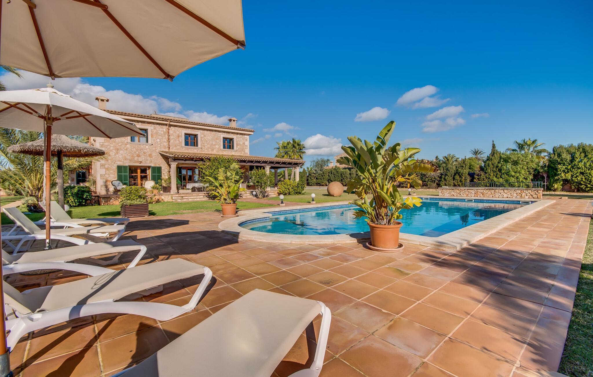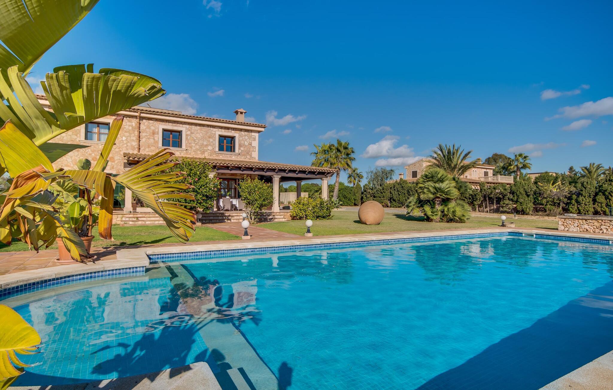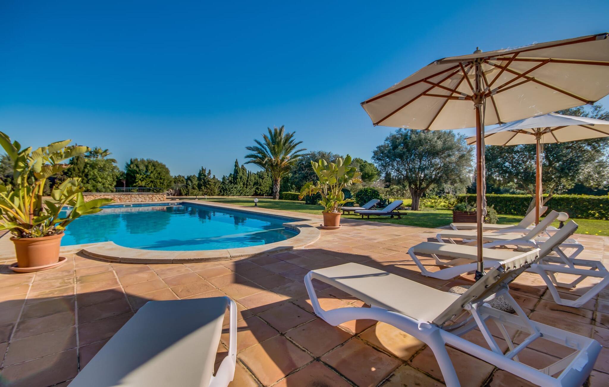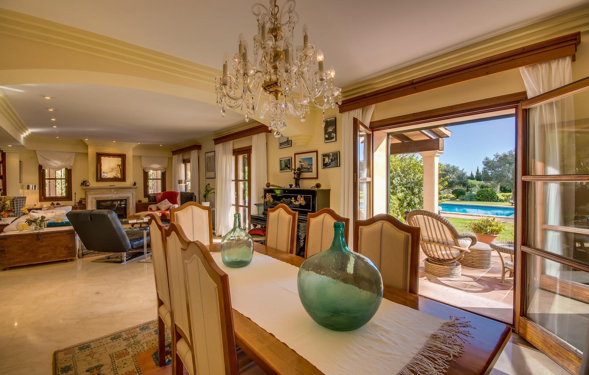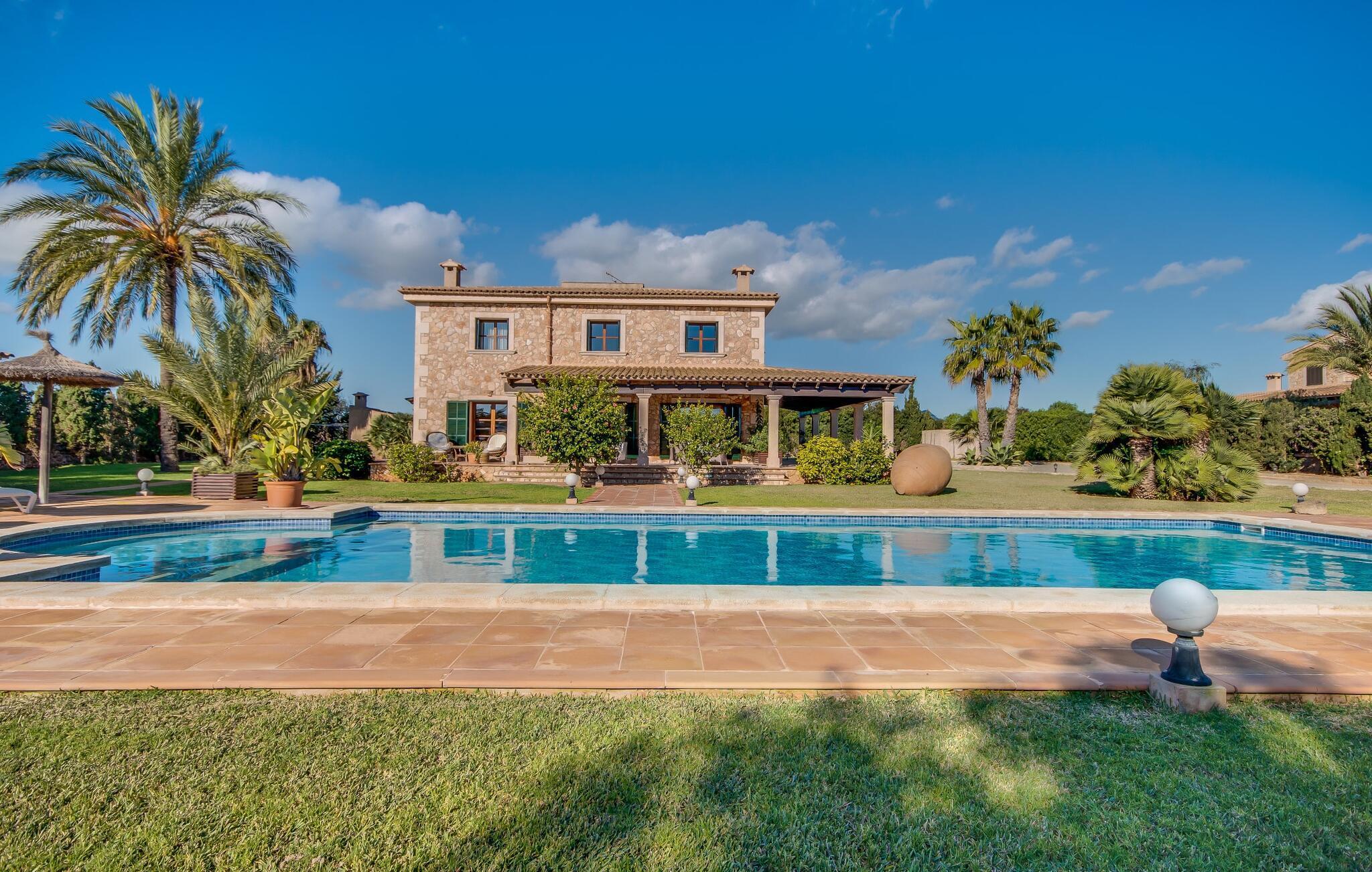 Når man ser på billederne af villaen “Mitjana” kan man ikke få nok: Stort land, palmer og cypresser mod en helårsgrøn baggrund, i det fjerne Middelhavet og midt i det hele ligger det smukke traditionelle stenbrudshus med hvide lister, trævinduer, grønne skodder og de lertagsten, der er typiske for regionen. "Mitjana" er et af de smukke, klassiske stykker af Mallora, som vi alle elsker så højt, og det er tæt på stranden. Proportionerne af komplekset er perfekt realiseret og lige ved siden af den storslåede hovedbygning med dens overdækkede terrasse og plads nok til en udendørs spiseplads er der en swimmingpool på næsten 80 m². Det meget praktiske udendørs badeværelse er integreret i udekøkkenets murstensstruktur lige ved siden af, som har to indbyggede BBQ-grill og en brændeovn. Der er en dejlig rustik atmosfære, hvor du kan afslutte dagen med at slappe af med venner og familie, mens du nyder en lækker BBQ. Du kan købe friske, sprøde produkter på markedet i Felanitx eller Santanyí. Hvis du ikke laver andet, kan du hoppe i swimmingpoolen eller teste dine færdigheder ved bordtennisbordet. Samlet set byder den omfattende have i maritim stil på mange muligheder for børn til at slippe damp og have det sjovt. Det er så enkelt som at lade dem gå. Indretningen af huset gør det ideelt for to familier af venner, der rejser sammen. I alt 350 m² boligareal er fordelt på to etager og er elegant designet og indrettet, som passer godt til husets traditionelle facade. I stueetagen, på den anden side af terrassen, er den udsøgte opholds- og spisestue med en behagelig sofa, hyggelig pejs, TV, bibliotek og klaver. Husets klassiske charme med stukafslutninger, moderne møbler af høj kvalitet, tæpper og lysekroner suppleres af integreret spotbelysning og særligt skinnende blankpolerede gulve. Det store, alsidige køkken i landlig stil med varme træskabe er meget moderne udstyret, herunder en opvaskemaskine og et amerikansk køleskab med ismaskine til kølige drikkevarer, men har også en gammeldags brændeovn. Det har også en ekstra spiseplads foran en gammel pejs. Der er også et toilet på denne etage, som er tilgængeligt for alle gæster. Det er meget rart, at alle soveværelser er på øverste etage. Dette omfatter to store soveværelser, der deler et separat opholdsområde og et tilstødende badeværelse. Yderligere tre badeværelser, hver med to enkeltsenge, deler et badeværelse med badekar - ideel til at bringe alle børn sammen, eller endda til venner eller bedsteforældre, der er med på turen. Alle værelser har aircondition og selvfølgelig opvarmet. Du har sikkert allerede fundet billederne af badeværelset bag det store soveværelse, hvor du finder et boblebad og en bruser med massagedyser. Her venter dig virkelig himmelske oplevelser - og selvfølgelig er der meget mere at udforske og opdage uden for villaen. Du kan opdage mangfoldigheden af de smukkeste Baleariske Øer, især langs den sydøstlige kyst. Udover hyggelige byer med let turisme, livlige promenader med gode restauranter og et par barer, er der også talrige strande, der er perfekte til en ferie ved vandet. Disse omfatter villaens navnebror, Cala Mitjana, men også Cala Sa Nau, Cala Petita, Cala Serena, Cala Ferrera og mange flere. Disse steder har alle imponerende fjordlignende bugter med klart vand. Den nærliggende landevej, som fører enten ind i landet eller til attraktive destinationer langs kysten, er delvist hørbar fra ejendommen, men kun når vinden er lige tilpas. Nærheden af denne motorvej betyder, at du kan nyde en landlig beliggenhed, der stadig giver nem adgang til en række ferieaktiviteter, som endda kan omfatte et besøg på den nærliggende Vall d'Or golfbane. Hvordan du slapper af og tager en pause fra hverdagens stress er op til dig - men vi hos Fincallorca gør vores bedste for at tilbyde dig det perfekte sted at gøre det, og i vores øjne er Villa “Mitjana” lige sagen. Den udsøgte naturstensvilla "Mitjana" med stor anlagt have, poolområde og rustikt udekøkken ligger kun få minutters gang fra badebugten af samme navn nær Cala D'Or. I denne charmerende lille by med sin enkle hvide arkitektur kan du shoppe eller gå en tur langs promenaden. For øens berømte markeder kan du tage til Santantyí eller længere inde i landet til Felanitx. Nyd et mangfoldigt udvalg af brede, fjordlignende badebugter, der nemt kan nås med din lejebil. Dette er et Fincallorca feriehus.