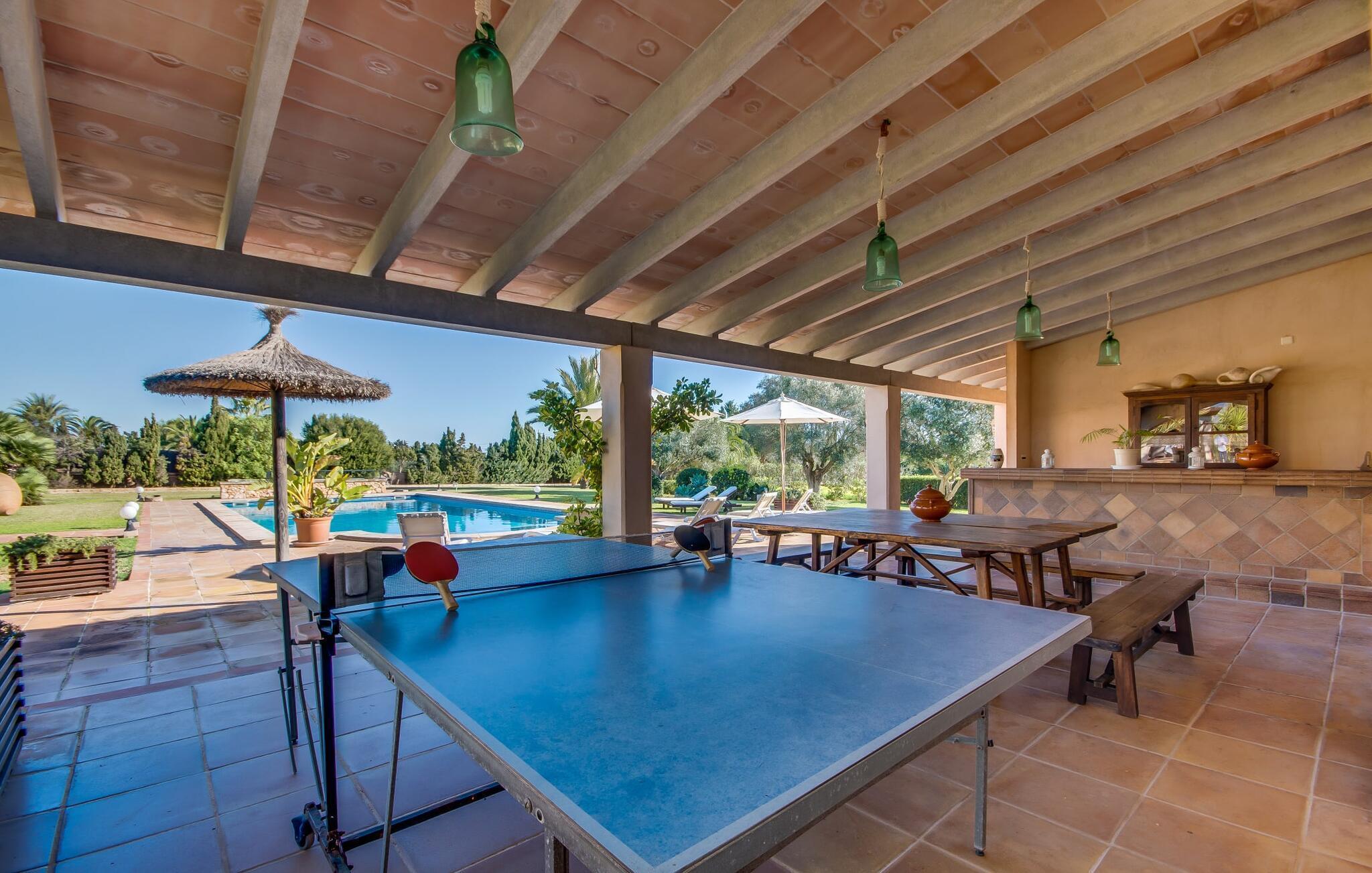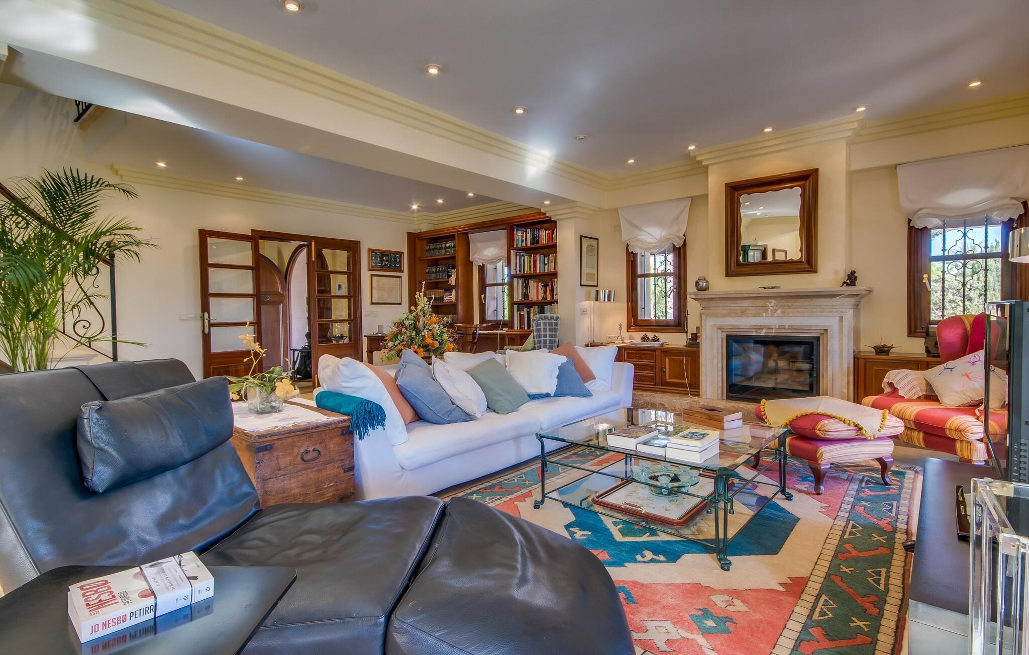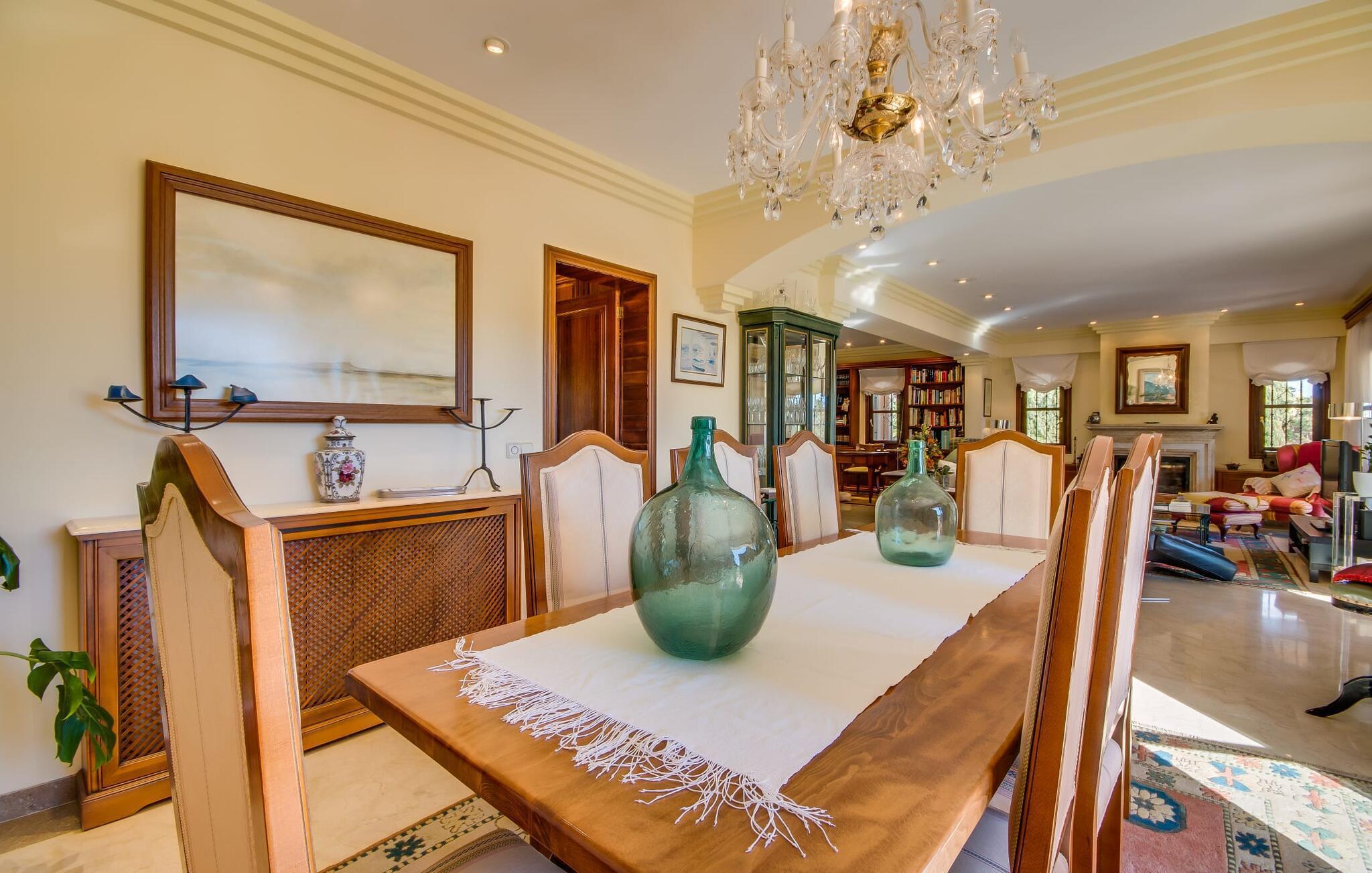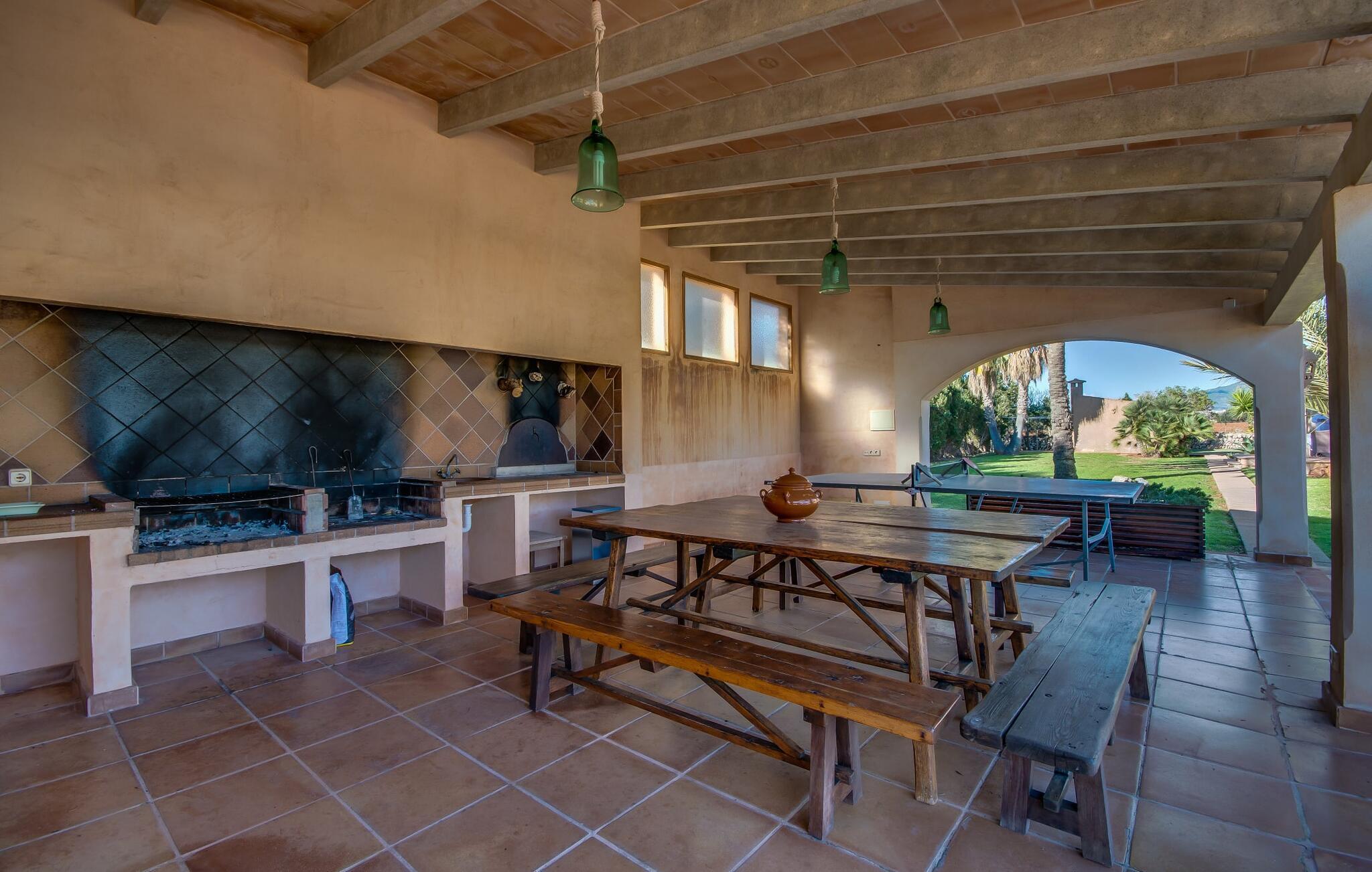 Når man ser på billederne af villaen “Mitjana” kan man ikke få nok: Stort land, palmer og cypresser mod en helårsgrøn baggrund, i det fjerne Middelhavet og midt i det hele ligger det smukke traditionelle stenbrudshus med hvide lister, trævinduer, grønne skodder og de lertagsten, der er typiske for regionen. "Mitjana" er et af de smukke, klassiske stykker af Mallora, som vi alle elsker så højt, og det er tæt på stranden. Proportionerne af komplekset er perfekt realiseret og lige ved siden af den storslåede hovedbygning med dens overdækkede terrasse og plads nok til en udendørs spiseplads er der en swimmingpool på næsten 80 m². Det meget praktiske udendørs badeværelse er integreret i udekøkkenets murstensstruktur lige ved siden af, som har to indbyggede BBQ-grill og en brændeovn. Der er en dejlig rustik atmosfære, hvor du kan afslutte dagen med at slappe af med venner og familie, mens du nyder en lækker BBQ. Du kan købe friske, sprøde produkter på markedet i Felanitx eller Santanyí. Hvis du ikke laver andet, kan du hoppe i swimmingpoolen eller teste dine færdigheder ved bordtennisbordet. Samlet set byder den omfattende have i maritim stil på mange muligheder for børn til at slippe damp og have det sjovt. Det er så enkelt som at lade dem gå. Indretningen af huset gør det ideelt for to familier af venner, der rejser sammen. I alt 350 m² boligareal er fordelt på to etager og er elegant designet og indrettet, som passer godt til husets traditionelle facade. I stueetagen, på den anden side af terrassen, er den udsøgte opholds- og spisestue med en behagelig sofa, hyggelig pejs, TV, bibliotek og klaver. Husets klassiske charme med stukafslutninger, moderne møbler af høj kvalitet, tæpper og lysekroner suppleres af integreret spotbelysning og særligt skinnende blankpolerede gulve. Det store, alsidige køkken i landlig stil med varme træskabe er meget moderne udstyret, herunder en opvaskemaskine og et amerikansk køleskab med ismaskine til kølige drikkevarer, men har også en gammeldags brændeovn. Det har også en ekstra spiseplads foran en gammel pejs. Der er også et toilet på denne etage, som er tilgængeligt for alle gæster. Det er meget rart, at alle soveværelser er på øverste etage. Dette omfatter to store soveværelser, der deler et separat opholdsområde og et tilstødende badeværelse. Yderligere tre badeværelser, hver med to enkeltsenge, deler et badeværelse med badekar - ideel til at bringe alle børn sammen, eller endda til venner eller bedsteforældre, der er med på turen. Alle værelser har aircondition og selvfølgelig opvarmet. Du har sikkert allerede fundet billederne af badeværelset bag det store soveværelse, hvor du finder et boblebad og en bruser med massagedyser. Her venter dig virkelig himmelske oplevelser - og selvfølgelig er der meget mere at udforske og opdage uden for villaen. Du kan opdage mangfoldigheden af de smukkeste Baleariske Øer, især langs den sydøstlige kyst. Udover hyggelige byer med let turisme, livlige promenader med gode restauranter og et par barer, er der også talrige strande, der er perfekte til en ferie ved vandet. Disse omfatter villaens navnebror, Cala Mitjana, men også Cala Sa Nau, Cala Petita, Cala Serena, Cala Ferrera og mange flere. Disse steder har alle imponerende fjordlignende bugter med klart vand. Den nærliggende landevej, som fører enten ind i landet eller til attraktive destinationer langs kysten, er delvist hørbar fra ejendommen, men kun når vinden er lige tilpas. Nærheden af denne motorvej betyder, at du kan nyde en landlig beliggenhed, der stadig giver nem adgang til en række ferieaktiviteter, som endda kan omfatte et besøg på den nærliggende Vall d'Or golfbane. Hvordan du slapper af og tager en pause fra hverdagens stress er op til dig - men vi hos Fincallorca gør vores bedste for at tilbyde dig det perfekte sted at gøre det, og i vores øjne er Villa “Mitjana” lige sagen. Den udsøgte naturstensvilla "Mitjana" med stor anlagt have, poolområde og rustikt udekøkken ligger kun få minutters gang fra badebugten af samme navn nær Cala D'Or. I denne charmerende lille by med sin enkle hvide arkitektur kan du shoppe eller gå en tur langs promenaden. For øens berømte markeder kan du tage til Santantyí eller længere inde i landet til Felanitx. Nyd et mangfoldigt udvalg af brede, fjordlignende badebugter, der nemt kan nås med din lejebil. Dette er et Fincallorca feriehus.
