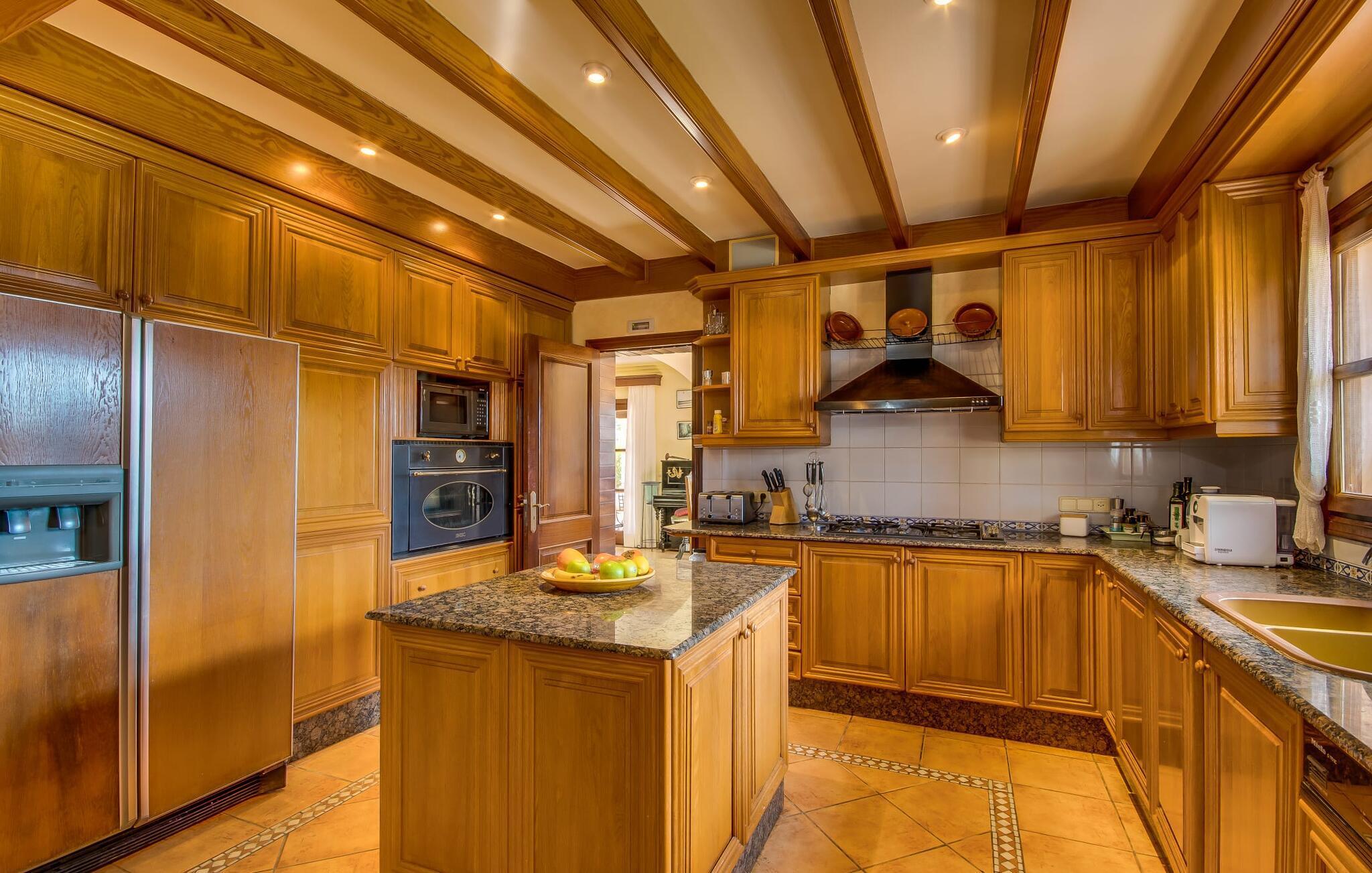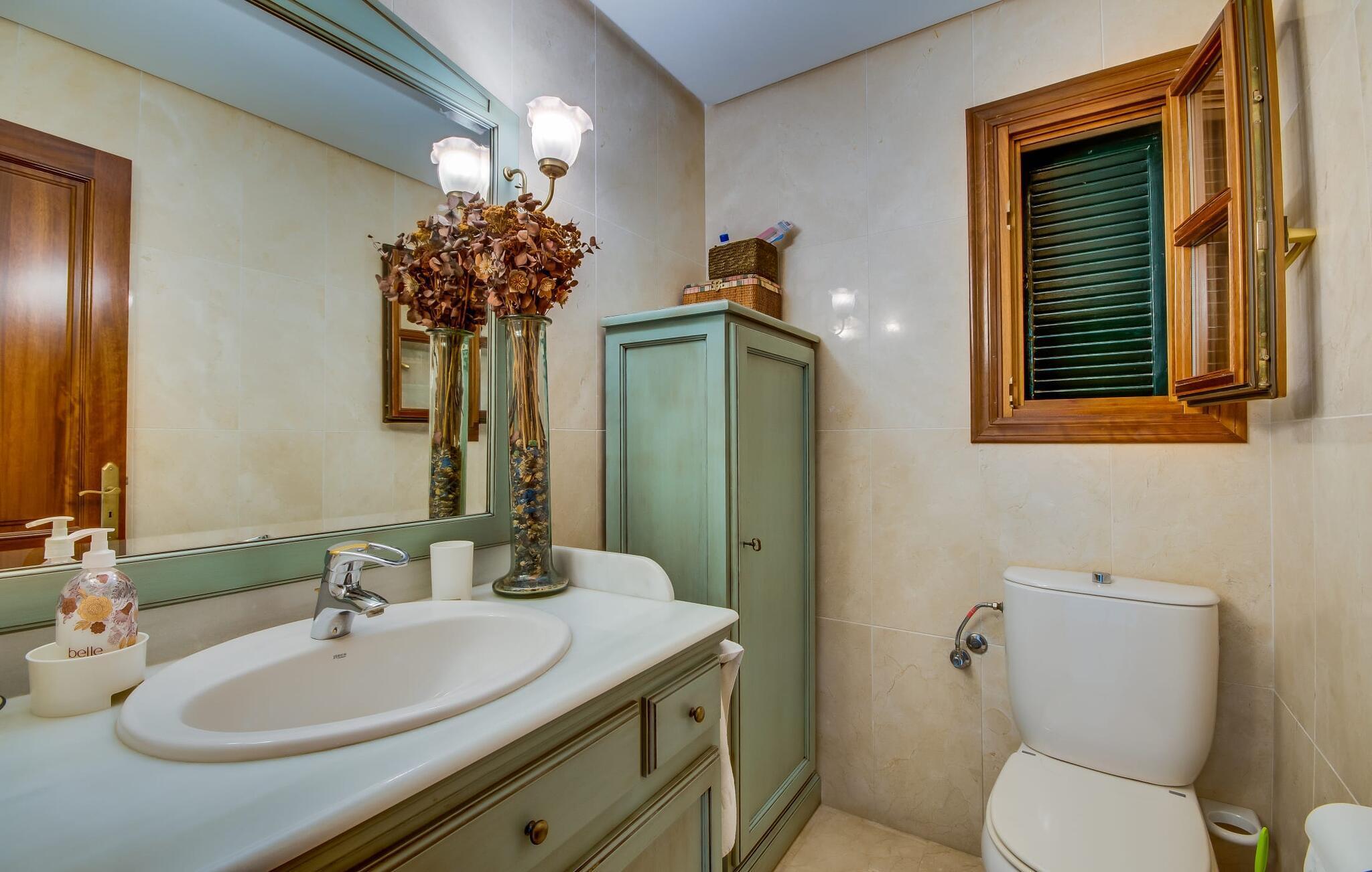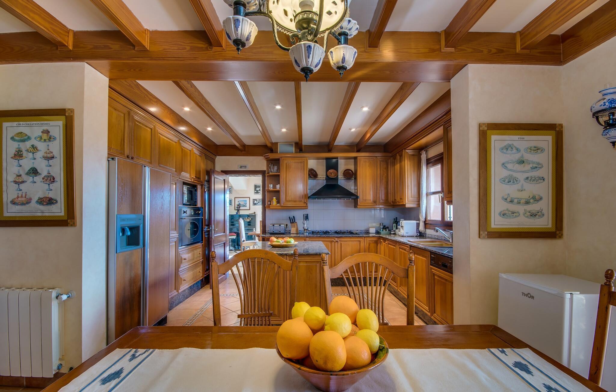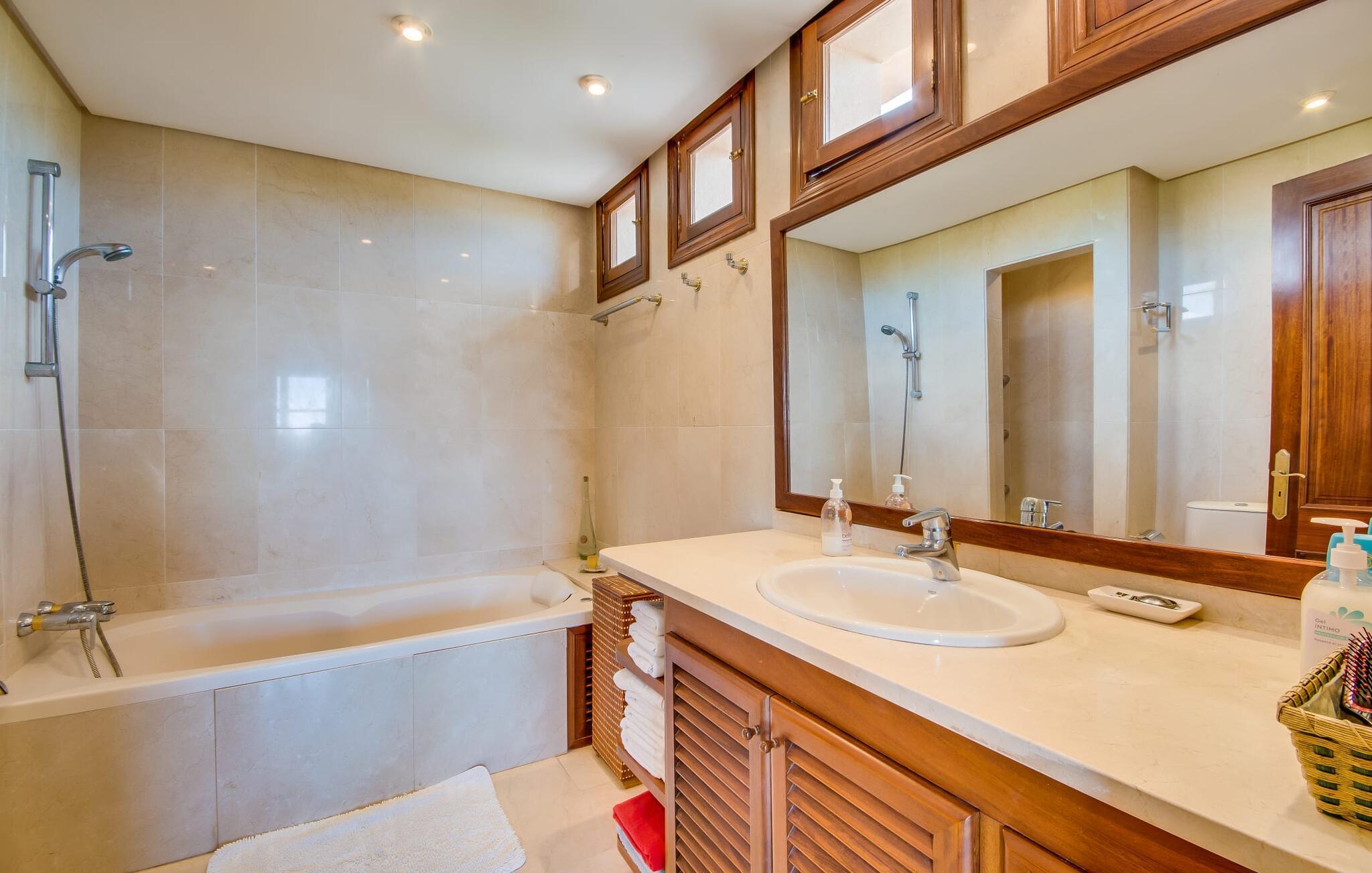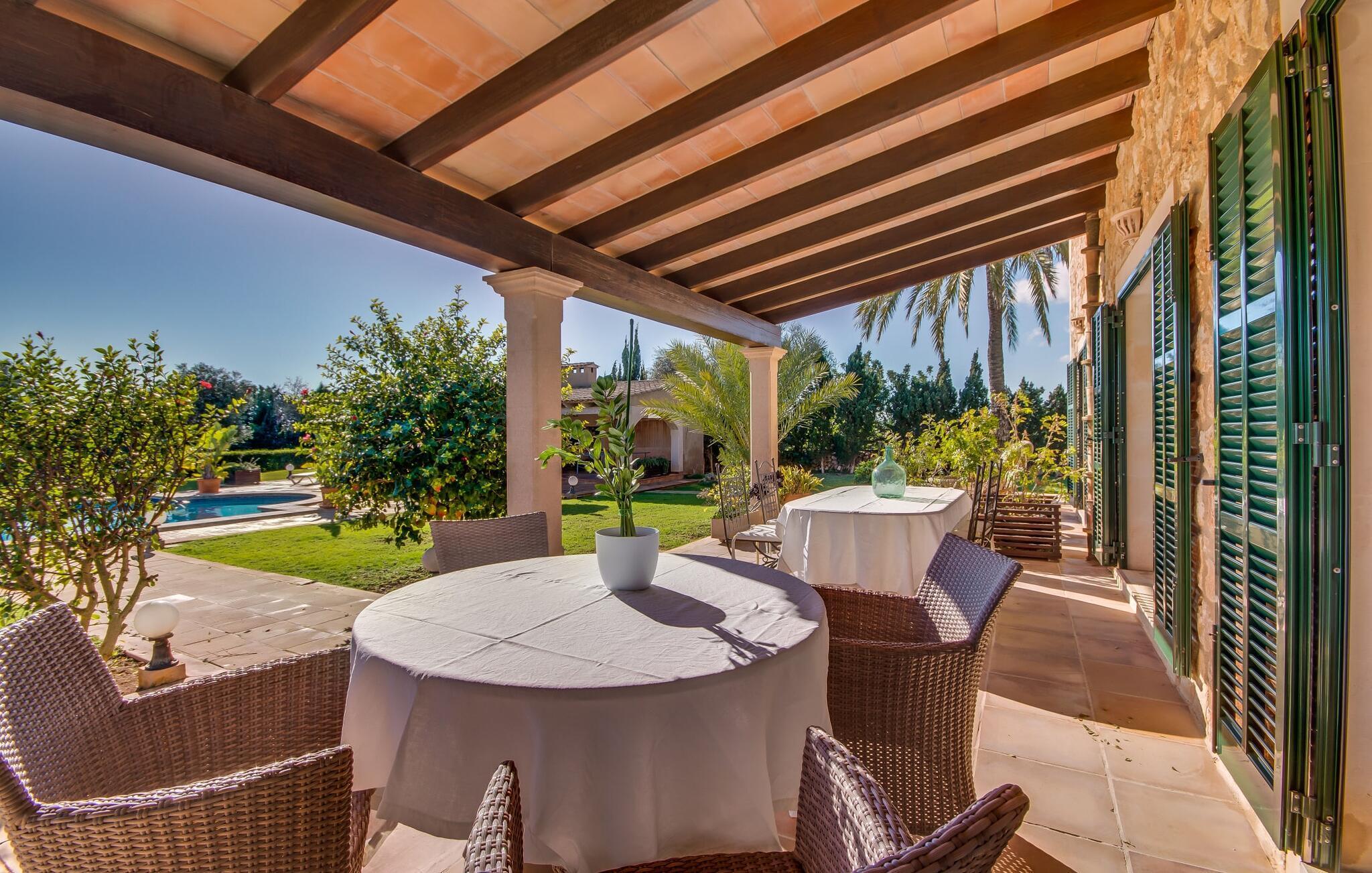 Når man ser på billederne af villaen “Mitjana” kan man ikke få nok: Stort land, palmer og cypresser mod en helårsgrøn baggrund, i det fjerne Middelhavet og midt i det hele ligger det smukke traditionelle stenbrudshus med hvide lister, trævinduer, grønne skodder og de lertagsten, der er typiske for regionen. "Mitjana" er et af de smukke, klassiske stykker af Mallora, som vi alle elsker så højt, og det er tæt på stranden. Proportionerne af komplekset er perfekt realiseret og lige ved siden af den storslåede hovedbygning med dens overdækkede terrasse og plads nok til en udendørs spiseplads er der en swimmingpool på næsten 80 m². Det meget praktiske udendørs badeværelse er integreret i udekøkkenets murstensstruktur lige ved siden af, som har to indbyggede BBQ-grill og en brændeovn. Der er en dejlig rustik atmosfære, hvor du kan afslutte dagen med at slappe af med venner og familie, mens du nyder en lækker BBQ. Du kan købe friske, sprøde produkter på markedet i Felanitx eller Santanyí. Hvis du ikke laver andet, kan du hoppe i swimmingpoolen eller teste dine færdigheder ved bordtennisbordet. Samlet set byder den omfattende have i maritim stil på mange muligheder for børn til at slippe damp og have det sjovt. Det er så enkelt som at lade dem gå. Indretningen af huset gør det ideelt for to familier af venner, der rejser sammen. I alt 350 m² boligareal er fordelt på to etager og er elegant designet og indrettet, som passer godt til husets traditionelle facade. I stueetagen, på den anden side af terrassen, er den udsøgte opholds- og spisestue med en behagelig sofa, hyggelig pejs, TV, bibliotek og klaver. Husets klassiske charme med stukafslutninger, moderne møbler af høj kvalitet, tæpper og lysekroner suppleres af integreret spotbelysning og særligt skinnende blankpolerede gulve. Det store, alsidige køkken i landlig stil med varme træskabe er meget moderne udstyret, herunder en opvaskemaskine og et amerikansk køleskab med ismaskine til kølige drikkevarer, men har også en gammeldags brændeovn. Det har også en ekstra spiseplads foran en gammel pejs. Der er også et toilet på denne etage, som er tilgængeligt for alle gæster. Det er meget rart, at alle soveværelser er på øverste etage. Dette omfatter to store soveværelser, der deler et separat opholdsområde og et tilstødende badeværelse. Yderligere tre badeværelser, hver med to enkeltsenge, deler et badeværelse med badekar - ideel til at bringe alle børn sammen, eller endda til venner eller bedsteforældre, der er med på turen. Alle værelser har aircondition og selvfølgelig opvarmet. Du har sikkert allerede fundet billederne af badeværelset bag det store soveværelse, hvor du finder et boblebad og en bruser med massagedyser. Her venter dig virkelig himmelske oplevelser - og selvfølgelig er der meget mere at udforske og opdage uden for villaen. Du kan opdage mangfoldigheden af de smukkeste Baleariske Øer, især langs den sydøstlige kyst. Udover hyggelige byer med let turisme, livlige promenader med gode restauranter og et par barer, er der også talrige strande, der er perfekte til en ferie ved vandet. Disse omfatter villaens navnebror, Cala Mitjana, men også Cala Sa Nau, Cala Petita, Cala Serena, Cala Ferrera og mange flere. Disse steder har alle imponerende fjordlignende bugter med klart vand. Den nærliggende landevej, som fører enten ind i landet eller til attraktive destinationer langs kysten, er delvist hørbar fra ejendommen, men kun når vinden er lige tilpas. Nærheden af denne motorvej betyder, at du kan nyde en landlig beliggenhed, der stadig giver nem adgang til en række ferieaktiviteter, som endda kan omfatte et besøg på den nærliggende Vall d'Or golfbane. Hvordan du slapper af og tager en pause fra hverdagens stress er op til dig - men vi hos Fincallorca gør vores bedste for at tilbyde dig det perfekte sted at gøre det, og i vores øjne er Villa “Mitjana” lige sagen. Den udsøgte naturstensvilla "Mitjana" med stor anlagt have, poolområde og rustikt udekøkken ligger kun få minutters gang fra badebugten af samme navn nær Cala D'Or. I denne charmerende lille by med sin enkle hvide arkitektur kan du shoppe eller gå en tur langs promenaden. For øens berømte markeder kan du tage til Santantyí eller længere inde i landet til Felanitx. Nyd et mangfoldigt udvalg af brede, fjordlignende badebugter, der nemt kan nås med din lejebil. Dette er et Fincallorca feriehus.