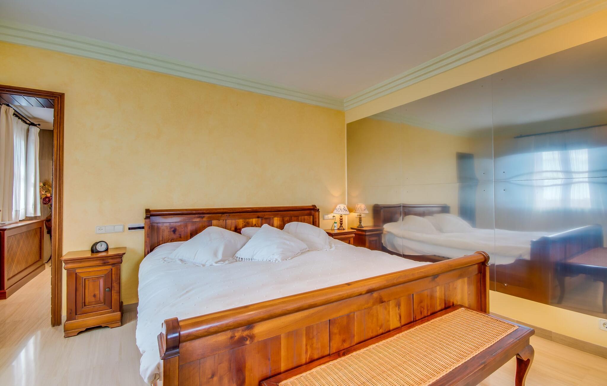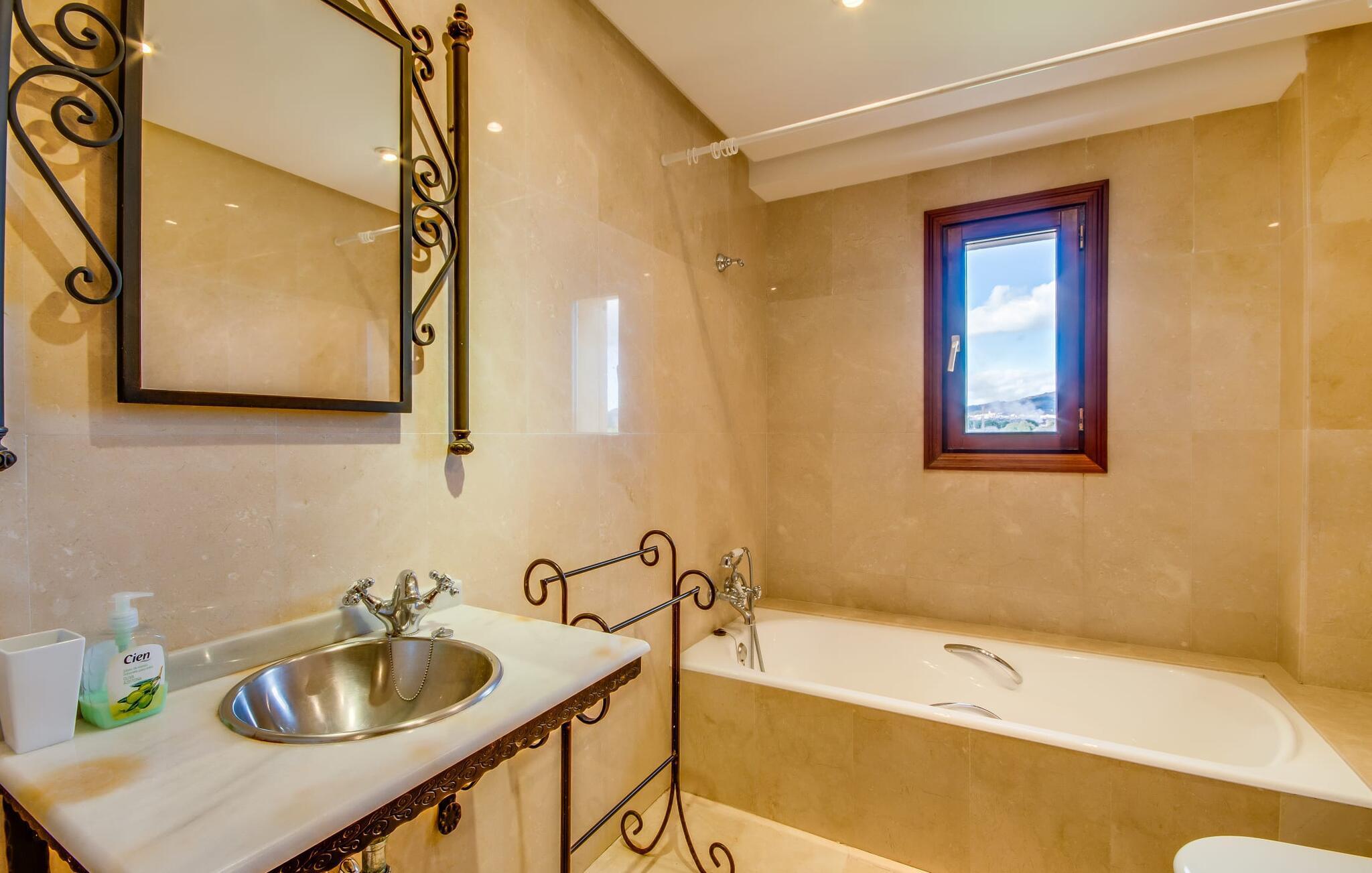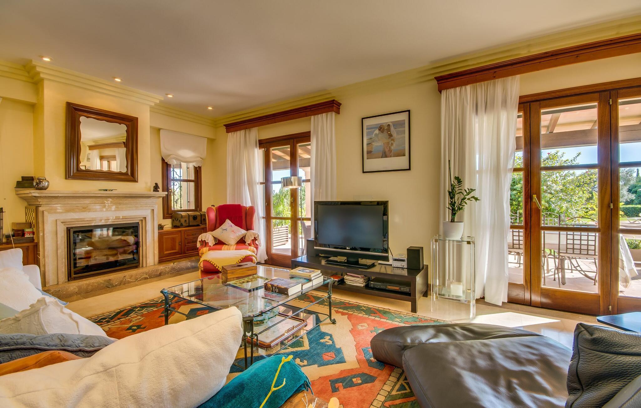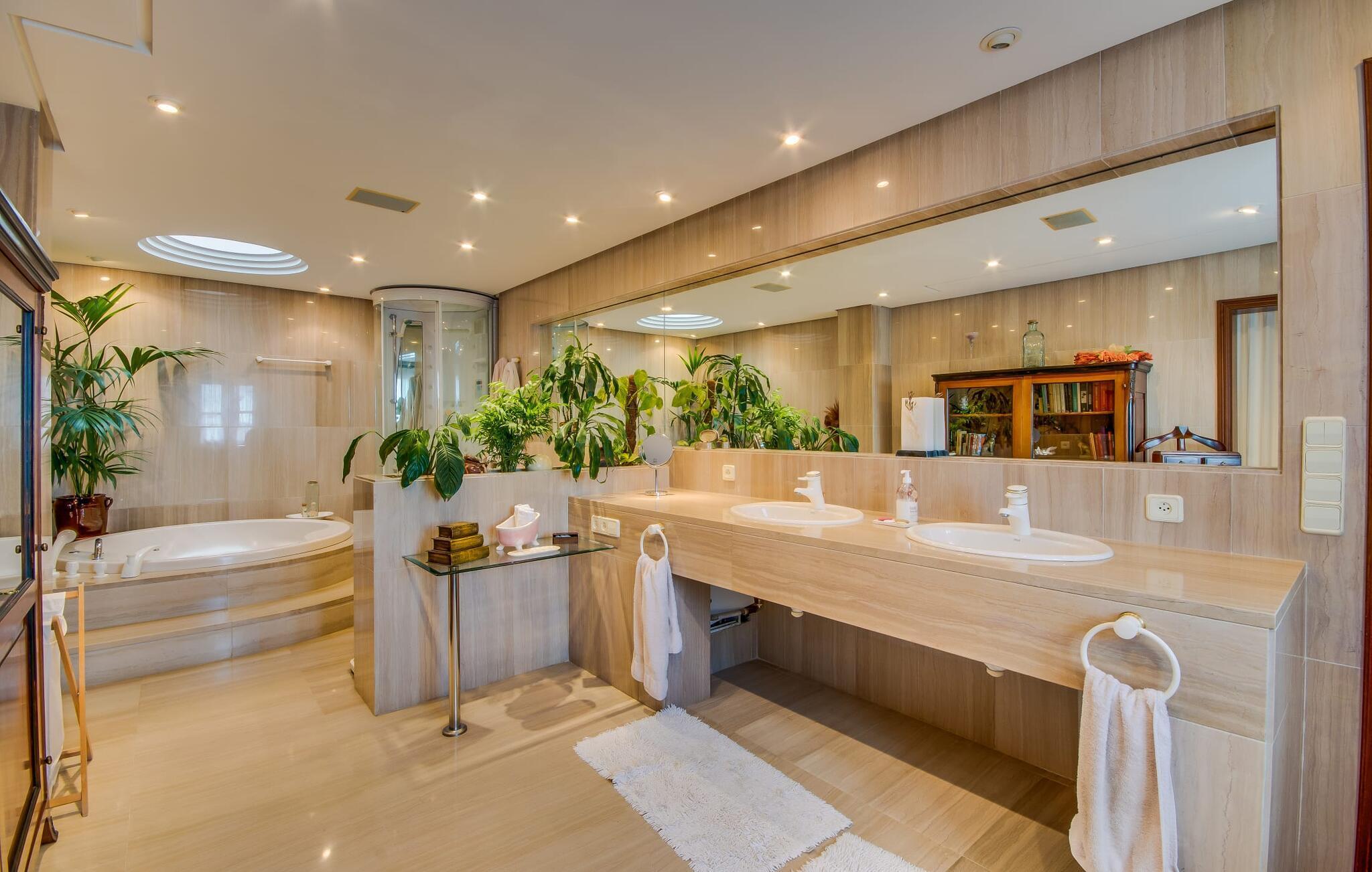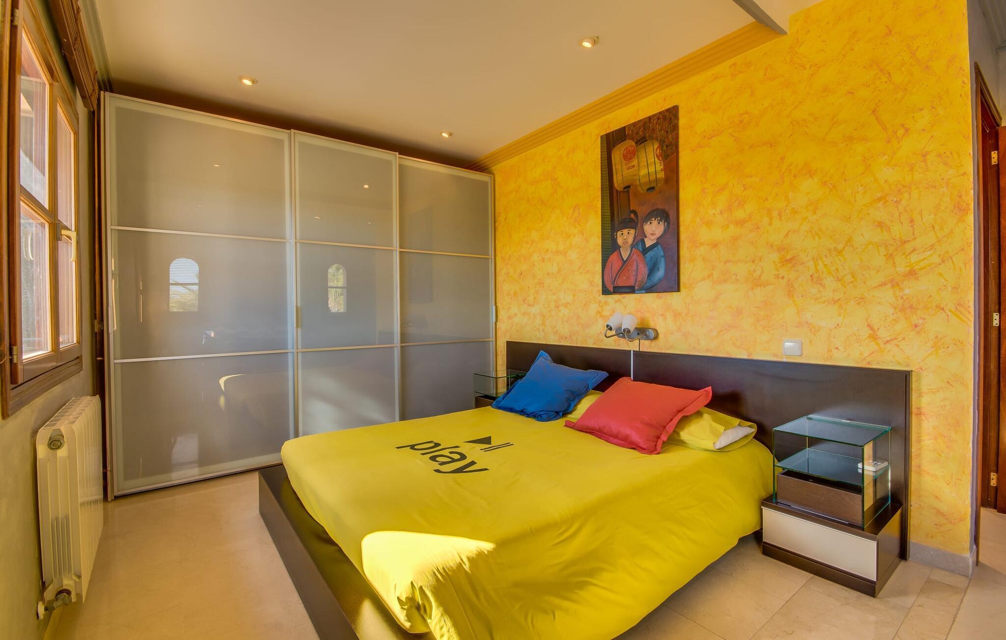 Når man ser på billederne af villaen “Mitjana” kan man ikke få nok: Stort land, palmer og cypresser mod en helårsgrøn baggrund, i det fjerne Middelhavet og midt i det hele ligger det smukke traditionelle stenbrudshus med hvide lister, trævinduer, grønne skodder og de lertagsten, der er typiske for regionen. "Mitjana" er et af de smukke, klassiske stykker af Mallora, som vi alle elsker så højt, og det er tæt på stranden. Proportionerne af komplekset er perfekt realiseret og lige ved siden af den storslåede hovedbygning med dens overdækkede terrasse og plads nok til en udendørs spiseplads er der en swimmingpool på næsten 80 m². Det meget praktiske udendørs badeværelse er integreret i udekøkkenets murstensstruktur lige ved siden af, som har to indbyggede BBQ-grill og en brændeovn. Der er en dejlig rustik atmosfære, hvor du kan afslutte dagen med at slappe af med venner og familie, mens du nyder en lækker BBQ. Du kan købe friske, sprøde produkter på markedet i Felanitx eller Santanyí. Hvis du ikke laver andet, kan du hoppe i swimmingpoolen eller teste dine færdigheder ved bordtennisbordet. Samlet set byder den omfattende have i maritim stil på mange muligheder for børn til at slippe damp og have det sjovt. Det er så enkelt som at lade dem gå. Indretningen af huset gør det ideelt for to familier af venner, der rejser sammen. I alt 350 m² boligareal er fordelt på to etager og er elegant designet og indrettet, som passer godt til husets traditionelle facade. I stueetagen, på den anden side af terrassen, er den udsøgte opholds- og spisestue med en behagelig sofa, hyggelig pejs, TV, bibliotek og klaver. Husets klassiske charme med stukafslutninger, moderne møbler af høj kvalitet, tæpper og lysekroner suppleres af integreret spotbelysning og særligt skinnende blankpolerede gulve. Det store, alsidige køkken i landlig stil med varme træskabe er meget moderne udstyret, herunder en opvaskemaskine og et amerikansk køleskab med ismaskine til kølige drikkevarer, men har også en gammeldags brændeovn. Det har også en ekstra spiseplads foran en gammel pejs. Der er også et toilet på denne etage, som er tilgængeligt for alle gæster. Det er meget rart, at alle soveværelser er på øverste etage. Dette omfatter to store soveværelser, der deler et separat opholdsområde og et tilstødende badeværelse. Yderligere tre badeværelser, hver med to enkeltsenge, deler et badeværelse med badekar - ideel til at bringe alle børn sammen, eller endda til venner eller bedsteforældre, der er med på turen. Alle værelser har aircondition og selvfølgelig opvarmet. Du har sikkert allerede fundet billederne af badeværelset bag det store soveværelse, hvor du finder et boblebad og en bruser med massagedyser. Her venter dig virkelig himmelske oplevelser - og selvfølgelig er der meget mere at udforske og opdage uden for villaen. Du kan opdage mangfoldigheden af de smukkeste Baleariske Øer, især langs den sydøstlige kyst. Udover hyggelige byer med let turisme, livlige promenader med gode restauranter og et par barer, er der også talrige strande, der er perfekte til en ferie ved vandet. Disse omfatter villaens navnebror, Cala Mitjana, men også Cala Sa Nau, Cala Petita, Cala Serena, Cala Ferrera og mange flere. Disse steder har alle imponerende fjordlignende bugter med klart vand. Den nærliggende landevej, som fører enten ind i landet eller til attraktive destinationer langs kysten, er delvist hørbar fra ejendommen, men kun når vinden er lige tilpas. Nærheden af denne motorvej betyder, at du kan nyde en landlig beliggenhed, der stadig giver nem adgang til en række ferieaktiviteter, som endda kan omfatte et besøg på den nærliggende Vall d'Or golfbane. Hvordan du slapper af og tager en pause fra hverdagens stress er op til dig - men vi hos Fincallorca gør vores bedste for at tilbyde dig det perfekte sted at gøre det, og i vores øjne er Villa “Mitjana” lige sagen. Den udsøgte naturstensvilla "Mitjana" med stor anlagt have, poolområde og rustikt udekøkken ligger kun få minutters gang fra badebugten af samme navn nær Cala D'Or. I denne charmerende lille by med sin enkle hvide arkitektur kan du shoppe eller gå en tur langs promenaden. For øens berømte markeder kan du tage til Santantyí eller længere inde i landet til Felanitx. Nyd et mangfoldigt udvalg af brede, fjordlignende badebugter, der nemt kan nås med din lejebil. Dette er et Fincallorca feriehus.