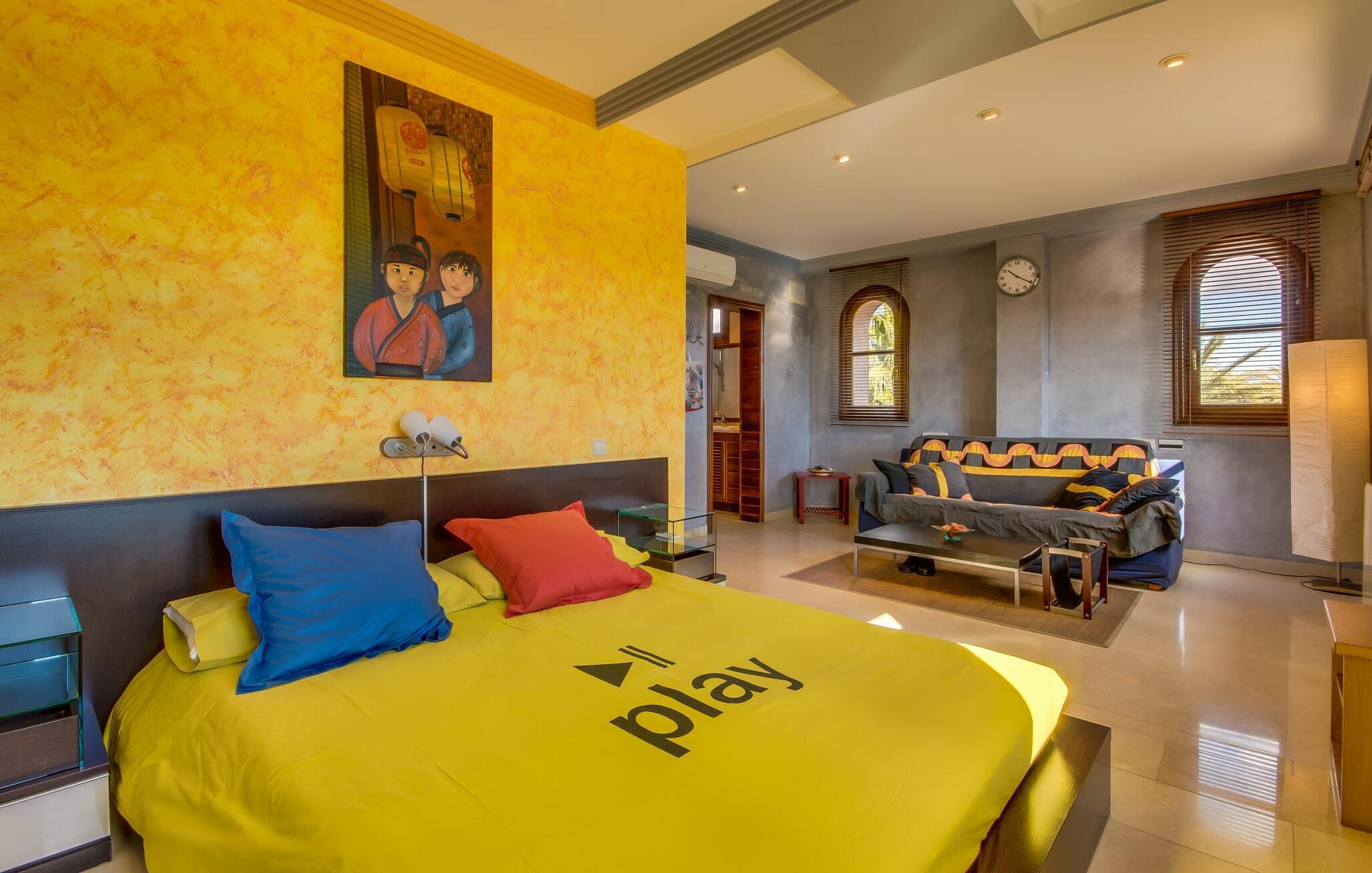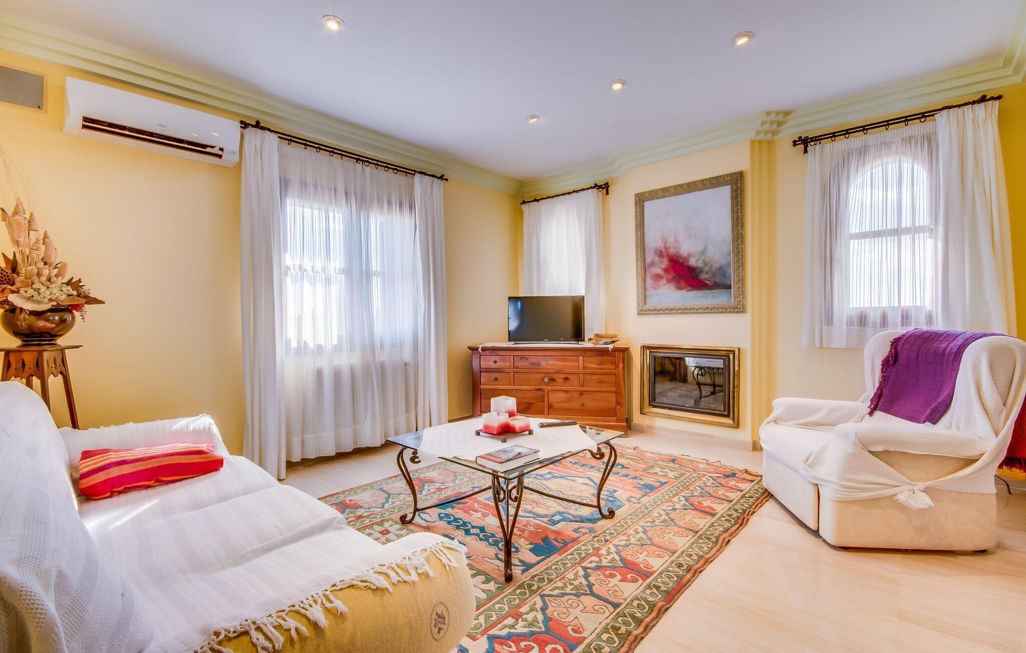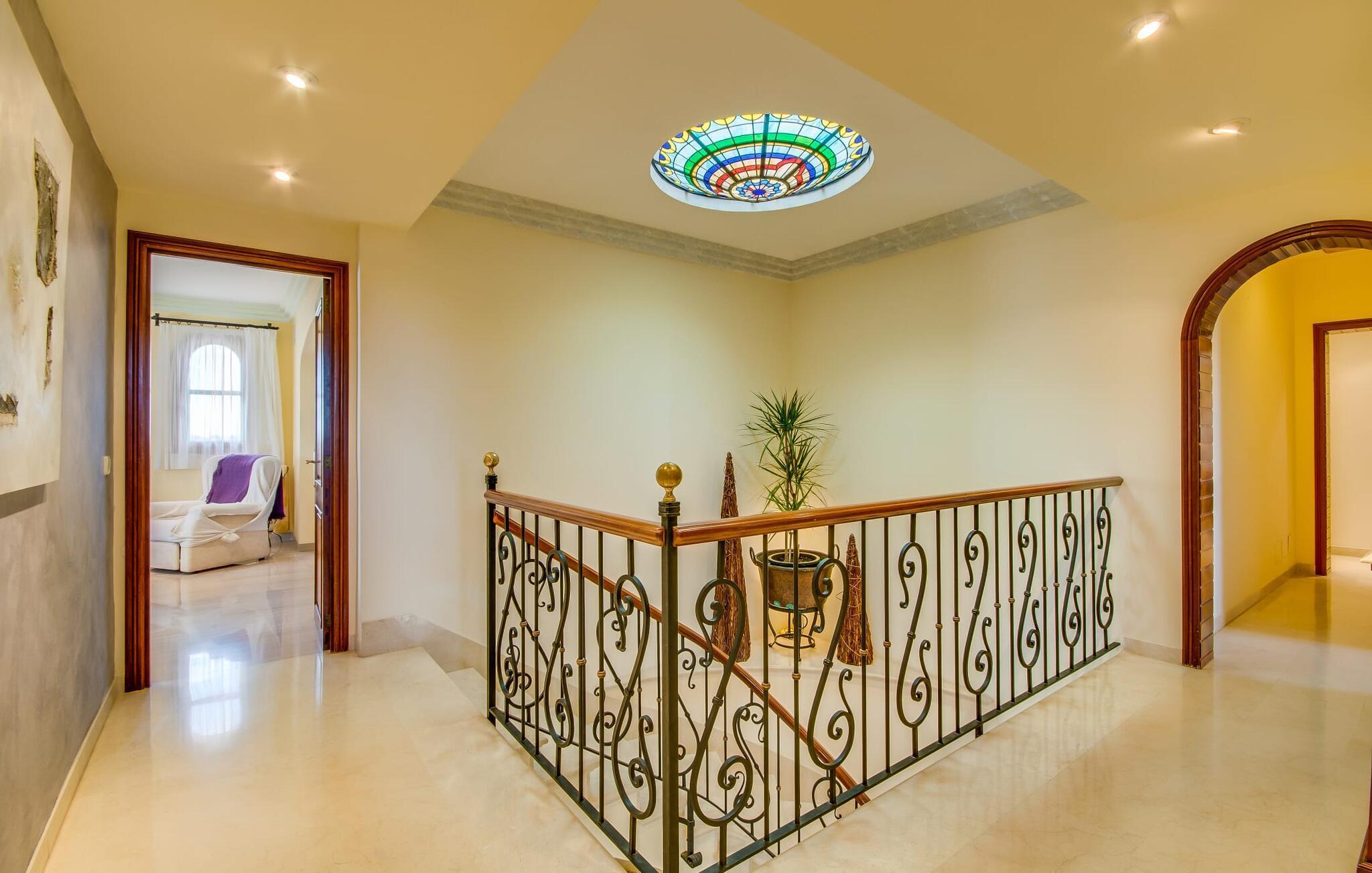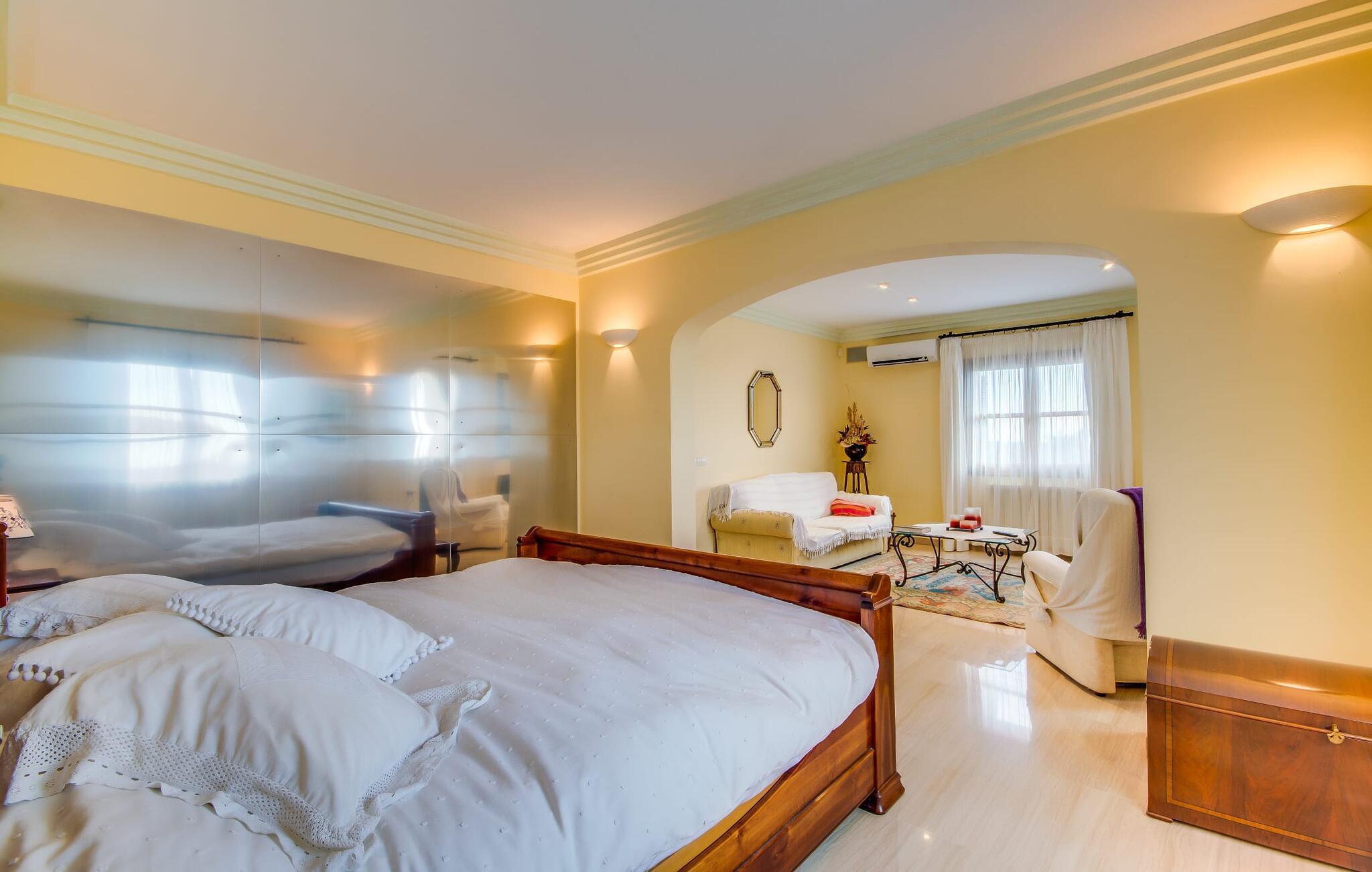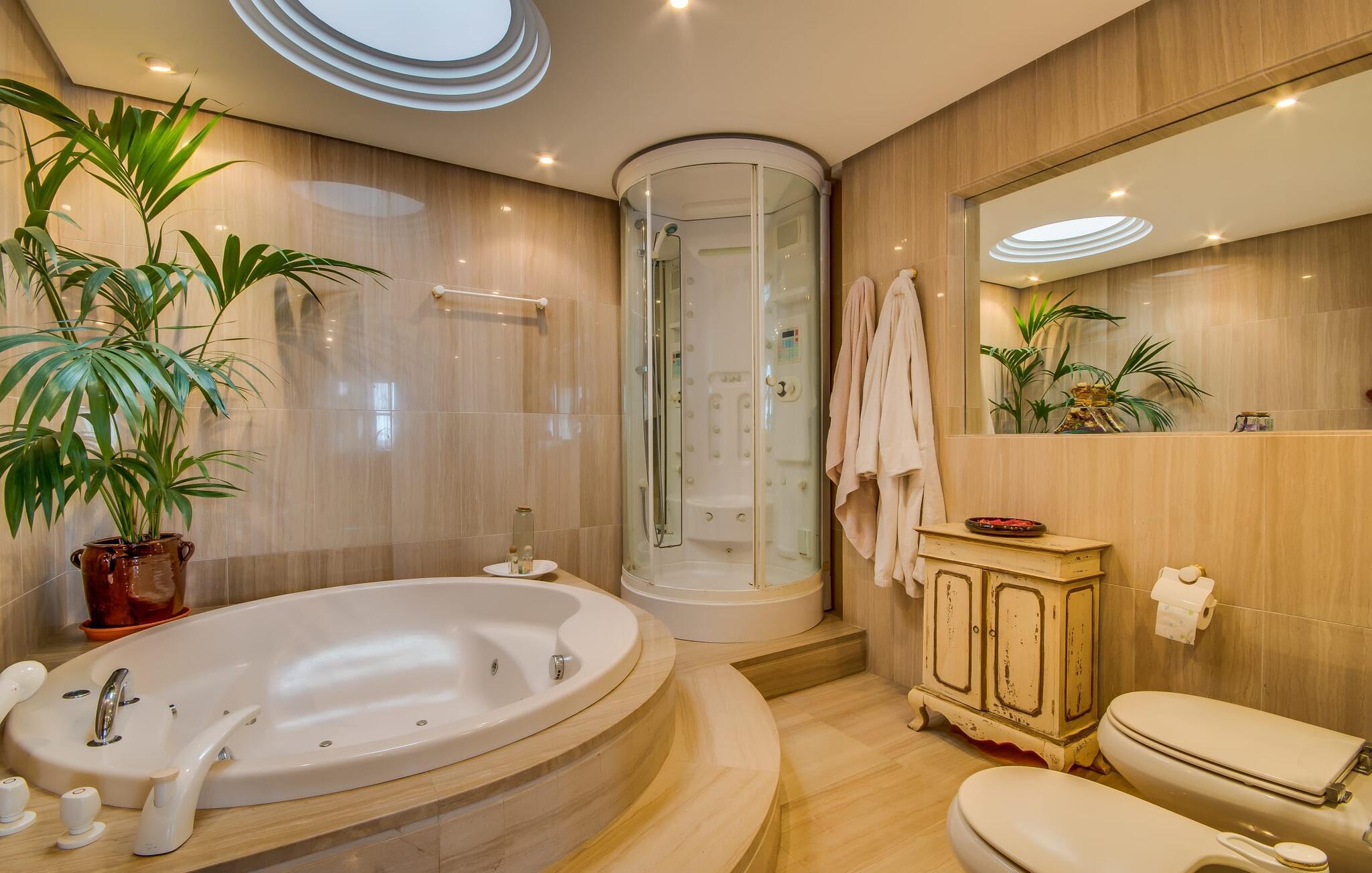 Når man ser på billederne af villaen “Mitjana” kan man ikke få nok: Stort land, palmer og cypresser mod en helårsgrøn baggrund, i det fjerne Middelhavet og midt i det hele ligger det smukke traditionelle stenbrudshus med hvide lister, trævinduer, grønne skodder og de lertagsten, der er typiske for regionen. "Mitjana" er et af de smukke, klassiske stykker af Mallora, som vi alle elsker så højt, og det er tæt på stranden. Proportionerne af komplekset er perfekt realiseret og lige ved siden af den storslåede hovedbygning med dens overdækkede terrasse og plads nok til en udendørs spiseplads er der en swimmingpool på næsten 80 m². Det meget praktiske udendørs badeværelse er integreret i udekøkkenets murstensstruktur lige ved siden af, som har to indbyggede BBQ-grill og en brændeovn. Der er en dejlig rustik atmosfære, hvor du kan afslutte dagen med at slappe af med venner og familie, mens du nyder en lækker BBQ. Du kan købe friske, sprøde produkter på markedet i Felanitx eller Santanyí. Hvis du ikke laver andet, kan du hoppe i swimmingpoolen eller teste dine færdigheder ved bordtennisbordet. Samlet set byder den omfattende have i maritim stil på mange muligheder for børn til at slippe damp og have det sjovt. Det er så enkelt som at lade dem gå. Indretningen af huset gør det ideelt for to familier af venner, der rejser sammen. I alt 350 m² boligareal er fordelt på to etager og er elegant designet og indrettet, som passer godt til husets traditionelle facade. I stueetagen, på den anden side af terrassen, er den udsøgte opholds- og spisestue med en behagelig sofa, hyggelig pejs, TV, bibliotek og klaver. Husets klassiske charme med stukafslutninger, moderne møbler af høj kvalitet, tæpper og lysekroner suppleres af integreret spotbelysning og særligt skinnende blankpolerede gulve. Det store, alsidige køkken i landlig stil med varme træskabe er meget moderne udstyret, herunder en opvaskemaskine og et amerikansk køleskab med ismaskine til kølige drikkevarer, men har også en gammeldags brændeovn. Det har også en ekstra spiseplads foran en gammel pejs. Der er også et toilet på denne etage, som er tilgængeligt for alle gæster. Det er meget rart, at alle soveværelser er på øverste etage. Dette omfatter to store soveværelser, der deler et separat opholdsområde og et tilstødende badeværelse. Yderligere tre badeværelser, hver med to enkeltsenge, deler et badeværelse med badekar - ideel til at bringe alle børn sammen, eller endda til venner eller bedsteforældre, der er med på turen. Alle værelser har aircondition og selvfølgelig opvarmet. Du har sikkert allerede fundet billederne af badeværelset bag det store soveværelse, hvor du finder et boblebad og en bruser med massagedyser. Her venter dig virkelig himmelske oplevelser - og selvfølgelig er der meget mere at udforske og opdage uden for villaen. Du kan opdage mangfoldigheden af de smukkeste Baleariske Øer, især langs den sydøstlige kyst. Udover hyggelige byer med let turisme, livlige promenader med gode restauranter og et par barer, er der også talrige strande, der er perfekte til en ferie ved vandet. Disse omfatter villaens navnebror, Cala Mitjana, men også Cala Sa Nau, Cala Petita, Cala Serena, Cala Ferrera og mange flere. Disse steder har alle imponerende fjordlignende bugter med klart vand. Den nærliggende landevej, som fører enten ind i landet eller til attraktive destinationer langs kysten, er delvist hørbar fra ejendommen, men kun når vinden er lige tilpas. Nærheden af denne motorvej betyder, at du kan nyde en landlig beliggenhed, der stadig giver nem adgang til en række ferieaktiviteter, som endda kan omfatte et besøg på den nærliggende Vall d'Or golfbane. Hvordan du slapper af og tager en pause fra hverdagens stress er op til dig - men vi hos Fincallorca gør vores bedste for at tilbyde dig det perfekte sted at gøre det, og i vores øjne er Villa “Mitjana” lige sagen. Den udsøgte naturstensvilla "Mitjana" med stor anlagt have, poolområde og rustikt udekøkken ligger kun få minutters gang fra badebugten af samme navn nær Cala D'Or. I denne charmerende lille by med sin enkle hvide arkitektur kan du shoppe eller gå en tur langs promenaden. For øens berømte markeder kan du tage til Santantyí eller længere inde i landet til Felanitx. Nyd et mangfoldigt udvalg af brede, fjordlignende badebugter, der nemt kan nås med din lejebil. Dette er et Fincallorca feriehus.