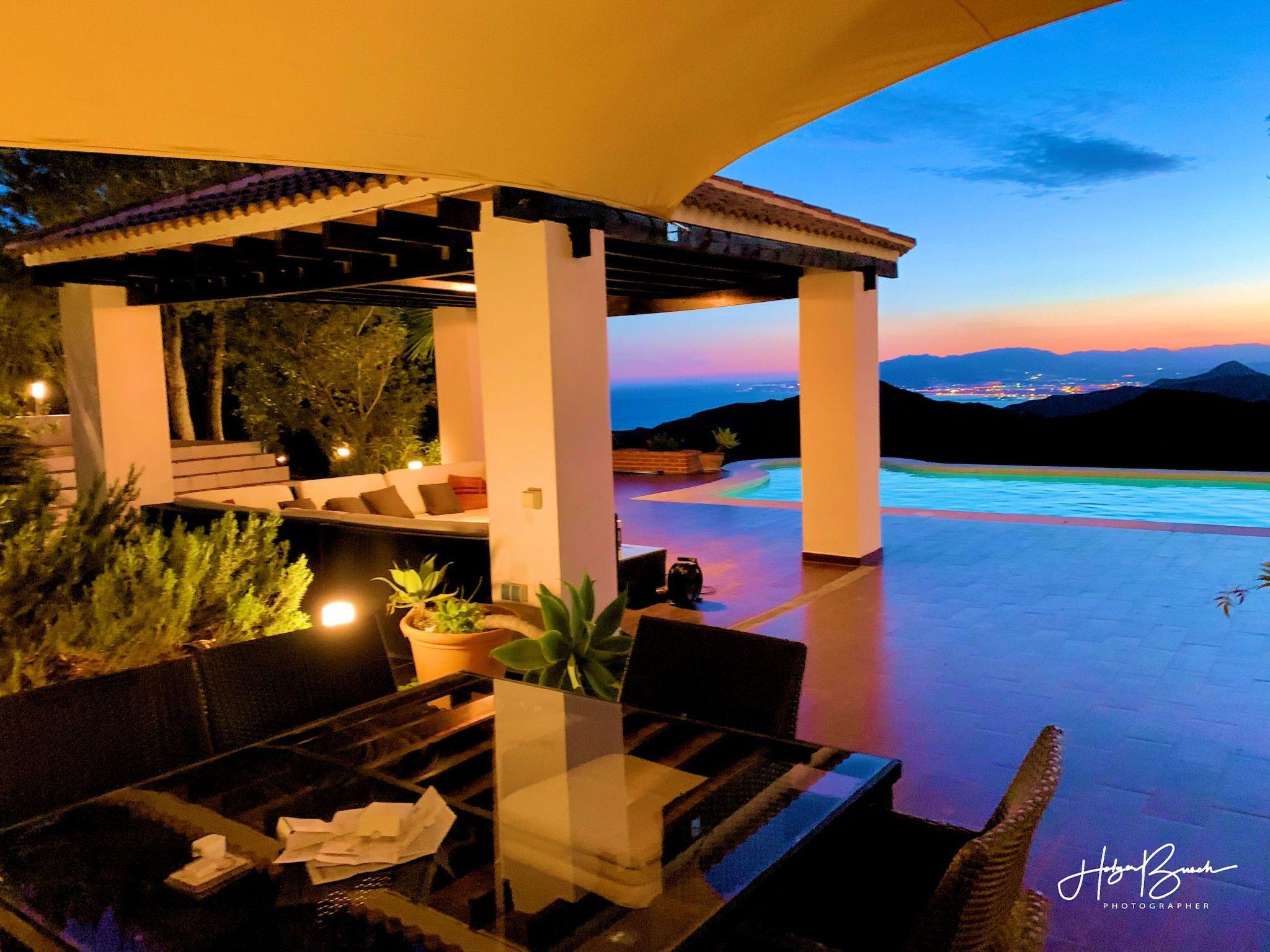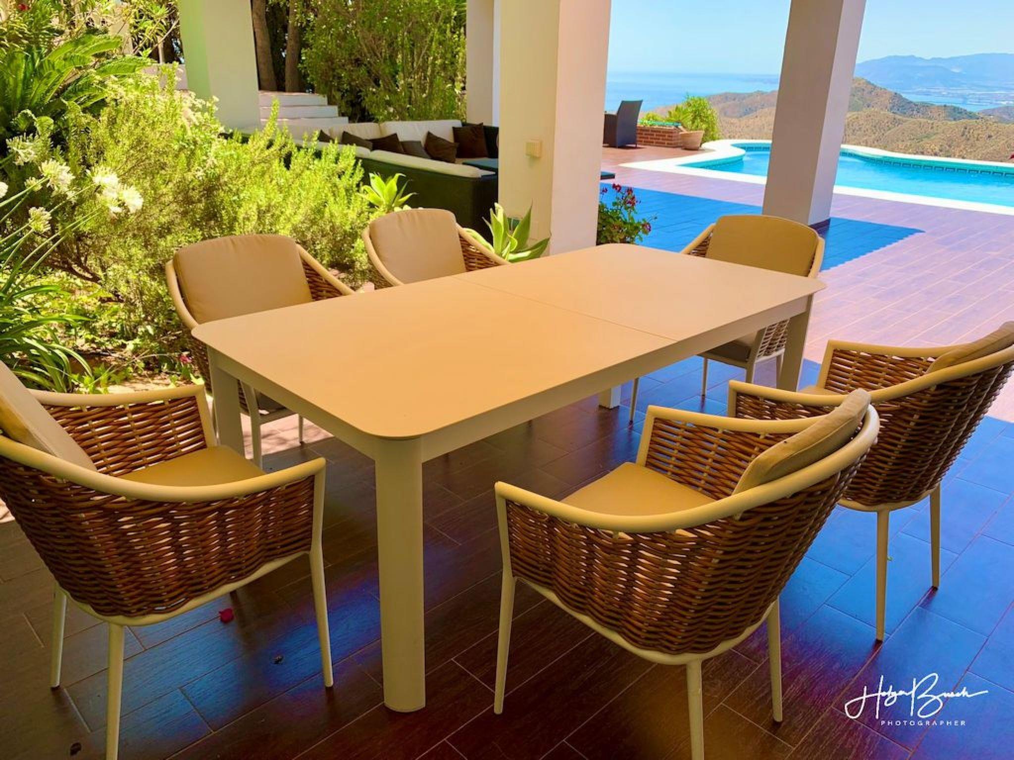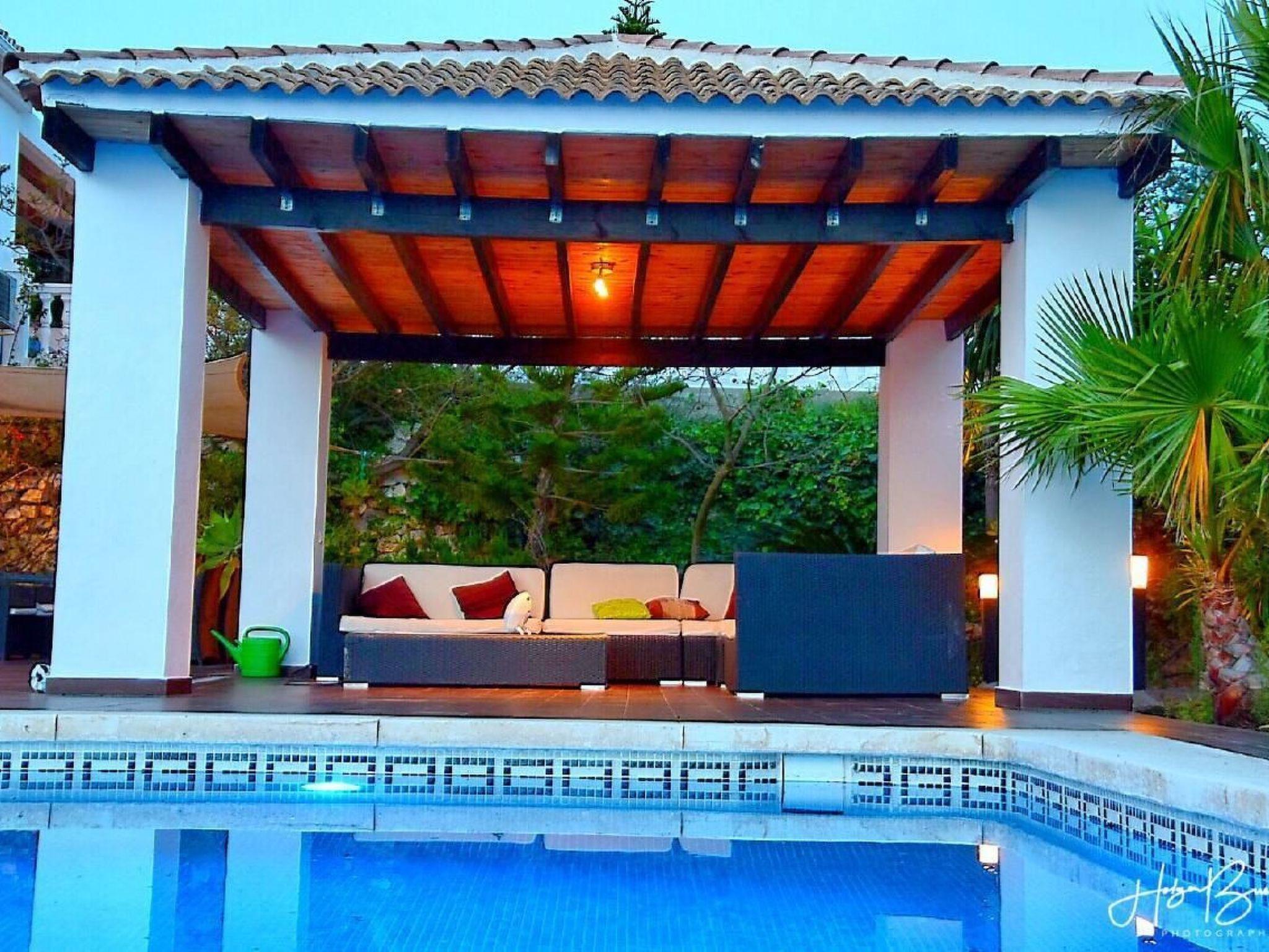 The outdoor area of the villa unfolds in all its splendour on a plot of 8500 m², the upper part of which is fenced and includes a terrace of approx. 200 m² between the house and the pool. From here there is an incomparable view of the lights of Málaga or cruise ships entering the harbour. Equipped with a large lounge sofa, a dining table for 8 people, sun loungers and a barbecue, as well as additional sun protection provided by a pergola and an awning for the dining area, nothing stands in the way of cosy hours under the Spanish sun. The heated pool has an interesting shape with an integrated bench and allows you to sit in the water and enjoy the spectacular view.