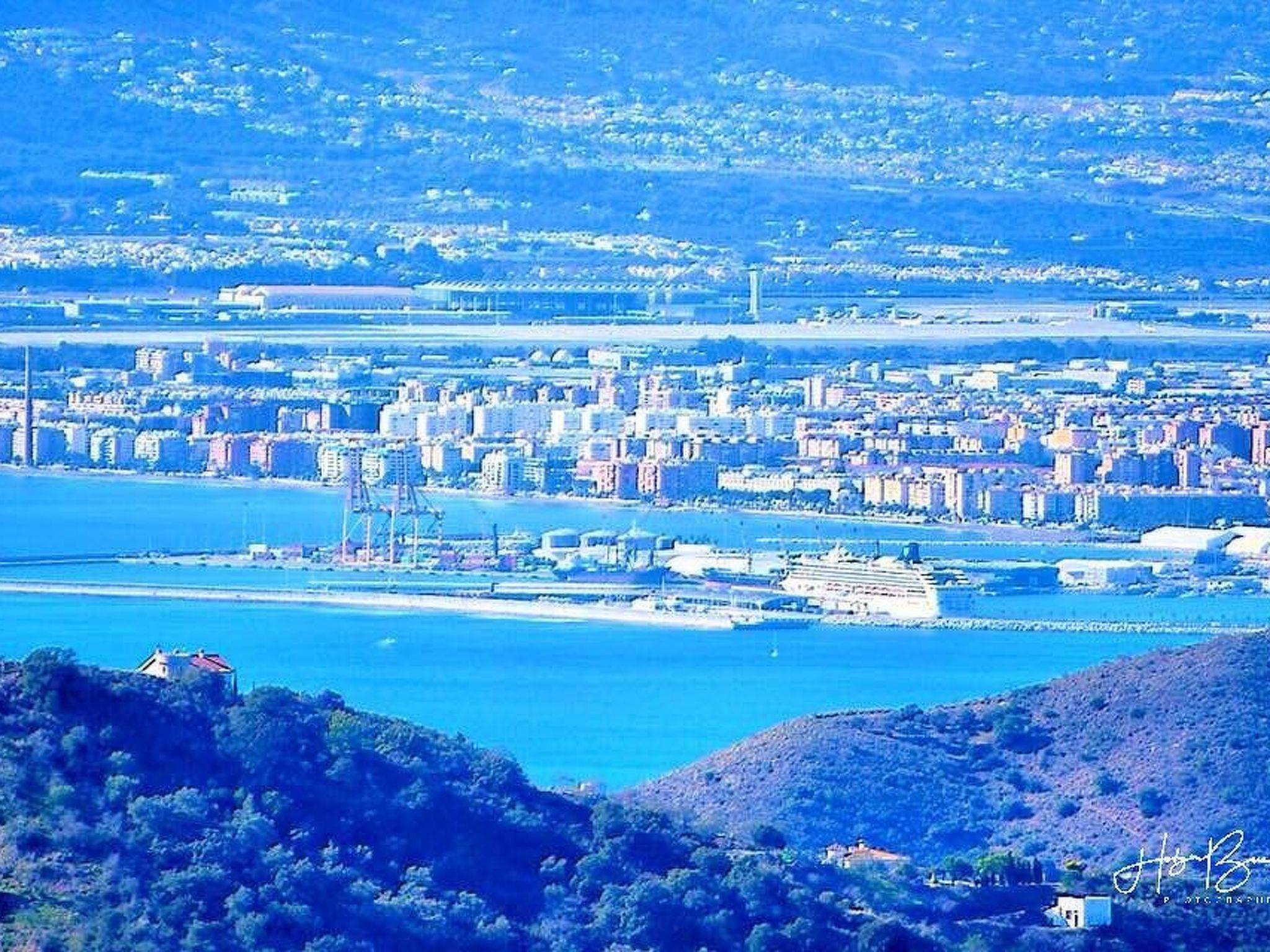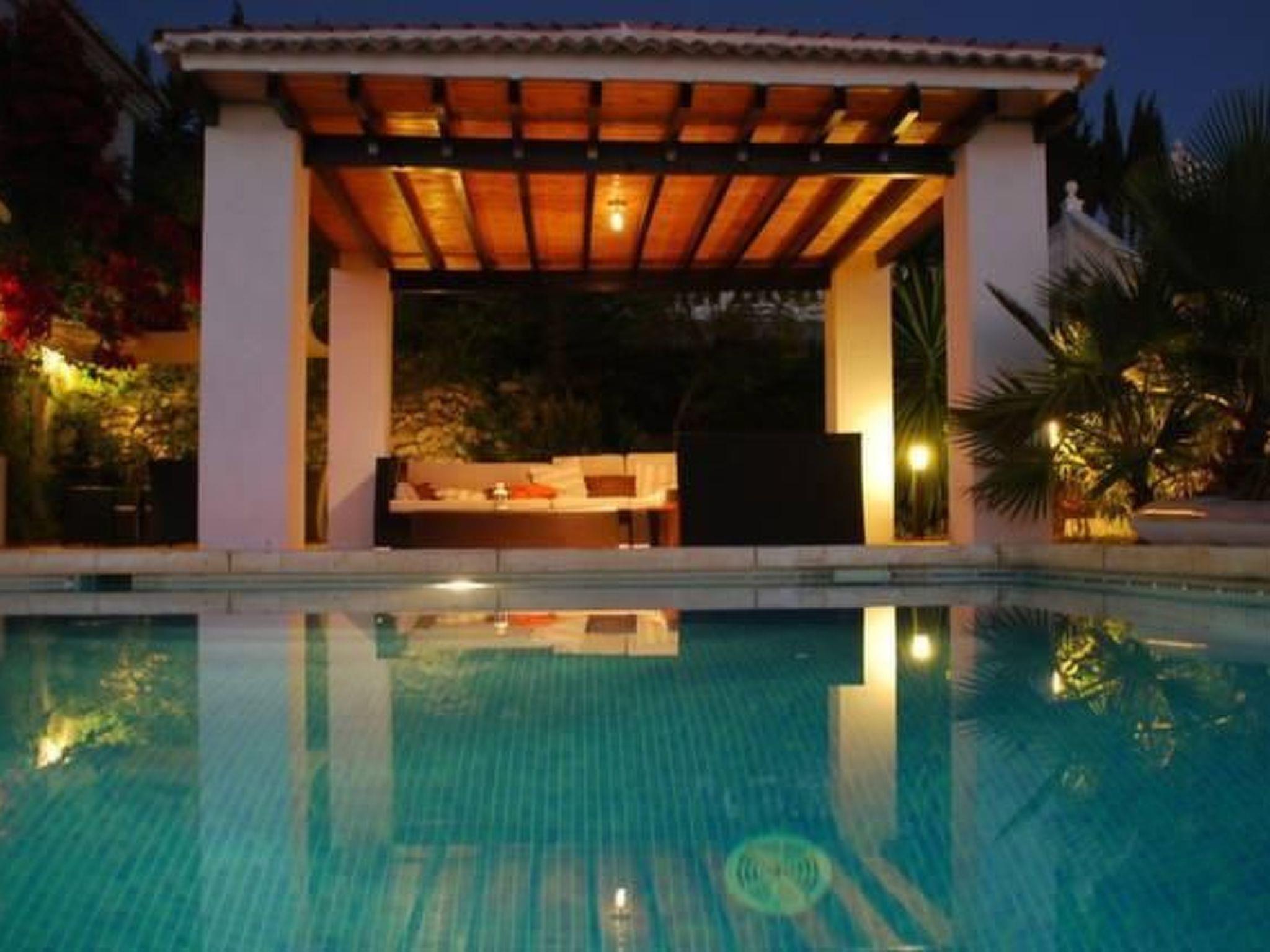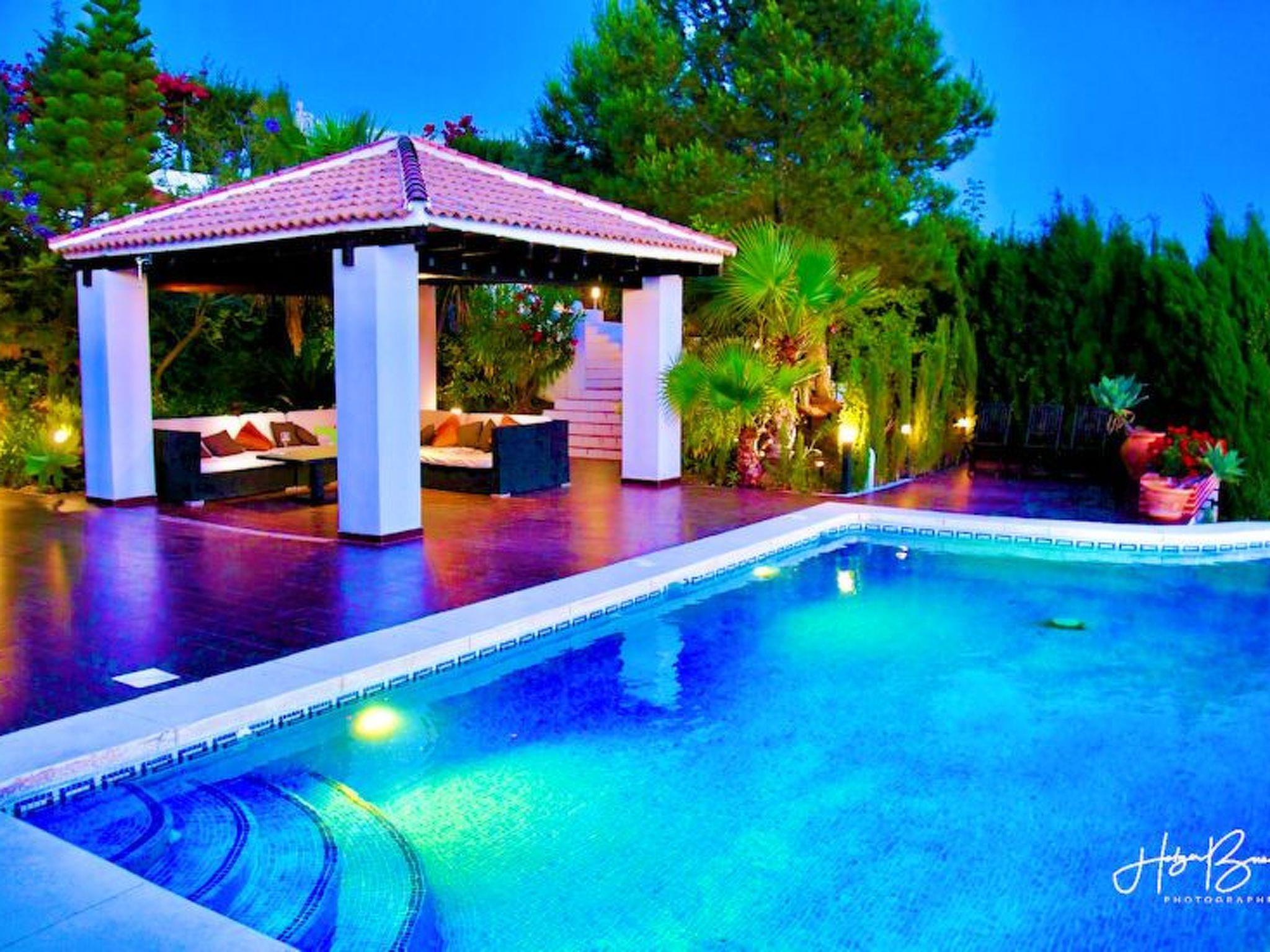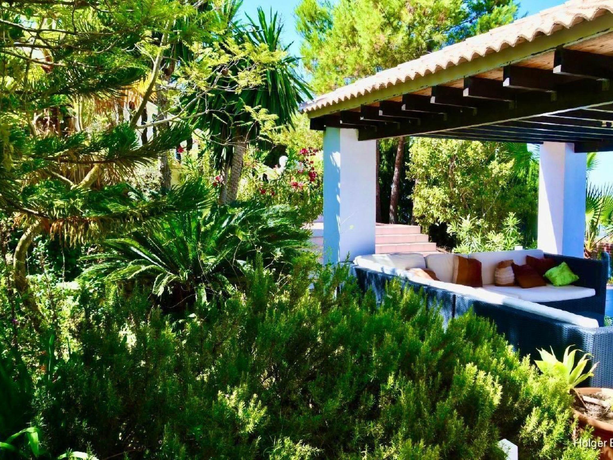 The outdoor area of the villa unfolds in all its splendour on a plot of 8500 m², the upper part of which is fenced and includes a terrace of approx. 200 m² between the house and the pool. From here there is an incomparable view of the lights of Málaga or cruise ships entering the harbour. Equipped with a large lounge sofa, a dining table for 8 people, sun loungers and a barbecue, as well as additional sun protection provided by a pergola and an awning for the dining area, nothing stands in the way of cosy hours under the Spanish sun. The heated pool has an interesting shape with an integrated bench and allows you to sit in the water and enjoy the spectacular view.