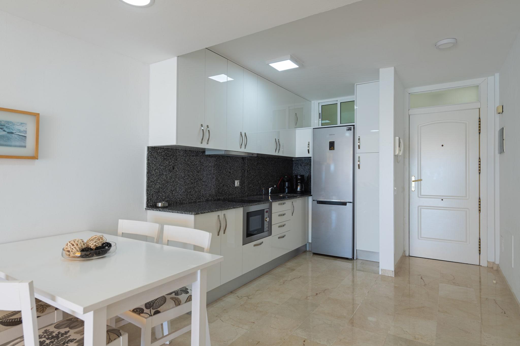 Oplev en bemærkelsesværdig lejlighed ved stranden, hvor du kan opleve betagende solopgange og solnedgange, mens du nyder højhastigheds ubegrænset Wi-Fi på 300 Mbps. Beliggende i det fredfyldte Playa de Mogán, er denne lejlighed beliggende i en stille beboelsesejendom og har materialer og finish i topkvalitet. Den ekspansive terrasse byder på spektakulær havudsigt, liggestole og et komfortabelt opholdsområde, der giver de perfekte rammer for afslapning. Denne moderne lejlighed er omhyggeligt designet til din komfort og byder på en privat terrasse med udendørs spisning, et veludstyret køkken og en hyggelig stue med sofaer og et Smart TV, der inkluderer internationale kanaler, der dækker sport fra Spanien, Storbritannien, Tyskland og mere. Indkvarteringen omfatter et soveværelse med en dobbeltseng, loftsventilator og direkte adgang til terrassen, samt et andet soveværelse med to enkeltsenge, begge udstyret med aircondition og loftsventilator. Et moderne badeværelse med bruser fuldender rummet. Med lejlighedens ideelle indendørs og udendørs rum kan du nyde dit ophold året rundt, suppleret med en fantastisk udsigt over stranden. For familier er en barneseng og høj stol til rådighed efter anmodning. Ejendommen er beliggende i et boligområde, hvilket sikrer ro for alle gæster, med parkering tilgængelig foran bygningen mod et ekstra gebyr. Du vil være kun 100 meter fra stranden, restauranter og butikker, med golfbaner og indkøbscentre en kort køretur væk, hvilket gør det til en ideel base for at udforske Gran Canarias skønhed. Book din uforglemmelige ferie nu!