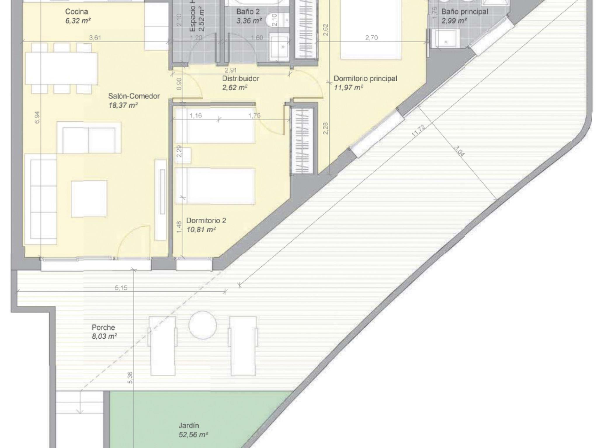 The flat has an outside area of 60m2 formed by a porch with garden and a large corner terrace with views to the mountain and partial views to the beach. As it is a corner, we have a very pleasant sensation of temperature and freshness, as well as having a feeling of intimacy. In this terrace there is a small garden, a chill-out area with wood and a bench in a corner.