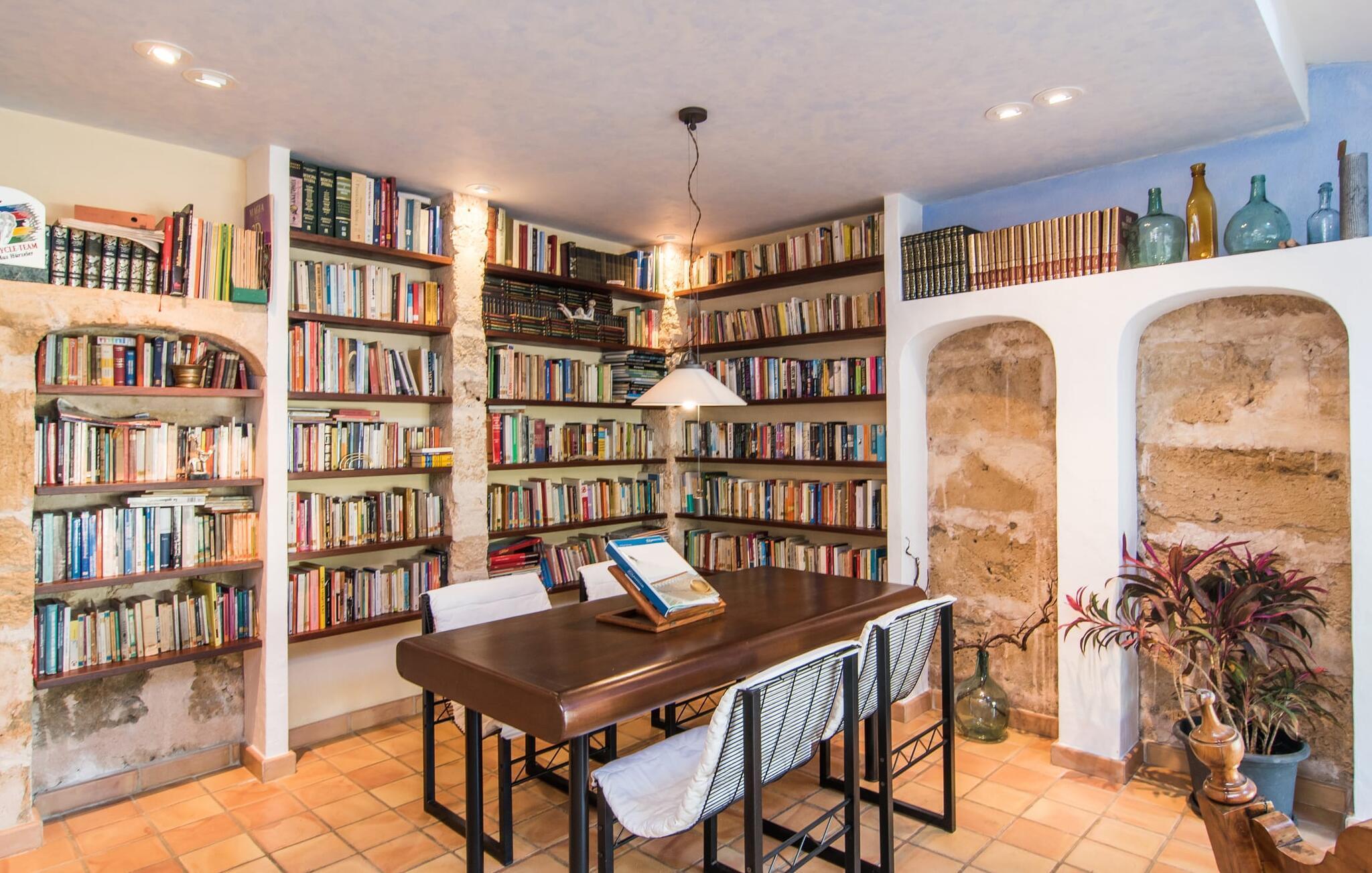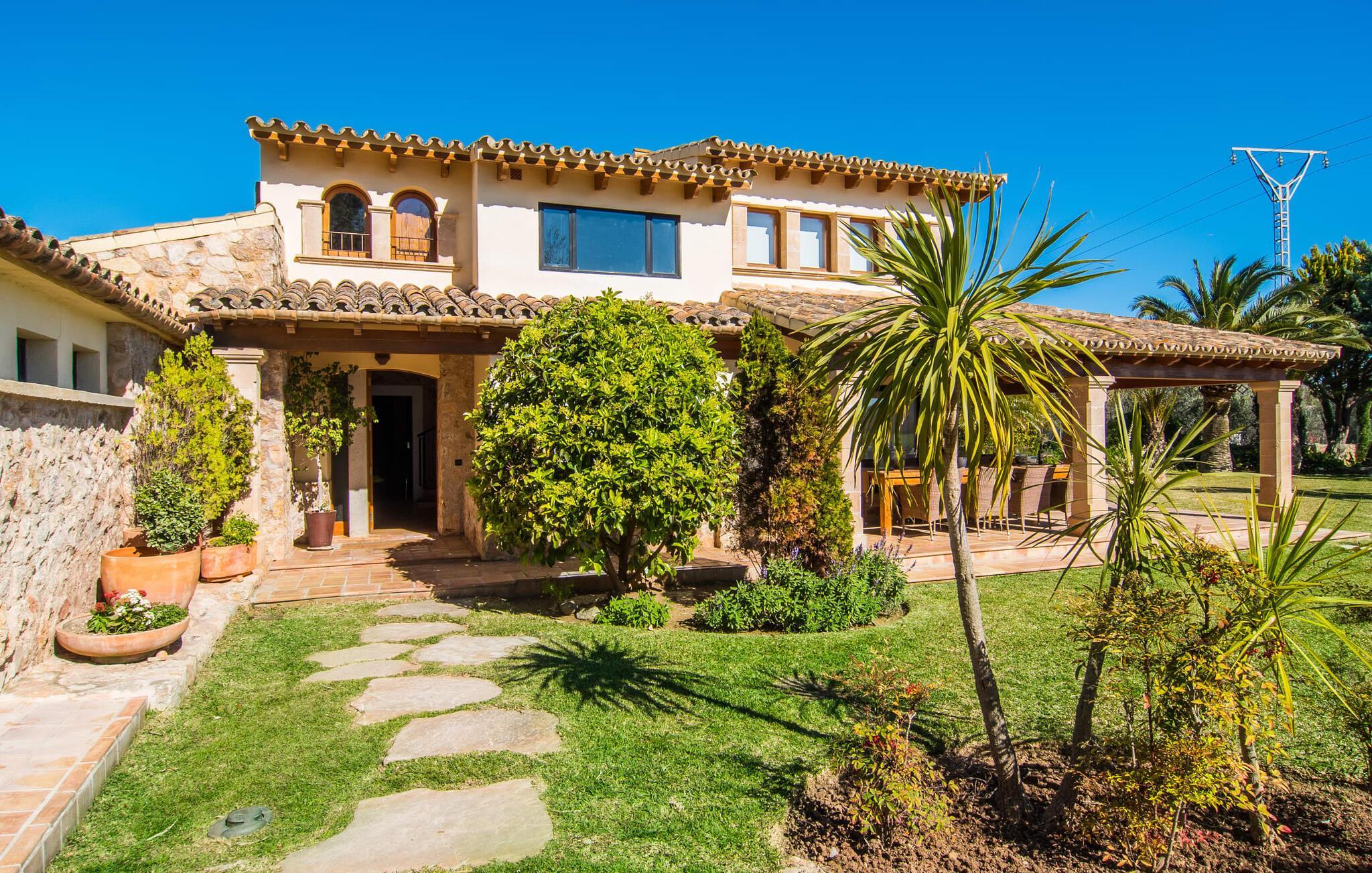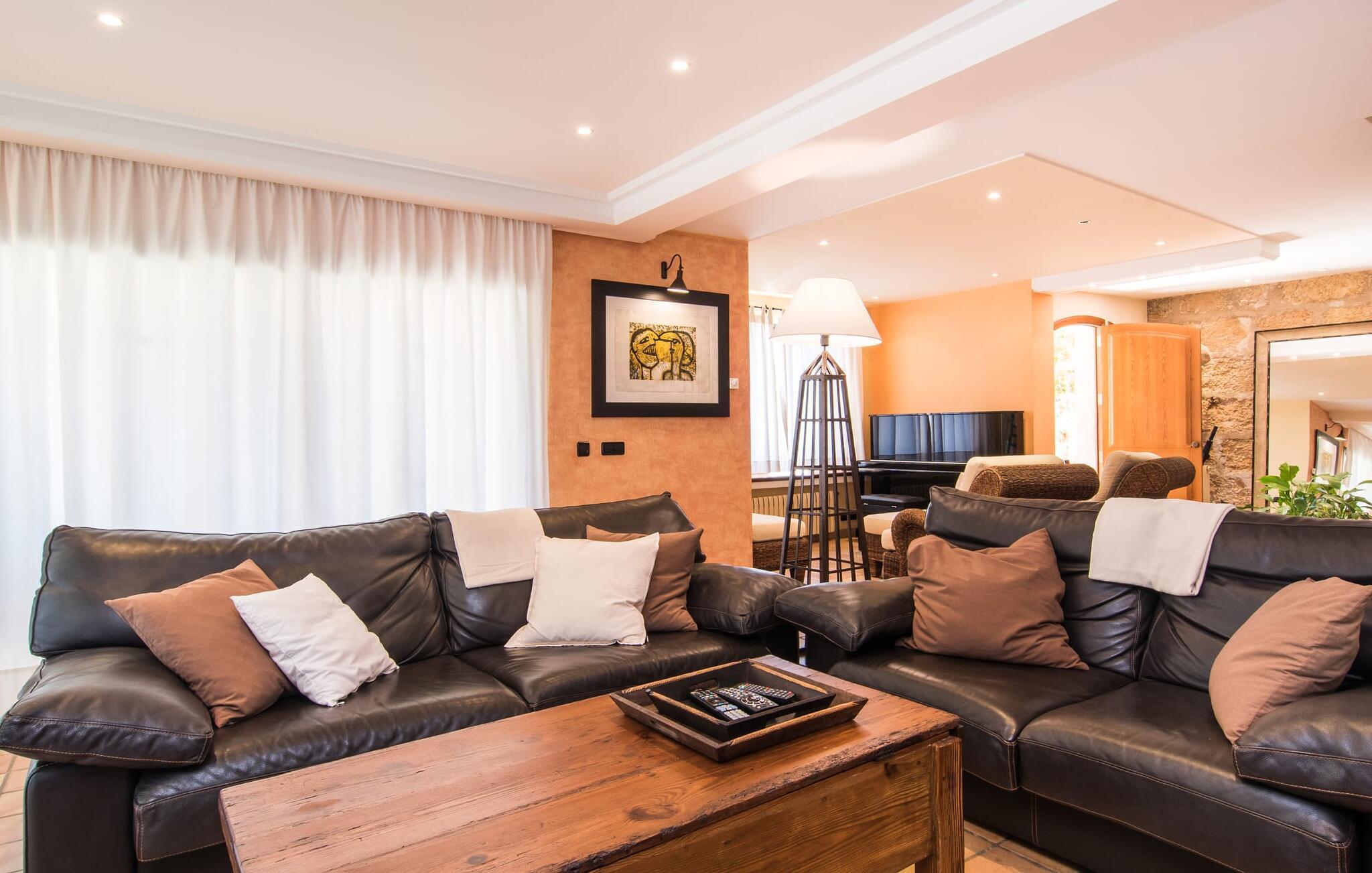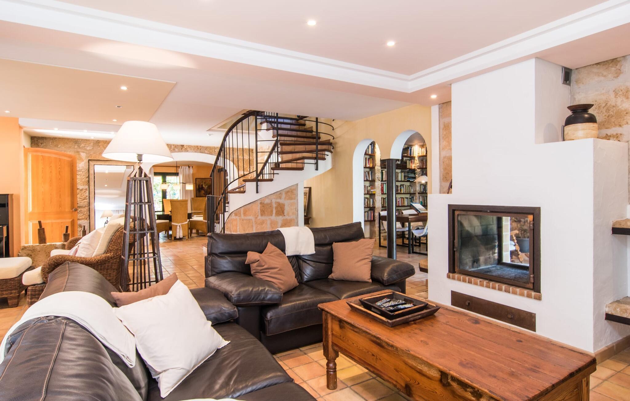 Den fantastiske udsigt fra den smukke villa "Moliner Almadrava" vil helt sikkert efterlade et varigt indtryk på gæsterne. Med de majestætiske Tramuntana-bjerge, der rejser sig i baggrunden, kan du næsten mærke havets salt på din hud, mens dit blik vandrer over de blidt skrånende landlige omgivelser. Brug lidt tid i den mangfoldige have og lyt til den lette brise, der rasler cypresserne, kærtegner oliven- og mandeltræerne og børster de frodige palmeblade sammen. Du kan også nyde den idylliske lyd af morgenro ved poolen efter din morgensvømning, mens du forfrisker dig om eftermiddagen, eller slappe af i spabadet i den nede i jorden, da det reflekterer himlens dybe blå. På en af de komfortable liggestole kan du blot tillade dig selv ikke at gøre noget til en forandring. Afslapning bør efterfølges af afslapning, og du kan helt sikkert slappe af på en af husets to overdækkede terrasser. Og vi kan selvfølgelig heller ikke glemme den indbyggede grill med et indbydende spisebord. Når alt kommer til alt, når man holder ferie sammen (den rummelige ejendom byder på plads nok til otte venner eller to familier) er der rig mulighed for at nyde hinandens selskab! Tingene bliver måske lidt mere konkurrencedygtige med en varm omgang pool i skyggen af verandaen. Gør dig klar til nogle spændende turneringer! Dette er et Fincallorca feriehus. Den perfekte symbiose af typisk mallorcansk og muntert design, bestående af førsteklasses mørkt træ og drejehåndværk og terracottafarvede fliser med moderne designelementer. Det er det, der adskiller "Moliner Almadrava"... Dette design tilbyder en løsning mellem det ærværdige og værdsatte "gamle" Mallorca og kravene til moderne design. De fritlagte brudsten, der fremstår næsten ubearbejdede i deres grovhed, udstråler en majestætisk og nærmest industriel charme. Disse detaljer går igen i forskellige opholdsrum såsom badeværelserne og stuen. Du kan stole på et behageligt sæde - uanset om du ser tv eller foretrækker at kigge ind i den knitrende pejs. To spisepladser i huset tilbyder den ideelle ferieramme for koldere dage for at nyde frisklavede måltider i det trendy køkken med kogeø og førsteklasses udstyr. Kulturelskere vil også få noget for pengene - klaverhjørnet og biblioteket er ikke kun til dekorative formål. Læsesalen vil helt sikkert være et af de mange yndlingssteder denne villa har at byde på. Tre af de fire dobbeltværelser, som garanterer afslappende nætter, er placeret på loftet. "Forældres soveværelser" har også smukke en-suite badeværelser. Men de andre gæster vil med garanti også være tilfredse med yderligere to fuldt udstyrede badeværelser. Der findes næppe bedre forhold for en stressfri ferie. Med sit usædvanligt slående udseende blander "Moliner Almadrava" sig dygtigt ind i sine usædvanligt charmerende omgivelser. Som ikke mindst er præget af den historiske by Pollença med sine vildt romantiske gyder og sandstenshuse, der vidner om dens begivenhedsrige fortid. På trods af sin tiltrækningskraft har byen bevaret sin unikke karakter, da turister kommer her for at opdage den. Der er ikke noget bedre tidspunkt at opleve denne karakter end søndag morgen, hvor det livlige og farverige marked finder sted på Plaça Major. Den spektakulære udsigt over kystvejen til Cap Formentor, de majestætiske bjergtoppe i Tramuntana-bjergene og talrige fortryllende strande langs Pollença-bugten, såsom Can Cap de Bou og Cala Vicenc, fuldender din perfekte ferie. Gør dig klar til en betagende ferie! Den rustikke og legende villa "Moliner Almadrava" med en fortryllende have og privat pool ligger i et tyndt befolket område mellem den ærværdige by Pollença og bugten af samme navn. Du finder indkøbsmuligheder i den smukke by. De smukke og familievenlige sandstrande i Badia de Pollença, såsom Can Cap de Bou, ligger kun 900 m fra huset.