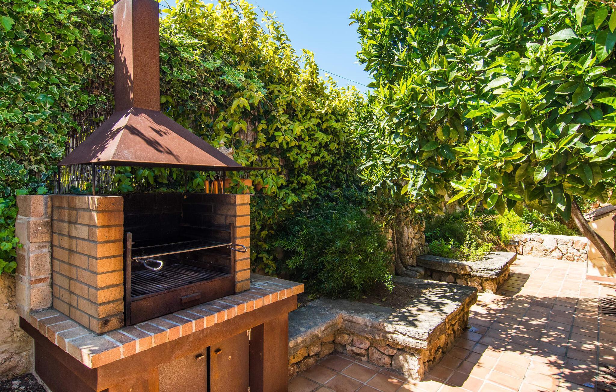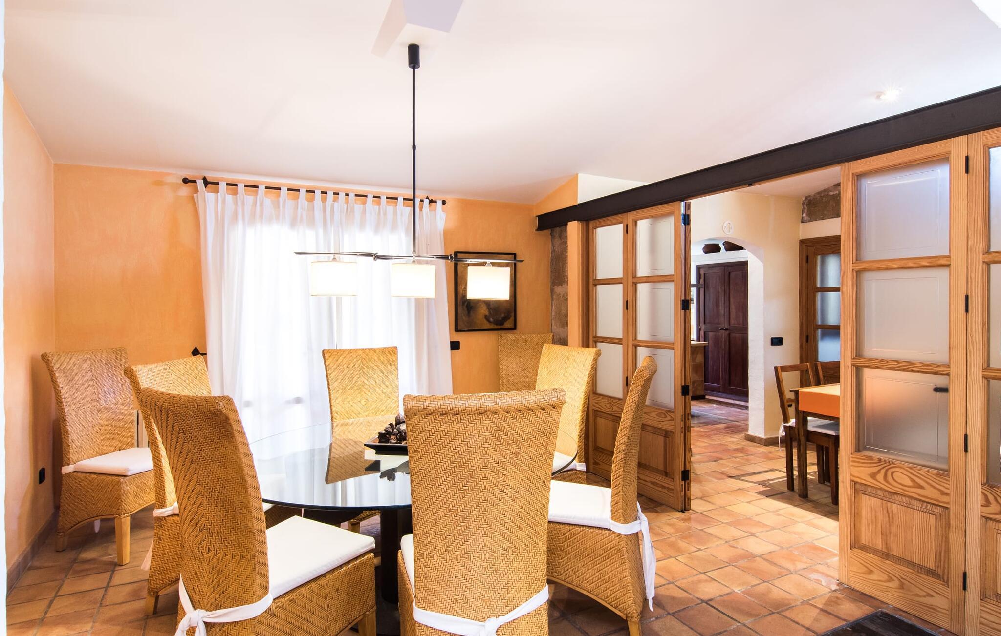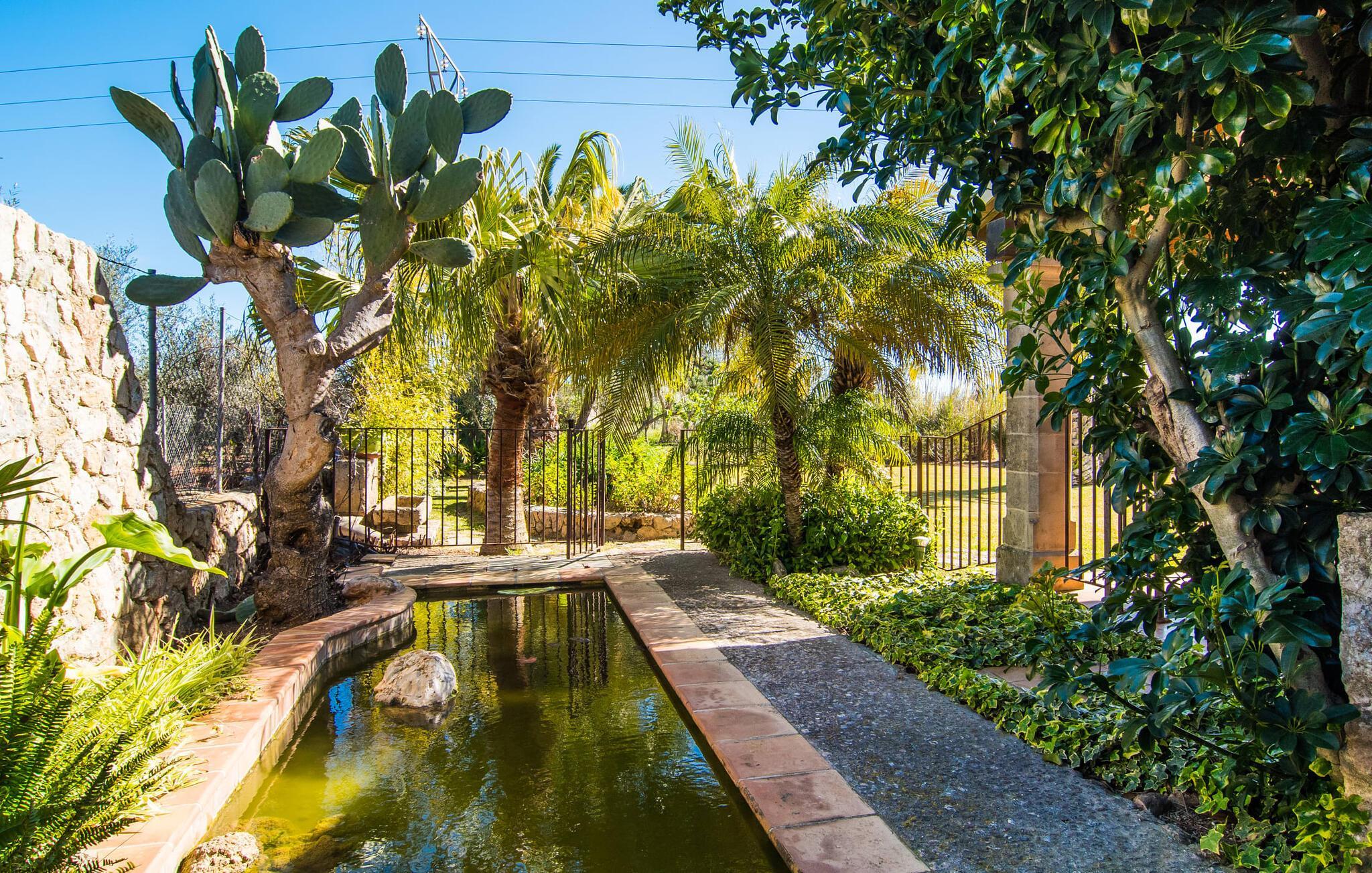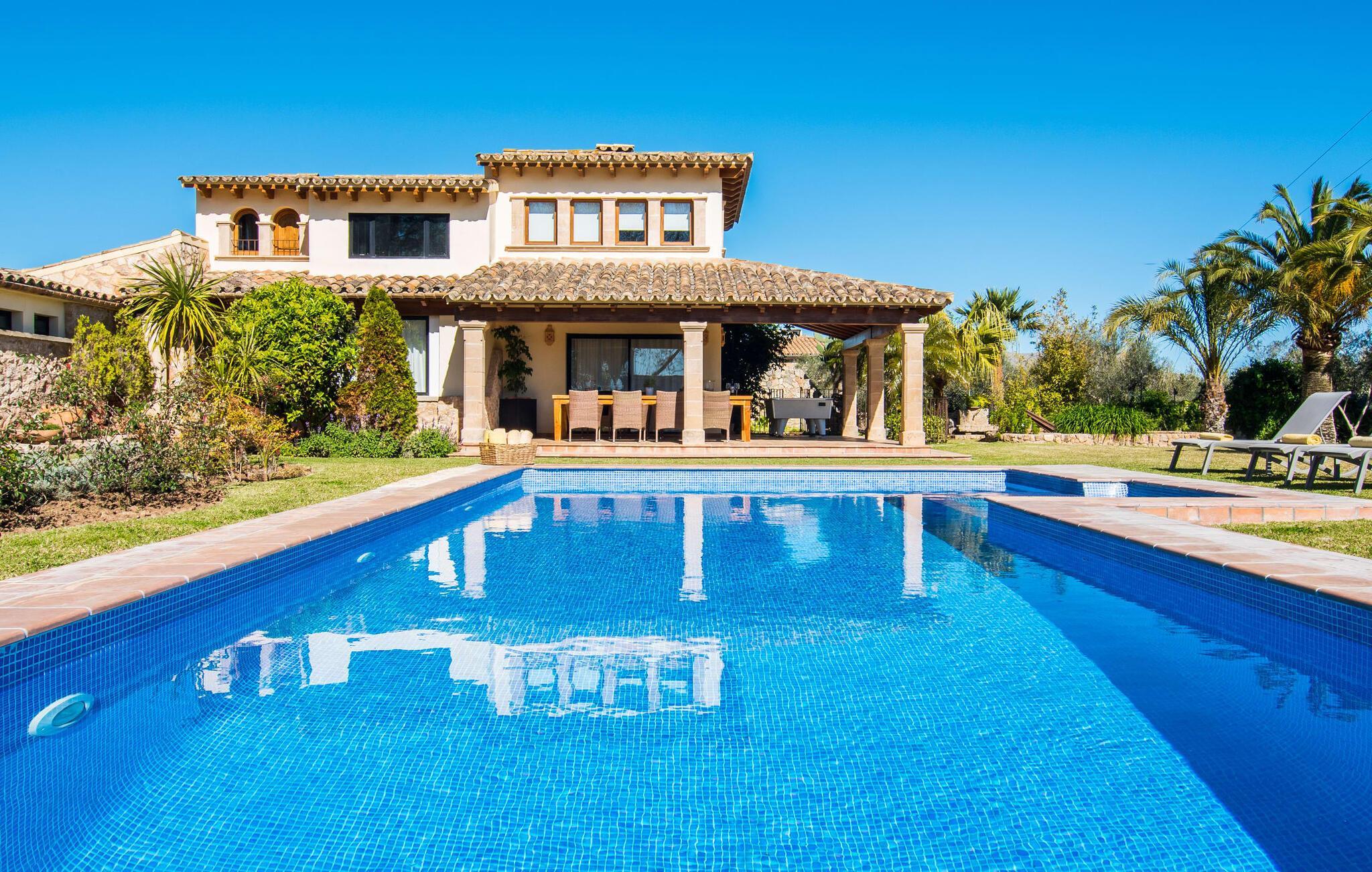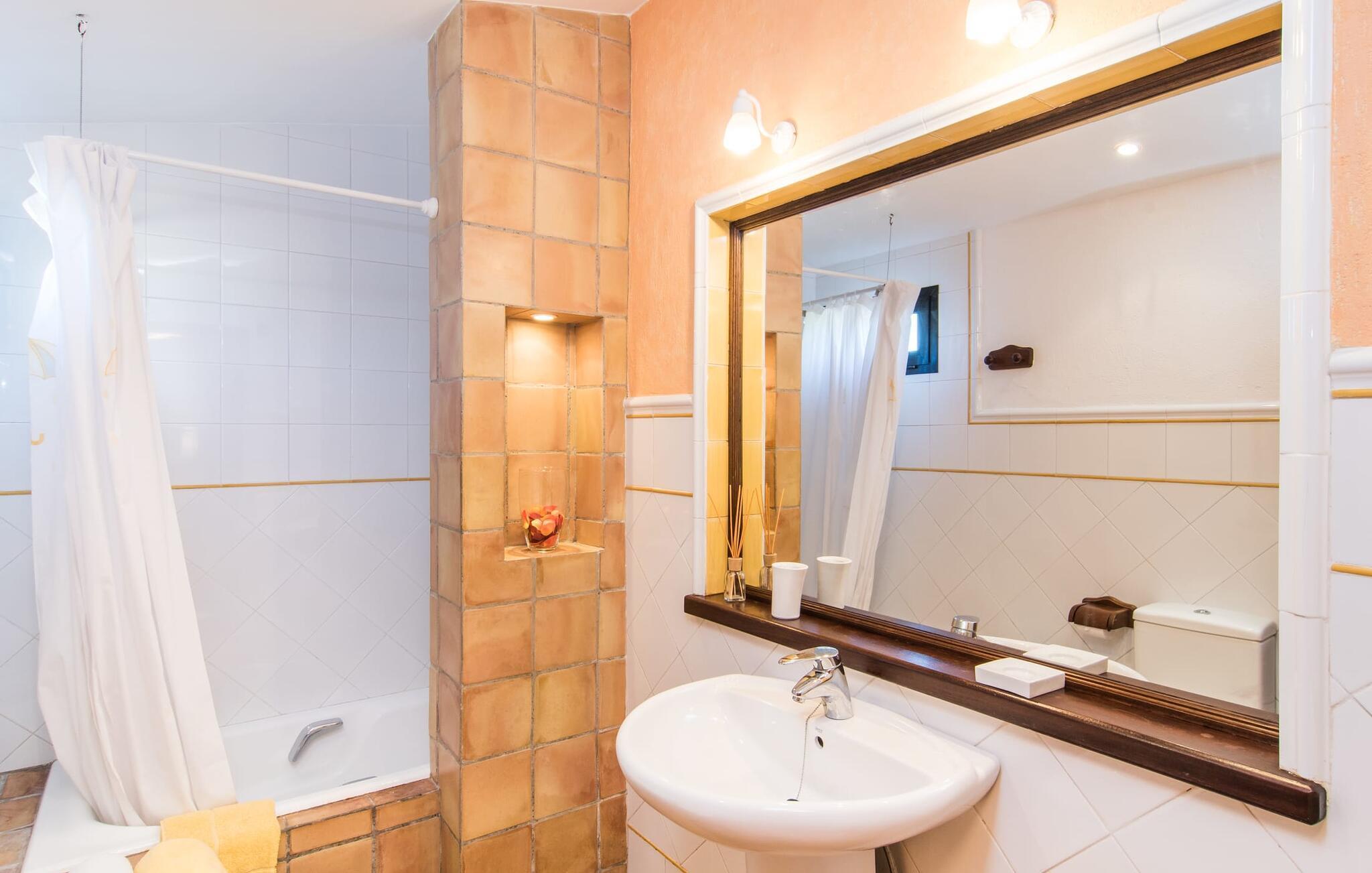 Den fantastiske udsigt fra den smukke villa "Moliner Almadrava" vil helt sikkert efterlade et varigt indtryk på gæsterne. Med de majestætiske Tramuntana-bjerge, der rejser sig i baggrunden, kan du næsten mærke havets salt på din hud, mens dit blik vandrer over de blidt skrånende landlige omgivelser. Brug lidt tid i den mangfoldige have og lyt til den lette brise, der rasler cypresserne, kærtegner oliven- og mandeltræerne og børster de frodige palmeblade sammen. Du kan også nyde den idylliske lyd af morgenro ved poolen efter din morgensvømning, mens du forfrisker dig om eftermiddagen, eller slappe af i spabadet i den nede i jorden, da det reflekterer himlens dybe blå. På en af de komfortable liggestole kan du blot tillade dig selv ikke at gøre noget til en forandring. Afslapning bør efterfølges af afslapning, og du kan helt sikkert slappe af på en af husets to overdækkede terrasser. Og vi kan selvfølgelig heller ikke glemme den indbyggede grill med et indbydende spisebord. Når alt kommer til alt, når man holder ferie sammen (den rummelige ejendom byder på plads nok til otte venner eller to familier) er der rig mulighed for at nyde hinandens selskab! Tingene bliver måske lidt mere konkurrencedygtige med en varm omgang pool i skyggen af verandaen. Gør dig klar til nogle spændende turneringer! Dette er et Fincallorca feriehus. Den perfekte symbiose af typisk mallorcansk og muntert design, bestående af førsteklasses mørkt træ og drejehåndværk og terracottafarvede fliser med moderne designelementer. Det er det, der adskiller "Moliner Almadrava"... Dette design tilbyder en løsning mellem det ærværdige og værdsatte "gamle" Mallorca og kravene til moderne design. De fritlagte brudsten, der fremstår næsten ubearbejdede i deres grovhed, udstråler en majestætisk og nærmest industriel charme. Disse detaljer går igen i forskellige opholdsrum såsom badeværelserne og stuen. Du kan stole på et behageligt sæde - uanset om du ser tv eller foretrækker at kigge ind i den knitrende pejs. To spisepladser i huset tilbyder den ideelle ferieramme for koldere dage for at nyde frisklavede måltider i det trendy køkken med kogeø og førsteklasses udstyr. Kulturelskere vil også få noget for pengene - klaverhjørnet og biblioteket er ikke kun til dekorative formål. Læsesalen vil helt sikkert være et af de mange yndlingssteder denne villa har at byde på. Tre af de fire dobbeltværelser, som garanterer afslappende nætter, er placeret på loftet. "Forældres soveværelser" har også smukke en-suite badeværelser. Men de andre gæster vil med garanti også være tilfredse med yderligere to fuldt udstyrede badeværelser. Der findes næppe bedre forhold for en stressfri ferie. Med sit usædvanligt slående udseende blander "Moliner Almadrava" sig dygtigt ind i sine usædvanligt charmerende omgivelser. Som ikke mindst er præget af den historiske by Pollença med sine vildt romantiske gyder og sandstenshuse, der vidner om dens begivenhedsrige fortid. På trods af sin tiltrækningskraft har byen bevaret sin unikke karakter, da turister kommer her for at opdage den. Der er ikke noget bedre tidspunkt at opleve denne karakter end søndag morgen, hvor det livlige og farverige marked finder sted på Plaça Major. Den spektakulære udsigt over kystvejen til Cap Formentor, de majestætiske bjergtoppe i Tramuntana-bjergene og talrige fortryllende strande langs Pollença-bugten, såsom Can Cap de Bou og Cala Vicenc, fuldender din perfekte ferie. Gør dig klar til en betagende ferie! Den rustikke og legende villa "Moliner Almadrava" med en fortryllende have og privat pool ligger i et tyndt befolket område mellem den ærværdige by Pollença og bugten af samme navn. Du finder indkøbsmuligheder i den smukke by. De smukke og familievenlige sandstrande i Badia de Pollença, såsom Can Cap de Bou, ligger kun 900 m fra huset.