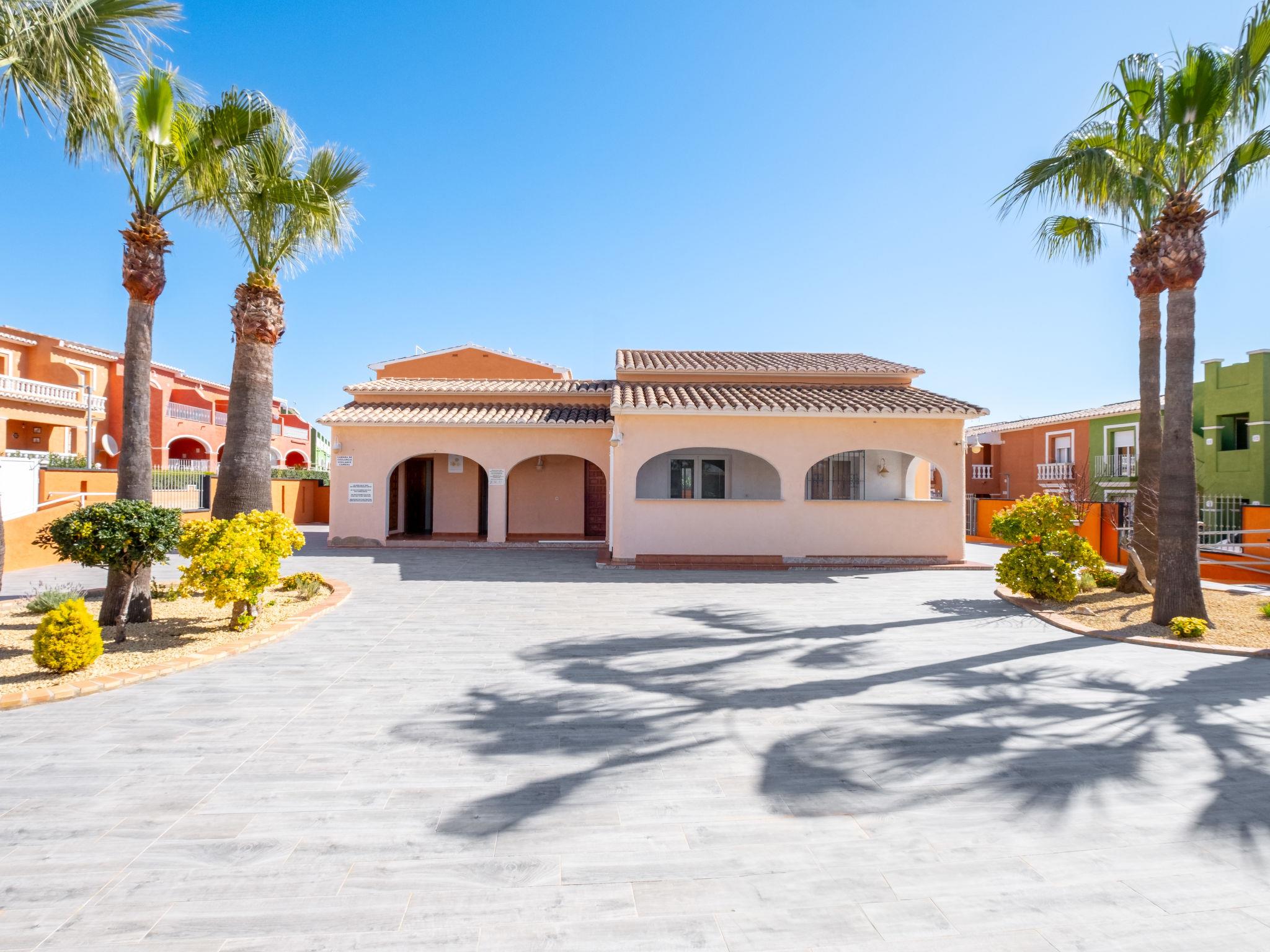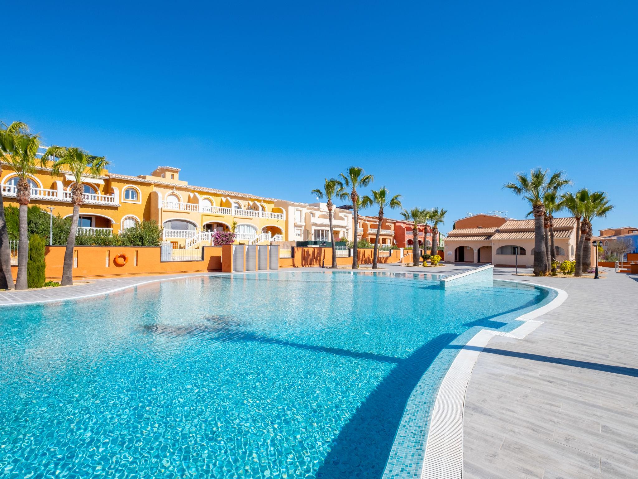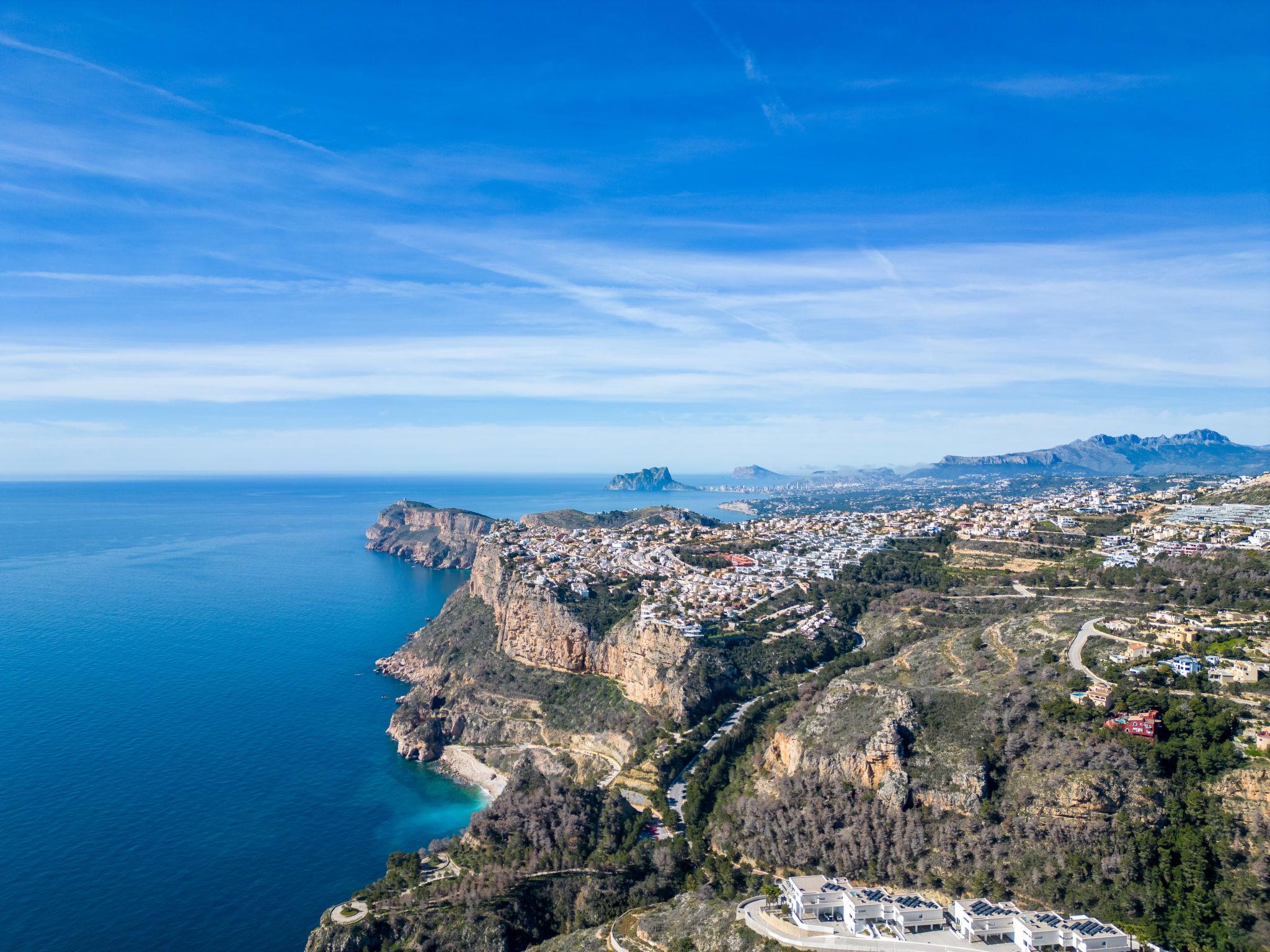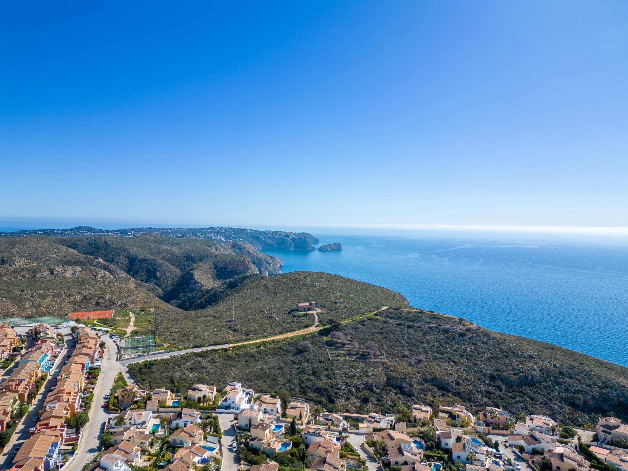 Cumbre del Sol: Large, beautiful holiday development "Pueblo de la Paz". 8 km from the centre of Moraira, in the district Cumbre del Sol, in a quiet, sunny position in the residential district, traffic calmed area, 1.8 km from the sea, 1.8 km from the beach. For shared use: beautiful, well-kept garden, swimming pool (60 x 16 m, seasonal availability: 01.Apr. - 31.Oct.) with internal staircase. Children's pool, outdoor shower, terrace. Grocery, supermarket 500 m, restaurant 600 m, bus stop 4 km, sandy beach "Playa Arenal" 8 km, rocky beach "Cala Moraig" 1.8 km. Sports harbour 9 km, marina 9 km, golf course 11 km. Nearby attractions: Aqualandia, Mundomar, Terra Mítica, Terra Natura, Benidorm Palace (Benidorm), Les Fonts de l'Algar, Castillo de Guadalest. The owner does not accept any youth groups.