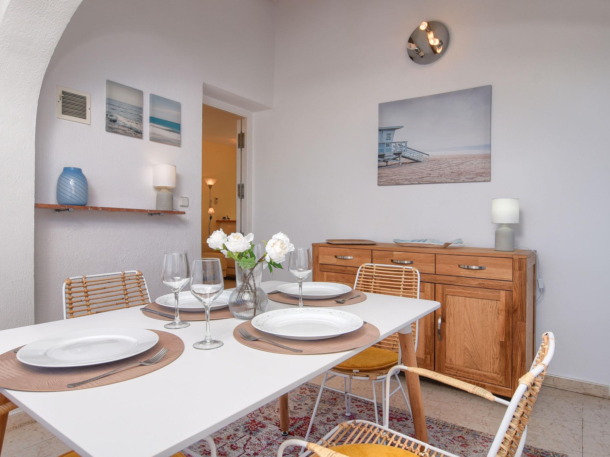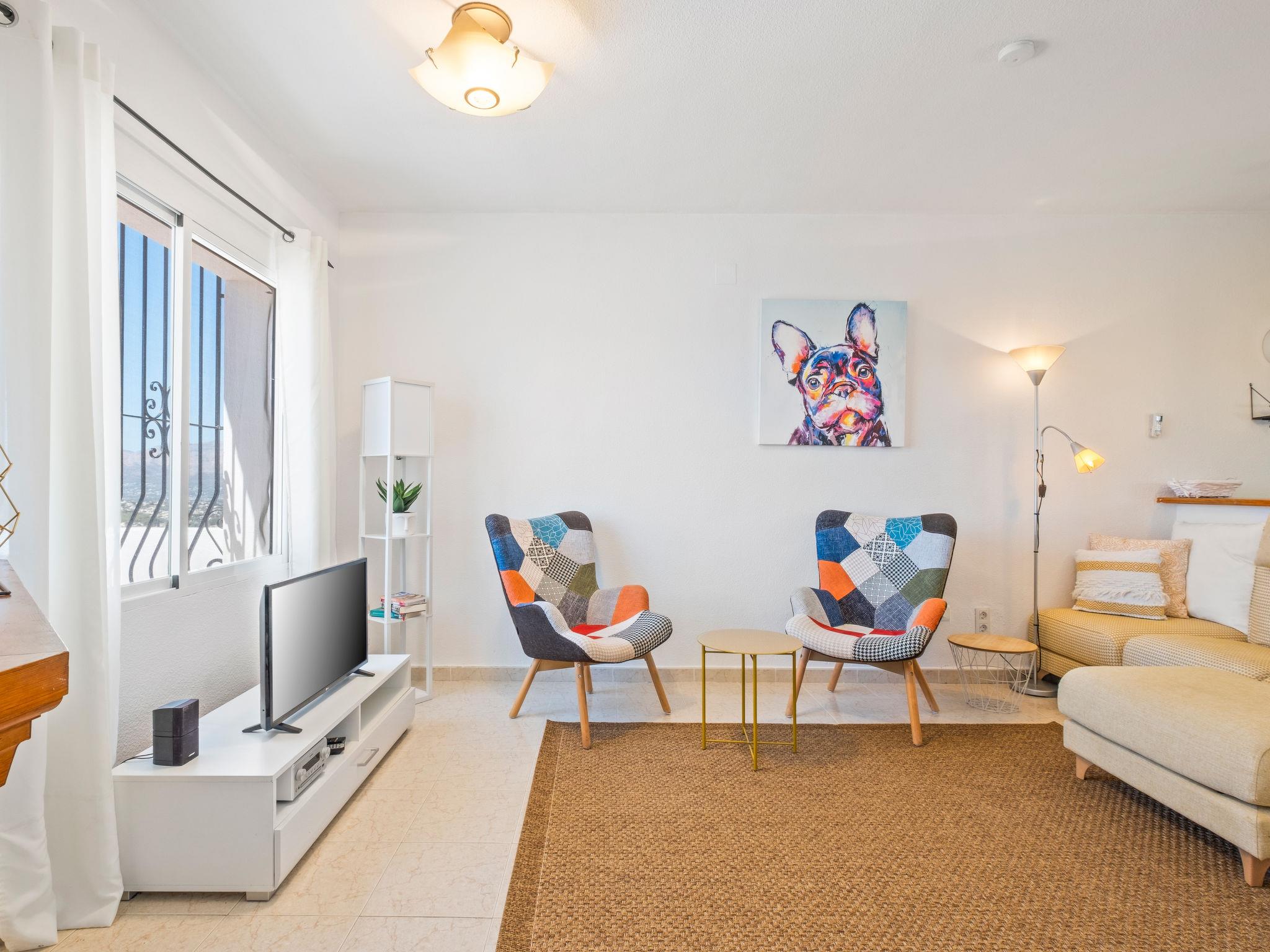 "Las Mimosas", 3-room bungalow 110 m2. Bright, comfortable and cosy furnishings: open living/dining room with digital TV, air conditioning and forced-air heating. Exit to the terrace. Small, open kitchen (oven, 4 ceramic glass hob hotplates, toaster, kettle, microwave, electric coffee machine). Bath/WC, sep. WC. On the lower ground floor: 1 room with 1 french bed (1 x 180 cm, length 190 cm), air conditioning and forced-air heating. Exit to the terrace. 1 room with 1 french bed (160 cm, length 200 cm), air conditioning and forced-air heating. Exit to the terrace. Terrace. Terrace furniture, deck chairs. Very beautiful view of the countryside and the resort. Facilities: washing machine, iron, hair dryer. Internet (WiFi, free). Please note: non-smoking house. TV only DE. VT-481203-A // Reg. Nr.: ESFCTU00000303800002700700000000000000000VT-481203-A9