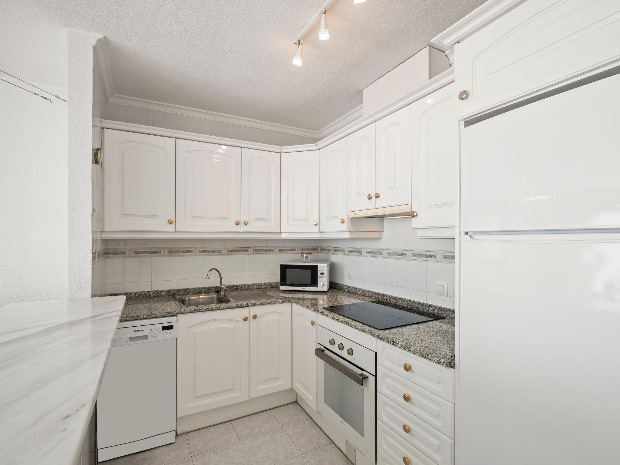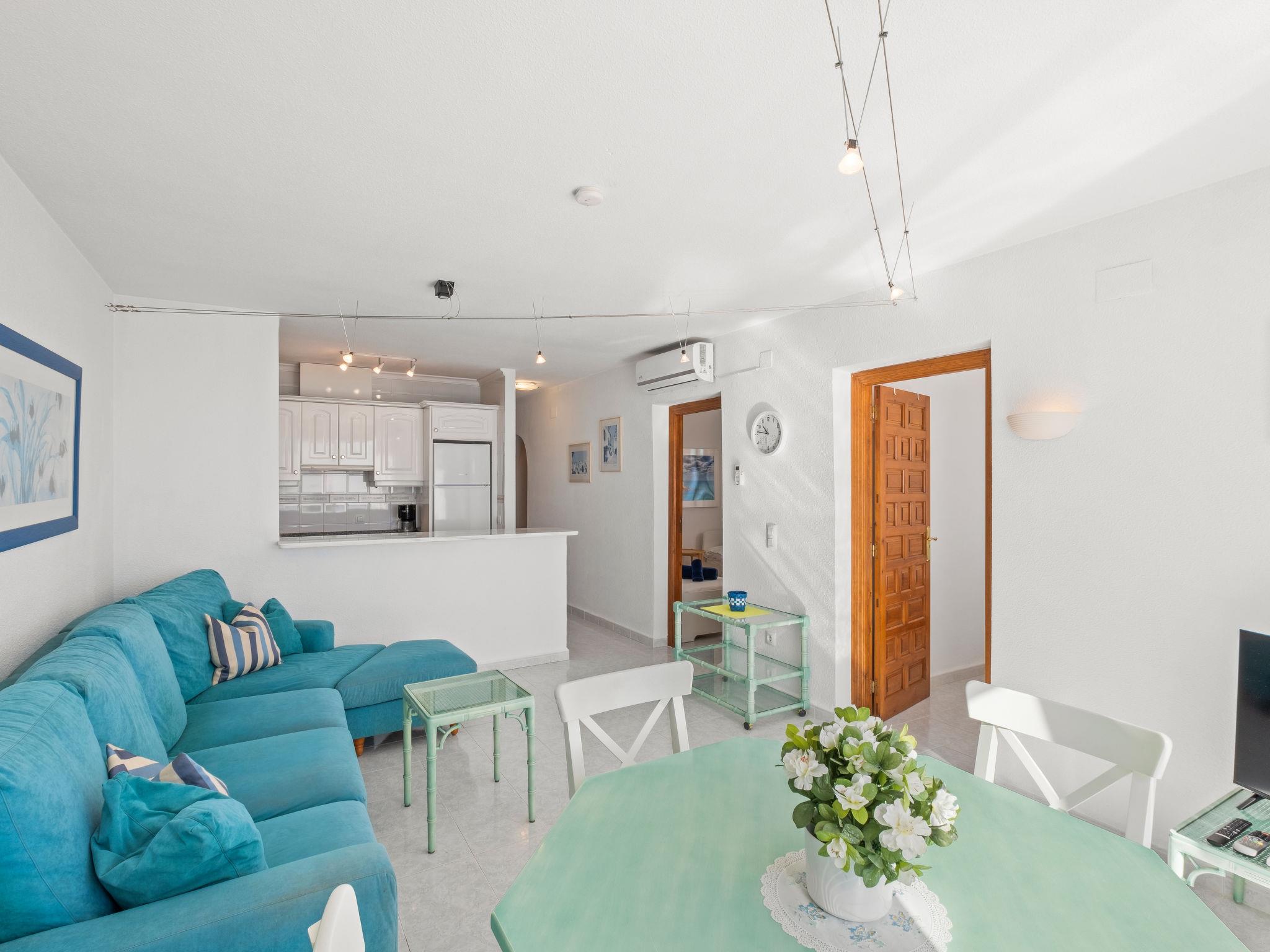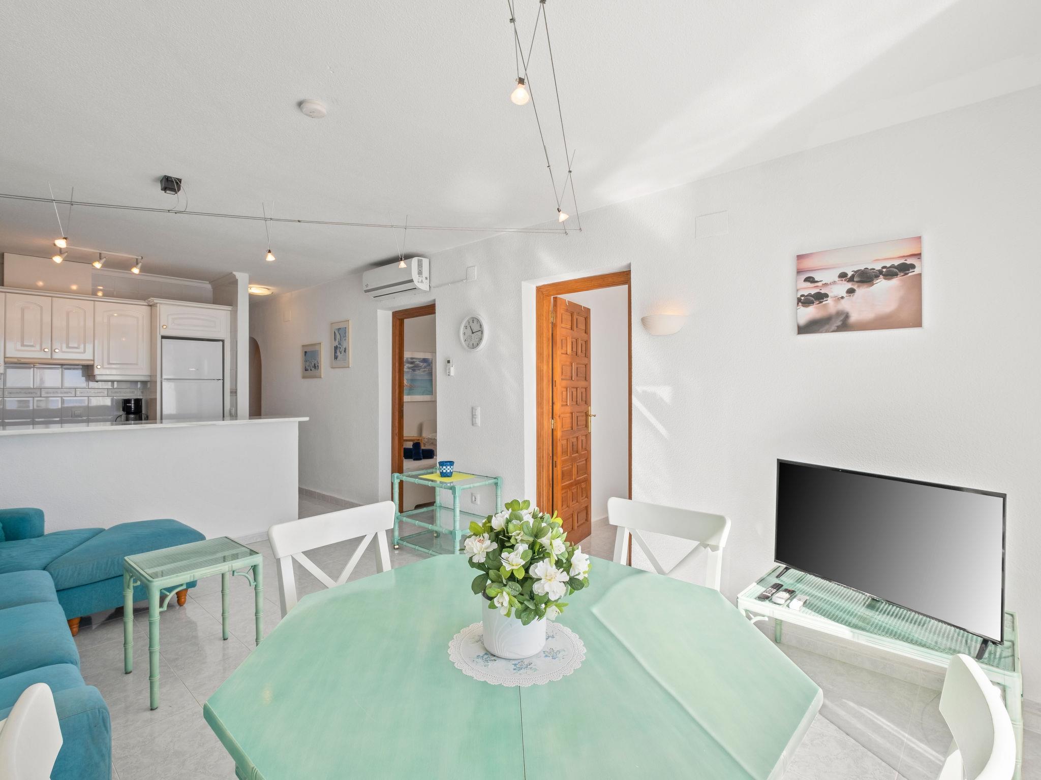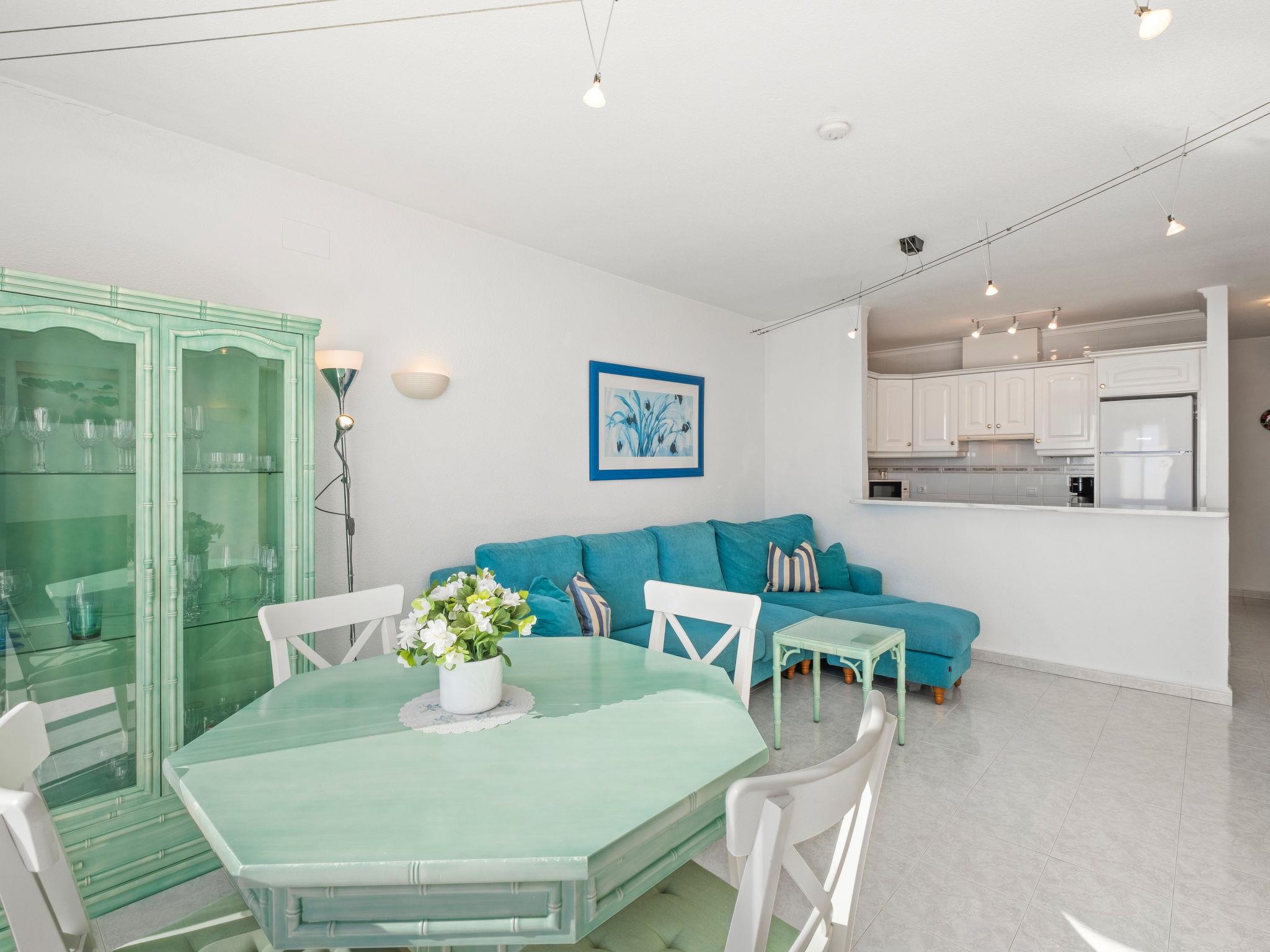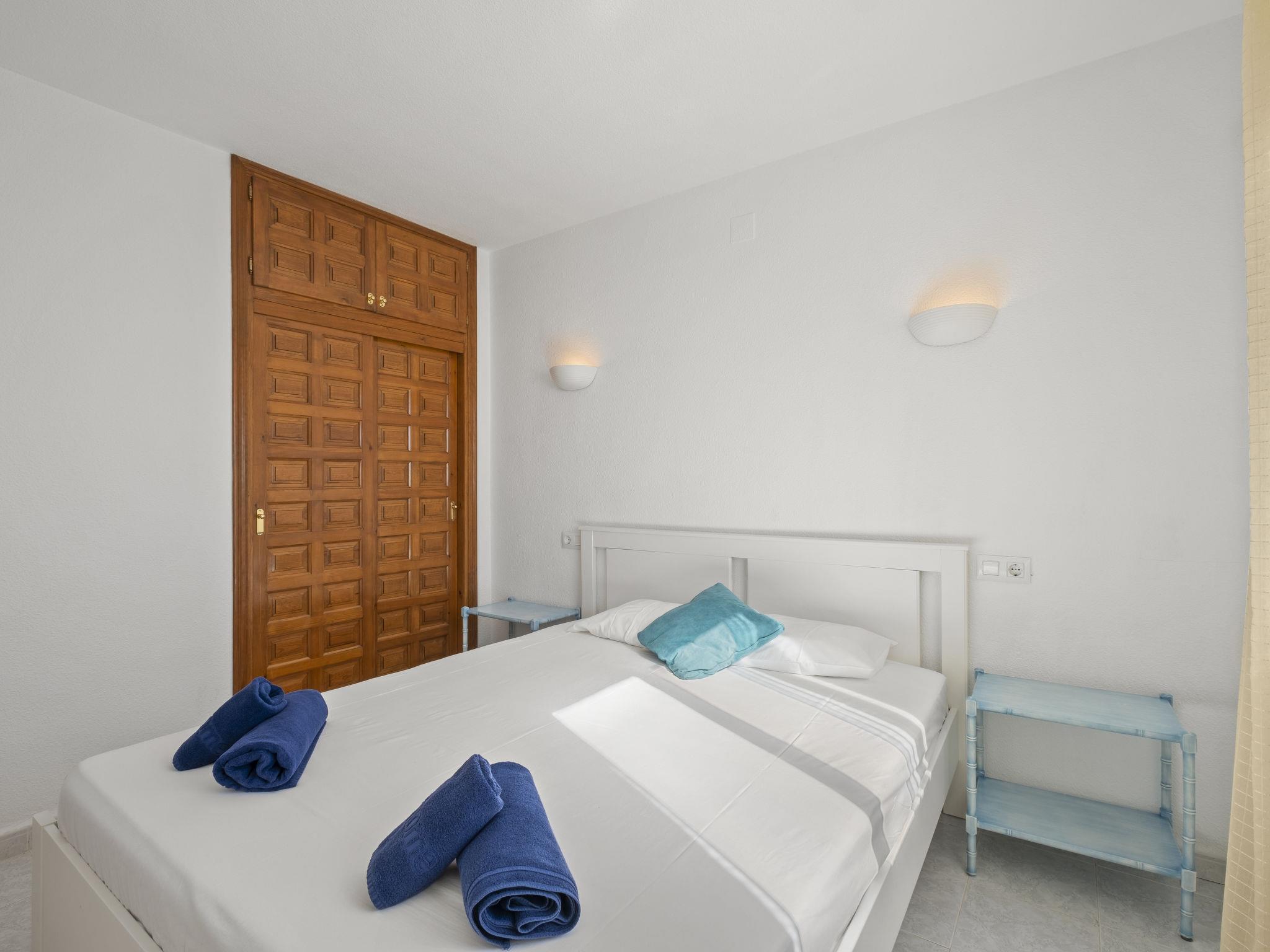 "Pueblo Panorama", 3-room apartment 68 m2. Spacious and bright, practical and comfortable furnishings: living/dining room with satellite TV, air conditioning and forced-air heating. Exit to the terrace with 1 french bed (1 x 180 cm, length 200 cm). 1 room with 2 beds (90 cm, length 200 cm). Kitchen (dishwasher, 3 ceramic glass hob hotplates, toaster, kettle, microwave, electric coffee machine). Shower/WC, double hand-basin. Forced-air heating. Terrace. Terrace furniture. Panoramic view of the sea and the resort. Facilities: washing machine, iron, hair dryer. Internet (WiFi, free). At the house. Please note: non-smoking house. TV only DE. No lift. VT-510919-A // Reg. Nr.: ESFCTU00000303800090134500000000000000000VT-510919-A6