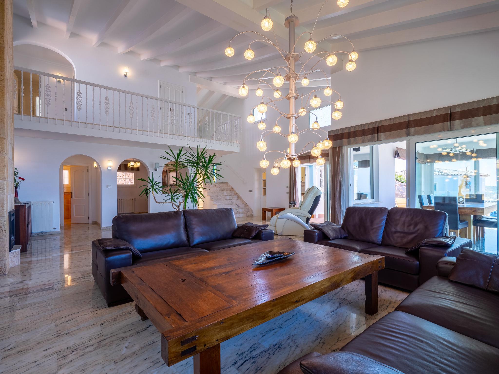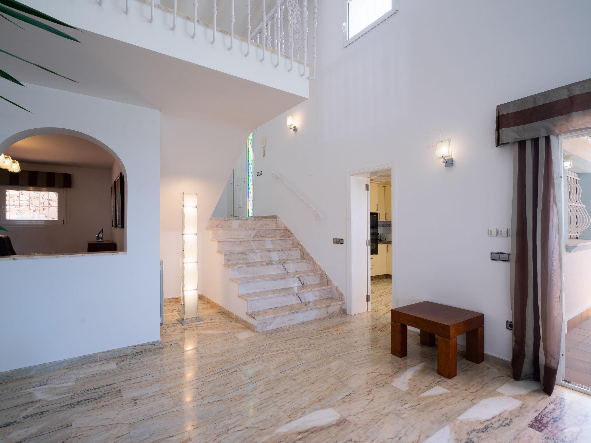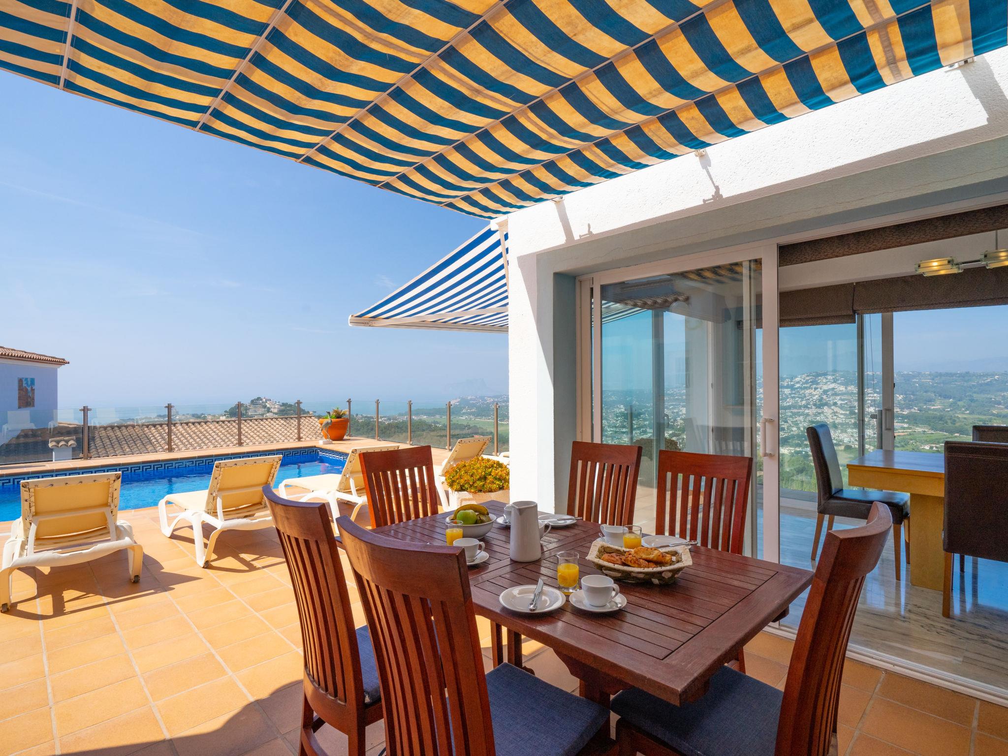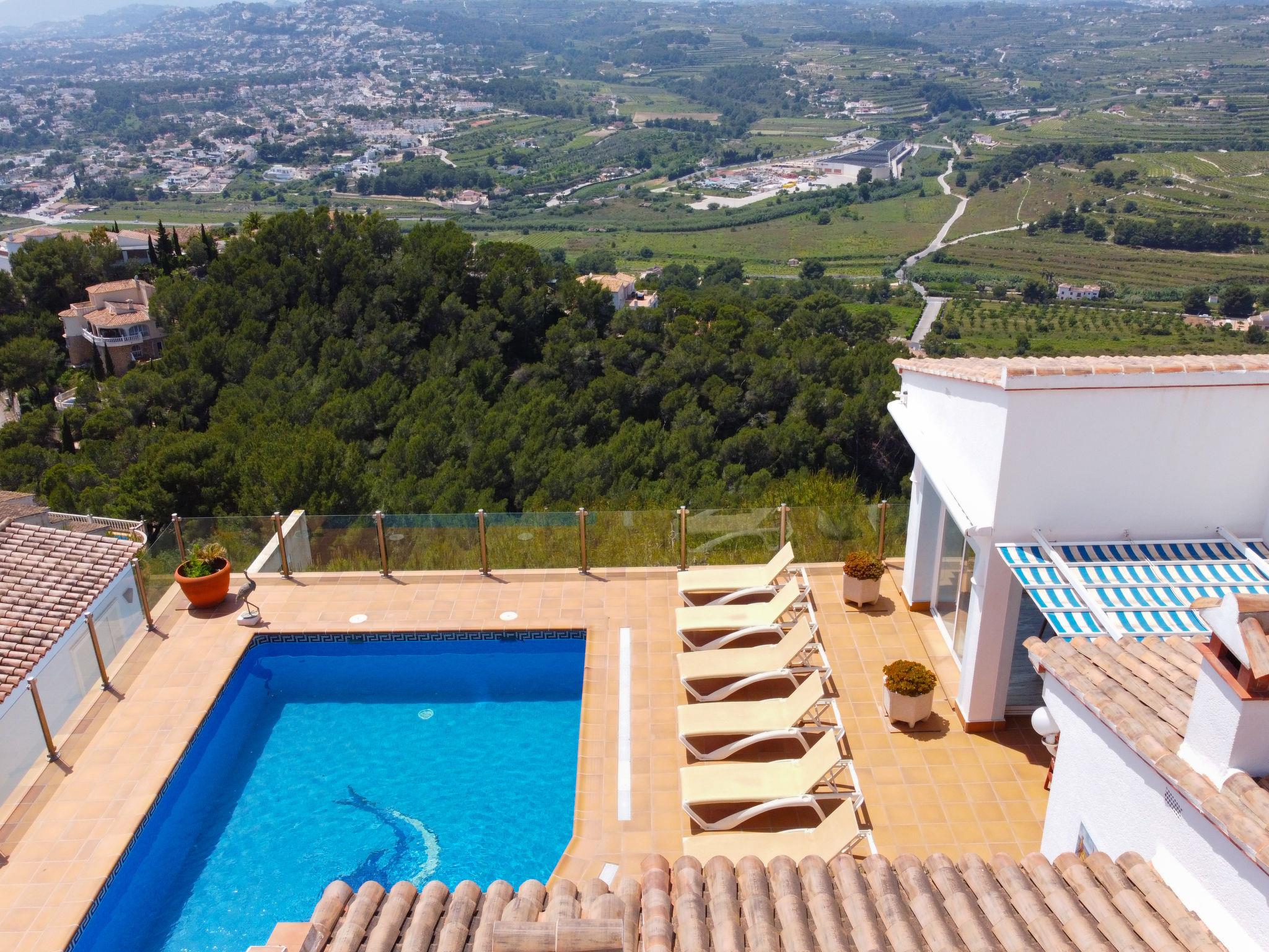 Golden Valley: Beautiful, luxurious house "Stuttgart". 4.5 km from the centre of Moraira, in a quiet, sunny, elevated position, 4.5 km from the sea, in a cul-de-sac. Private: property 1'100 m2 (fenced), swimming pool with privacy (35 m2, seasonal availability: 01.Jan. - 31.Dec.) with internal staircase. Terrace, garden furniture, barbecue house. In the house: sauna, fitness room, hot tub, central heating system. Roofed, parking. Supermarket 1.3 km, restaurant 1.3 km, bar 1.3 km, bus stop "Moraira" 4.1 km, railway station "Teulada" 6.3 km, ferry "Denia" 22.4 km, sandy beach "Moraira" 4.5 km. Golf course (18 hole) 9 km. The owner does not accept any youth groups.