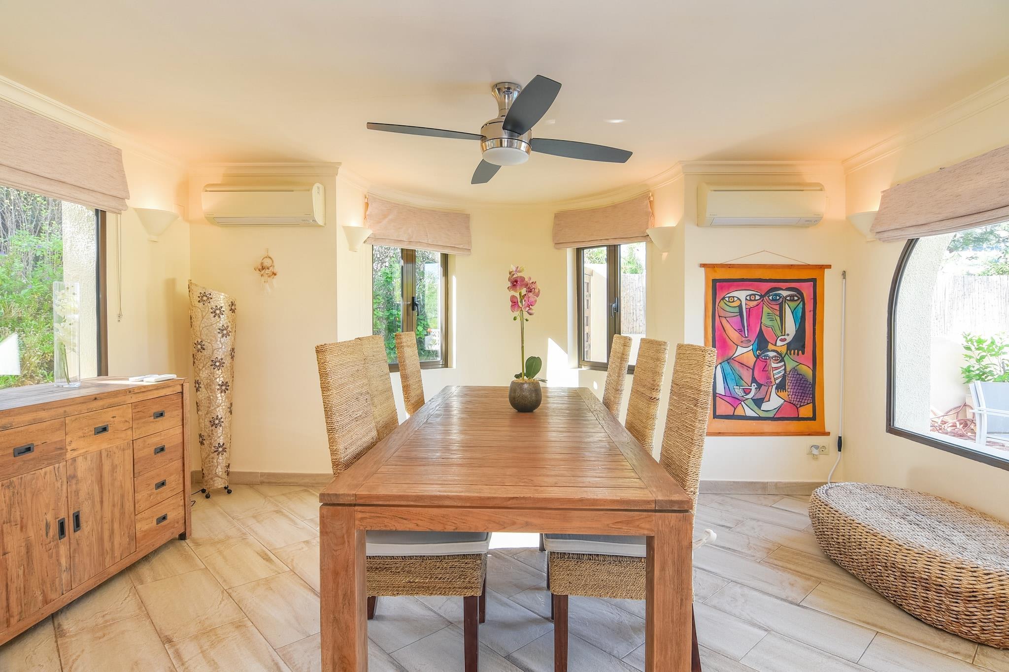 Dette feriehus med en fantastisk beliggenhed tæt ved havet og centrum er ideel til 1 eller 2 familier. Det har også en indhegnet privat swimmingpool til at nyde de forfriskende dukkert og masser af områder til at slappe af i solen. Moraira er en malerisk fiskerby på Costa Blanca. Det tilbyder en afslappet atmosfære og en smuk kystlinje med krystalklart vand, hvilket gør det til en populær destination for vandsportsentusiaster. Gå en tur i de smalle brostensbelagte gader, og oplev seværdigheder som Moraira-slottet fra det 18. århundrede. Supermarkedet ligger 1 km væk, og i Moraira finder du masser af hyggelige terrasser og restauranter. Sandstranden ligger 2,5 km derfra, og der er 2 km til vandsport. Hvis du kan lide at feste, så glem ikke at udforske nattelivet i denne region. En dagstur til Altea (25 km) eller Guadalest (25 km) er også umagen værd. Huset har en lukket have, der giver adgang via trappen til solterrassen med swimmingpool. Fra terrassen har du udsigt over den smukke dal Moraira. Sengene er redt ved ankomsten og der er WiFi i huset. Den nærmeste offentlige transport- og busforbindelse er 1,5 km væk, mens lufthavnen ligger 85 km væk.