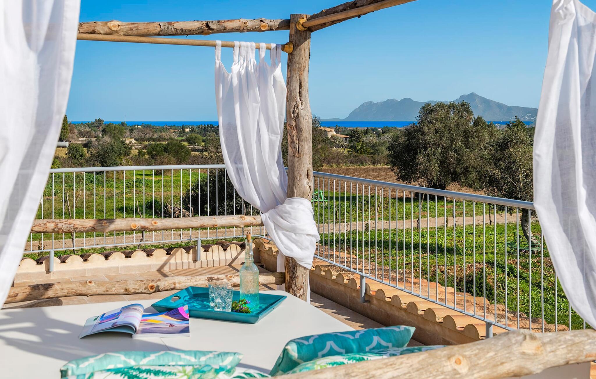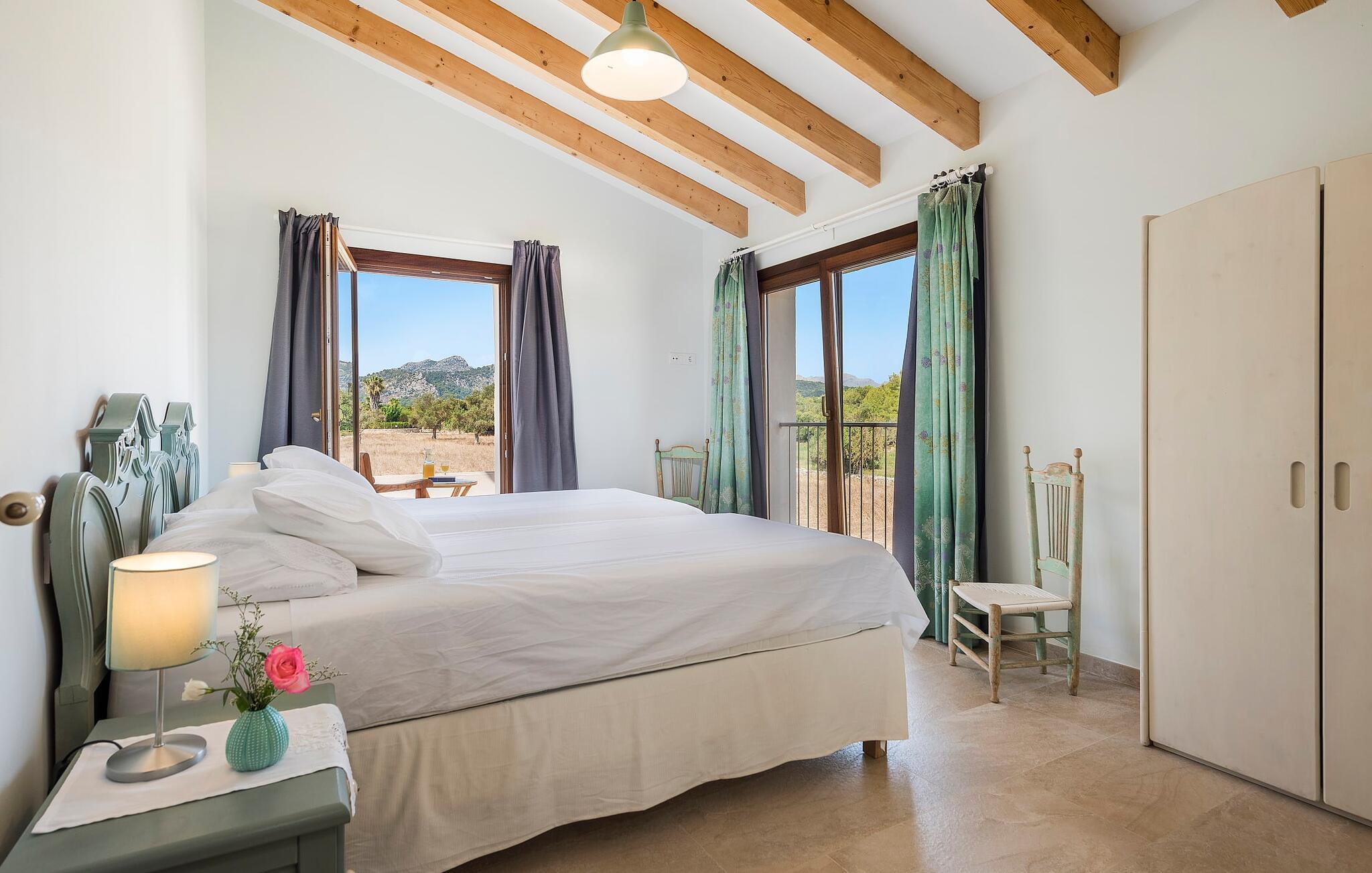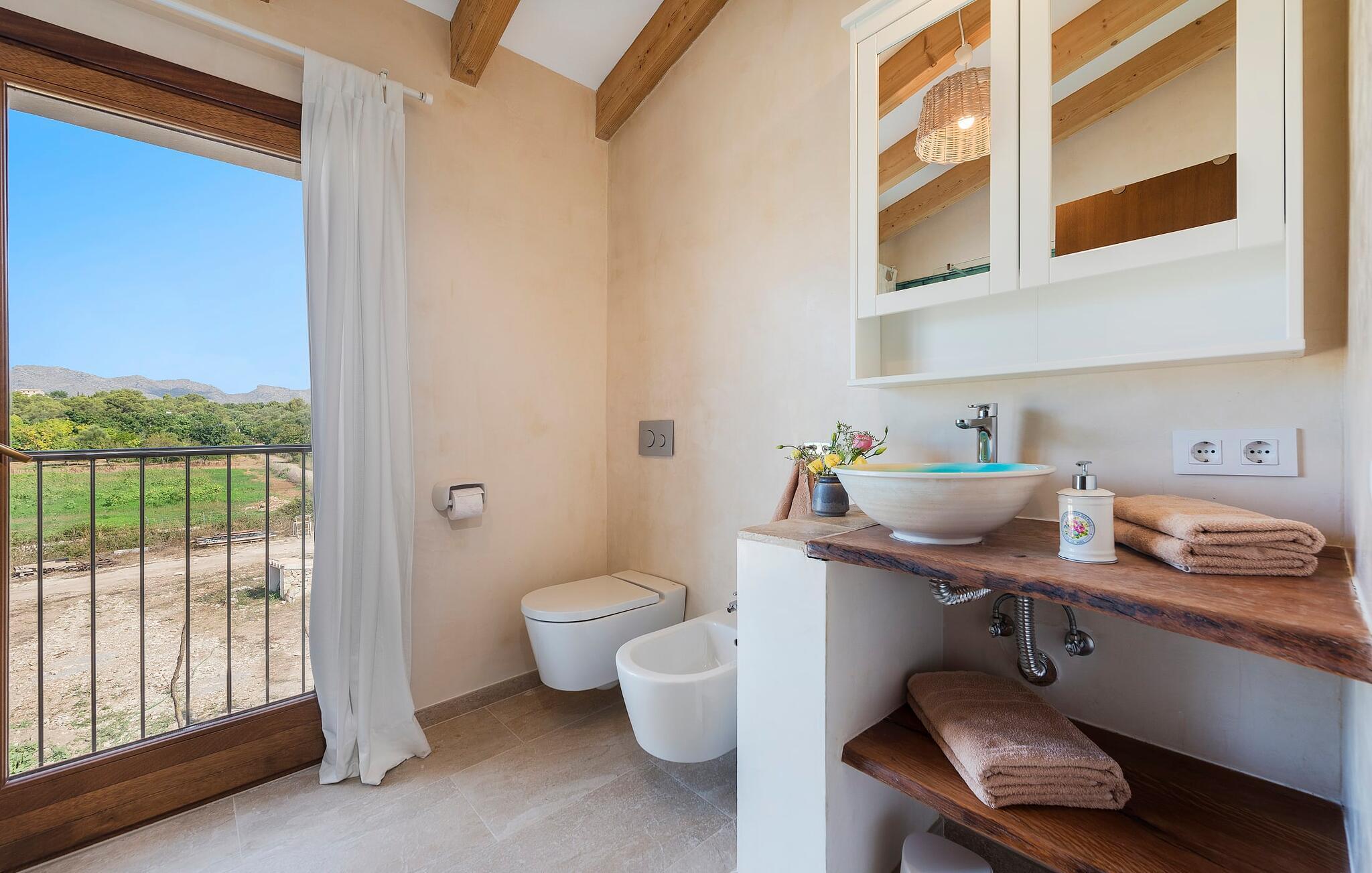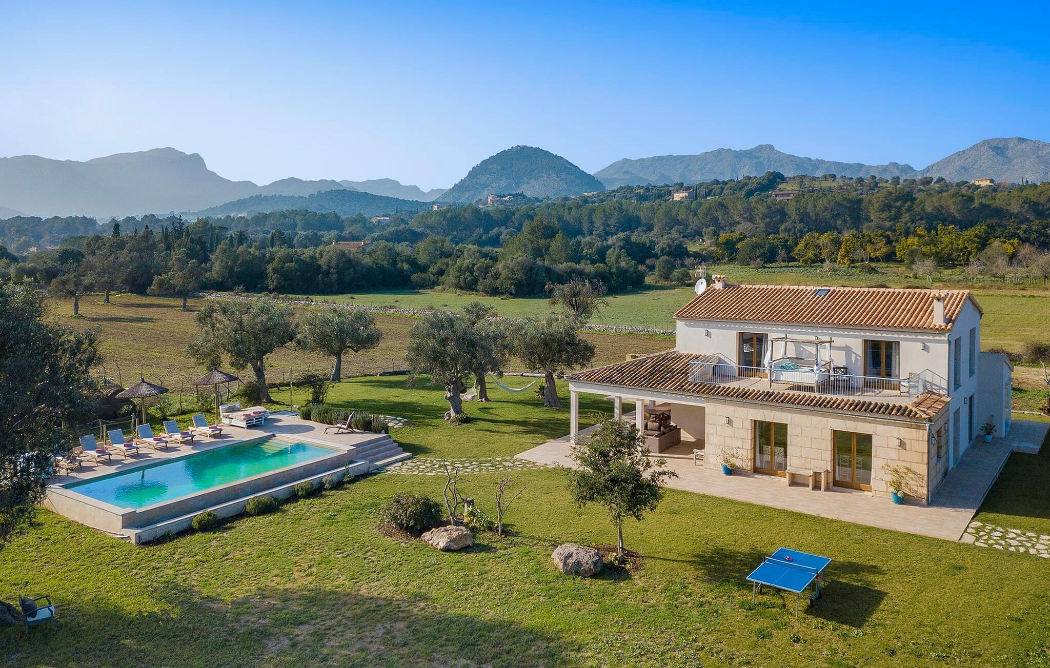 Velkommen til "Morell Nou", en særdeles smuk og eksemplarisk bæredygtigt designet finca. Et fantastisk udendørsområde med ærværdige træer (f.eks. et oliventræ, der er over 1000 år gammelt) er udstyret med adskillige siddemuligheder. I skyggen af de gamle træer kan du nyde naturen og slappe af i hængekøjen. Slap af på komfortable liggestole eller på den balinesiske seng. Morgenmad på den overdækkede terrasse, en sundowner i chill loungen eller en grill tilberedt i det store udekøkken - det sociale samvær er meget vigtigt her. I en helt ugenert, afsondret beliggenhed kan du nyde fordelene ved en meget veludviklet region. Som en ekstra service arrangerer de venlige ejere gerne transport af lejecykler til fincaen. Så intet står i vejen for din aktive ferie ved at udforske nordens bugter. Der er også lagt stor vægt på detaljerne i det indre af den renoverede finca, som skaber en utrolig charme med en høj feel-good-faktor. Både familier og vennegrupper vil sætte pris på dette. Gammelt kombineres med nyt, og derfor passer det fritlagte murværk særligt godt sammen med møbler i landlig stil med vintage flair. Du kan nyde udsigten over haven fra både den rummelige stue og det fuldt udstyrede køkken med en afslappet råhvid kogeø og spiseplads. De mange gulv-til-loft-vinduer forbinder dig direkte med det omgivende terrasselandskab. Her er der tænkt på meget, især for gæster - huset med sin barrierefri etværelses lejlighed i stueetagen er også velegnet til mennesker med handicap. Udover et soveværelse med et stilfuldt en-suite badeværelse er der en ekstra stue (pejsen kan ikke bruges her) og direkte udgang til haven. De andre soveværelser med dobbeltsenge (et med eget badeværelse og et andet badeværelse med bruseniche) er placeret på øverste etage. Særligt rart er, at du fra hvert af disse afslapningsrum også har udgang enten til tagterrassen med bred havudsigt eller til en anden, mindre terrasse. Så når du står op om morgenen kan du nyde den mest vidunderlige udsigt, som denne skønne ejendom byder på året rundt, især da huset har gulvvarme. “Morell Nou” er derfor en rigtig klassiker i et nytænkende og flot design. Det traditionelle landsted i et nyt udseende kaldet "Morell Nou" ligger i en vidunderlig, afsondret beliggenhed nær Pollença-bugten og byen af samme navn i den nordlige del af øen. På cirka 15 minutter i bil kan du ikke kun nå golfbanen i Pollença og kystnaturparken l'Albufereta, men også de attraktive byer og smukke strande, der kendetegner Pollença-bugten. Alene den brede udsigt over havet og de majestætiske bjerge viser tydeligt denne regions mangfoldighed. Dette er et Fincallorca feriehus.