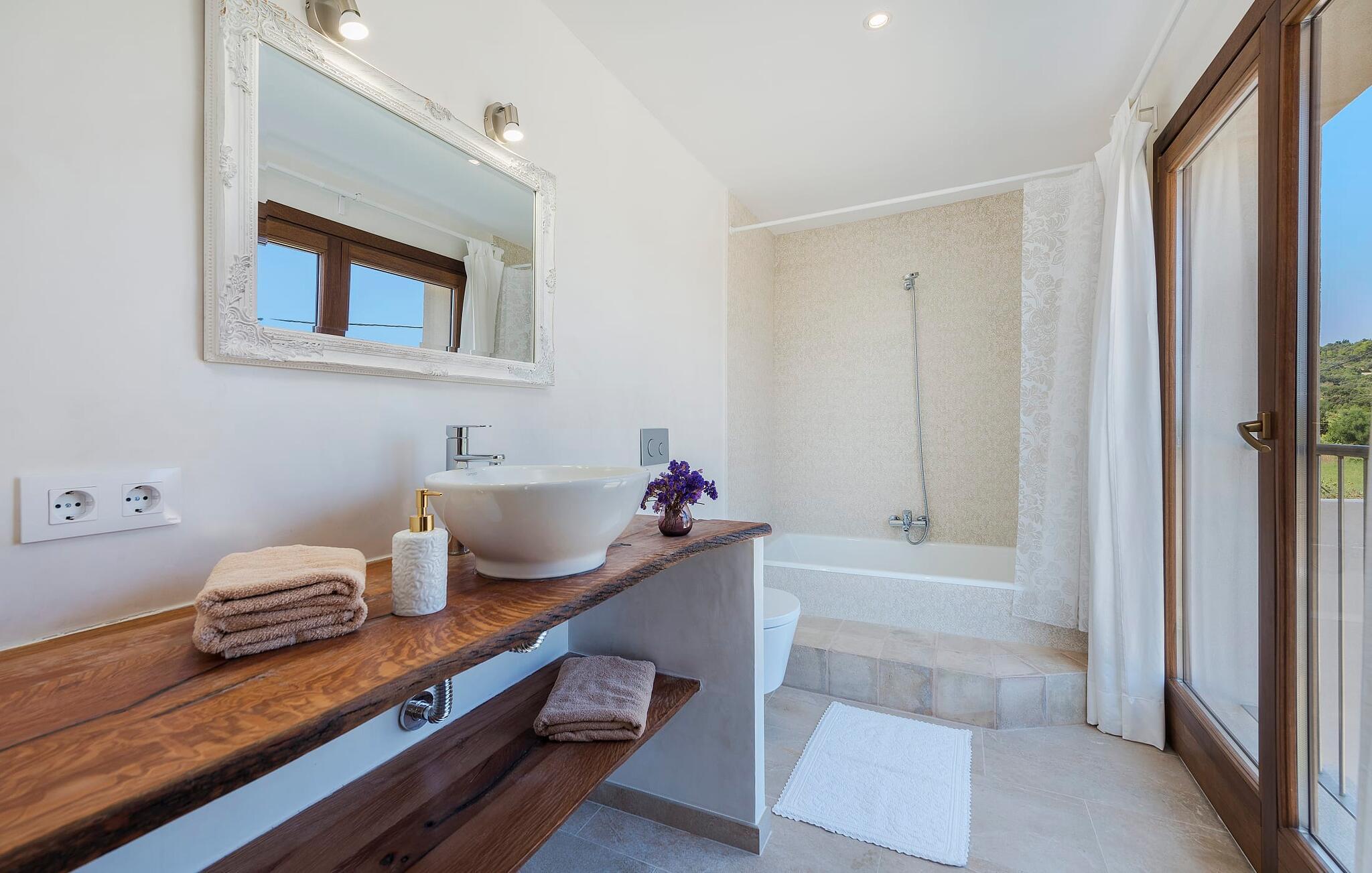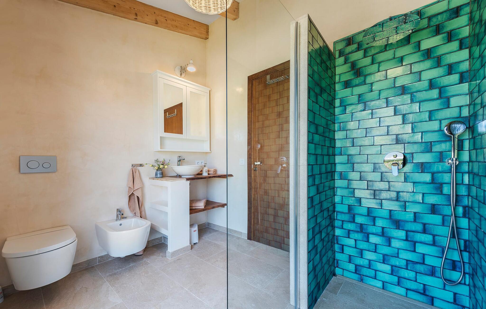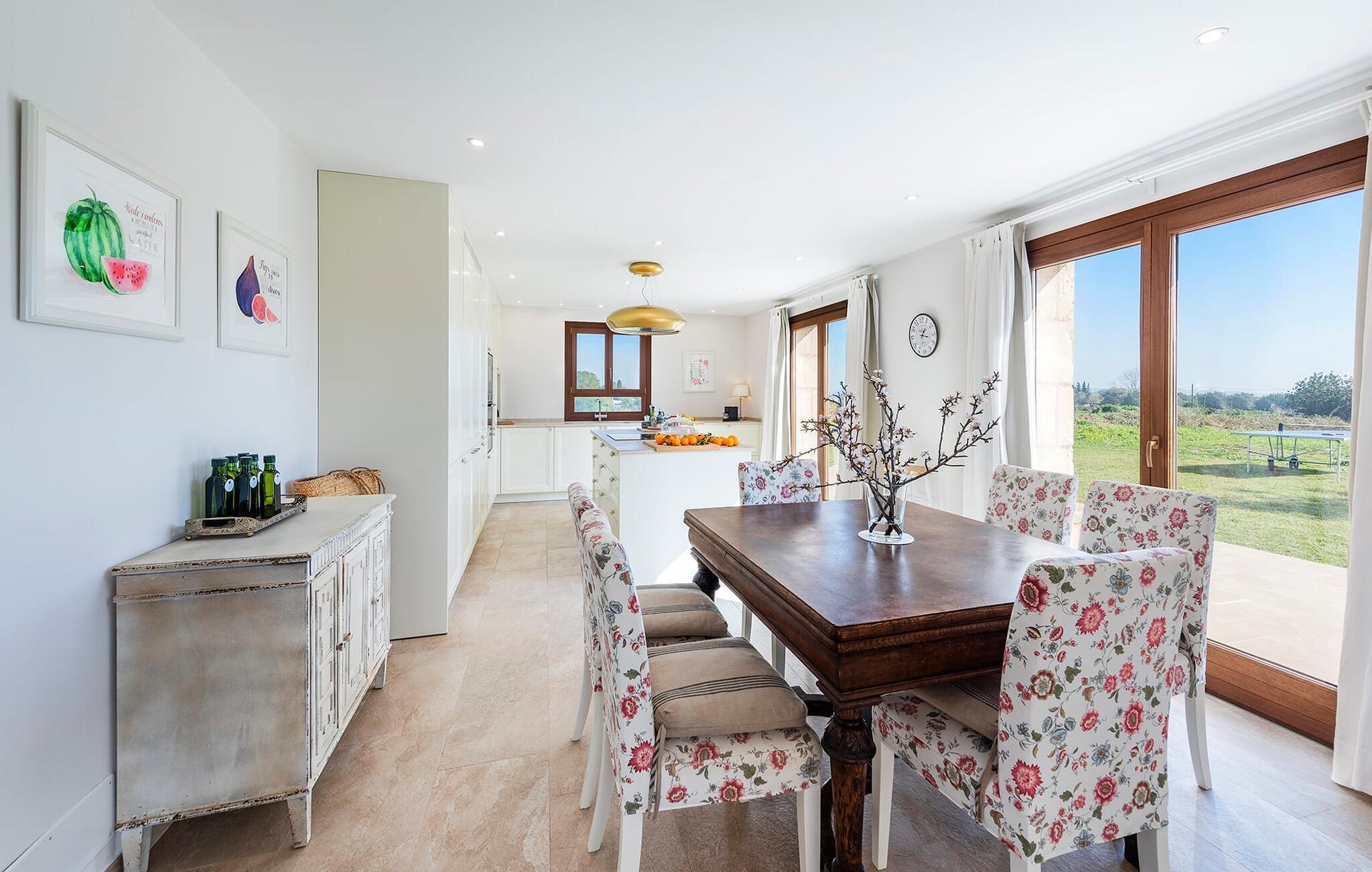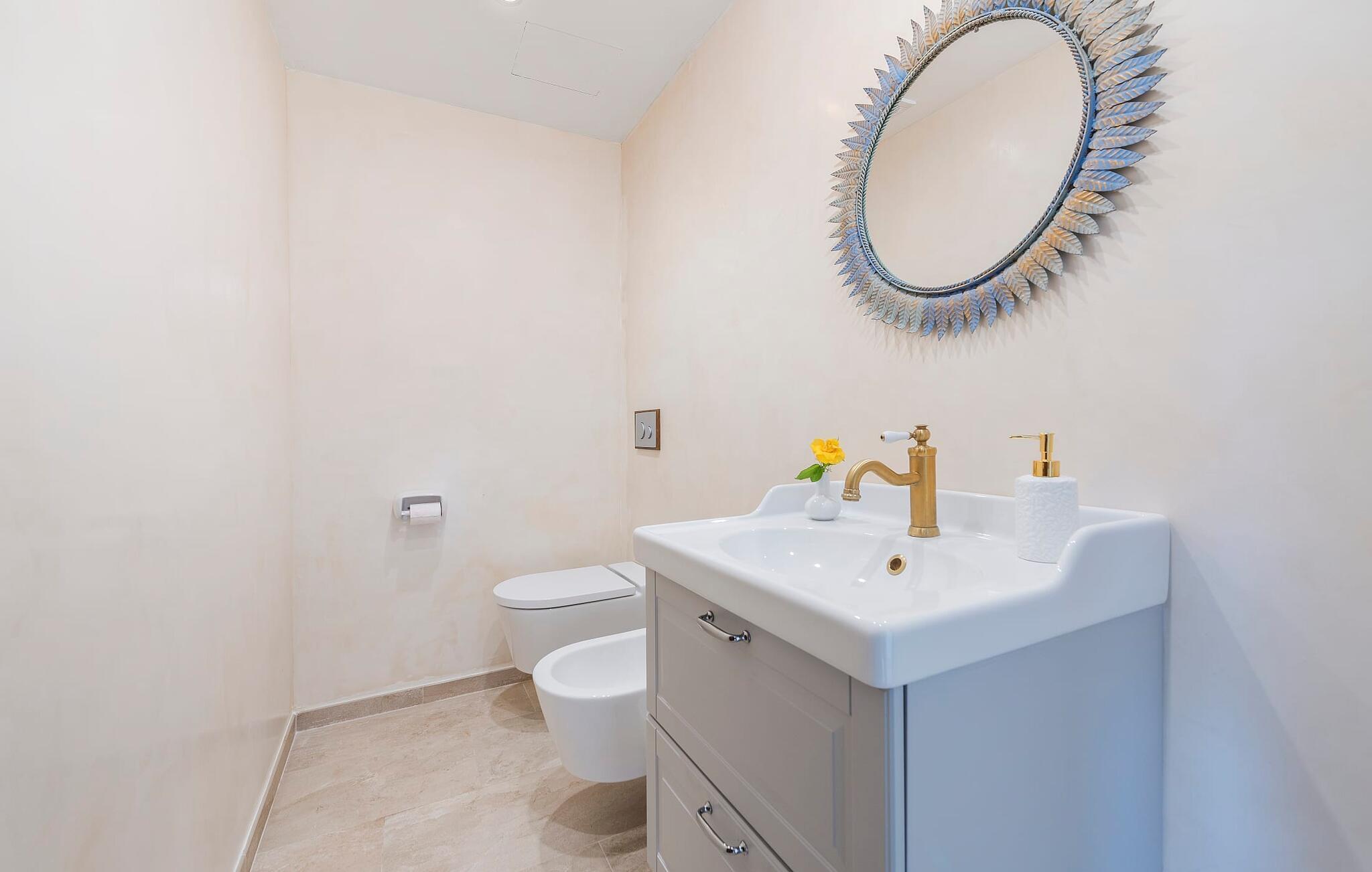 Velkommen til "Morell Nou", en særdeles smuk og eksemplarisk bæredygtigt designet finca. Et fantastisk udendørsområde med ærværdige træer (f.eks. et oliventræ, der er over 1000 år gammelt) er udstyret med adskillige siddemuligheder. I skyggen af de gamle træer kan du nyde naturen og slappe af i hængekøjen. Slap af på komfortable liggestole eller på den balinesiske seng. Morgenmad på den overdækkede terrasse, en sundowner i chill loungen eller en grill tilberedt i det store udekøkken - det sociale samvær er meget vigtigt her. I en helt ugenert, afsondret beliggenhed kan du nyde fordelene ved en meget veludviklet region. Som en ekstra service arrangerer de venlige ejere gerne transport af lejecykler til fincaen. Så intet står i vejen for din aktive ferie ved at udforske nordens bugter. Der er også lagt stor vægt på detaljerne i det indre af den renoverede finca, som skaber en utrolig charme med en høj feel-good-faktor. Både familier og vennegrupper vil sætte pris på dette. Gammelt kombineres med nyt, og derfor passer det fritlagte murværk særligt godt sammen med møbler i landlig stil med vintage flair. Du kan nyde udsigten over haven fra både den rummelige stue og det fuldt udstyrede køkken med en afslappet råhvid kogeø og spiseplads. De mange gulv-til-loft-vinduer forbinder dig direkte med det omgivende terrasselandskab. Her er der tænkt på meget, især for gæster - huset med sin barrierefri etværelses lejlighed i stueetagen er også velegnet til mennesker med handicap. Udover et soveværelse med et stilfuldt en-suite badeværelse er der en ekstra stue (pejsen kan ikke bruges her) og direkte udgang til haven. De andre soveværelser med dobbeltsenge (et med eget badeværelse og et andet badeværelse med bruseniche) er placeret på øverste etage. Særligt rart er, at du fra hvert af disse afslapningsrum også har udgang enten til tagterrassen med bred havudsigt eller til en anden, mindre terrasse. Så når du står op om morgenen kan du nyde den mest vidunderlige udsigt, som denne skønne ejendom byder på året rundt, især da huset har gulvvarme. “Morell Nou” er derfor en rigtig klassiker i et nytænkende og flot design. Det traditionelle landsted i et nyt udseende kaldet "Morell Nou" ligger i en vidunderlig, afsondret beliggenhed nær Pollença-bugten og byen af samme navn i den nordlige del af øen. På cirka 15 minutter i bil kan du ikke kun nå golfbanen i Pollença og kystnaturparken l'Albufereta, men også de attraktive byer og smukke strande, der kendetegner Pollença-bugten. Alene den brede udsigt over havet og de majestætiske bjerge viser tydeligt denne regions mangfoldighed. Dette er et Fincallorca feriehus.