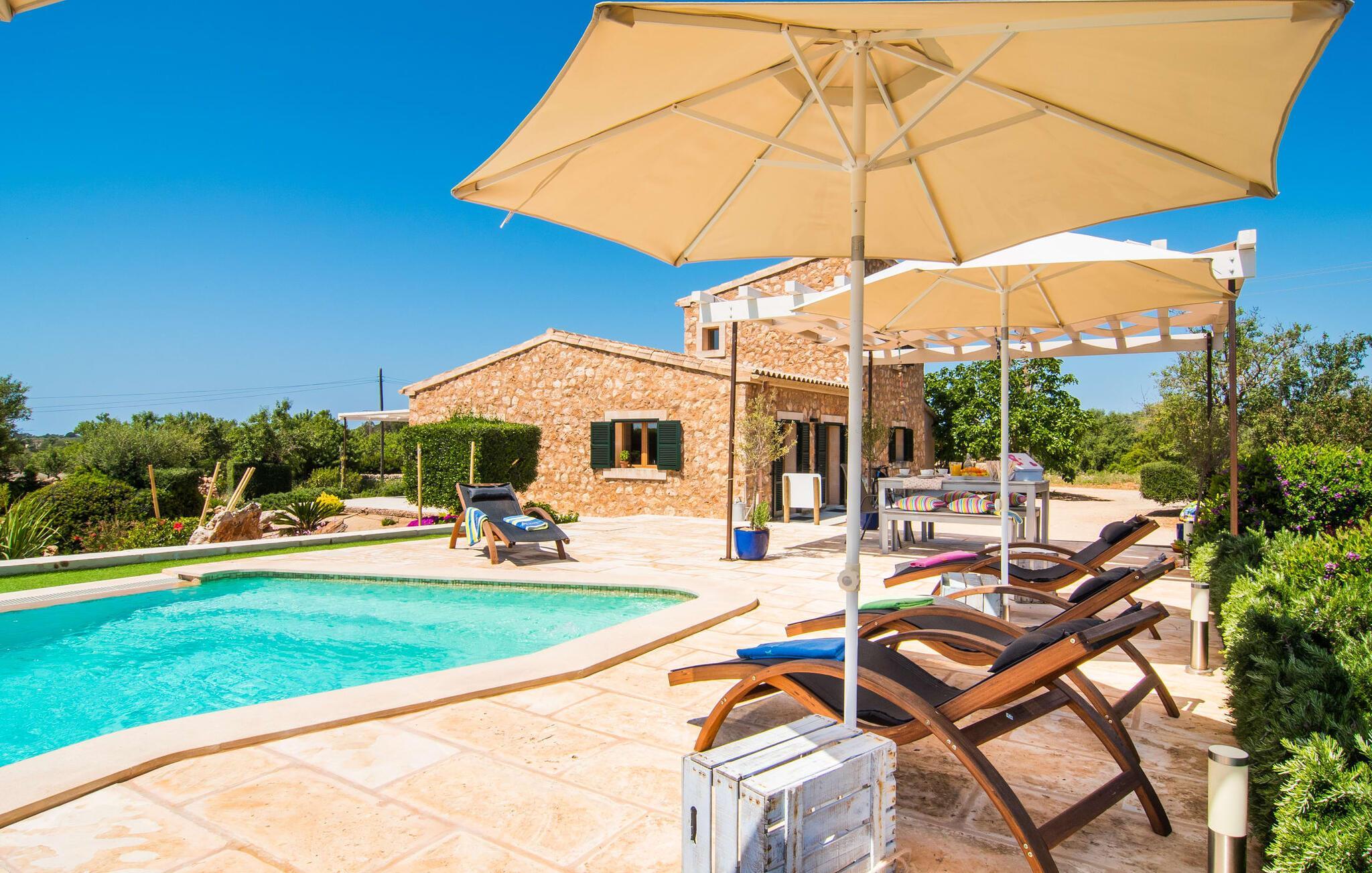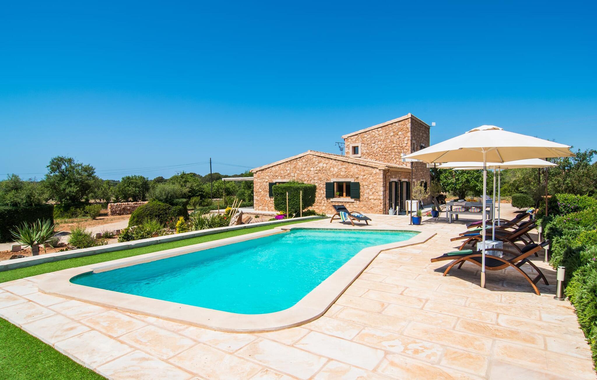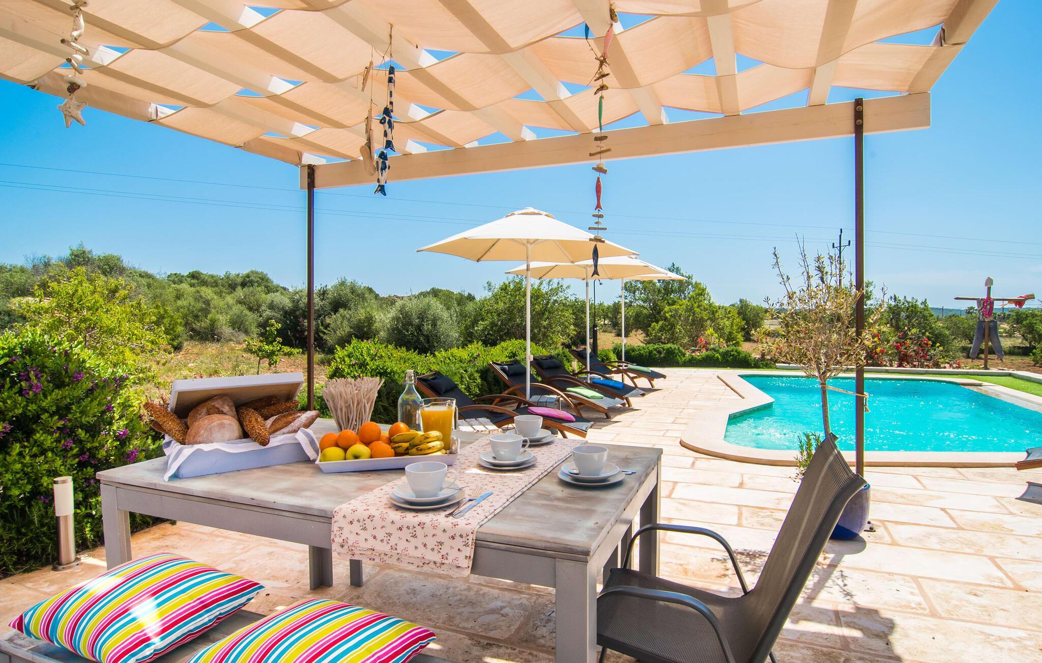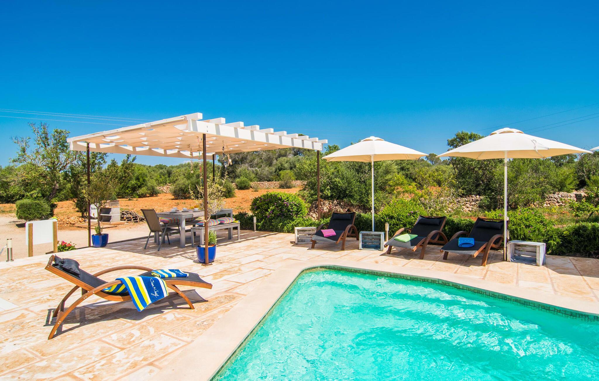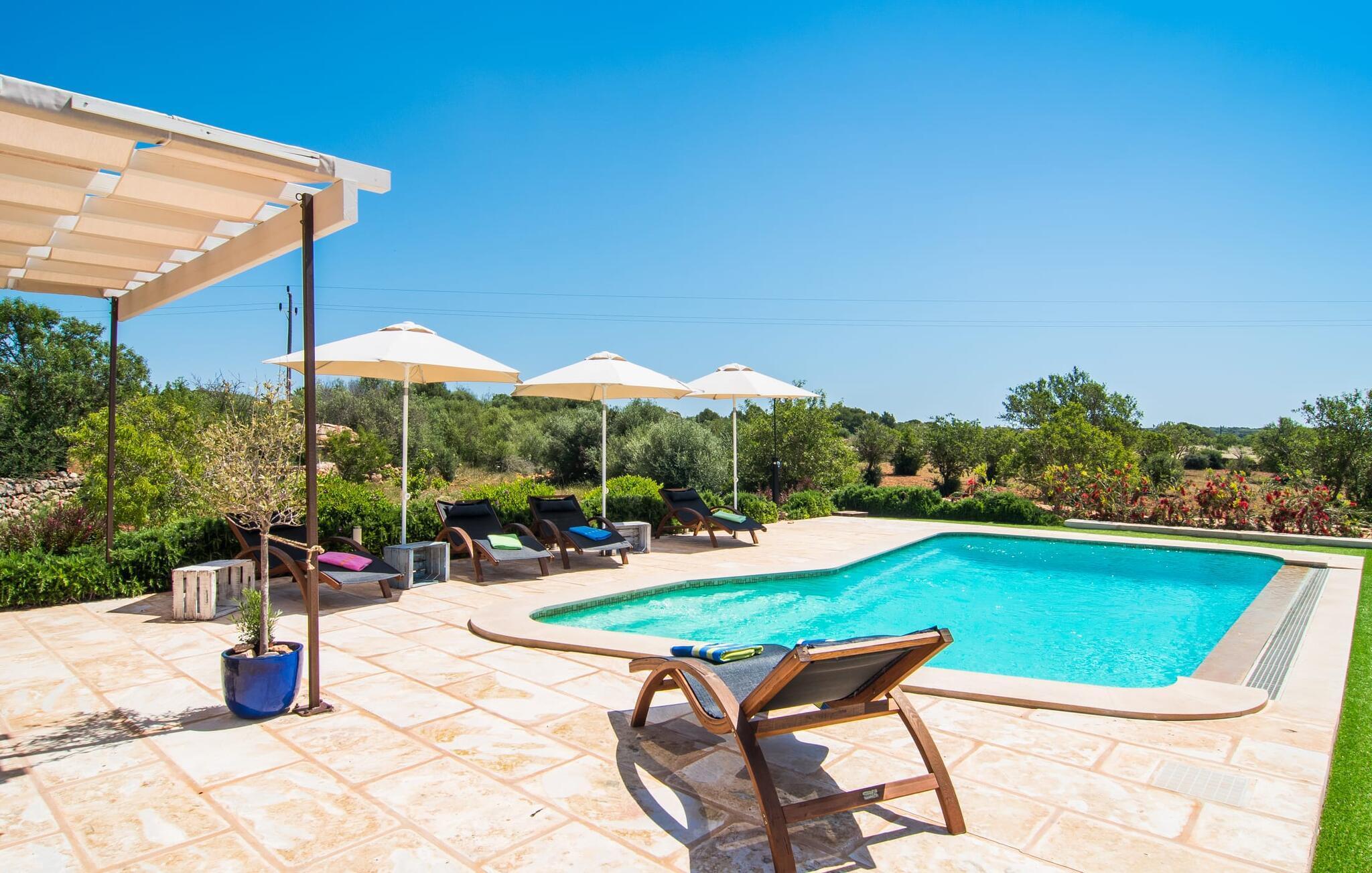 Da vi besøgte villaen “Morell”, blev vi mødt af et behageligt rummeligt, delvist naturligt landskab, hvor midt i var et malerisk hus omgivet af terrasser. Det bliver hurtigt klart for os, at ejerne har lagt en masse kærlighed og omsorg i designet og indretningen af denne villa. Terrassen ved huset er udstyret med fortelt, og vi opdager hurtigt, at den er ideel til at sidde udenfor. Dette er et sted, hvor du kan blive et stykke tid og se i det fjerne. Det er også et godt sted at dele et måltid med alle. Det er praktisk også det bedste sted at holde øje med den let forhøjede pool - og også børnene, der plasker i vandet undervejs. Store, brede trappetrin fører ned til den glitrende turkise pool - et vidunderligt sted at tilbringe varme sommerdage. Uanset om du boltrer dig i vandet eller tager et par omgange, vil du altid finde en måde at køle af og forfriske dig selv her. Liggestole under parasollerne er det perfekte sted til rolige afslapningssessioner, hvor du bare kan slappe af. Overvej før din ferie at læse en god bog og tage den med udenfor sammen med en kølig drink, så du kan nyde din udendørsferie så behageligt som muligt. På den modsatte side af huset er der endnu en terrasse møbleret med elegante stole og et interessant bord lavet af forsendelsespaller. Denne ret originale måde at opdele terrassen i to zoner gør, at forskellige områder kan bruges på samme tid, så du nemt kan have lidt privatliv selv inden for din gruppe.