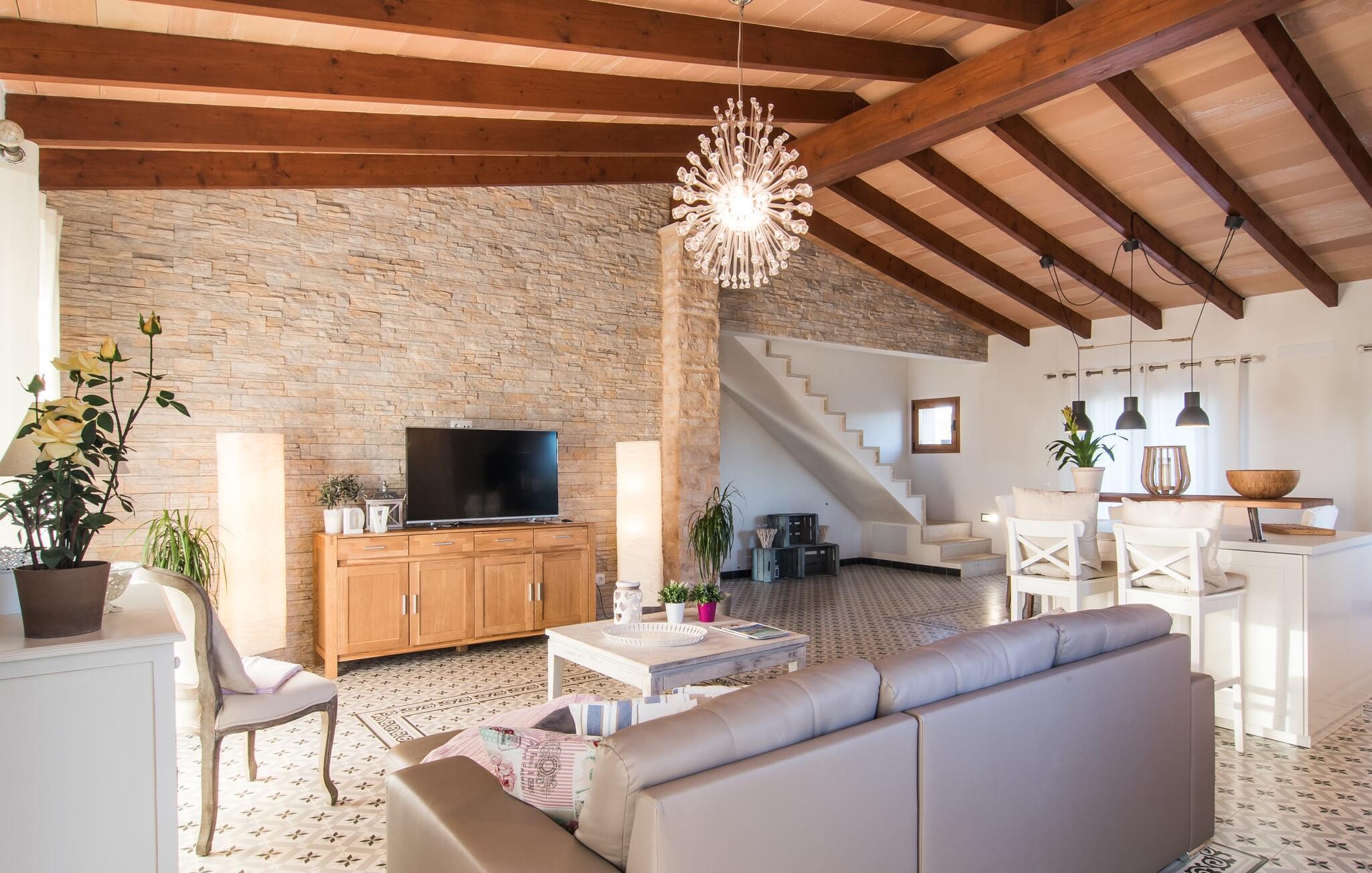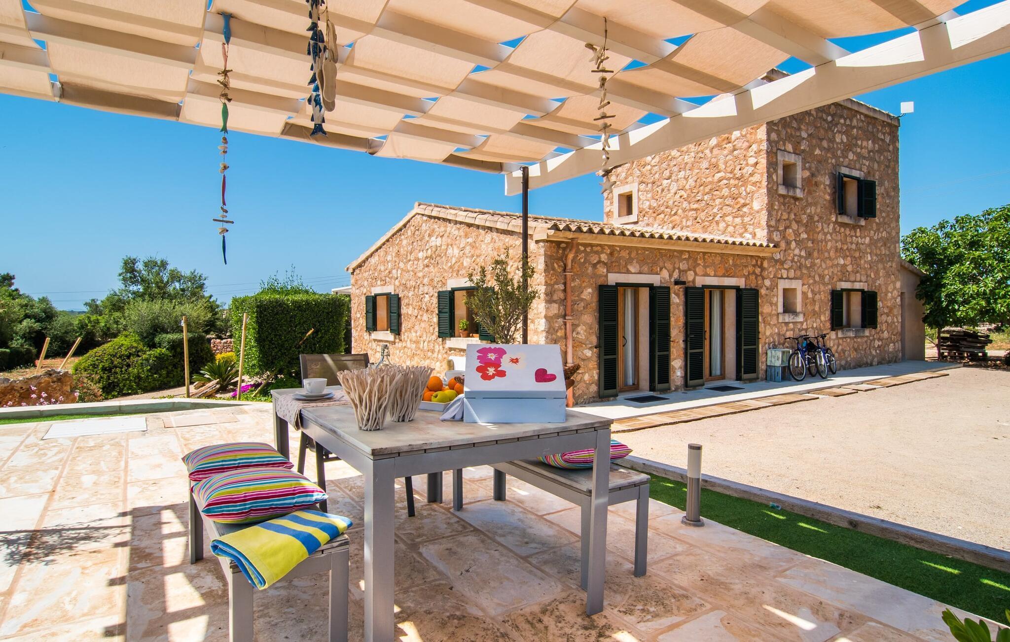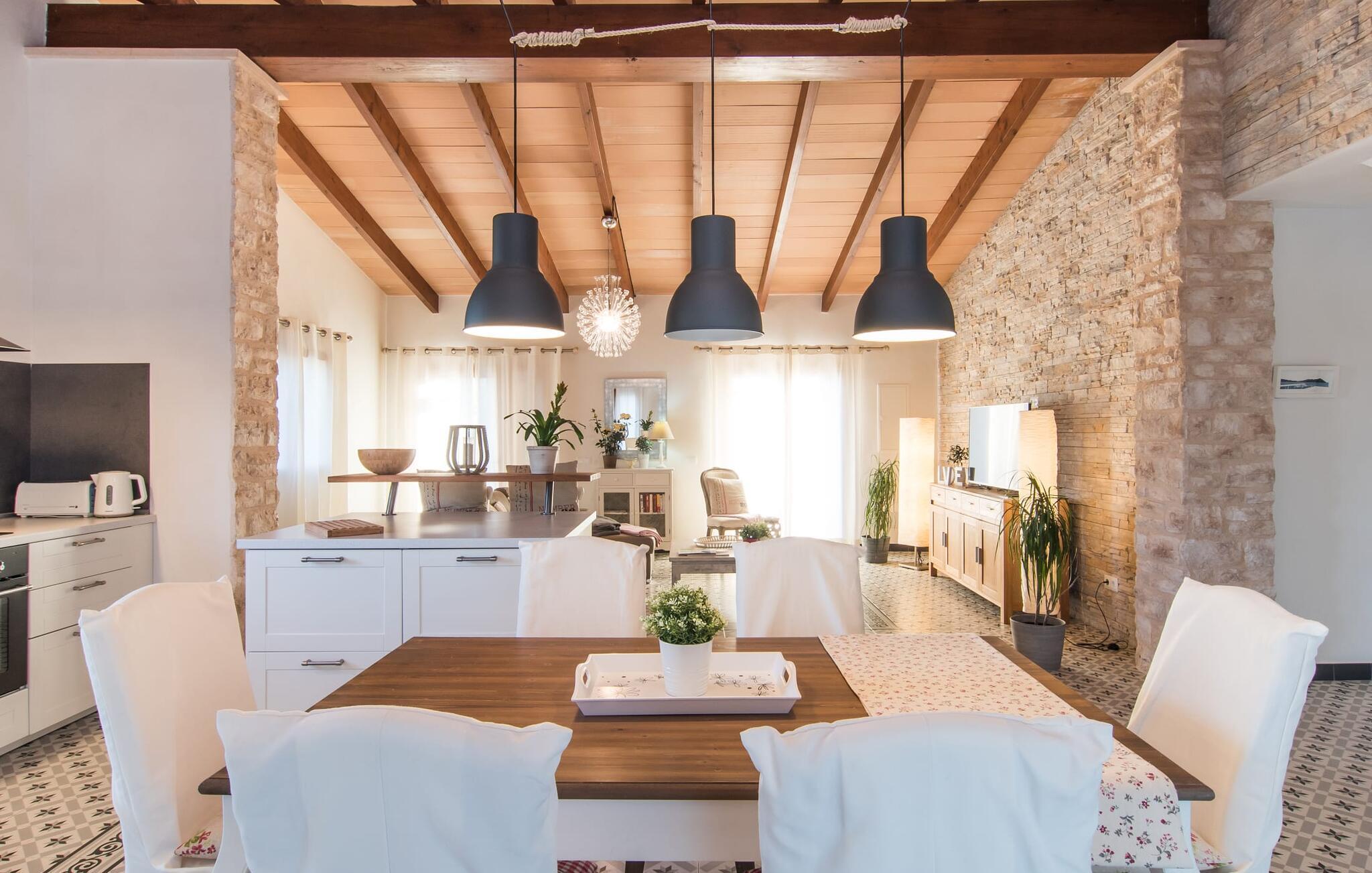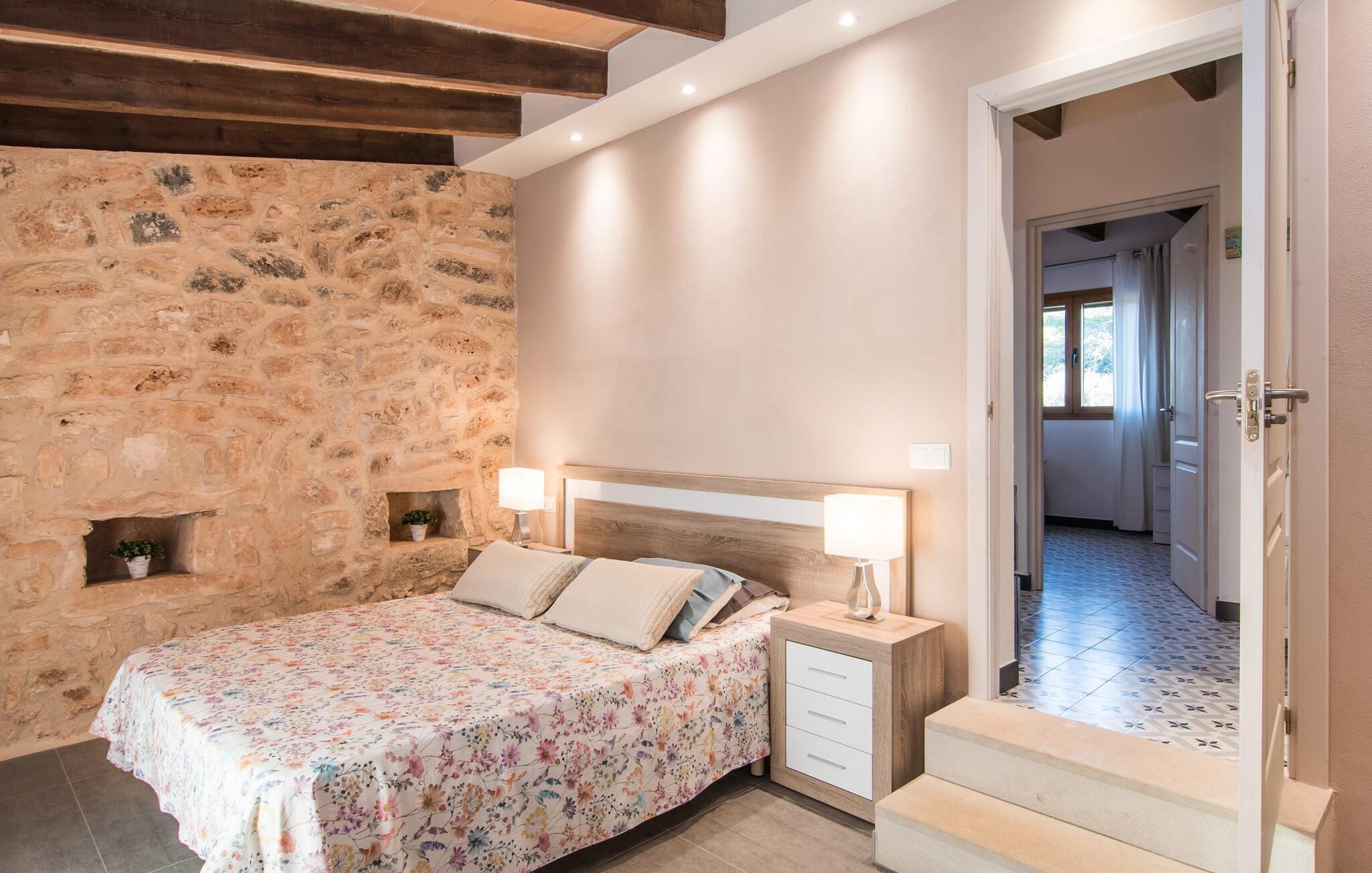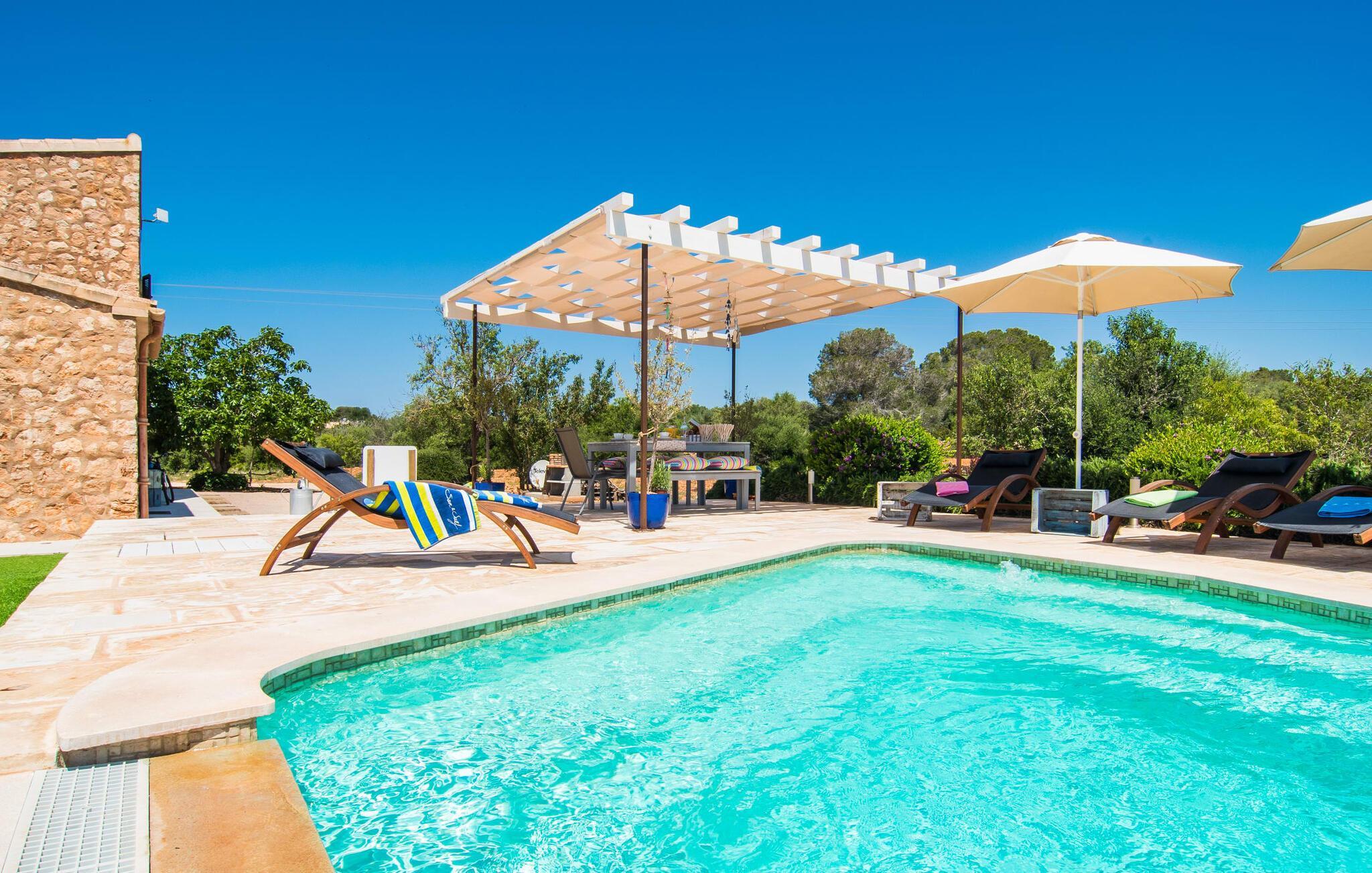 Da vi besøgte villaen “Morell”, blev vi mødt af et behageligt rummeligt, delvist naturligt landskab, hvor midt i var et malerisk hus omgivet af terrasser. Det bliver hurtigt klart for os, at ejerne har lagt en masse kærlighed og omsorg i designet og indretningen af denne villa. Terrassen ved huset er udstyret med fortelt, og vi opdager hurtigt, at den er ideel til at sidde udenfor. Dette er et sted, hvor du kan blive et stykke tid og se i det fjerne. Det er også et godt sted at dele et måltid med alle. Det er praktisk også det bedste sted at holde øje med den let forhøjede pool - og også børnene, der plasker i vandet undervejs. Store, brede trappetrin fører ned til den glitrende turkise pool - et vidunderligt sted at tilbringe varme sommerdage. Uanset om du boltrer dig i vandet eller tager et par omgange, vil du altid finde en måde at køle af og forfriske dig selv her. Liggestole under parasollerne er det perfekte sted til rolige afslapningssessioner, hvor du bare kan slappe af. Overvej før din ferie at læse en god bog og tage den med udenfor sammen med en kølig drink, så du kan nyde din udendørsferie så behageligt som muligt. På den modsatte side af huset er der endnu en terrasse møbleret med elegante stole og et interessant bord lavet af forsendelsespaller. Denne ret originale måde at opdele terrassen i to zoner gør, at forskellige områder kan bruges på samme tid, så du nemt kan have lidt privatliv selv inden for din gruppe.