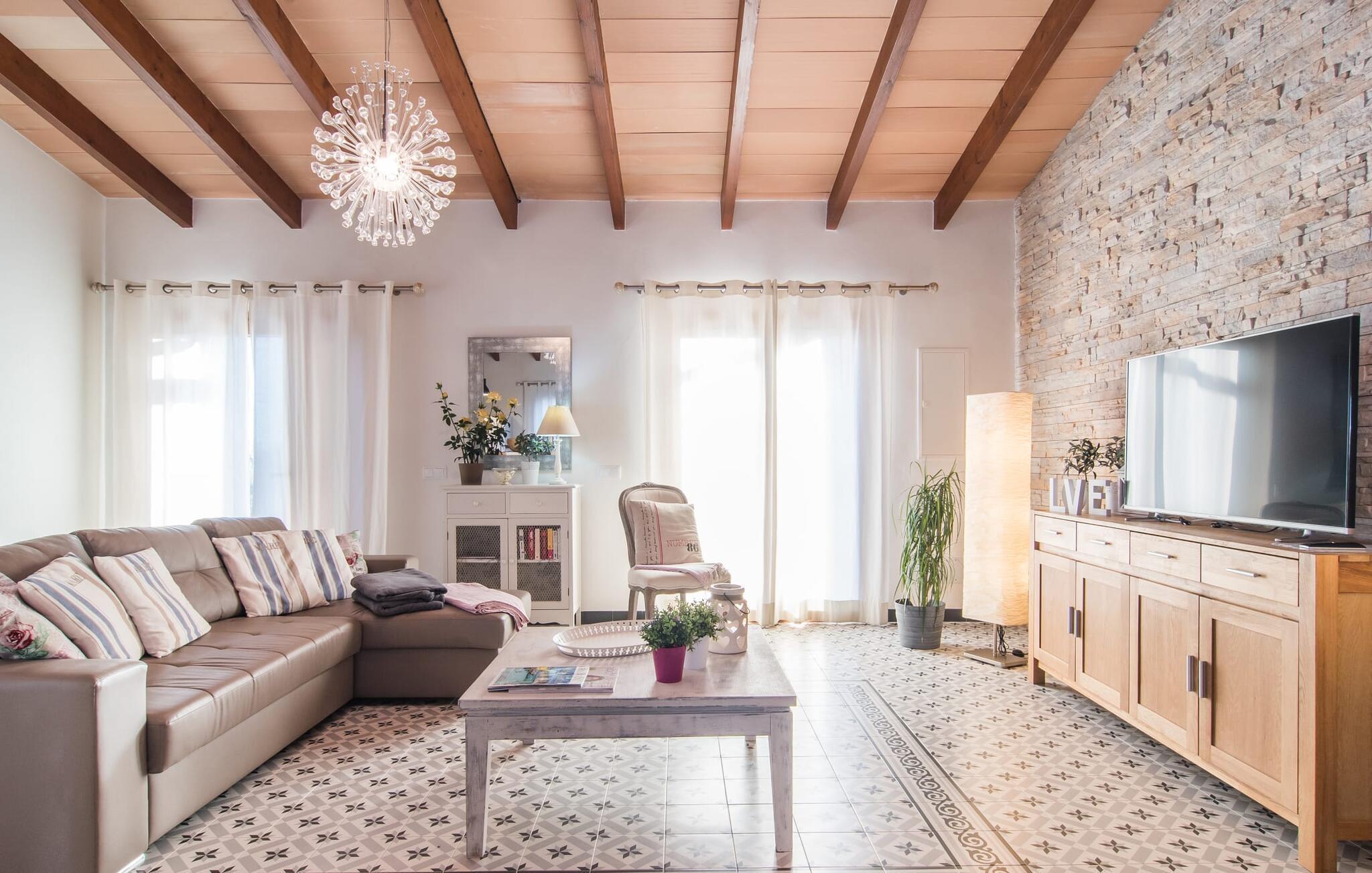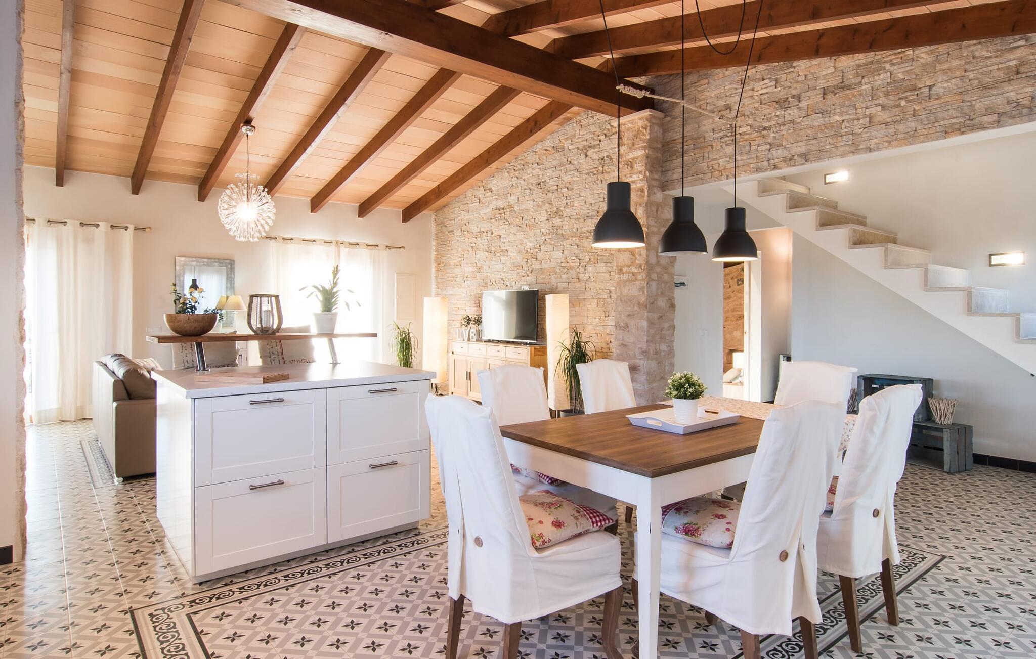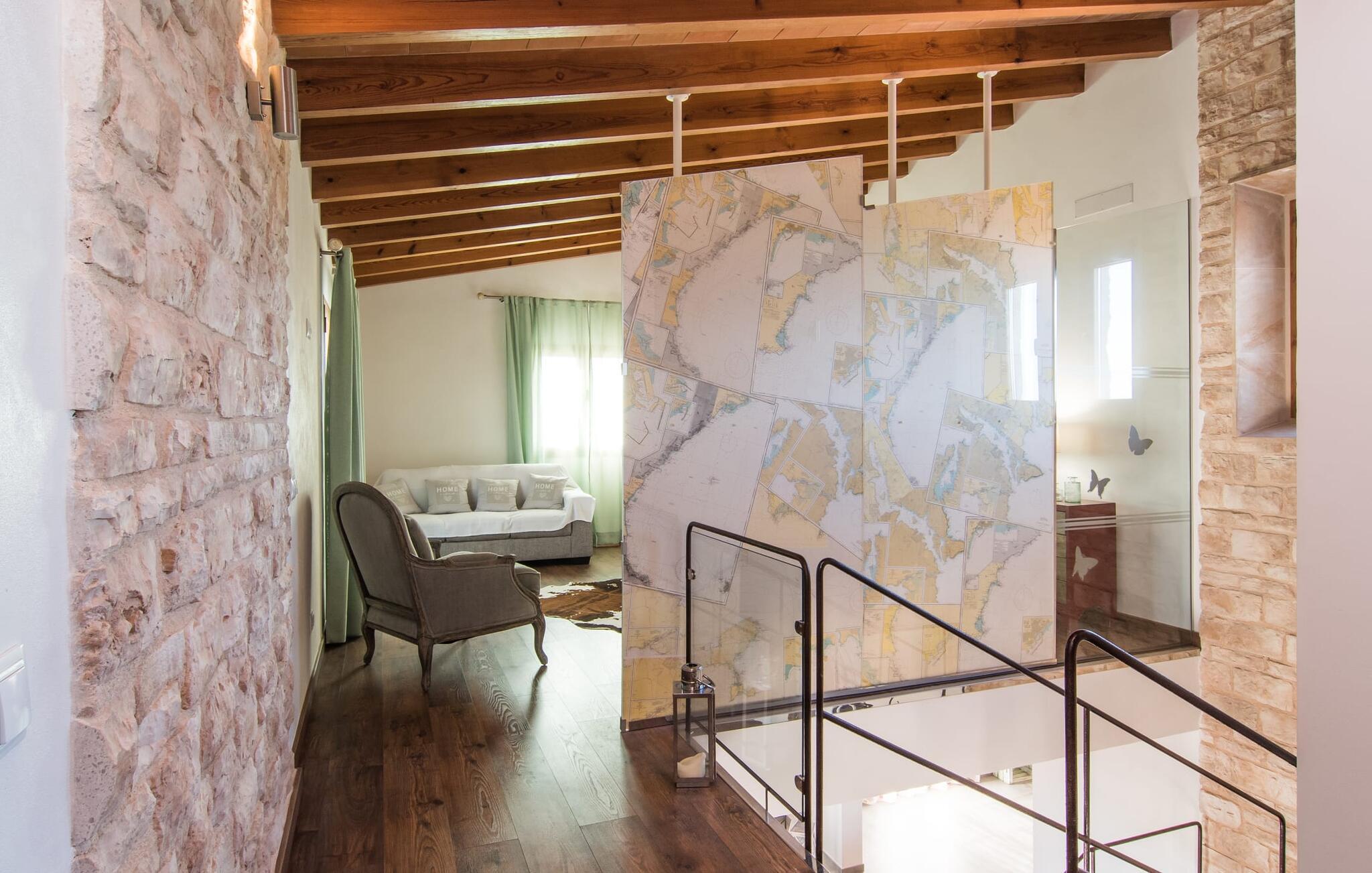 Vi er meget spændte på at se, om husets inderside lever op til dets løfte udvendigt. Og det vil heller ikke svigte os! En stor åben stue/spisestue med integreret køkken ser særdeles indbydende ud og giver lyst til at fortsætte turen gennem dette charmerende værelse. De skrå synlige bjælker i rummet over os og det smukke klinkegulv, som vi står alene på, overbeviser os om husets unikke æstetik. Det delvist frilagte murværk, de lette vægge og gardiner samt de omhyggeligt draperede møbler er med til at perfektionere dette indtryk. De mangfoldige muligheder, som denne luksuriøse opholdsstue tilbyder, spænder fra afslappende timer på sofaen foran tv'et og spisning sammen ved det elegante spisebord til at skrive e-mails til dem derhjemme og tilberede måltider sammen i det fuldt udstyrede køkken med højkvalitets apparater såsom keramisk kogeplade, ovn, mikroovn, køleskab med fryser, elkedel og kaffemaskine. To soveværelser og et badeværelse er også placeret i stueetagen og ovenpå er der et tredje soveværelse med en-suite badeværelse. Hvert af soveværelserne fortryller på sin egen måde takket være små individuelle detaljer, der giver disse i forvejen meget smukke rum en ekstra atmosfære. Fra rustikke stenvægge til antikt udseende klinkegulve til synlige bærende søjler, alt bidrager til en ret unik, men alligevel hyggelig charme. Vælg dit personlige yndlingssted og find den afslapning, du leder efter - uanset om det er at gå i seng eller tage en middagssiesta! I overensstemmelse med husets overordnede koncept er badeværelserne også meget smagfuldt designet. De tilbyder møbler af høj kvalitet, hårtørrere og plads nok til alle.