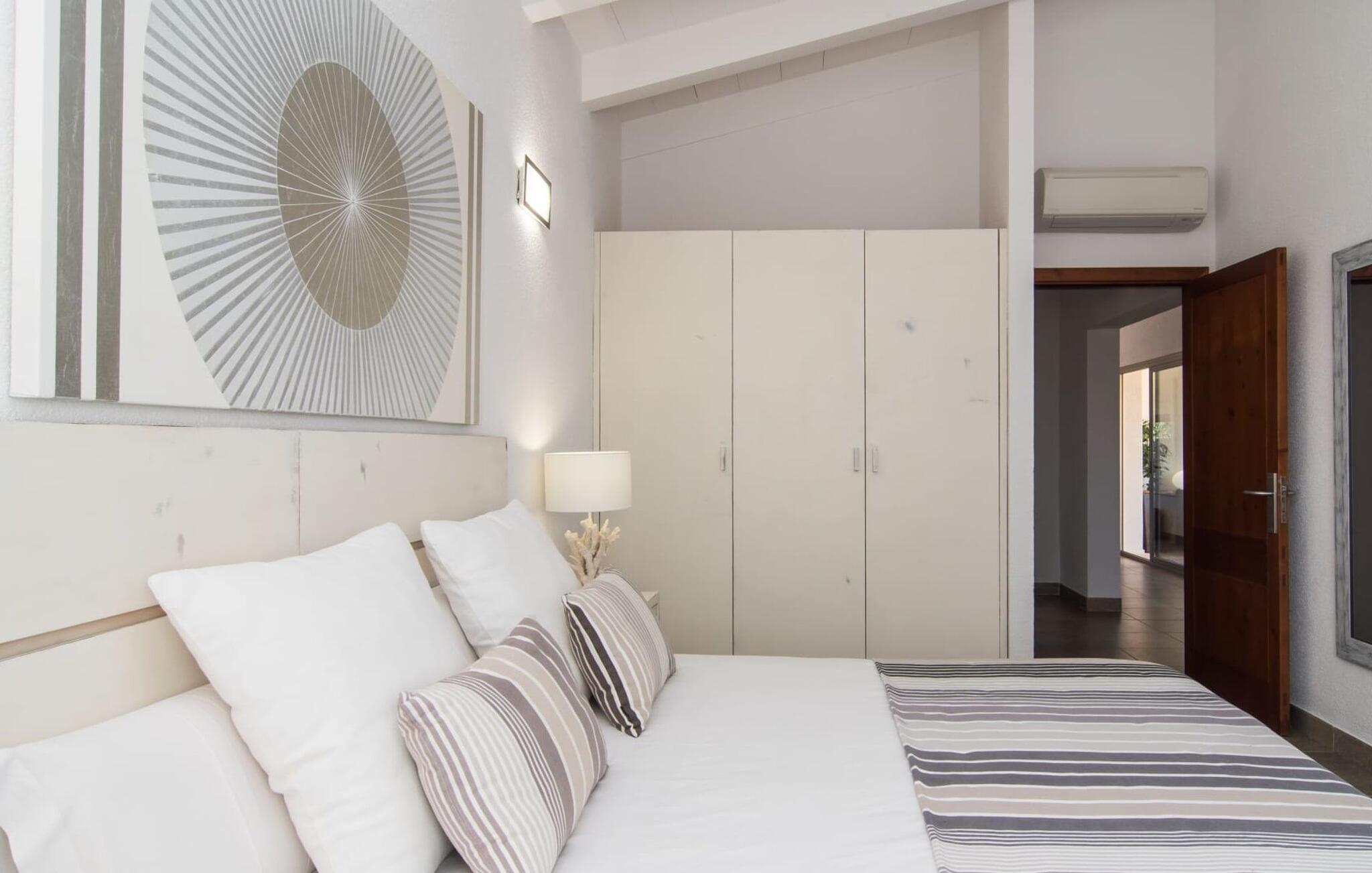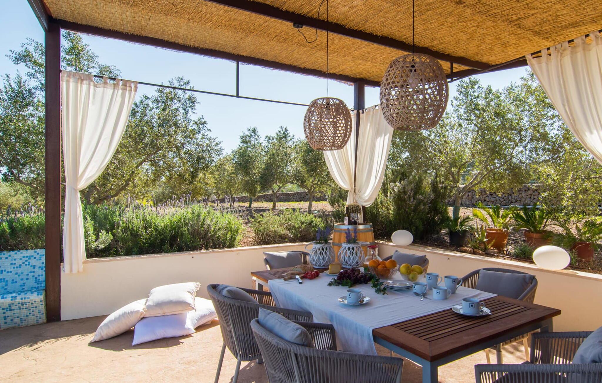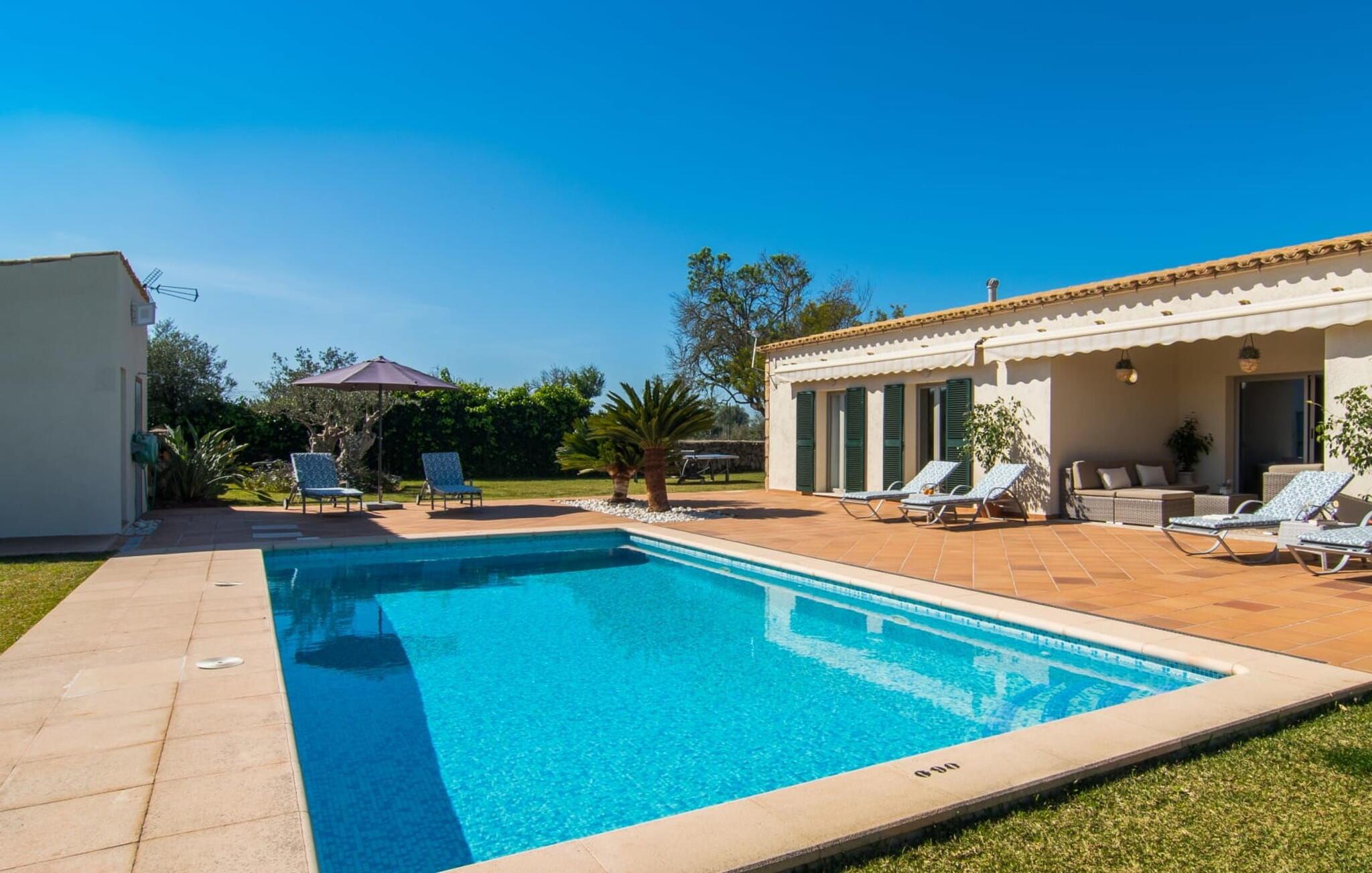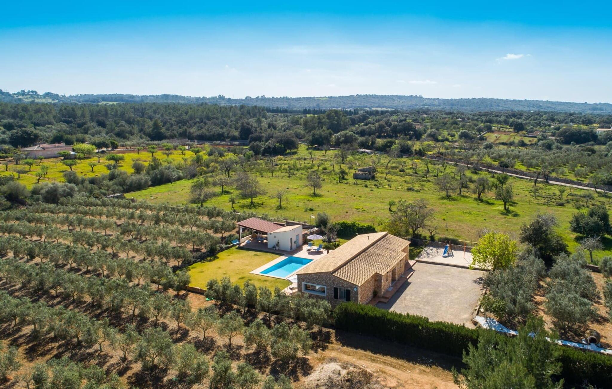 Muronita, Murochen er en dejlig destination, da S'Albufera-regionen er kendt for sit mangfoldige udvalg af saftige frugter og grøntsager, der appellerer til både voksne og børn. Dette er et Fincallorca feriehus. Ejendommen har en legeplads med gynger og rutsjebane, der giver rigelig plads til børn og giver dem et trygt miljø at lege og udforske. Voksne kan slappe af væk fra stress og jag. Poolen ved siden af terrassen tilbyder et forfriskende alternativ til havet. Siddeområdet i rattan indbygget i væggene inviterer gæster til at nyde en god bog i skyggen, mens de holder øje med poolen. Det rummelige og veludstyrede udekøkken er perfekt til at tilberede måltider og er udstyret med gardiner, der kan forvandle det til et luftigt telt. Gennem terrassedørene kommer du ind i opholds- og spiseafdelingen, indrettet i jordfarver og iøjnefaldende indretning, der skaber en beroligende atmosfære efter en aktiv dag med svømning, gå- eller cykelture. De tre soveværelser byder på en blanding af mørke og lyse kontraster, suppleret med beroligende kunst. To badeværelser, inklusive et ensuite, imødekommer gæsternes behov, mens en lang gang giver ekstra legeplads til børn. Nyd en vidunderlig familieferie omgivet af regionens livlige smag! Denne moderne naturstensvilla ligger bag Alcúdia-bugten, kun 2 km fra den nordlige mallorcanske landsby Muro. Fra "Muronita" kan du hurtigt udforske alle retninger via Ma-13 Palma-Inca-Alcúdia. Havet er (næsten) inden for rækkevidde: den fine sandstrand bugt Playa de Muro (ca. 5,5 km lang) og turistdiversiteten i Can Picafort er bestemt en kort køretur værd.