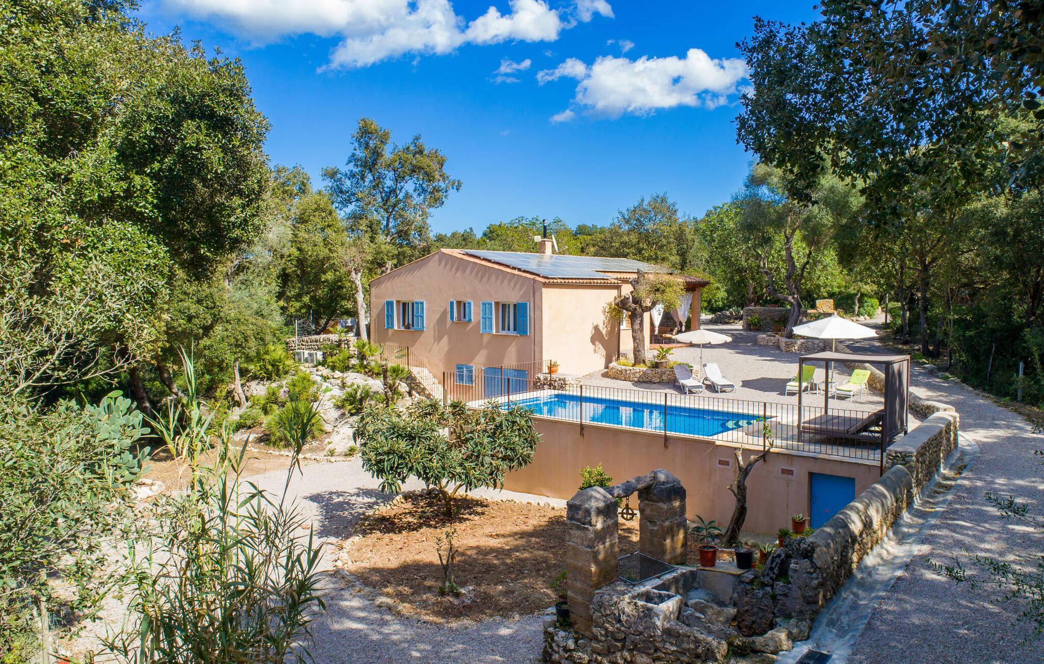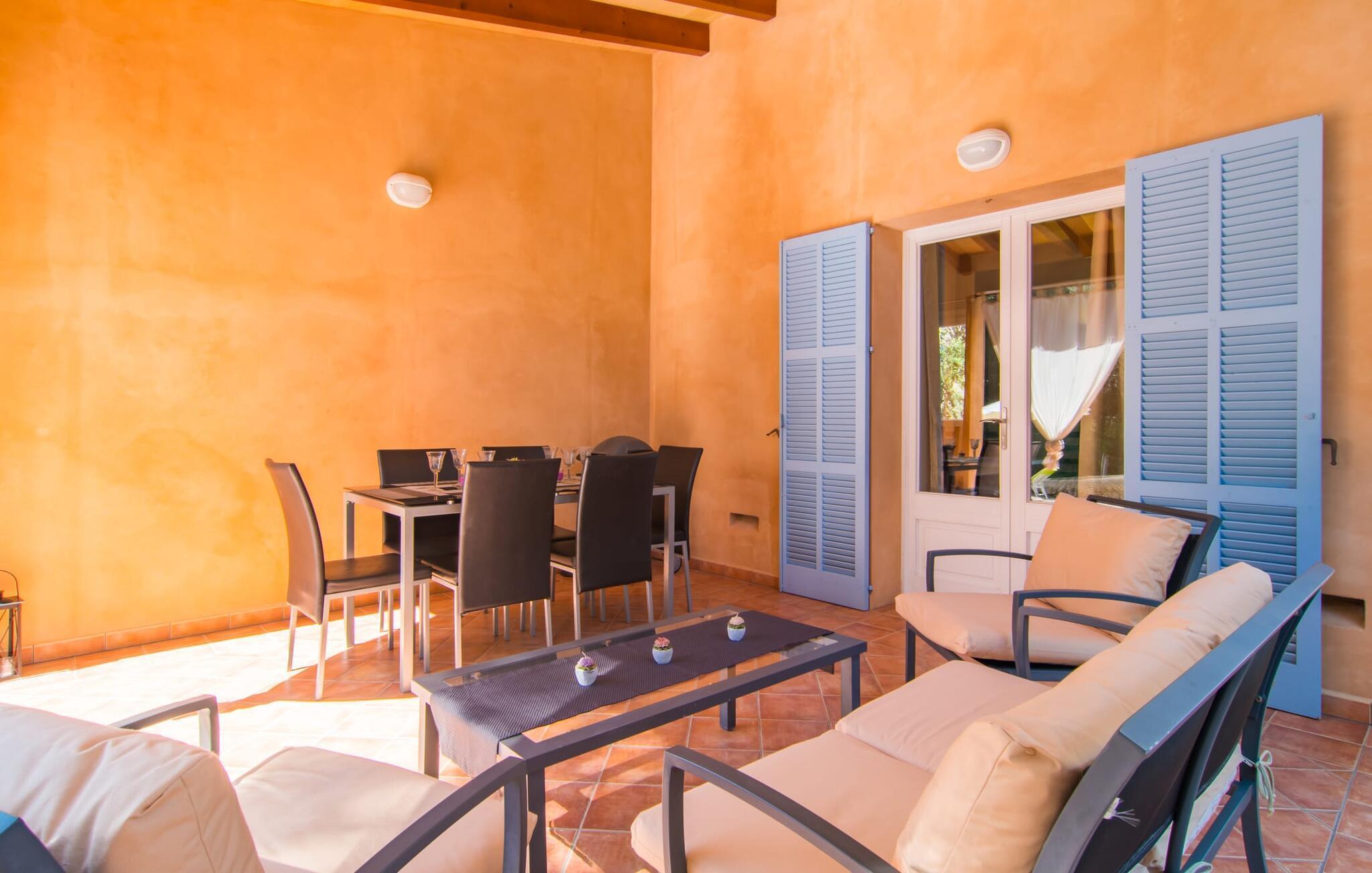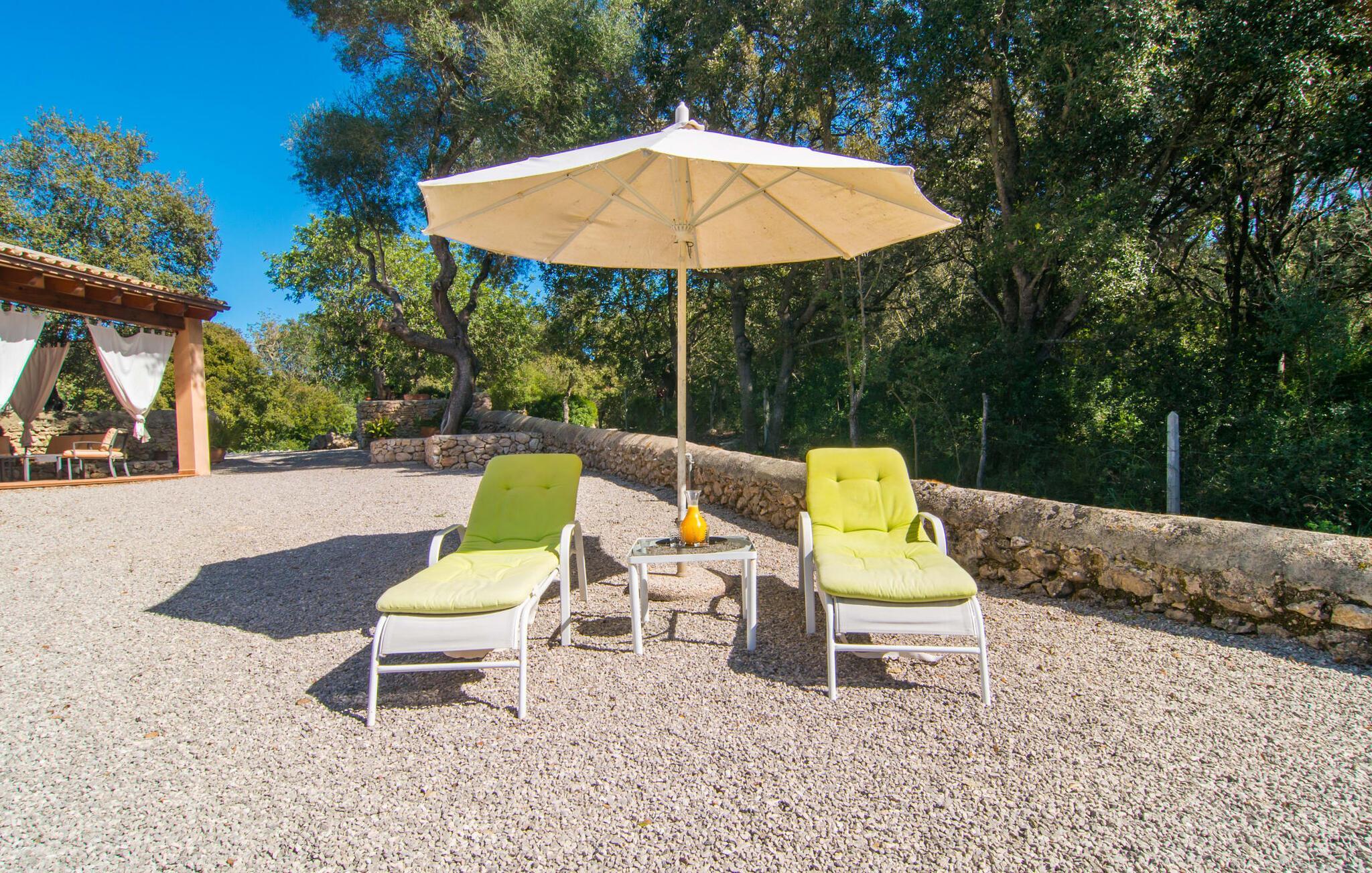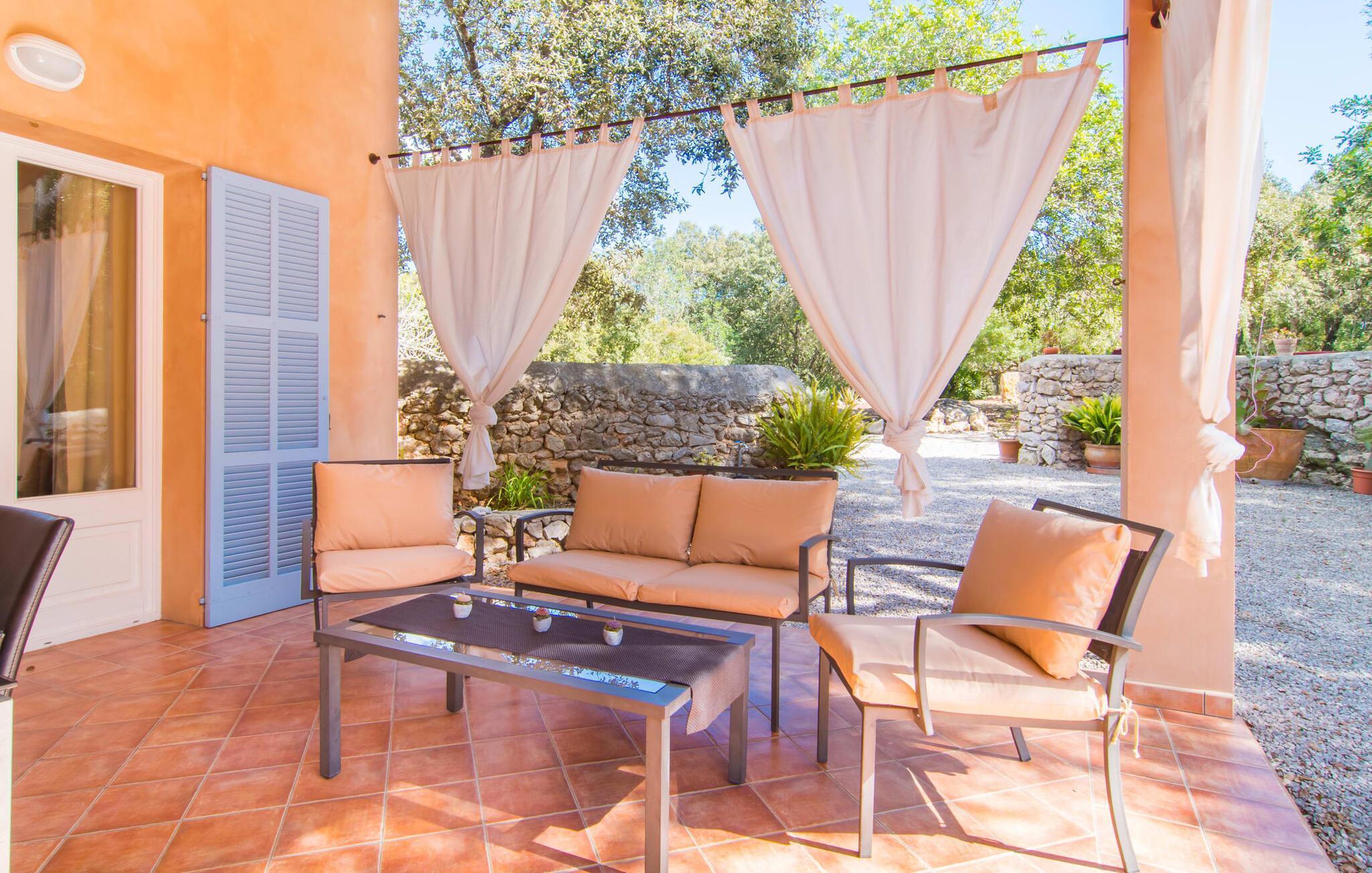 Velkommen til det venlige tilflugtssted i Villa "Na Creu Vella". Her finder du absolut fred og landlig idyl, for det terracottafarvede nye hus er omgivet af en naturhave og ligger midt i en stor stenegeskov - helt tilbagetrukket fra udsigten, med kun få naboer (en hest) . stald er ikke langt væk). Det betyder, at du kan nyde poolen i fuldstændig privatliv og derefter slappe af på solterrassen på en af de komfortable liggestole med bløde puder. Tilbring en hyggelig eftermiddag med at spille et brætspil på dine liggestole ved poolen, som om nødvendigt kan skygges med en parasol. Det gæstfrie hus med himmelblå skodder byder på et køligt sted at sidde på den overdækkede terrasse. Her er opsat ekstra lette gardiner, så du kan sidde og spise i skyggen uanset solens stilling. Ud over et spisebordssæt i høj kvalitet og en mobil grill er der en bred hængekøje, hvor du kan slappe af med en blid havbrise på huden og fuldt ud nyde din feries ubekymrede lethed. Dette er et Fincallorca feriehus. Verandaen fører til det indre af denne smukke villa. Her venter et dejligt stort værelse med dejligt højt til loftet og mange vinduespartier. Alle tre funktionelle områder, der venter dig til en afslappende ferie i villaen, forbliver åbne: bor foran en rustik pejs på en hyggelig ny sort sofa, spisning ved et langbord med komfortable træstole og madlavning i det meget smarte amerikanske designkøkken. Alt er lige ved hånden i det fuldt udstyrede køkken, som er inspirerende og helt ideelt til at lave mad sammen med børn eller venner. Dette område bliver samlingspunktet for alle morgener i villaen, hvor du kan planlægge din dag med en friskbrygget kop kaffe. De to soveværelser er rummelige og tilbyder nok opbevaringsplads til din feriegarderobe. En af dem har en stor dobbeltseng, mens den anden har to enkeltsenge, ideel til børn. Her er badeværelset fælles, hvilket der tages højde for af den moderne og højkvalitets indretning. Det er flisebelagt med en terracotta-farvet natursten, og brusekabinen er dekoreret med en delikat mosaik lavet af samme materiale. I dette velholdte miljø kan du simpelthen have det godt og finde ro, især hvis du værdsætter at være tæt på naturen. Vores luftfotos beviser den fremragende beliggenhed af Villa "Na Creu Vella", da du i baggrunden kan se middelalderbyen Artà, kun 2,5 km væk, og de bølgende bakker i Llevant-bjergene. Her, midt i et privat skovområde og samtidig tæt på byen, kan du nyde den skønne landlige ro. Artà byder på en malerisk gågade med individuelle butikker, hvor du kan slentre, slentre og få en kop kaffe på Plaça del Conquerodor. Et typisk mallorcansk ugentligt marked med frugt, grøntsager, kunsthåndværk, kyllinger og mere finder sted her hver tirsdag. At se travlheden, mens du nyder en lækker is eller en kølig drink, er en del af den glade feriestemning. Du kan også nyde livet på stranden, da strandene i øst, såsom Cala Bona eller Cala Agulla, samt Son Serra de Marina i Alcúdia-bugten, nemt kan nås med lejebil. Den gæstfrie, nybyggede villa “Na Creu Vella” ligger midt i en egeskov, i en absolut landlig idyl vest for den middelalderlige lille by Artà. Her kan du gøre dine daglige indkøb i små supermarkeder eller varierede friskvaremarkeder. Hvis du vil til stranden, anbefaler vi den livlige Cala Ratjada, kun et stenkast væk, eller besøg en af de smukke bugter i den østlige del af øen, såsom den naturlige strand Cala Mesquida.