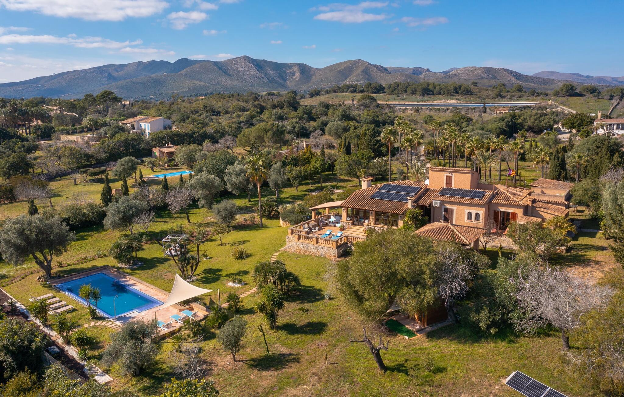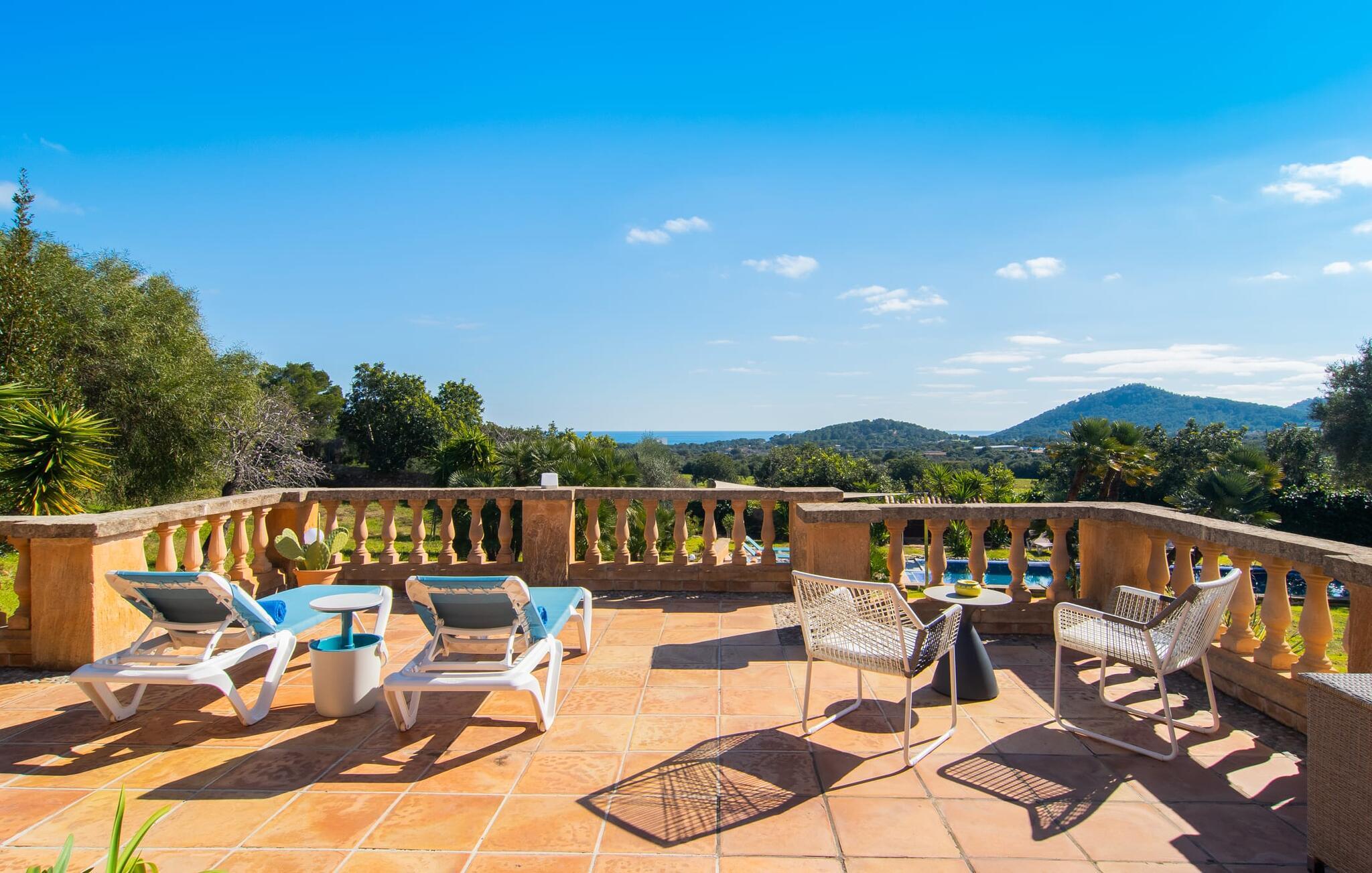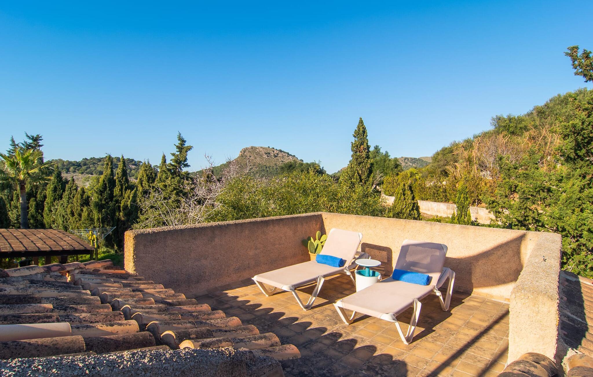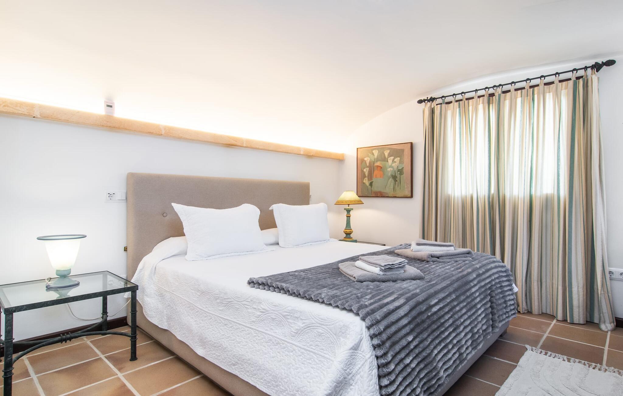 Det vidunderligt rolige feriehus "Na Nofre de Cala Ratjada" er omgivet af en rummelig have fuld af palmer, frugttræer og andre middelhavsplanter. I haveoasen vil I opdage den mosaikdækkede, klorfri pool. Den er opvarmet og kan derfor også bruges i lavsæsonen. Poolområdet har to udendørs brusere. Rundt om poolen er der liggestole i skyggen af markiser til en siesta eller den balinesiske dagseng til afslapning. Et andet højdepunkt er siddepladserne spredt ud over den spektakulære smukke have. På husets brolagte terrasser venter liggestole og et smart loungehjørne med markise. Efter en hyggelig grillaften på den overdækkede terrasse med spiseplads kan I slutte dagen af på tagterrassen med havudsigt. Der kan I nyde en uhindret panoramaudsigt over de bølgende bakker i Llevant-bjergene. Verandaen direkte ved huset byder på en anden spiseplads med en udendørs pejs. Hvis I værdsætter autentisk livsstil til jeres ferie på Mallorca, er dette charmerende og sofistikerede bondehus lige noget for jer. Det rustikke feriehus med moderne detaljer byder på masser af plads til op til 8 personer. Med sin opdeling i et hovedhus og en separat lejlighed kan dette store bondehus anbefales til at rejse med familien og især i flere generationer. I hovedhuset kan I nyde komforten i stuen med pejs og det separate køkken med spiseplads og smagfuld indretning. Der er fire soveværelser i alt (hvoraf det ene er et sammenhængende rum). Derudover er der to smarte badeværelser. Den separate lejlighed byder på kombineret opholds-, spise- og køkkenområde samt endnu et soveværelse og badeværelse. Der er adgang til en privat terrasse. “Na Nofre de Cala Ratjada” giver lyst til at tage på ferie til Mallorca. Vi kan ikke vente! Det idylliske bondehus "Na Nofre de Cala Ratjada" imponerer med sin opvarmede pool og tagterrasse med havudsigt med udsigt over den smukt anlagte have. Det roligt beliggende feriehus ligger på en skråning mellem Cala Ratjada og Capdepera, hvor I kan kombinere jeres shopping med at spise ude. Havet og de fantastiske strande er kun 8 minutter væk i bil.