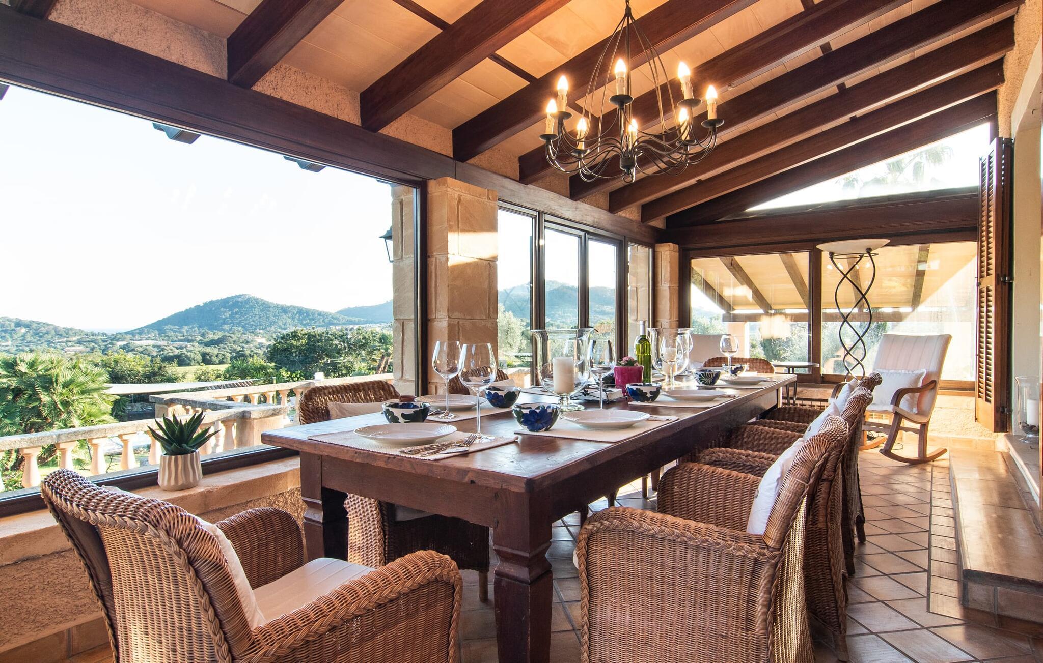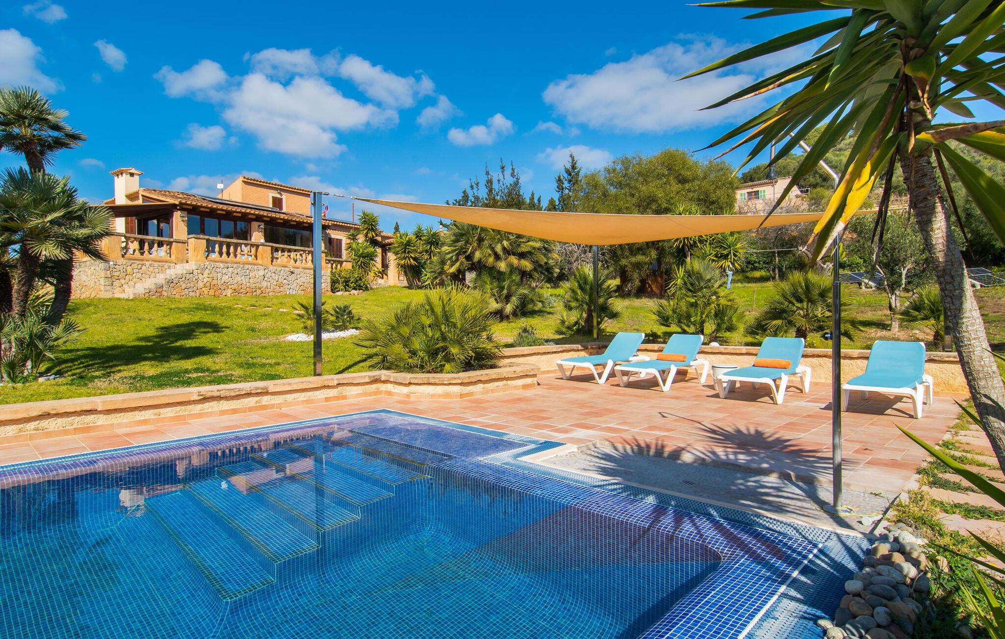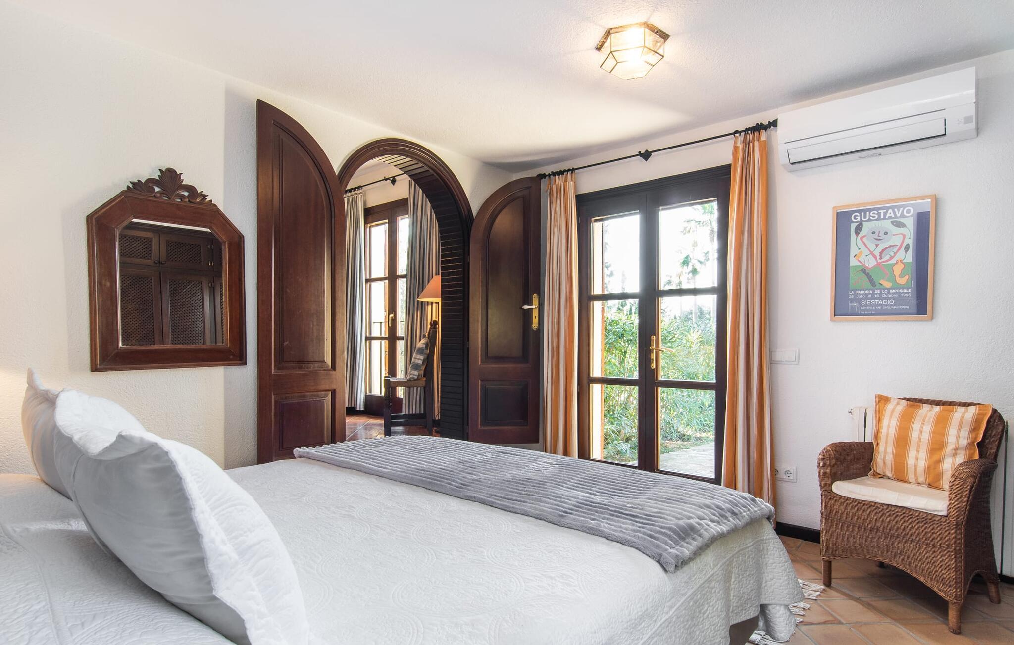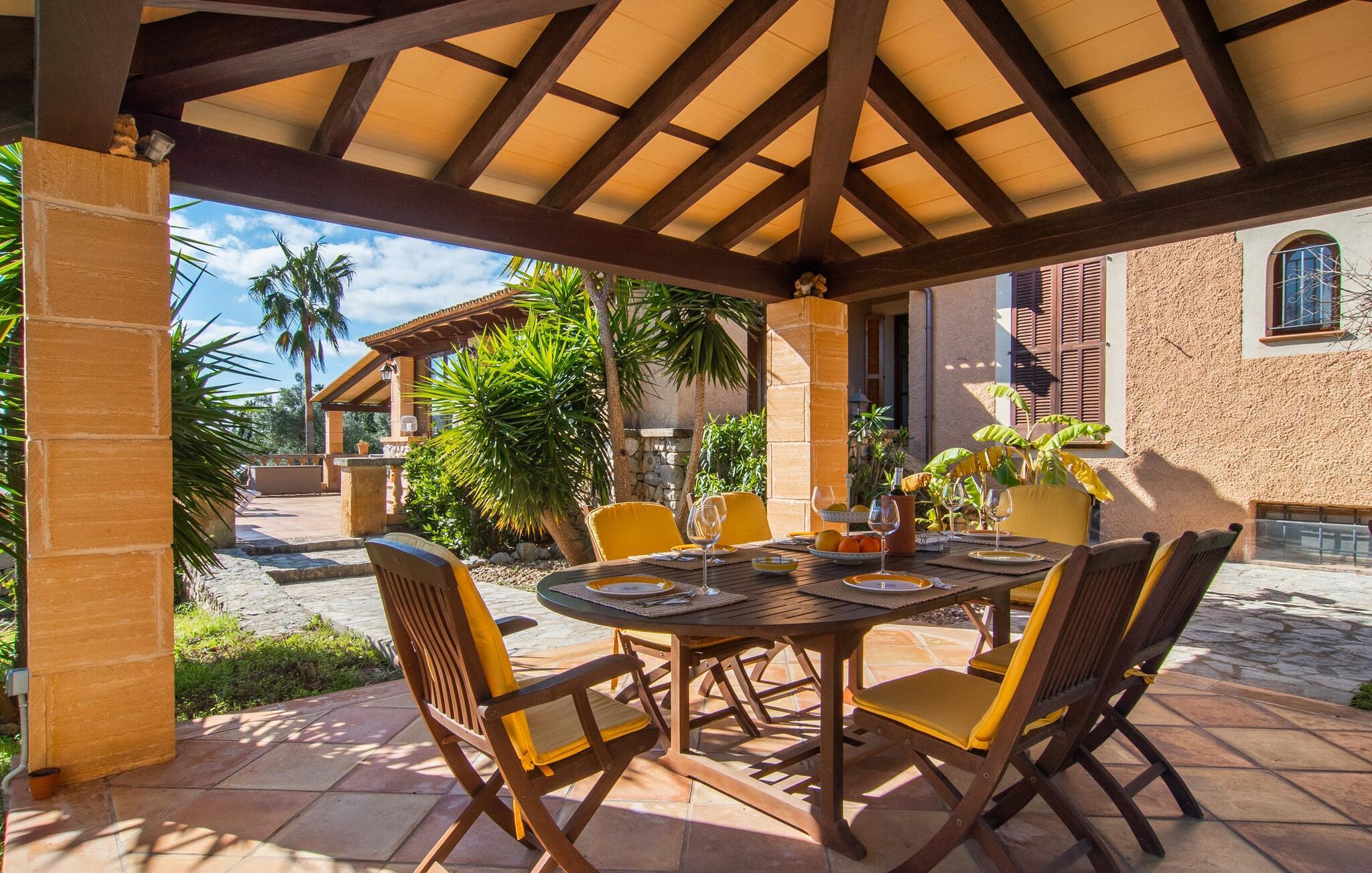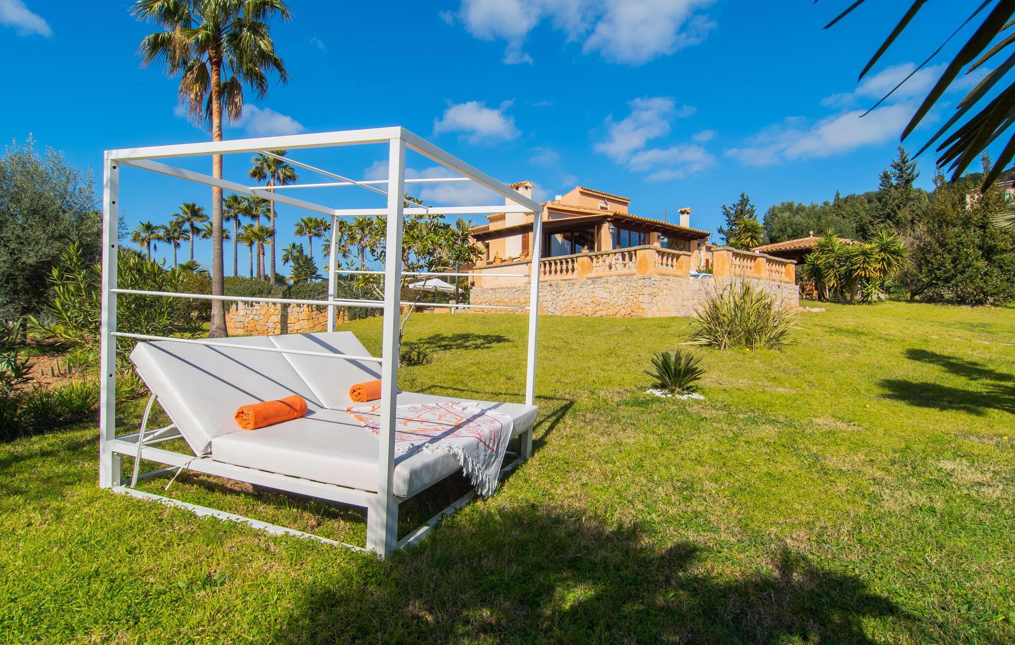 Det vidunderligt rolige feriehus "Na Nofre de Cala Ratjada" er omgivet af en rummelig have fuld af palmer, frugttræer og andre middelhavsplanter. I haveoasen vil I opdage den mosaikdækkede, klorfri pool. Den er opvarmet og kan derfor også bruges i lavsæsonen. Poolområdet har to udendørs brusere. Rundt om poolen er der liggestole i skyggen af markiser til en siesta eller den balinesiske dagseng til afslapning. Et andet højdepunkt er siddepladserne spredt ud over den spektakulære smukke have. På husets brolagte terrasser venter liggestole og et smart loungehjørne med markise. Efter en hyggelig grillaften på den overdækkede terrasse med spiseplads kan I slutte dagen af på tagterrassen med havudsigt. Der kan I nyde en uhindret panoramaudsigt over de bølgende bakker i Llevant-bjergene. Verandaen direkte ved huset byder på en anden spiseplads med en udendørs pejs. Hvis I værdsætter autentisk livsstil til jeres ferie på Mallorca, er dette charmerende og sofistikerede bondehus lige noget for jer. Det rustikke feriehus med moderne detaljer byder på masser af plads til op til 8 personer. Med sin opdeling i et hovedhus og en separat lejlighed kan dette store bondehus anbefales til at rejse med familien og især i flere generationer. I hovedhuset kan I nyde komforten i stuen med pejs og det separate køkken med spiseplads og smagfuld indretning. Der er fire soveværelser i alt (hvoraf det ene er et sammenhængende rum). Derudover er der to smarte badeværelser. Den separate lejlighed byder på kombineret opholds-, spise- og køkkenområde samt endnu et soveværelse og badeværelse. Der er adgang til en privat terrasse. “Na Nofre de Cala Ratjada” giver lyst til at tage på ferie til Mallorca. Vi kan ikke vente! Det idylliske bondehus "Na Nofre de Cala Ratjada" imponerer med sin opvarmede pool og tagterrasse med havudsigt med udsigt over den smukt anlagte have. Det roligt beliggende feriehus ligger på en skråning mellem Cala Ratjada og Capdepera, hvor I kan kombinere jeres shopping med at spise ude. Havet og de fantastiske strande er kun 8 minutter væk i bil.
