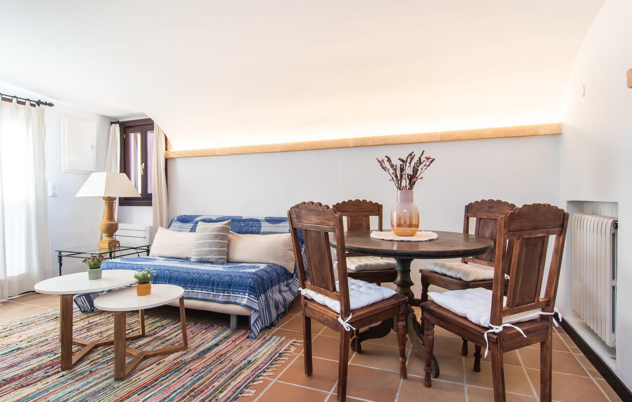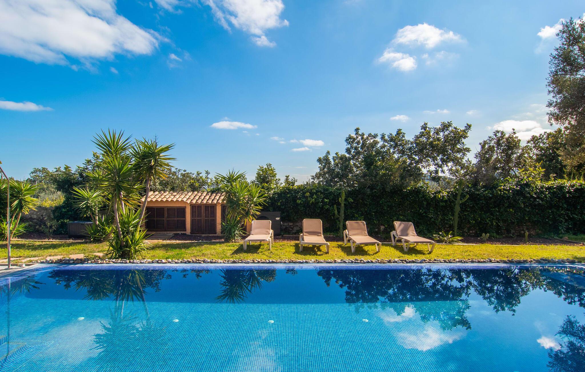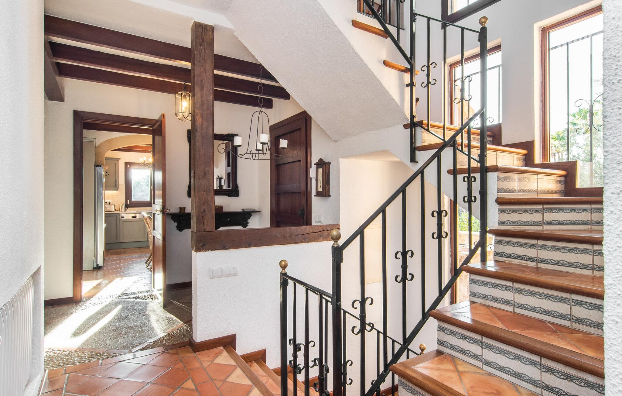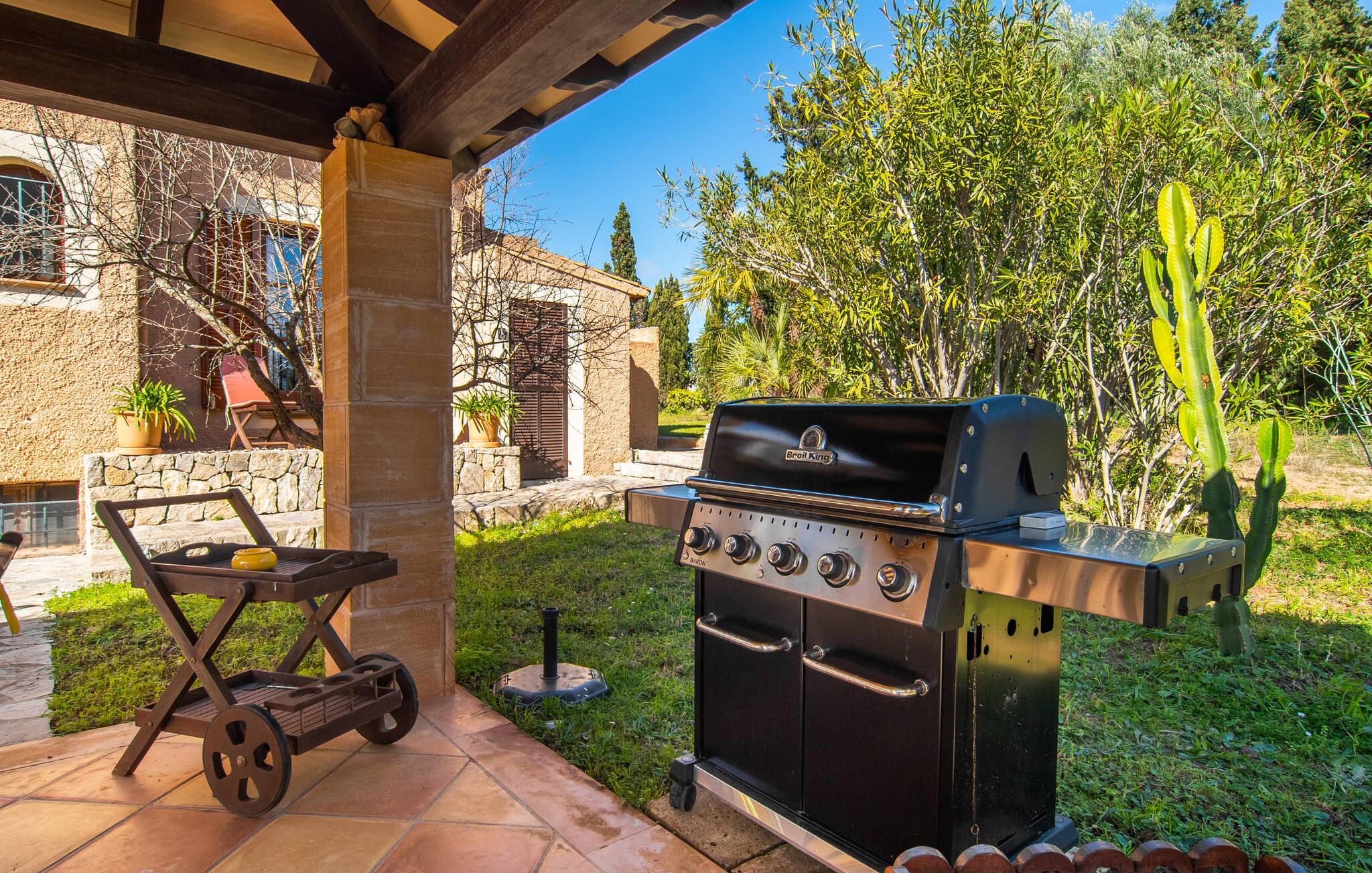 Det vidunderligt rolige feriehus "Na Nofre de Cala Ratjada" er omgivet af en rummelig have fuld af palmer, frugttræer og andre middelhavsplanter. I haveoasen vil I opdage den mosaikdækkede, klorfri pool. Den er opvarmet og kan derfor også bruges i lavsæsonen. Poolområdet har to udendørs brusere. Rundt om poolen er der liggestole i skyggen af markiser til en siesta eller den balinesiske dagseng til afslapning. Et andet højdepunkt er siddepladserne spredt ud over den spektakulære smukke have. På husets brolagte terrasser venter liggestole og et smart loungehjørne med markise. Efter en hyggelig grillaften på den overdækkede terrasse med spiseplads kan I slutte dagen af på tagterrassen med havudsigt. Der kan I nyde en uhindret panoramaudsigt over de bølgende bakker i Llevant-bjergene. Verandaen direkte ved huset byder på en anden spiseplads med en udendørs pejs. Hvis I værdsætter autentisk livsstil til jeres ferie på Mallorca, er dette charmerende og sofistikerede bondehus lige noget for jer. Det rustikke feriehus med moderne detaljer byder på masser af plads til op til 8 personer. Med sin opdeling i et hovedhus og en separat lejlighed kan dette store bondehus anbefales til at rejse med familien og især i flere generationer. I hovedhuset kan I nyde komforten i stuen med pejs og det separate køkken med spiseplads og smagfuld indretning. Der er fire soveværelser i alt (hvoraf det ene er et sammenhængende rum). Derudover er der to smarte badeværelser. Den separate lejlighed byder på kombineret opholds-, spise- og køkkenområde samt endnu et soveværelse og badeværelse. Der er adgang til en privat terrasse. “Na Nofre de Cala Ratjada” giver lyst til at tage på ferie til Mallorca. Vi kan ikke vente! Det idylliske bondehus "Na Nofre de Cala Ratjada" imponerer med sin opvarmede pool og tagterrasse med havudsigt med udsigt over den smukt anlagte have. Det roligt beliggende feriehus ligger på en skråning mellem Cala Ratjada og Capdepera, hvor I kan kombinere jeres shopping med at spise ude. Havet og de fantastiske strande er kun 8 minutter væk i bil.