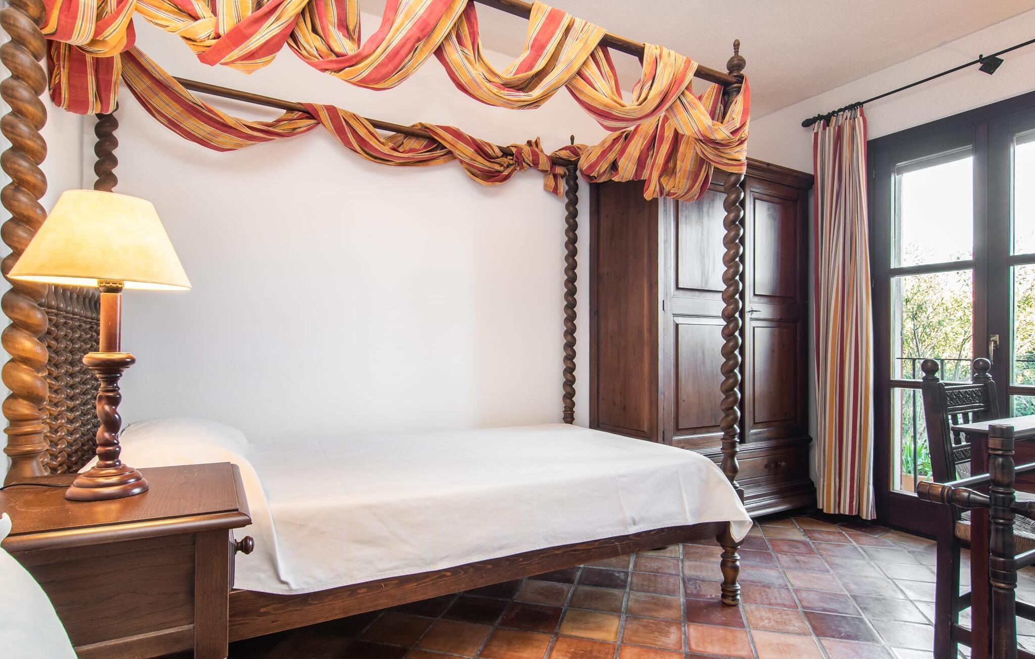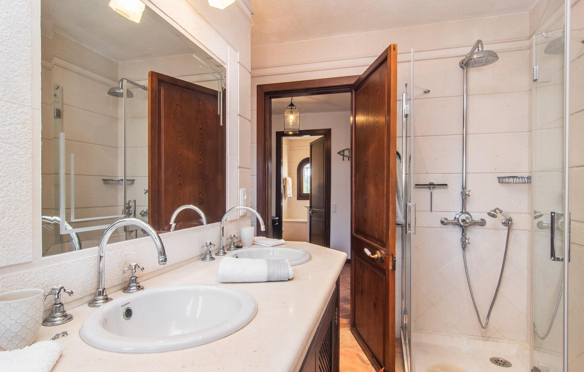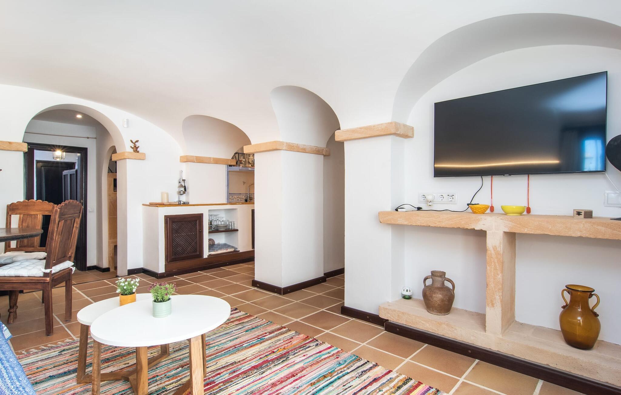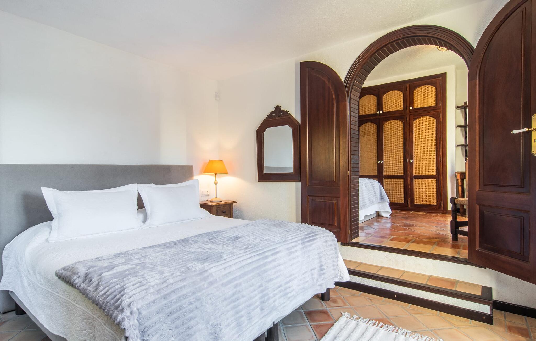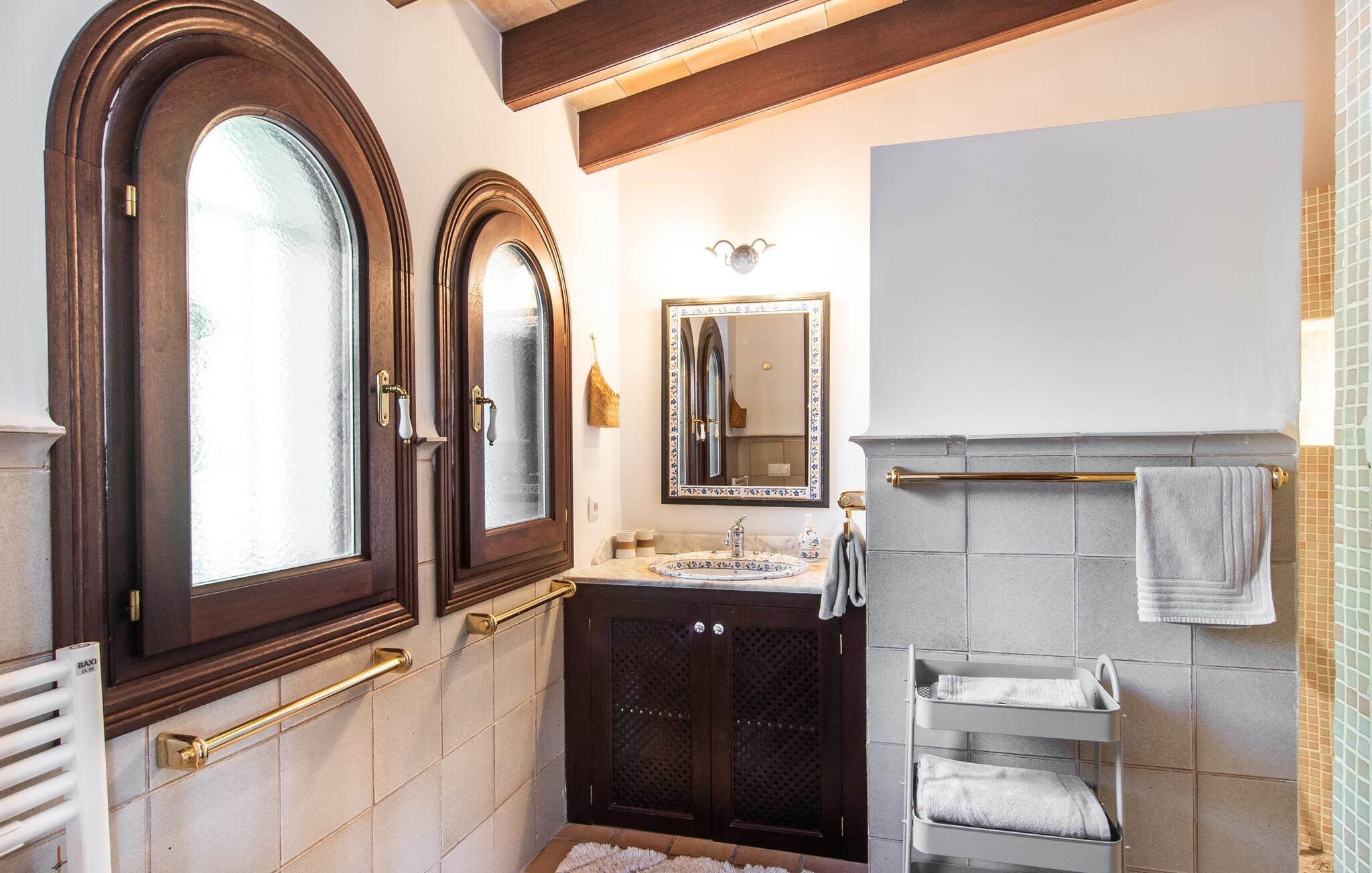 Det vidunderligt rolige feriehus "Na Nofre de Cala Ratjada" er omgivet af en rummelig have fuld af palmer, frugttræer og andre middelhavsplanter. I haveoasen vil I opdage den mosaikdækkede, klorfri pool. Den er opvarmet og kan derfor også bruges i lavsæsonen. Poolområdet har to udendørs brusere. Rundt om poolen er der liggestole i skyggen af markiser til en siesta eller den balinesiske dagseng til afslapning. Et andet højdepunkt er siddepladserne spredt ud over den spektakulære smukke have. På husets brolagte terrasser venter liggestole og et smart loungehjørne med markise. Efter en hyggelig grillaften på den overdækkede terrasse med spiseplads kan I slutte dagen af på tagterrassen med havudsigt. Der kan I nyde en uhindret panoramaudsigt over de bølgende bakker i Llevant-bjergene. Verandaen direkte ved huset byder på en anden spiseplads med en udendørs pejs. Hvis I værdsætter autentisk livsstil til jeres ferie på Mallorca, er dette charmerende og sofistikerede bondehus lige noget for jer. Det rustikke feriehus med moderne detaljer byder på masser af plads til op til 8 personer. Med sin opdeling i et hovedhus og en separat lejlighed kan dette store bondehus anbefales til at rejse med familien og især i flere generationer. I hovedhuset kan I nyde komforten i stuen med pejs og det separate køkken med spiseplads og smagfuld indretning. Der er fire soveværelser i alt (hvoraf det ene er et sammenhængende rum). Derudover er der to smarte badeværelser. Den separate lejlighed byder på kombineret opholds-, spise- og køkkenområde samt endnu et soveværelse og badeværelse. Der er adgang til en privat terrasse. “Na Nofre de Cala Ratjada” giver lyst til at tage på ferie til Mallorca. Vi kan ikke vente! Det idylliske bondehus "Na Nofre de Cala Ratjada" imponerer med sin opvarmede pool og tagterrasse med havudsigt med udsigt over den smukt anlagte have. Det roligt beliggende feriehus ligger på en skråning mellem Cala Ratjada og Capdepera, hvor I kan kombinere jeres shopping med at spise ude. Havet og de fantastiske strande er kun 8 minutter væk i bil.