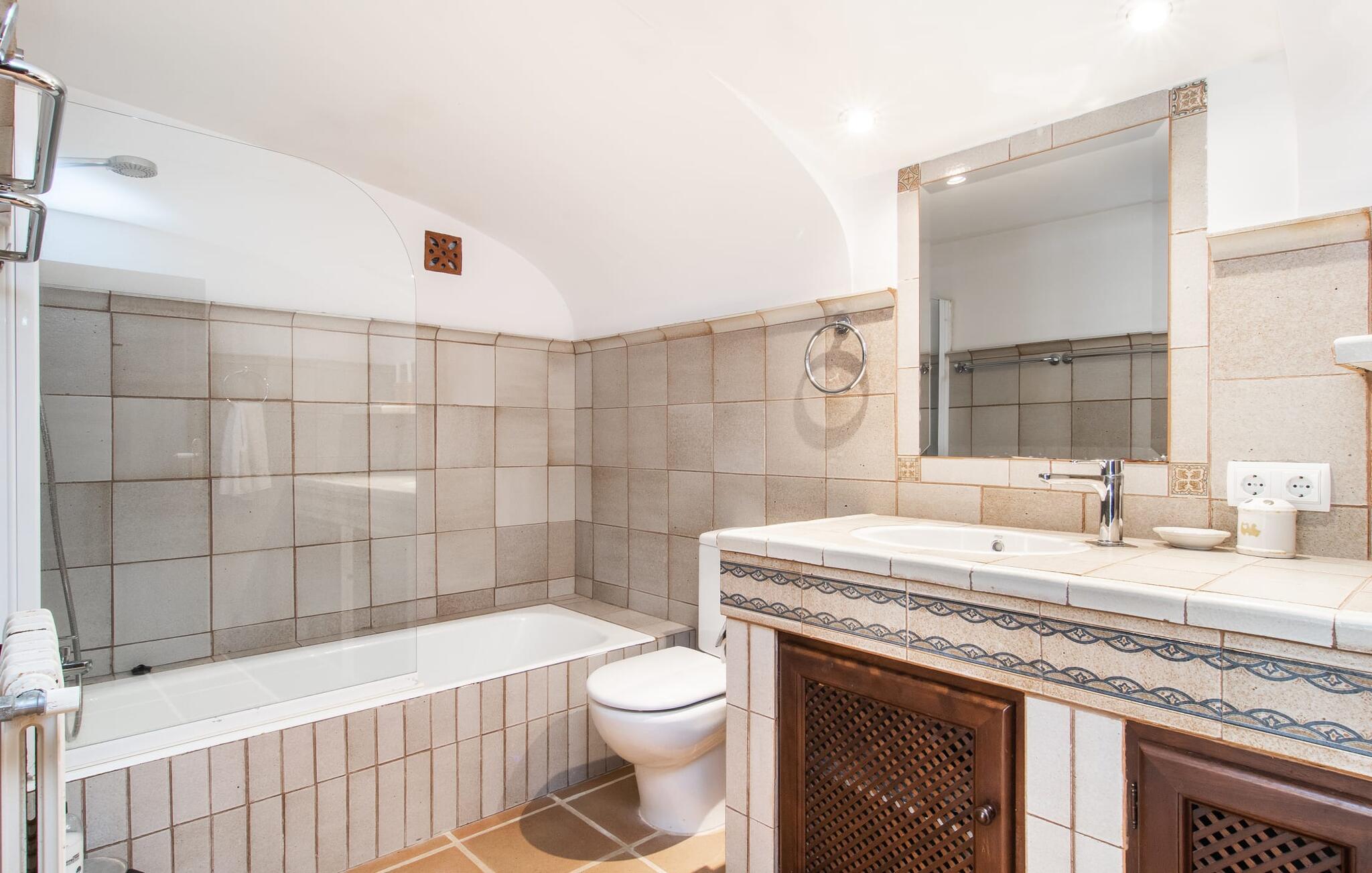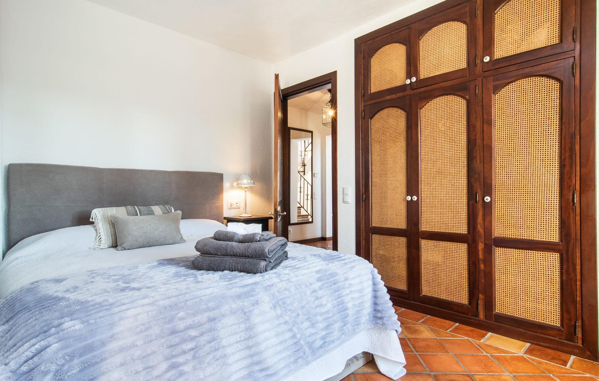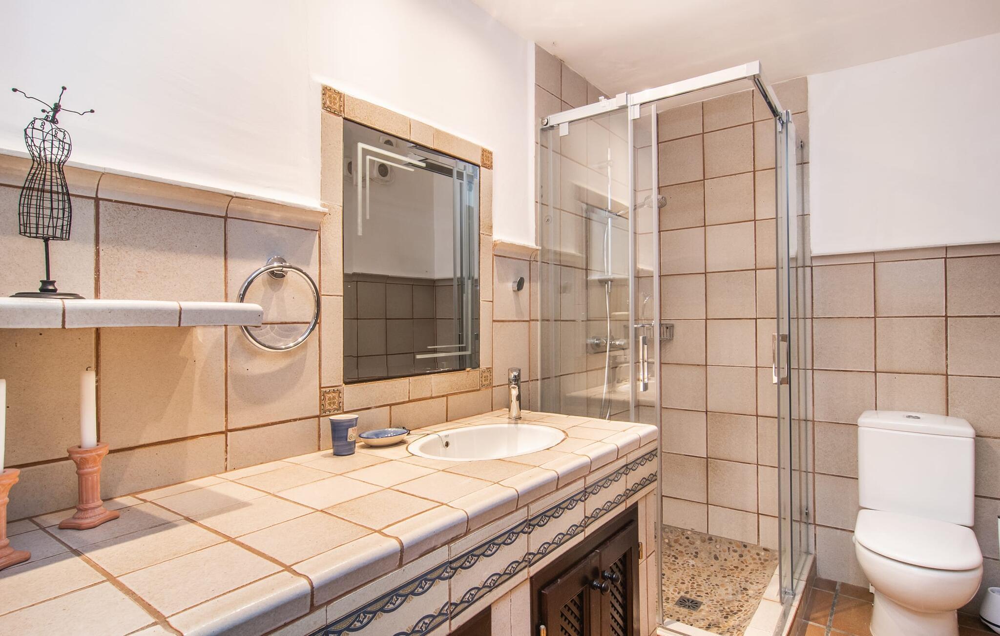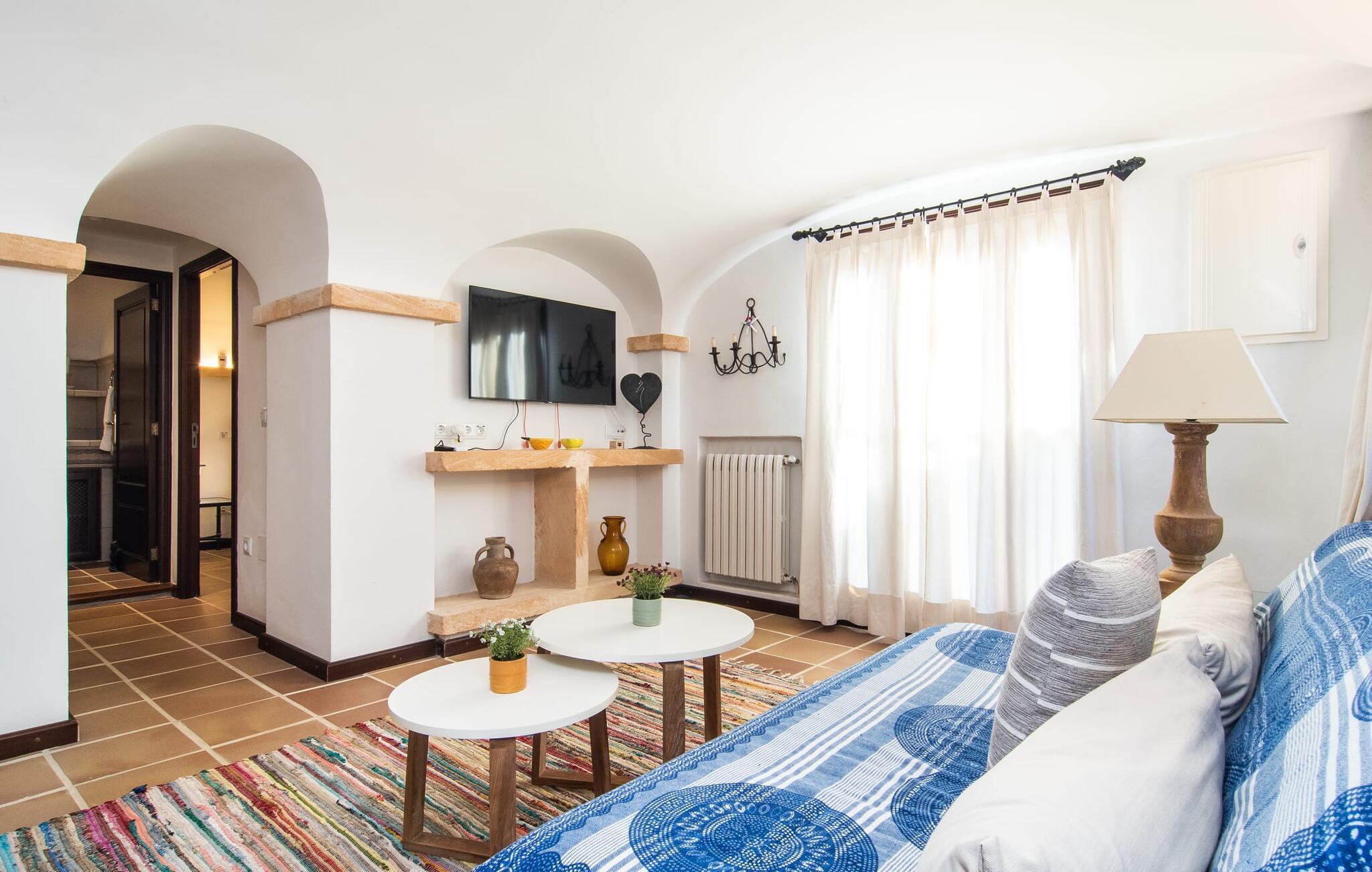Det vidunderligt rolige feriehus "Na Nofre de Cala Ratjada" er omgivet af en rummelig have fuld af palmer, frugttræer og andre middelhavsplanter. I haveoasen vil I opdage den mosaikdækkede, klorfri pool. Den er opvarmet og kan derfor også bruges i lavsæsonen. Poolområdet har to udendørs brusere. Rundt om poolen er der liggestole i skyggen af markiser til en siesta eller den balinesiske dagseng til afslapning. Et andet højdepunkt er siddepladserne spredt ud over den spektakulære smukke have. På husets brolagte terrasser venter liggestole og et smart loungehjørne med markise. Efter en hyggelig grillaften på den overdækkede terrasse med spiseplads kan I slutte dagen af på tagterrassen med havudsigt. Der kan I nyde en uhindret panoramaudsigt over de bølgende bakker i Llevant-bjergene. Verandaen direkte ved huset byder på en anden spiseplads med en udendørs pejs. Hvis I værdsætter autentisk livsstil til jeres ferie på Mallorca, er dette charmerende og sofistikerede bondehus lige noget for jer. Det rustikke feriehus med moderne detaljer byder på masser af plads til op til 8 personer. Med sin opdeling i et hovedhus og en separat lejlighed kan dette store bondehus anbefales til at rejse med familien og især i flere generationer. I hovedhuset kan I nyde komforten i stuen med pejs og det separate køkken med spiseplads og smagfuld indretning. Der er fire soveværelser i alt (hvoraf det ene er et sammenhængende rum). Derudover er der to smarte badeværelser. Den separate lejlighed byder på kombineret opholds-, spise- og køkkenområde samt endnu et soveværelse og badeværelse. Der er adgang til en privat terrasse. “Na Nofre de Cala Ratjada” giver lyst til at tage på ferie til Mallorca. Vi kan ikke vente! Det idylliske bondehus "Na Nofre de Cala Ratjada" imponerer med sin opvarmede pool og tagterrasse med havudsigt med udsigt over den smukt anlagte have. Det roligt beliggende feriehus ligger på en skråning mellem Cala Ratjada og Capdepera, hvor I kan kombinere jeres shopping med at spise ude. Havet og de fantastiske strande er kun 8 minutter væk i bil.
