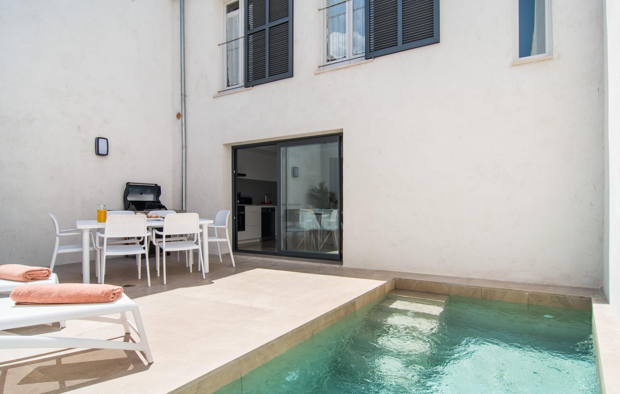 Enhver, der kan lide at komme rundt til fods, har alle de nødvendige faciliteter i nærheden og nyder at slentre gennem små byer, er heldige med dette rækkehus, især da det ligger midt i Artà - et gammelt, fremadstormende feriested, der stadig har små butikker og et livligt liv har et ugentligt marked og fremragende restauranter. Bilen kan parkeres på gaden og er derfor altid klar til den korte køretur til stranden. Selvom du er omgivet af naboer, tilbyder den hvide, fuldstændig renoverede ejendom "Na Valenta" dig en masse privatliv: den smukke lille gårdhave med den højkvalitets minipool, som sikrer, at du kan køle af i ny og næ, er beskyttet af høje mure. En moderne gasgrill er tilgængelig for at tilføje kød og fisk til den markedsfriske salat; Der er ingen nemmere måde at lave noget på, når du ikke har lyst til at gå ud. Den rummelige altanterrasse har en ekspansiv markise, så du kan få uhindret udsyn til handlingen. Dette er et Fincallorca feriehus. Og enhver, der kan lide enkelhed, elsker minimalistisk design og ønsker et behageligt køligt rum, især i varmt vejr, vil helt sikkert føle sig godt tilpas inden for "Na Valentas vægge". De to etager formidler et indtryk af sommerfriskhed og byder på møbler af høj kvalitet og værelser med aircondition. Du kan også inkludere og tage en eller to andre personer med. Skub glasdøren op til terrassen i gården og forvandl den moderne cocina med mikroovn og opvaskemaskine til et udekøkken. En frisk brise blæser også fra det hyggelige sofaområde til indgangspartiet, som er muliggjort af de ekstra døråbninger. To soveværelser med dobbeltsenge (separate madrasser) deler badeværelset i stueetagen, mens et walk-in-closet og rummeligt bruseniche giver ekstra komfort. Trappen fører op til yderligere to værelser, hver med eget badeværelse og udgang til altan. Det åbne vaskerum gør disse rum ideelle som enkeltværelser. Dette totalrenoverede rækkehus med minimalistisk design, pool og balkonterrasse ligger i centrum af dette populære område i Artà, hvor Golgata ligger. Et ugentligt marked, et supermarked og et indkøbscenter samt restauranter og charmerende caféer er (næsten) lige uden for døren. Dit strandparadis på østkysten ligger kun 10 til 15 km væk, og Capdepera med sit slot og førsteklasses golfbane, Coves d'Artà og vandreområdet omkring Colònia de Sant Pere og Betlem er også kun en kort køretur væk . Bemærk venligst, at denne ejendom ikke accepterer ungdomsgrupper eller polterabender. En ungdomsgruppe på denne ejendom består af personer på 25 år eller derunder. Book ikke denne ejendom, hvis du er en ungdomsgruppe eller polterabend, da din reservation vil blive afvist, når den er booket, hvilket også kan være tilfældet ved ankomst til ejendommen eller under dit ophold, og du vil ikke modtage en refusion