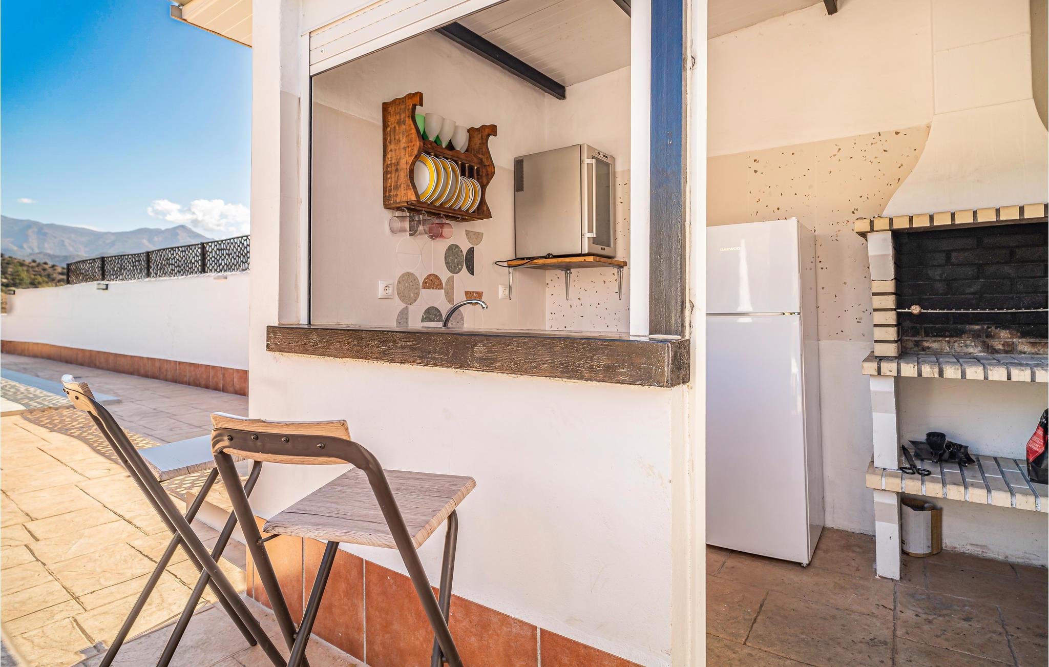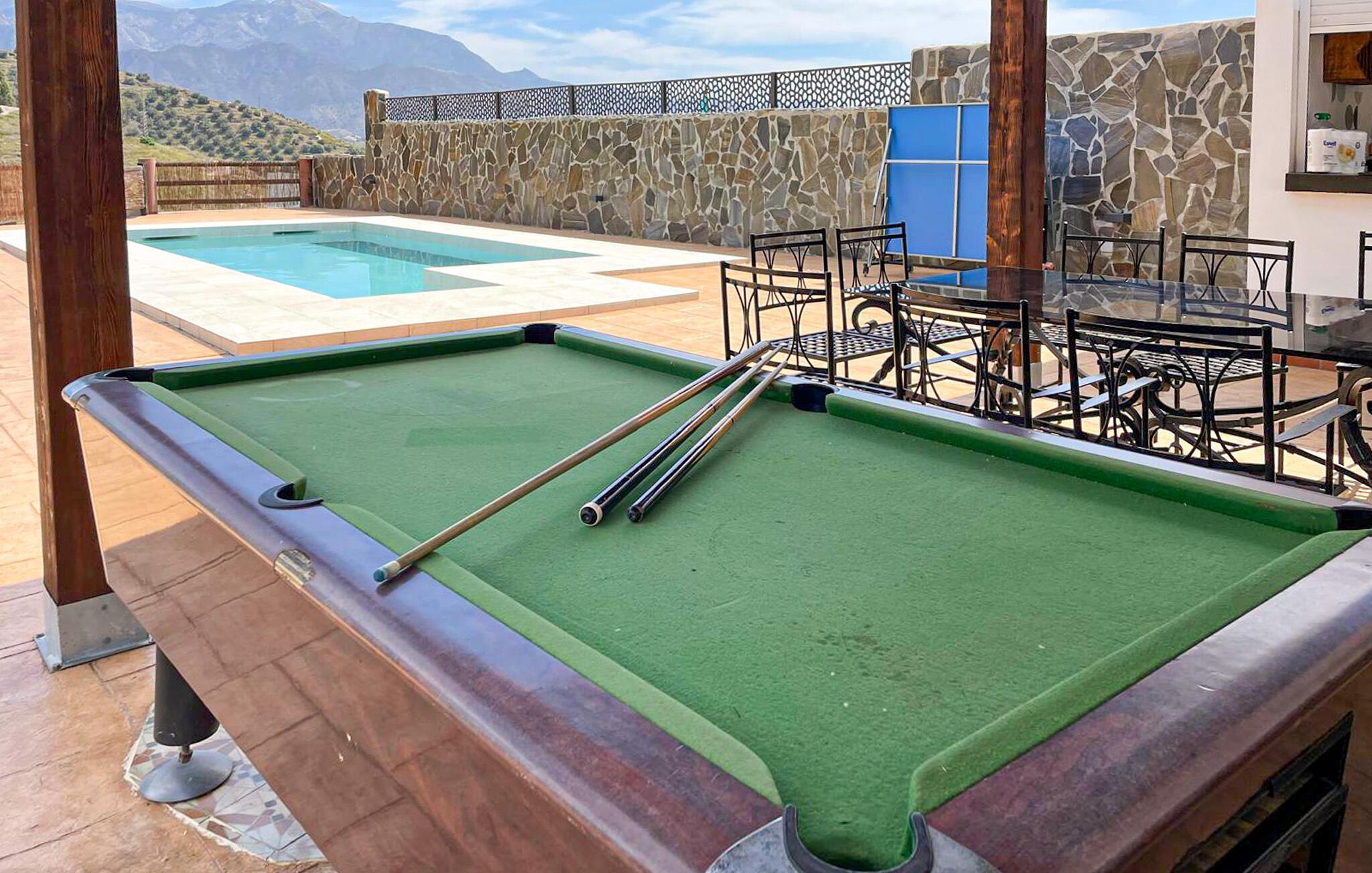 Dette eksklusive feriehus lidt uden for Nerja lokker med ren velvære i smukke naturomgivelser. Lyse værelser med smagfuld indretning, høj komfort og en lang række af skønne faciliteter skaber rammen om en ferie med selvforkælelse, hvor den større familie eller en gruppe af venner kan nyde afslappende dage. Glæd jer til dejlige aftener oven på en lang feriedag, spis lækker mad ved det lange spisebord, læn jer tilbage i den indbydende sofakrog og læg planer for de kommende dage. Terrassen indbyder til uforglemmelige timer under den sydspanske himmel. Nyd solen ved poolen og udsigten over det blidt bølgende landskab, snup en dukkert i ny og næ og nip til en hjemmelavet cocktail ved baren.