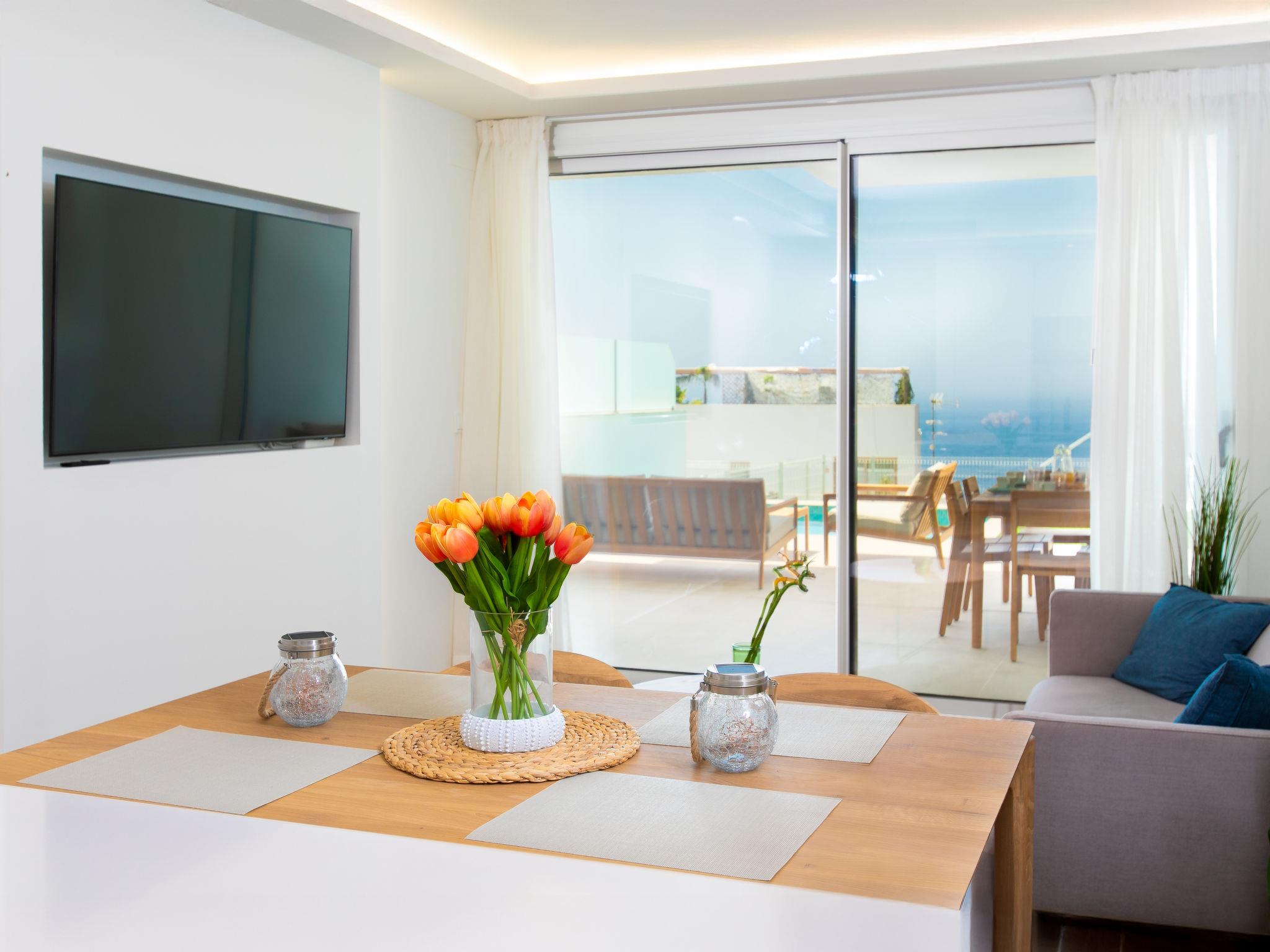 "D´Mediterranea Free Spa and Padle", 3-room apartment 99 m2. Comfortable and modern furnishings: living/dining room with air conditioning and forced-air heating. Exit to the terrace, to the swimming pool. 1 room with 1 french bed (180 cm, length 200 cm), shower/WC, air conditioning and forced-air heating. Exit to the terrace, to the swimming pool. 1 room with 2 beds (90 cm, length 200 cm), air conditioning and forced-air heating. Exit to the terrace. Open kitchen (oven, dishwasher, 4 ceramic glass hob hotplates, toaster, kettle, microwave, freezer). Shower/WC. 2 large terraces 58 m2. Terrace furniture, deck chairs. Panoramic view of the sea. Facilities: washing machine, dryer, safe, iron, hair dryer. Internet (WiFi, free). Please note: smoke alarm, fire extinguisher. Lovely secluded apartement with private pool just five minute drive from beaches and Nerja´s town centre. VUT/MA/96969 // Reg. Nr.: ESFCTU000029013001120221000000000000000000VUT/MA/9696
