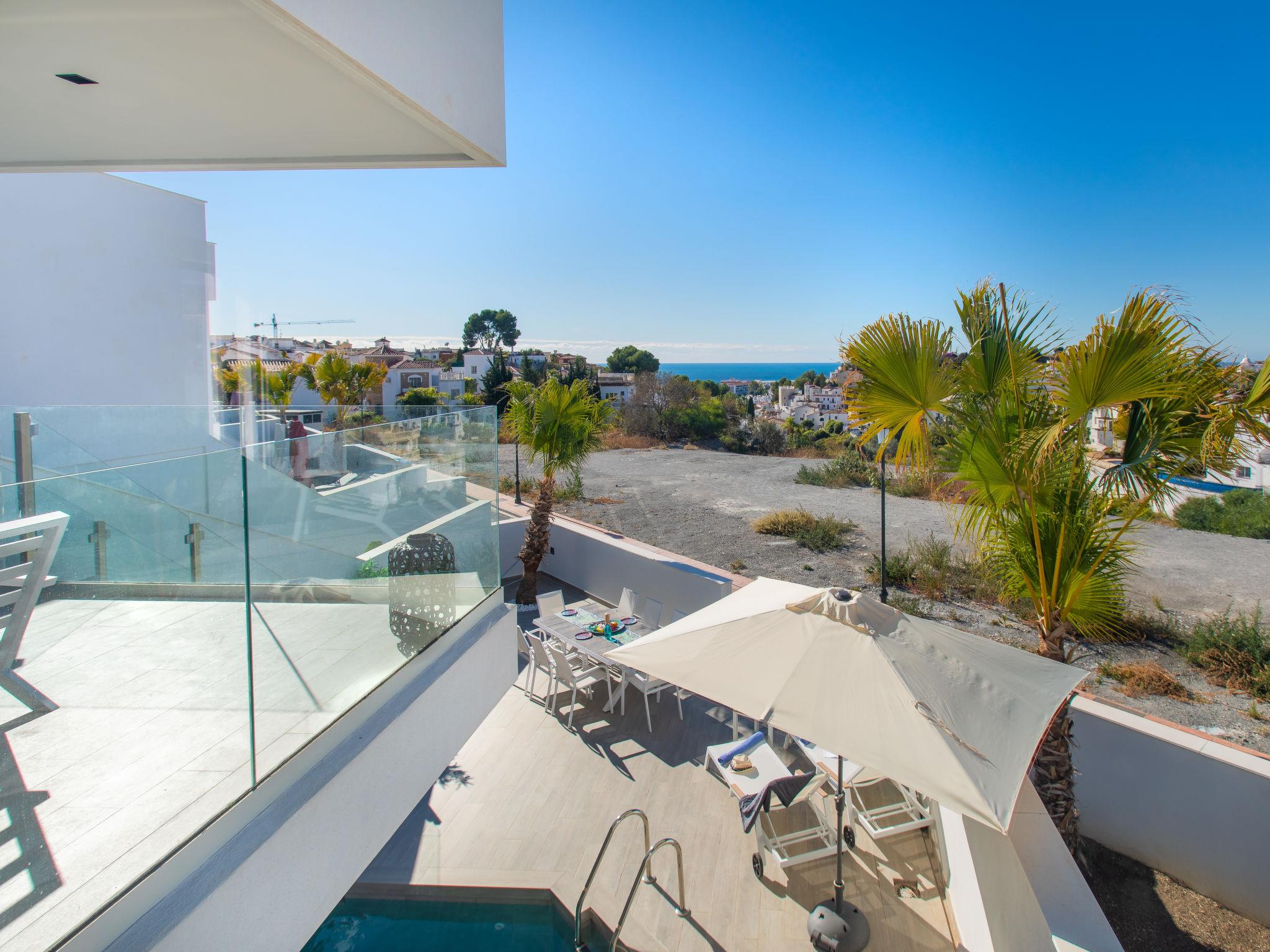 Nerja: Large, modern, beautiful house "Royal Palm", 3 storeys. In the resort 1.6 km from the centre of Nerja, in a sunny position residential area (villas), 500 m from the sea, 500 m from the beach, south facing position. For shared use: swimming pool angular (5 x 10 m, depth 97 - 162 cm, seasonal availability: 01.Apr. - 30.Nov., extra 30 per day). Private: swimming pool heated (2 x 3 m, seasonal availability: 01.Jan. - 31.Dec.). In the house: washing machine. Parking, single garage. Shop, grocery, supermarket 300 m, shopping centre 20 km, restaurant, bar, bakery, café, internet café 300 m, bicycle rental 500 m, pub garden 300 m, bus stop 150 m, sandy beach "Burriana" 500 m. The owner does not accept any youth groups. Please note: Loading and unloading of baggage is possible at the holiday house.