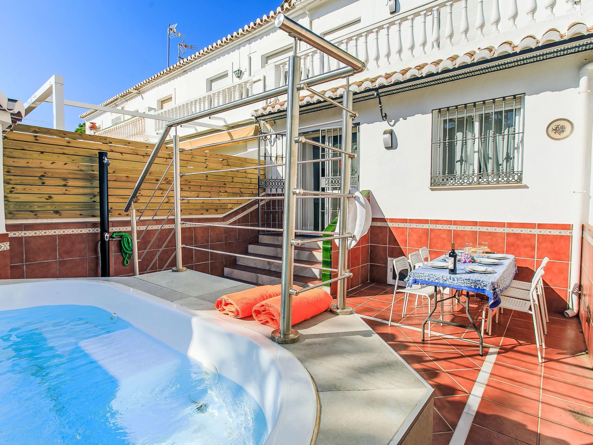 Nerja: Beautiful, cosy, comfortable terraced house "Cheng", 2 storeys. In the resort, 800 m from the centre, 3 km from the edge of the forest, 500 m from the sea, 500 m from the beach, 1.5 km from the river, south facing position. Private: courtyard, swimming pool (above ground) (4 x 3 m, 12 m2, depth 80 - 140 cm, seasonal availability: 01.Jan. - 31.Dec.). WC in the pool area, outdoor shower, pool maintenance by the owner/gardener. In the house: solarium, washing machine. Shop, grocery 300 m, supermarket 500 m, restaurant 200 m, bar, bakery 150 m, bus stop 50 m. Golf course (18 hole) 20 km. Nearby attractions: Cueva de Nerja 4 km, Playa Burriana 700 m, Frigiliana 5 km, Málaga 58 km, Granada 97 km, Almuñécar 23 km. Well-known ski regions can easily be reached: Sierra Nevada 126 km. Hiking paths: Sierra Tejeda 9 km, Sierra Almijara 12 km, Alpujarras 100 km. The owner does not accept any youth groups.